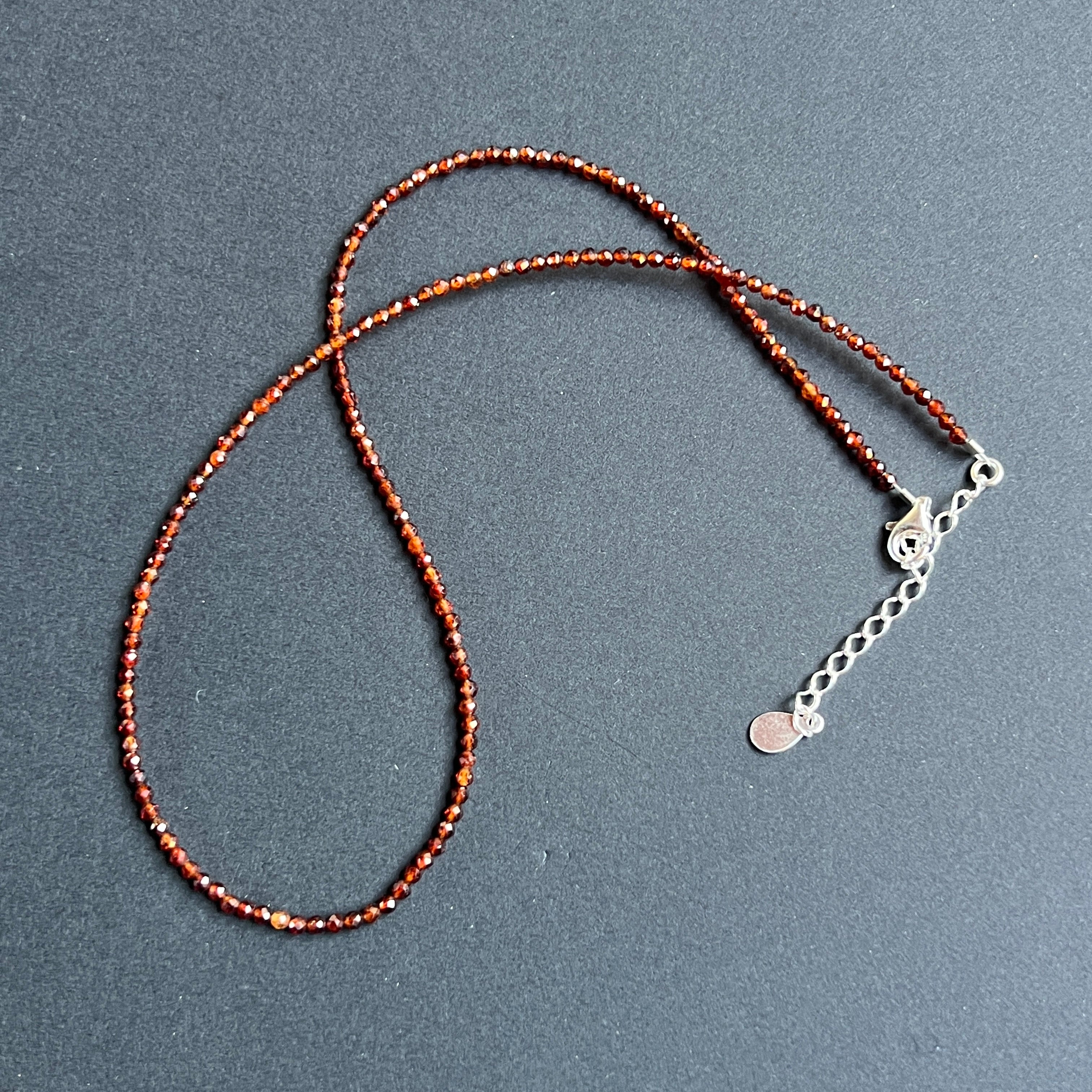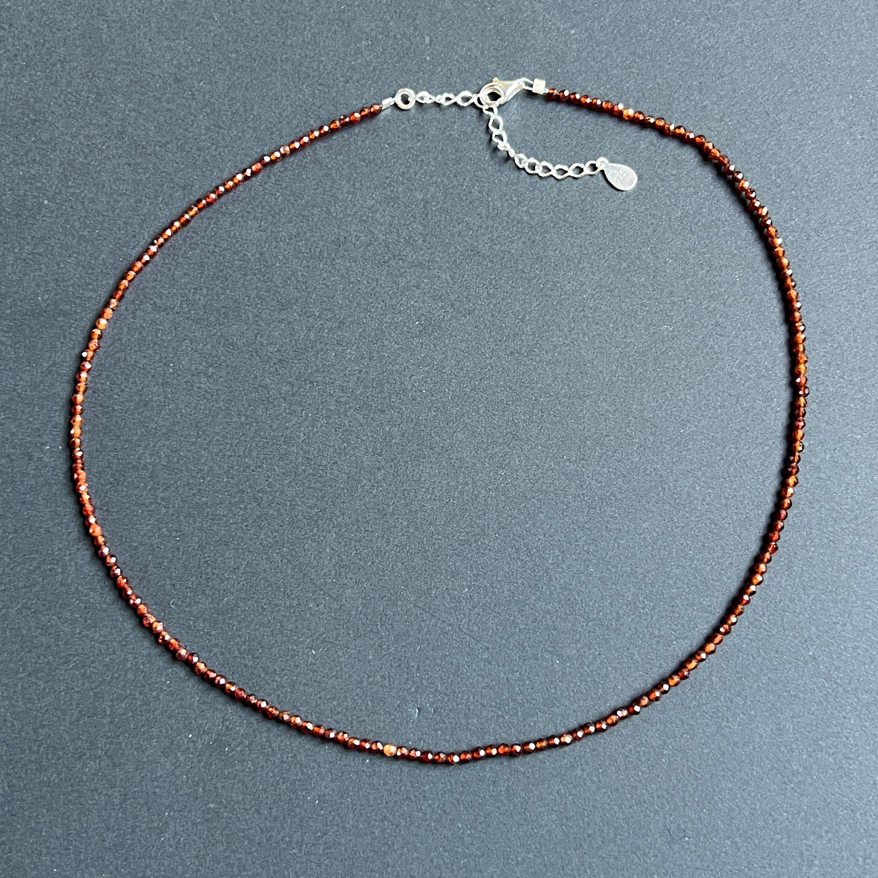 A huzal csiszolt gömbökből áll 2,5 mm natúr gránát, ritka árnyalatában narancs-cseresznye. Minden egyes gyöngy kialudt parázsból faragva jelenik meg, tükröződésekkel fűszerezett vörösbor, fahéj és aranybarna szín között. A finom oldalak diszkrét szögekből fogják meg a fényt, finom kölcsönhatást teremtve a meleg és a mélység között.