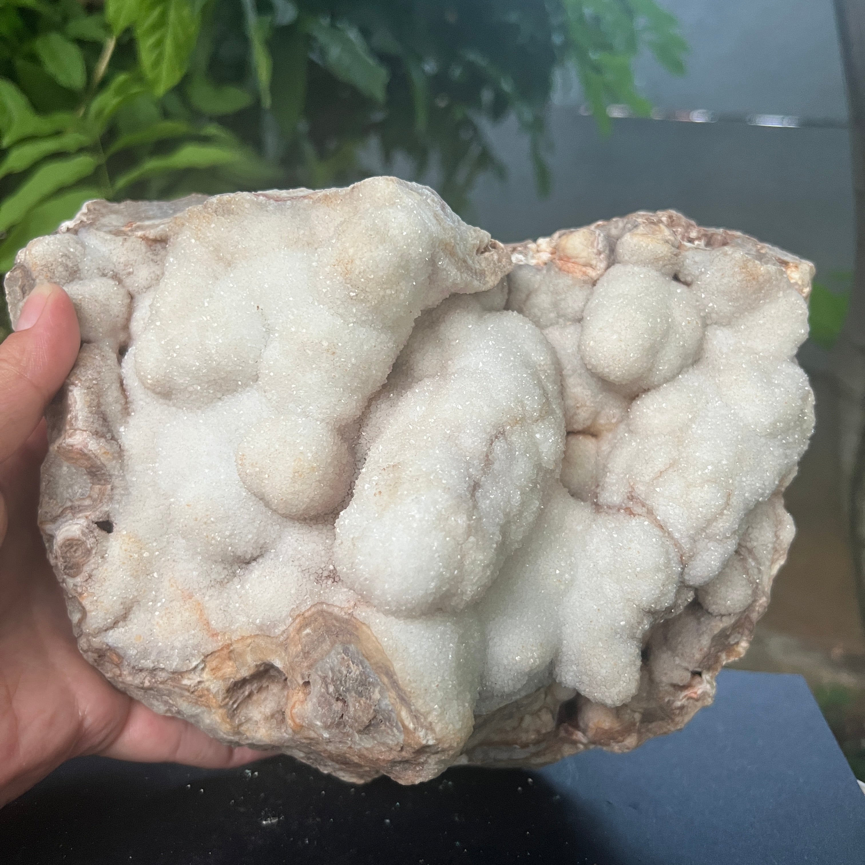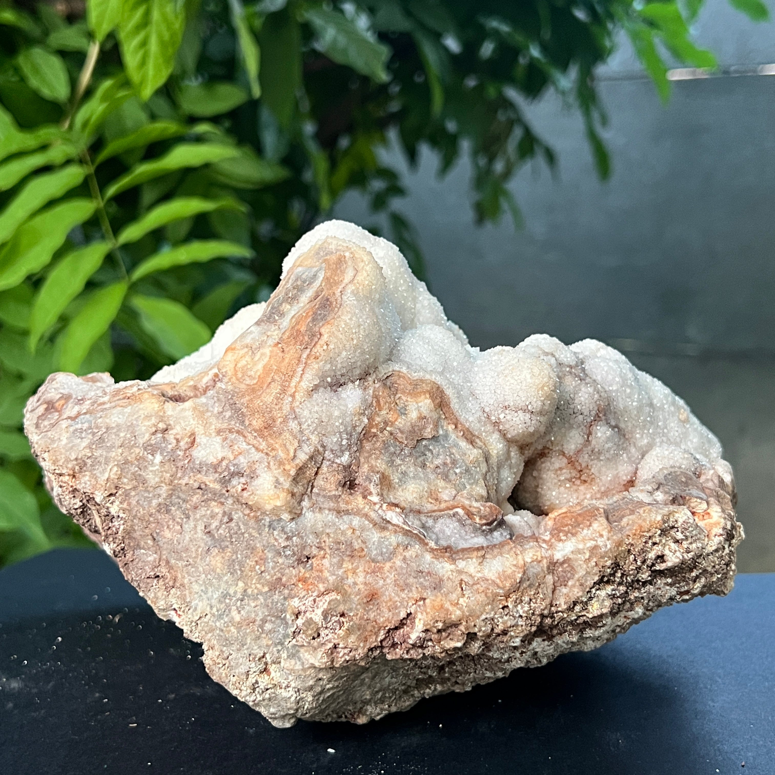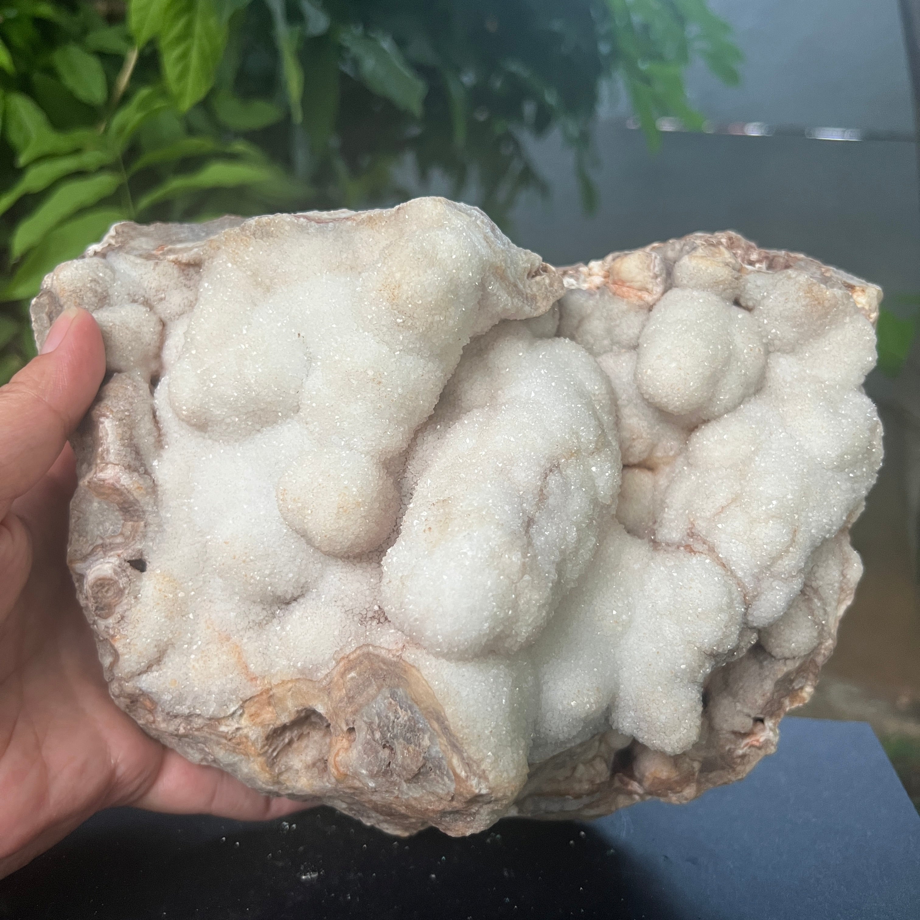 Ez egy ritka és lenyűgöző darab: ez a botrioid kvarc természetes képződmény olyan, mintha az idő hullámai szobrászként formálták volna, egy organikus formák táncában, finom druzy kristálybevonattal fedve. Felülete természetes fényben diszkréten csillog, köszönhetően a finoman kristályosodott rétegnek, amely a sima, majdnem szobrászi alapfelszínt borítja.
