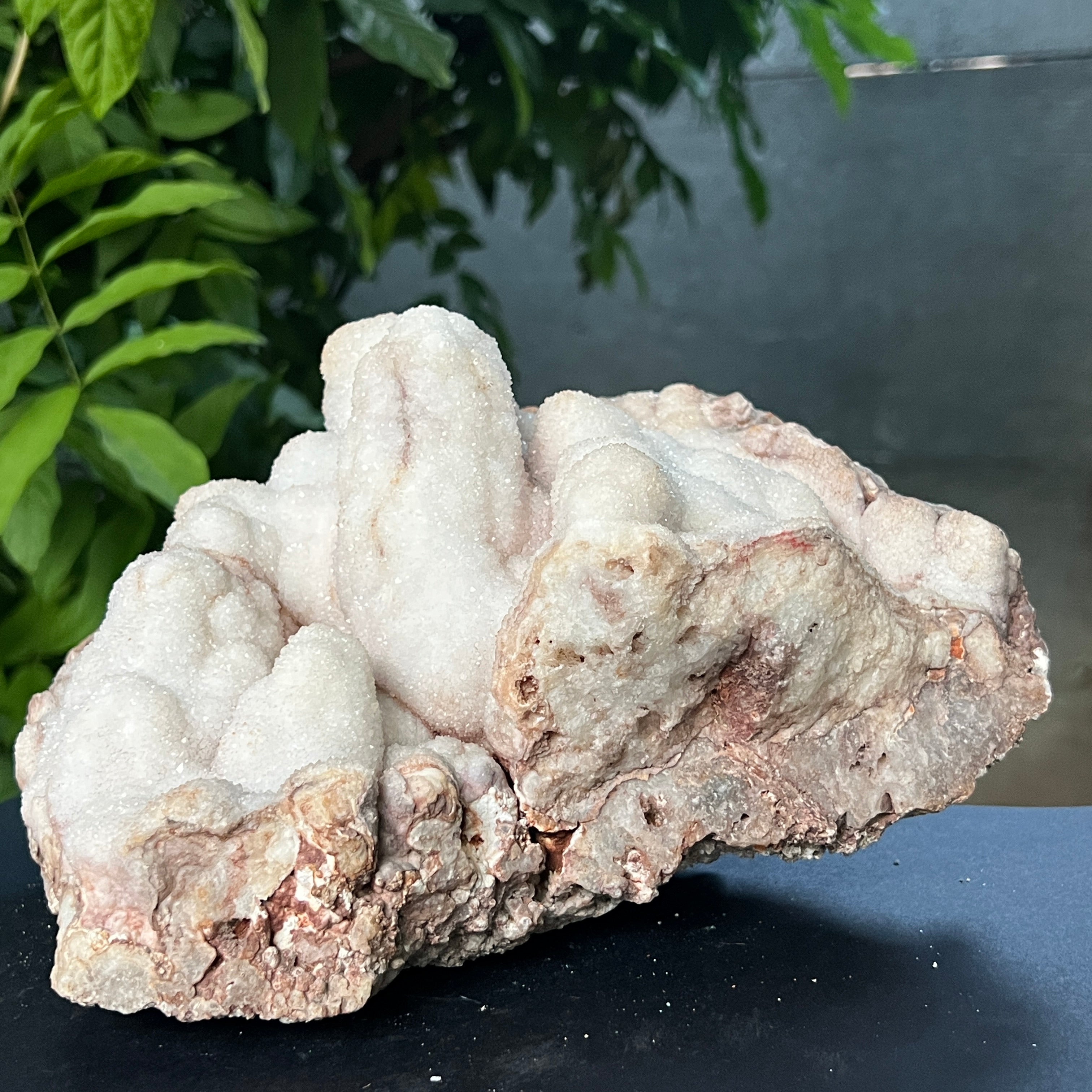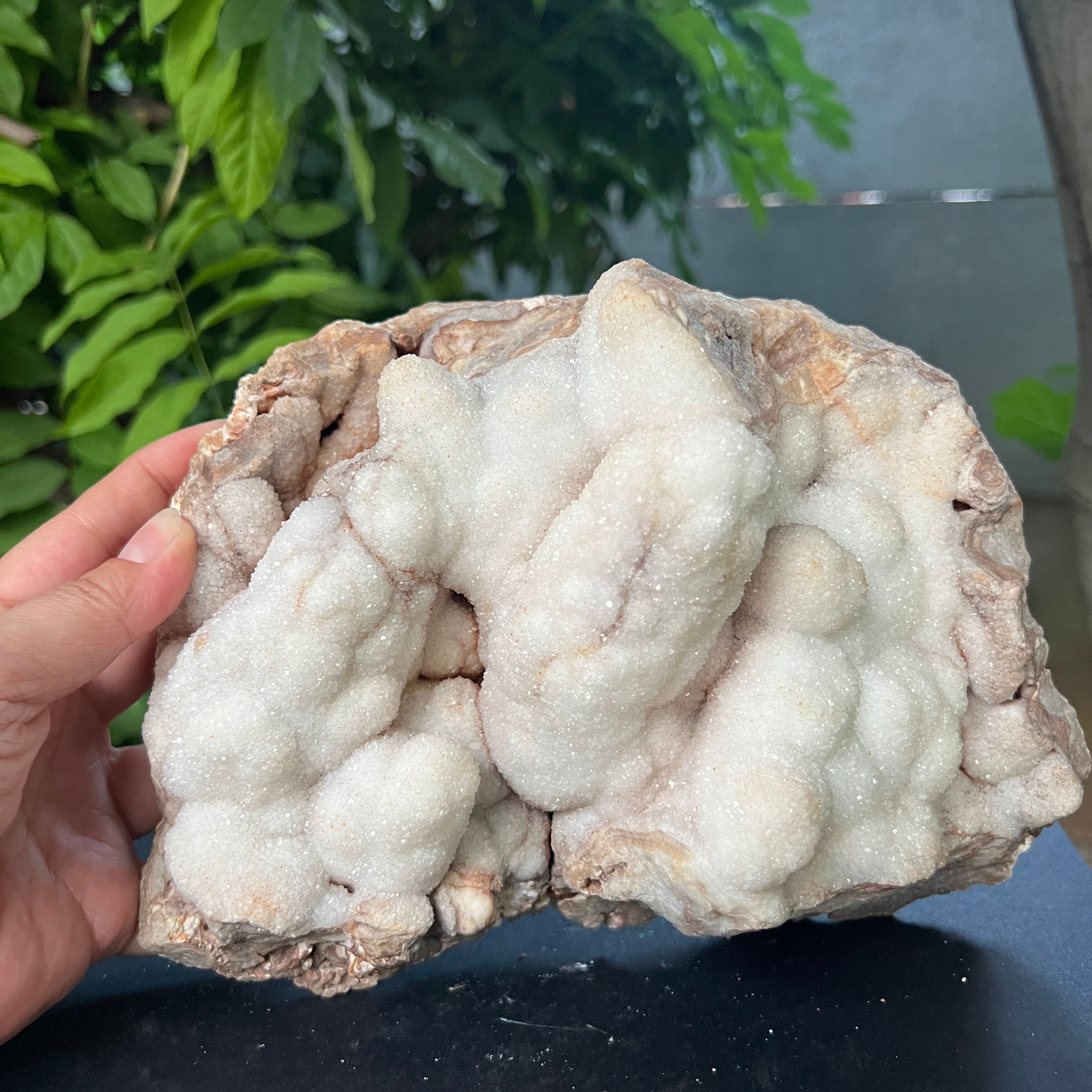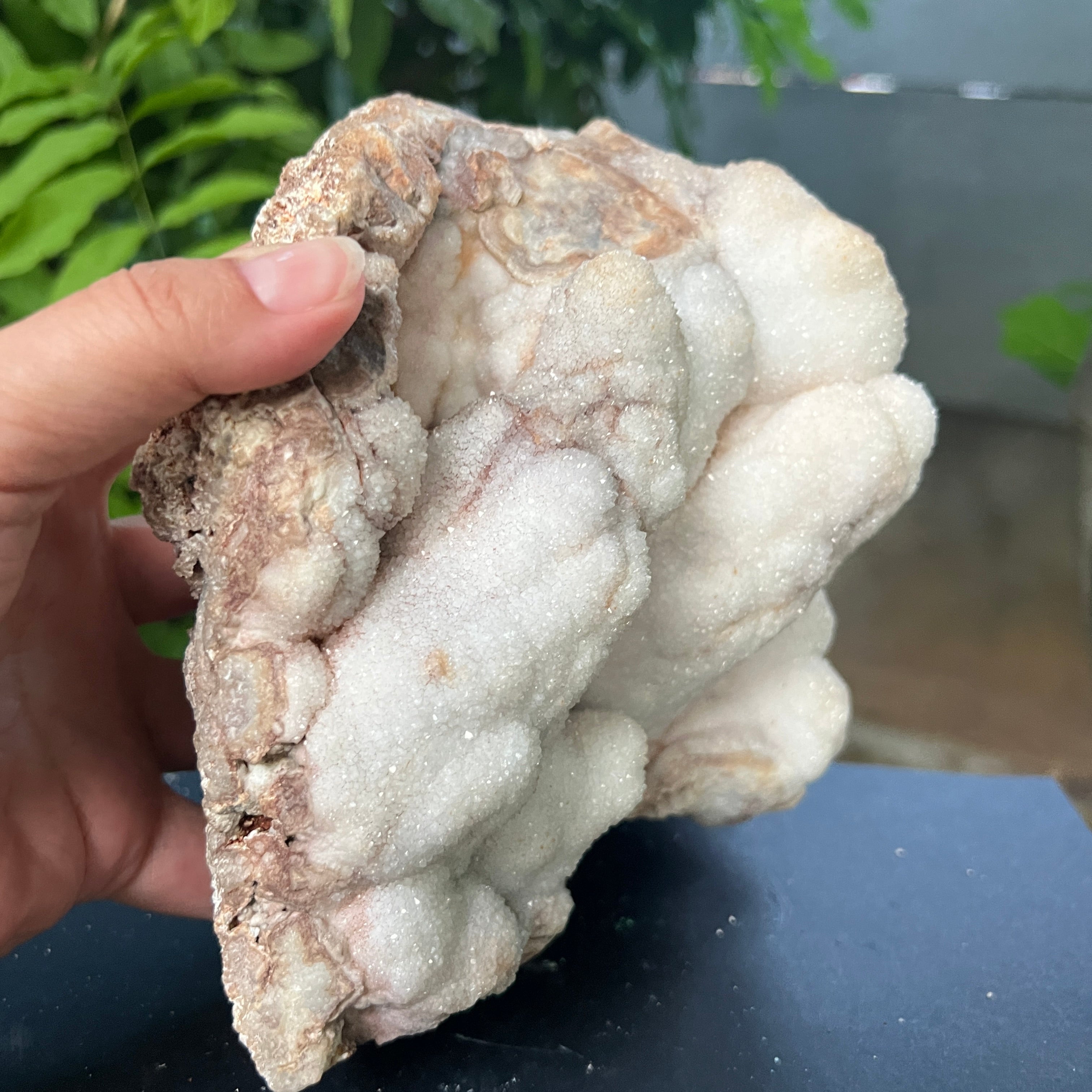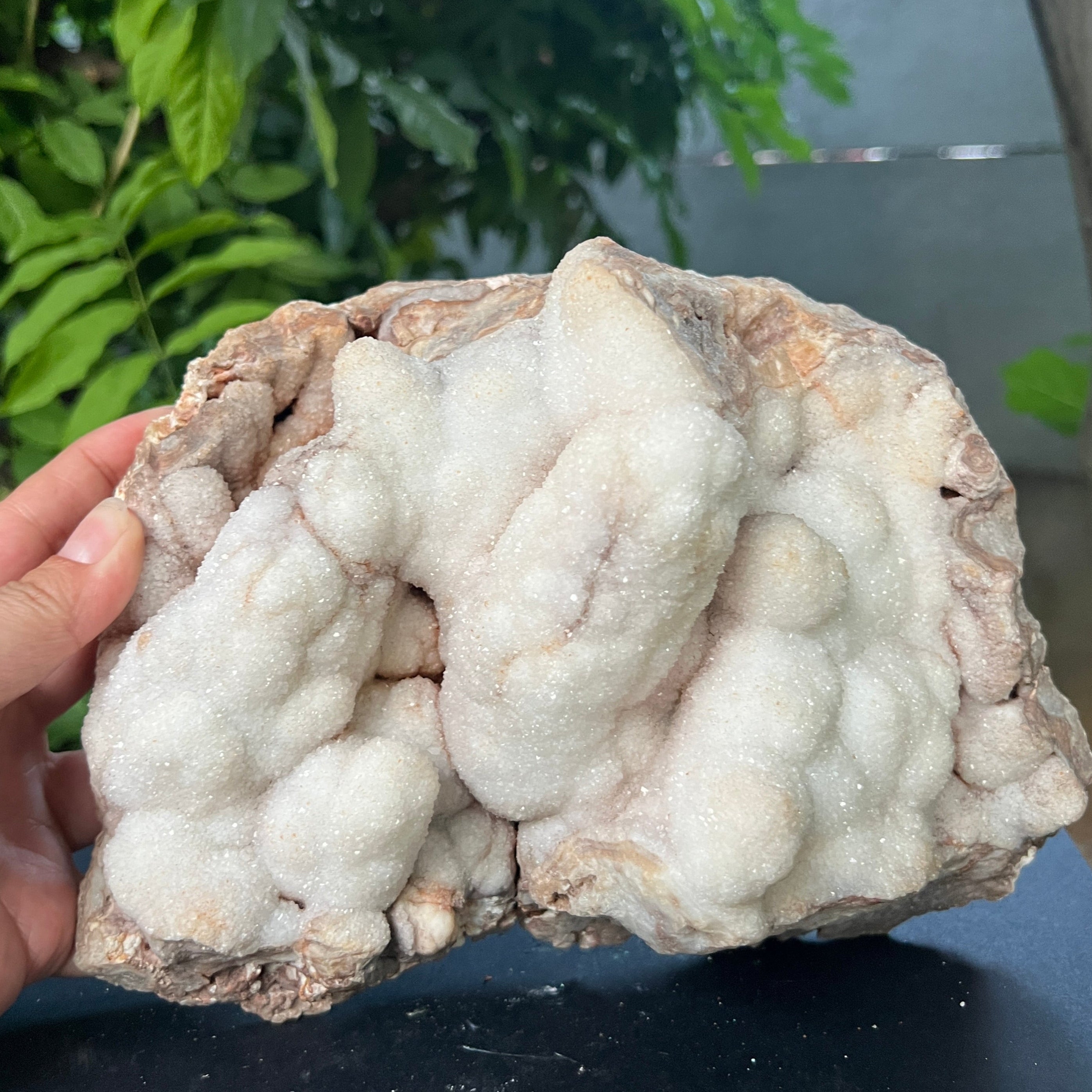 Ez egy ritka és lenyűgöző darab: ez a botrioid kvarc természetes képződmény olyan, mintha az idő hullámai szobrászként formálták volna, egy organikus formák táncában, finom druzy kristálybevonattal fedve. Felülete természetes fényben diszkréten csillog, köszönhetően a finoman kristályosodott rétegnek, amely a sima, majdnem szobrászi alapfelszínt borítja.