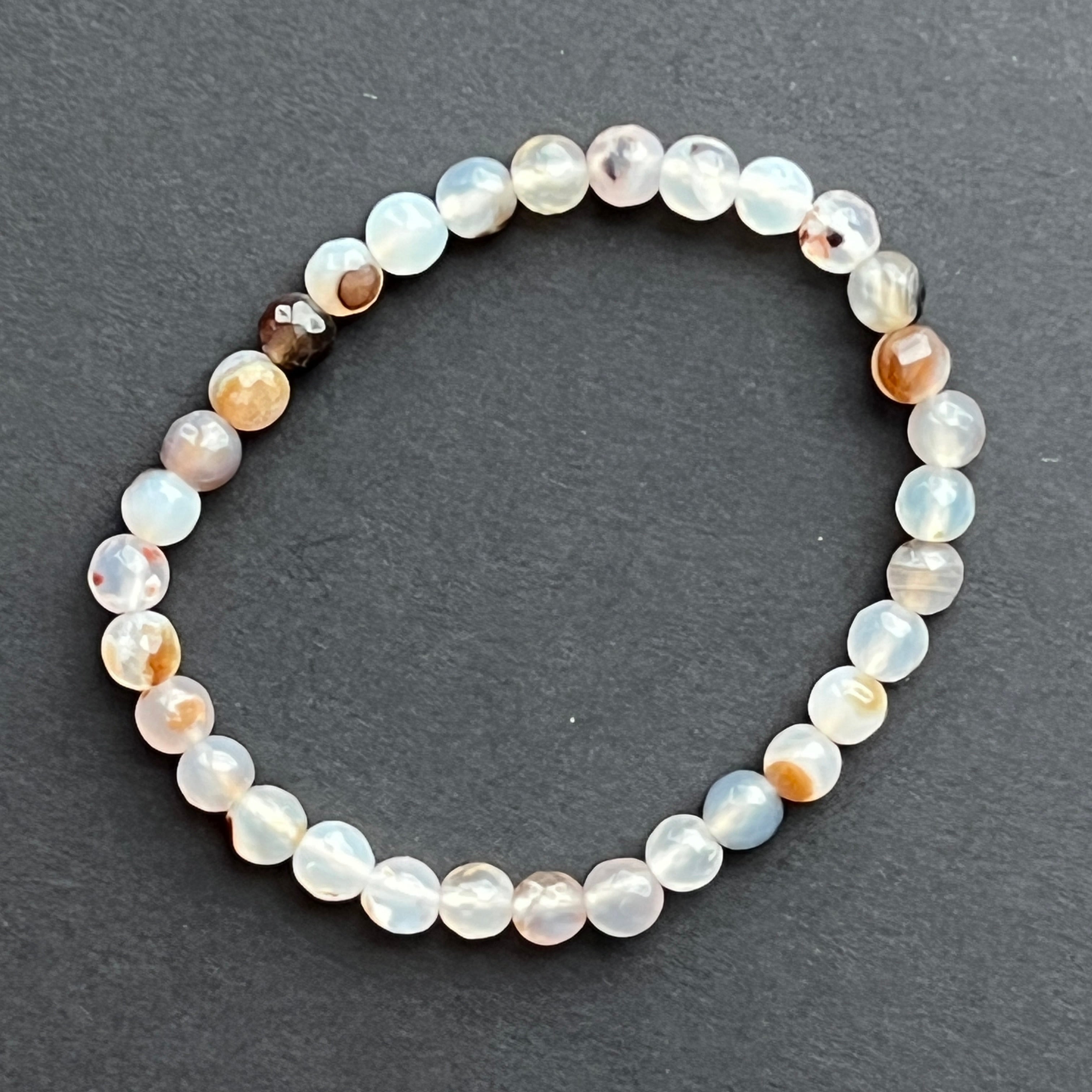 Ez a botswanai achát fazettált karkötő, mely 6 mm-es gömb alakú gyöngyökből áll, diszkrét eleganciájával ragadja meg a figyelmet a természetes csíkok révén. A lágy színek – szürke, barna, fehér és néha finom rózsaszín árnyalatok – lenyűgöző vizuális játékot hoznak létre, amelyet a finoman fénylő fazetták emelnek ki.
