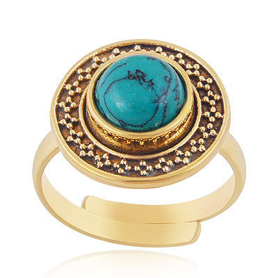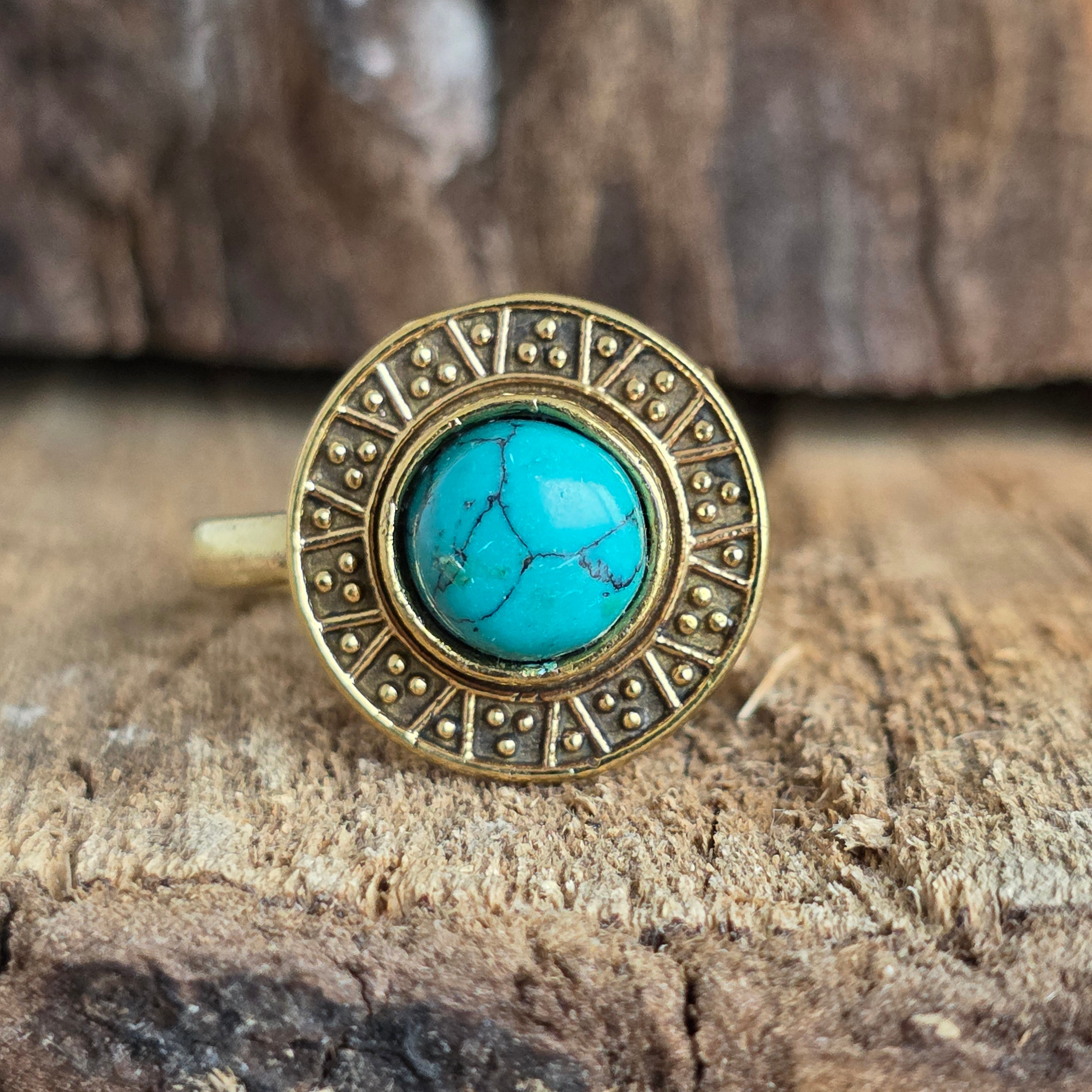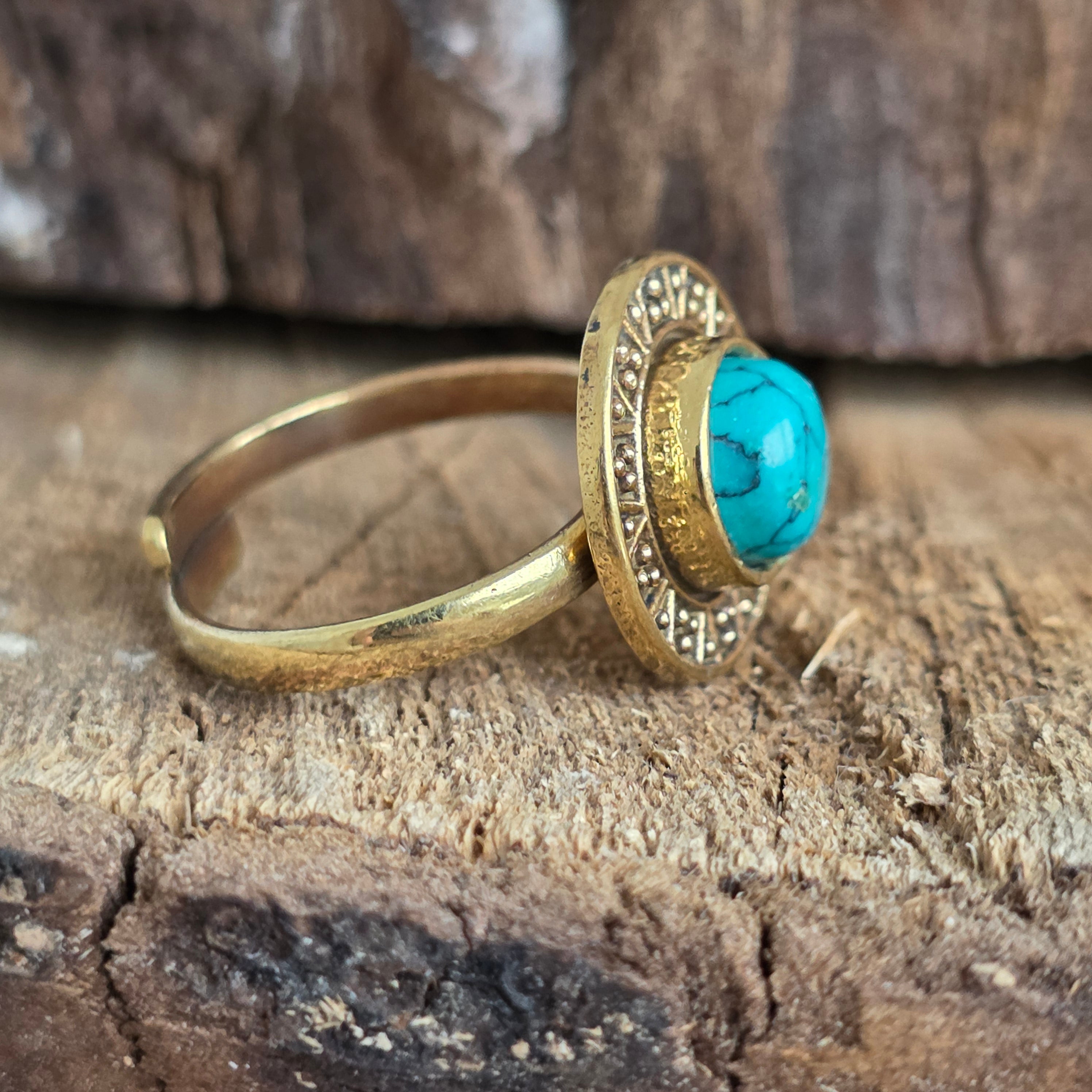 Személyes gyűrű, amelyet a hagyományos indiai kézművesség ihletett Nyers munka, készült fémötvözet fényes bronz felülettel és nemesítették a természetes türkiz kő.