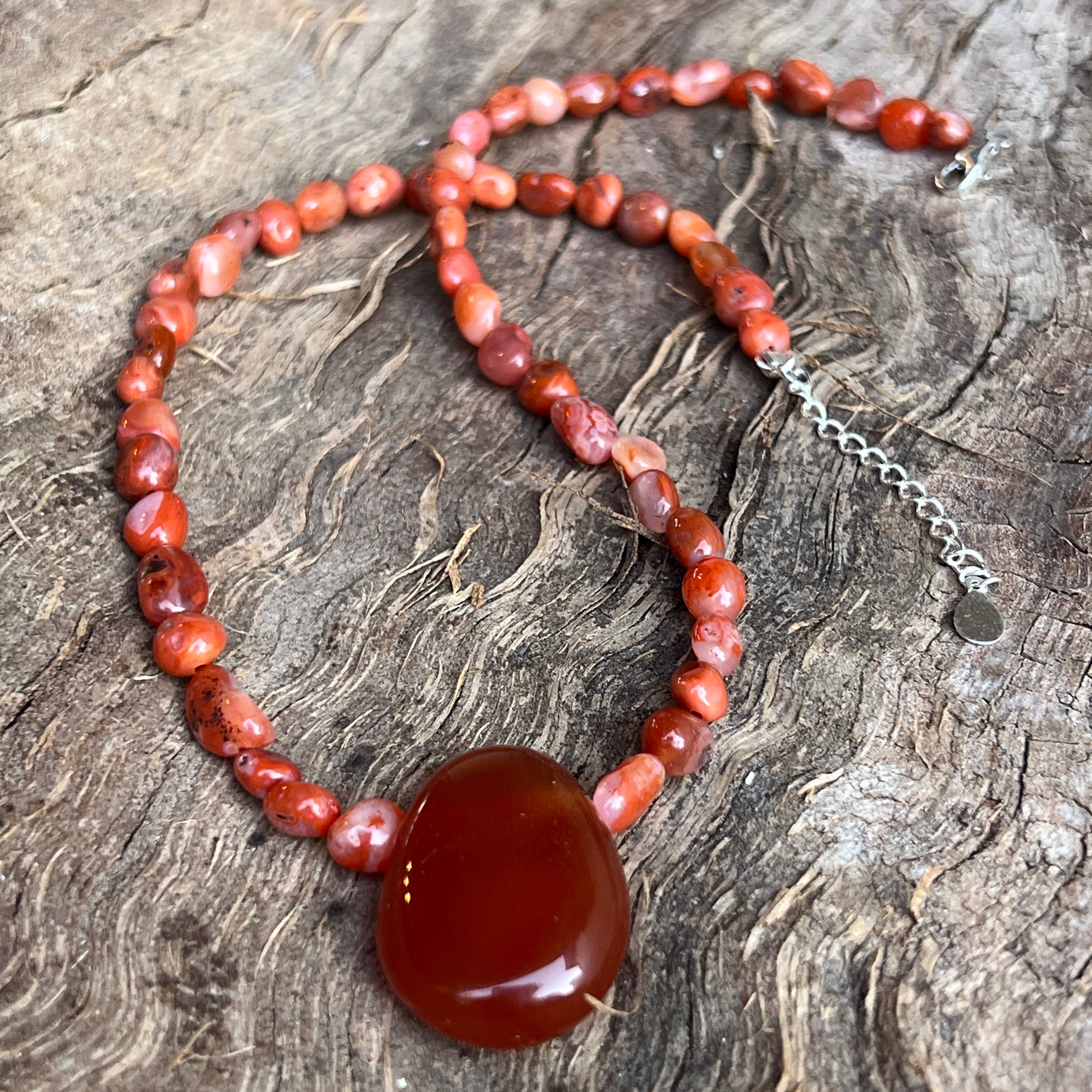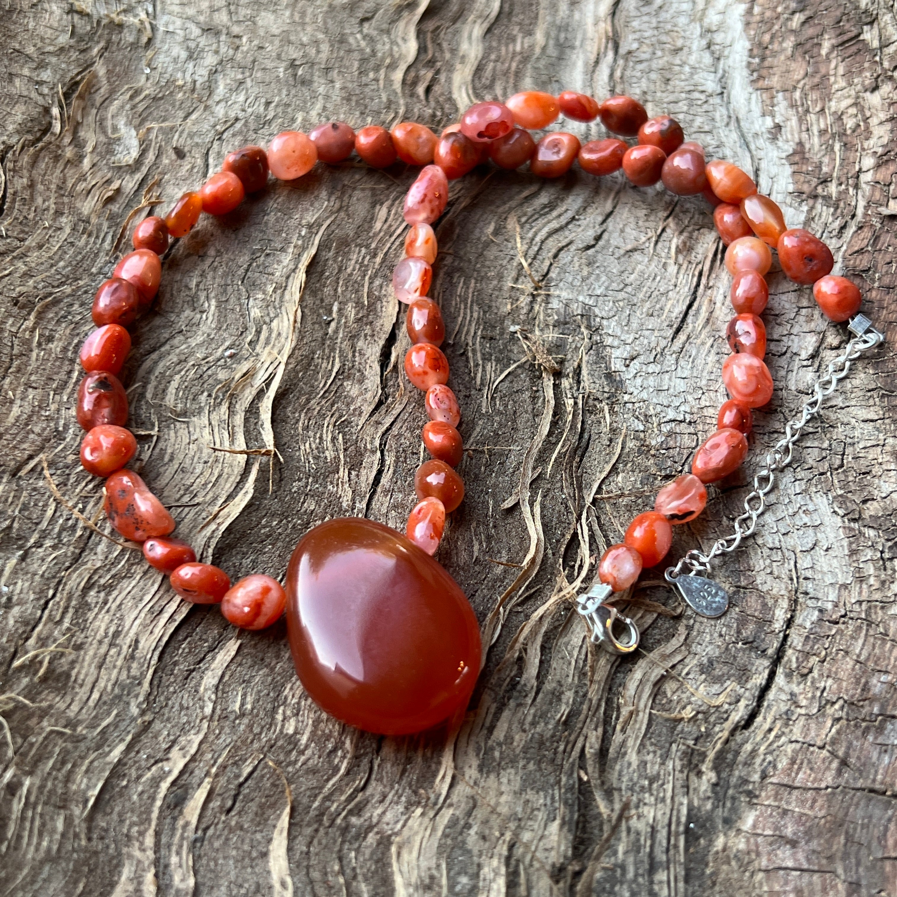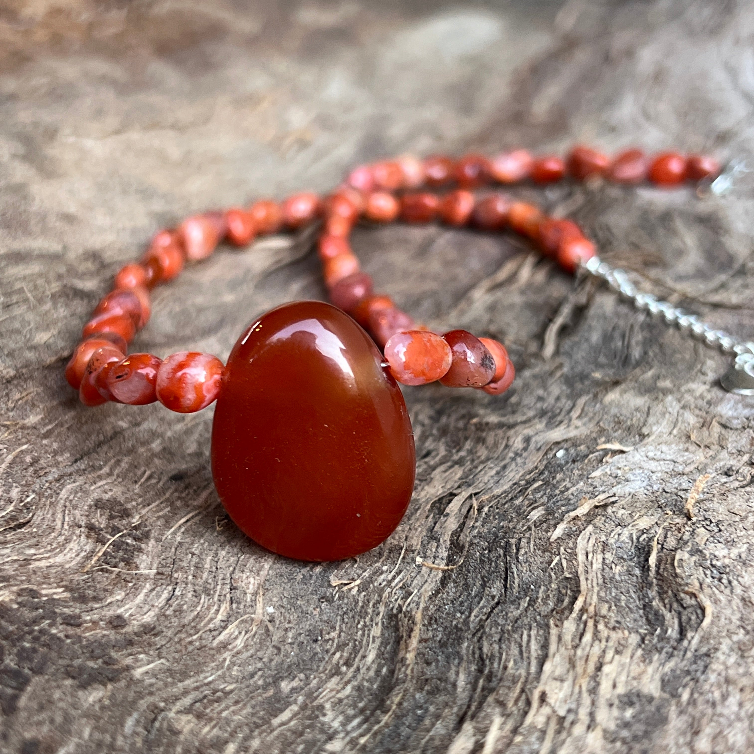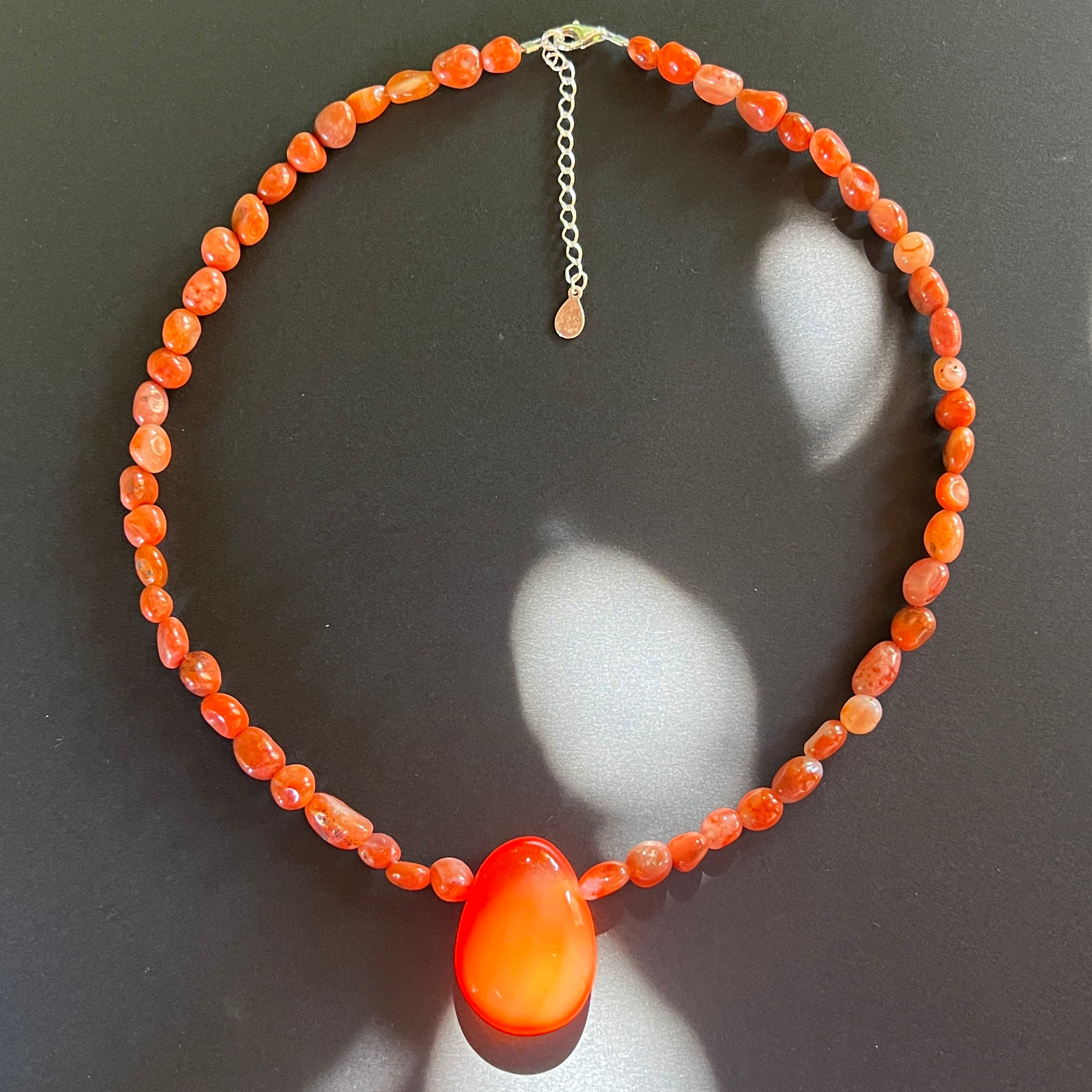 Az ékszer központjában egy körülbelül 3 cm-es, csepp alakú karneol medál ad erőteljes, központi hangsúlyt – mint egy ásványi szikra, amely pontosan ott érinti a bőrödet, ahol a bátorság gyökeret ver.