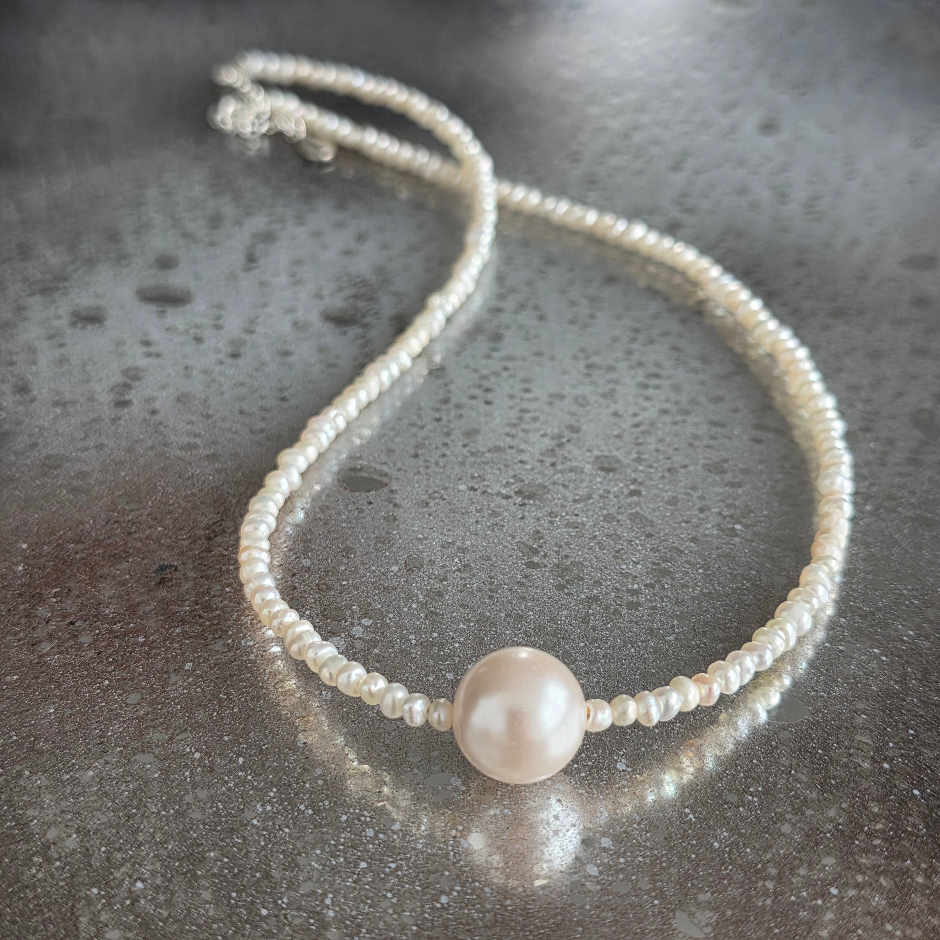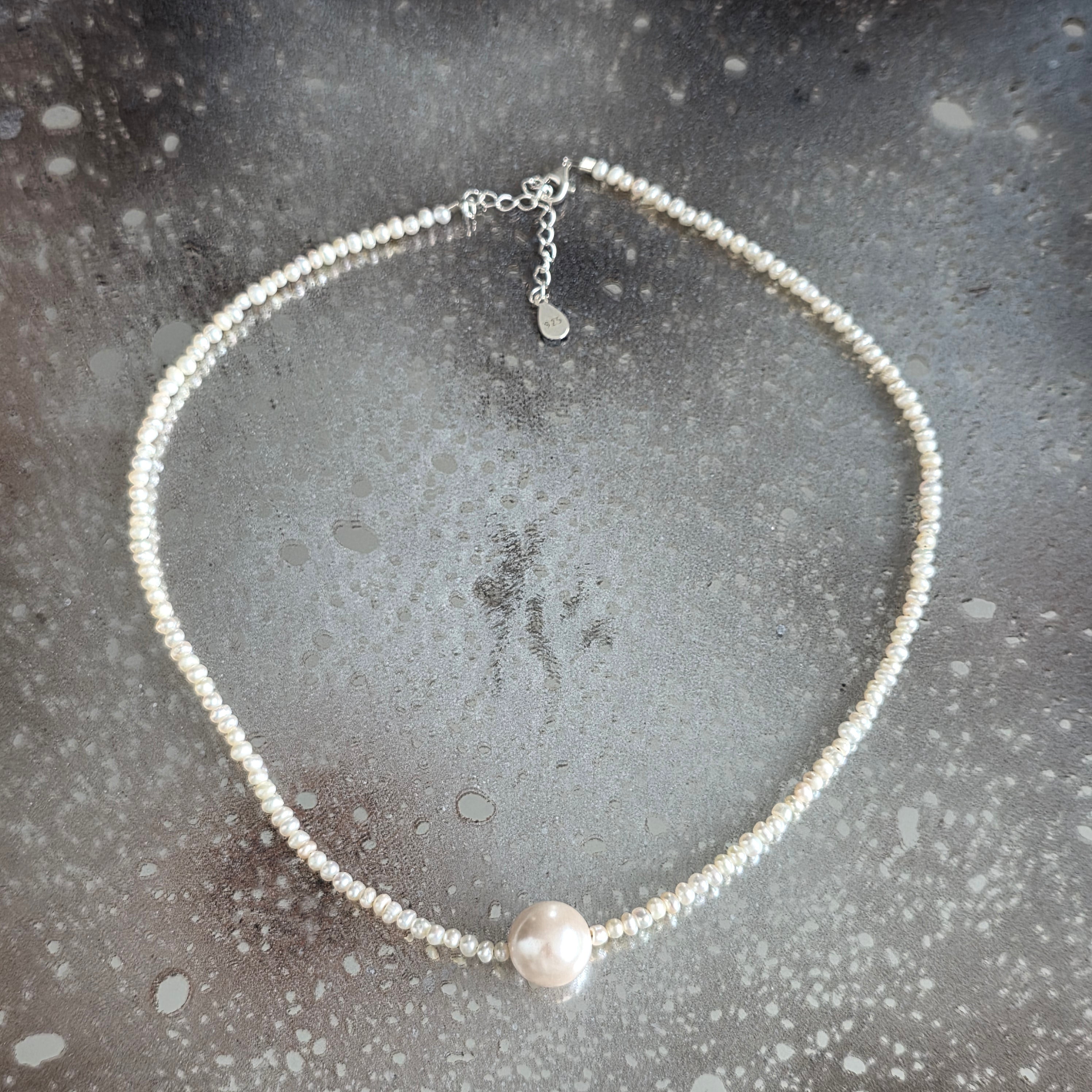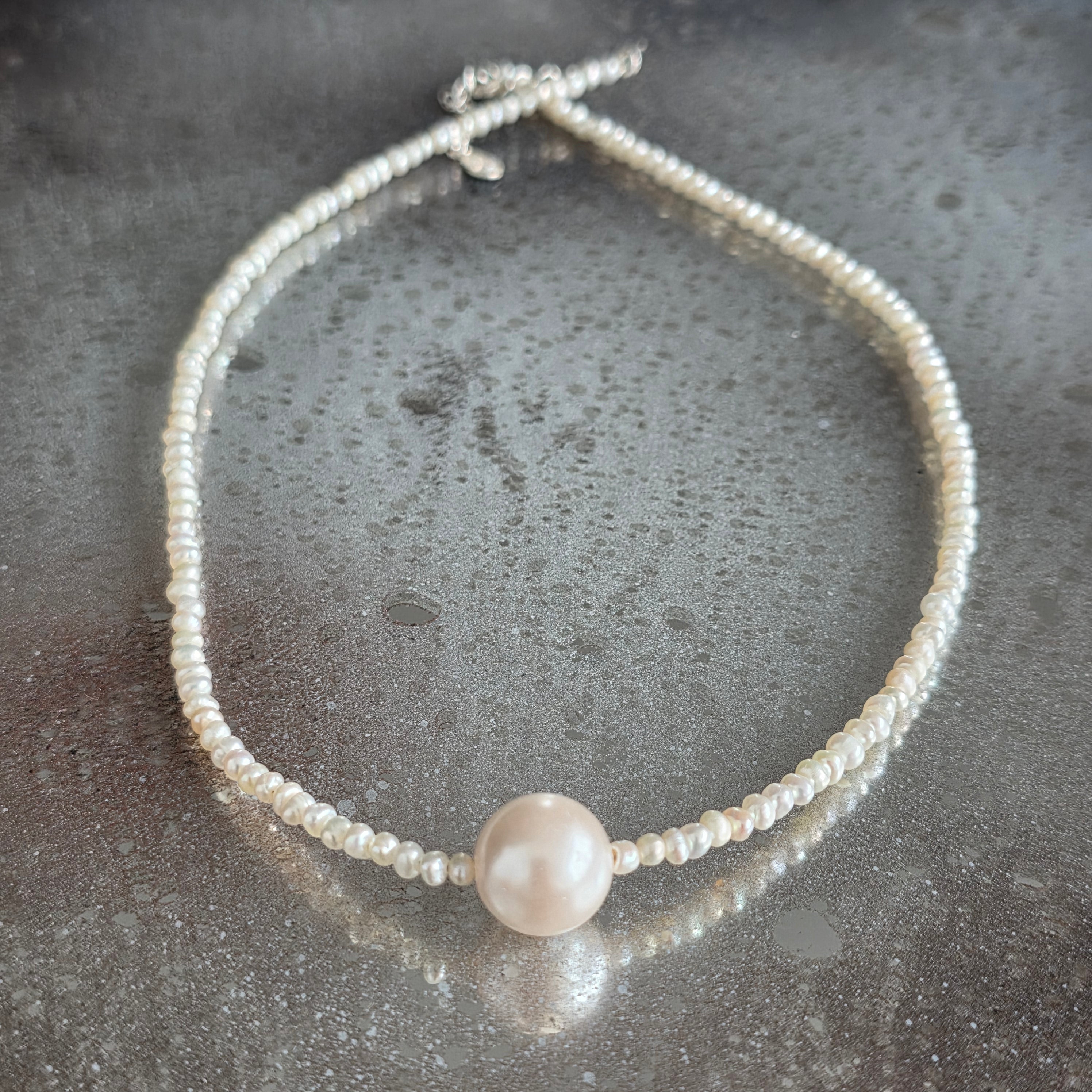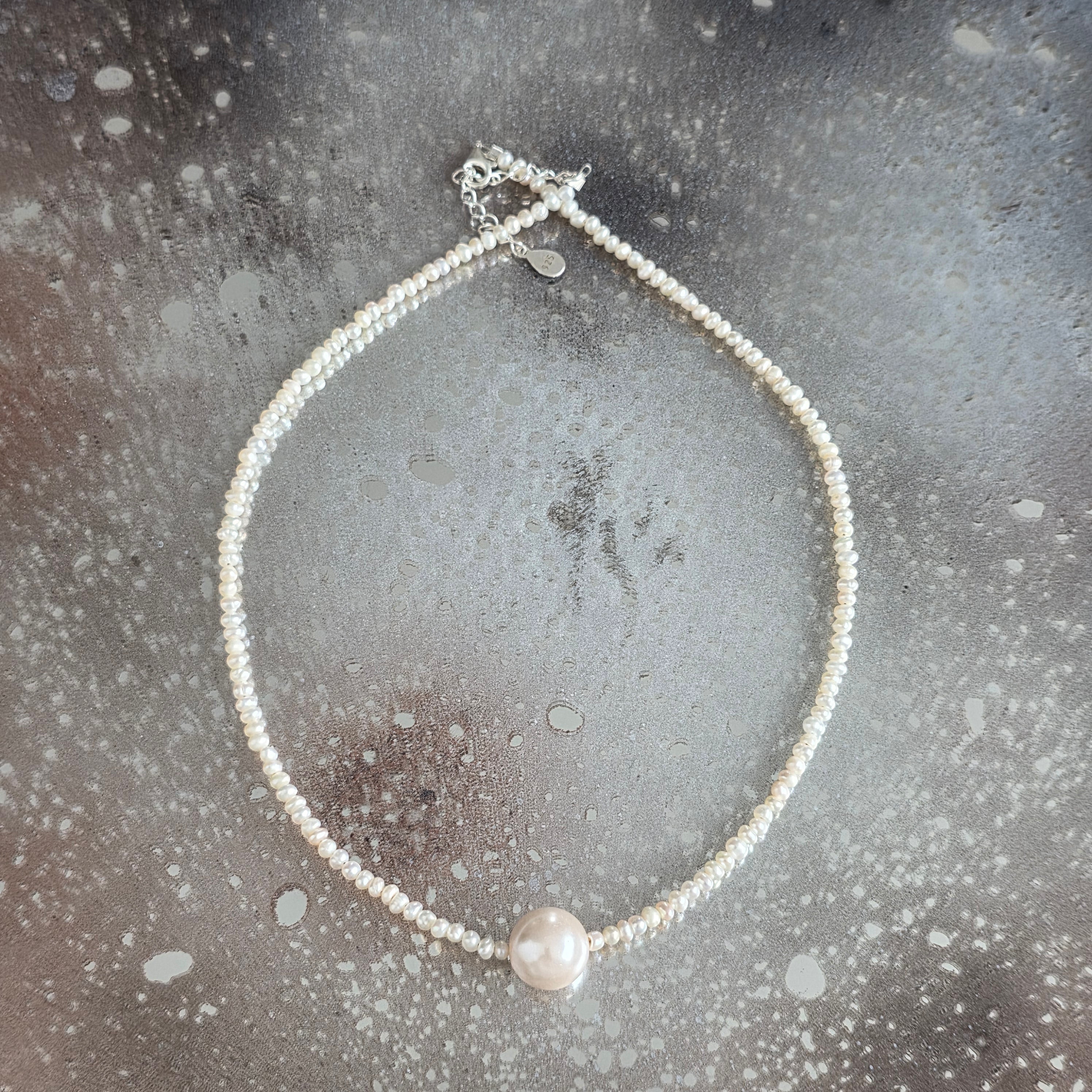 Egy finom nyaklánc, amely egyensúlyi pont köré épül – egy központi kerek gyöngy, amely diszkréten vonzza a tekintetet és ritmust ad az egész kompozíciónak. A 2,5 mm-es gyöngysor finom, elegáns alapot teremt, kiemelve a központi gyöngy hangsúlyát túlzás nélkül.