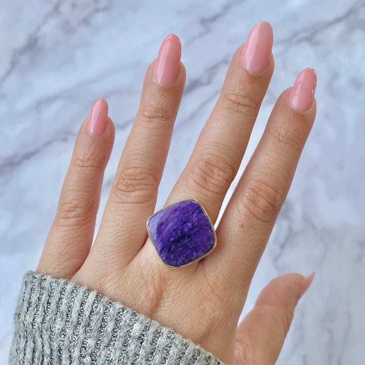 Válassza ezt a természetes charoit ezüst gyűrűt, egy olyan darabot, amely felismerhetetlen megjelenésével tűnik ki, élénk lila árnyalataival és egyedi textúráival. 925-ös ezüstbe foglalva ez a gyűrű kiemeli a kő természetes szépségét és kifinomultságot ad bármilyen öltözékhez.
