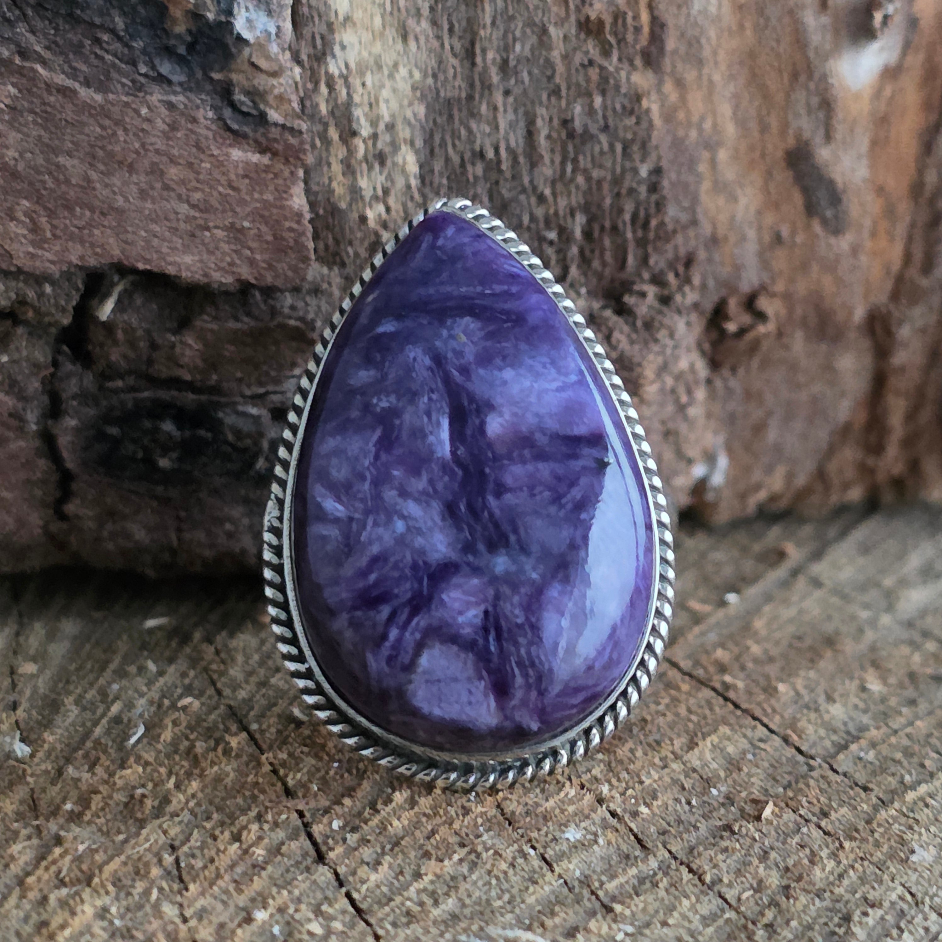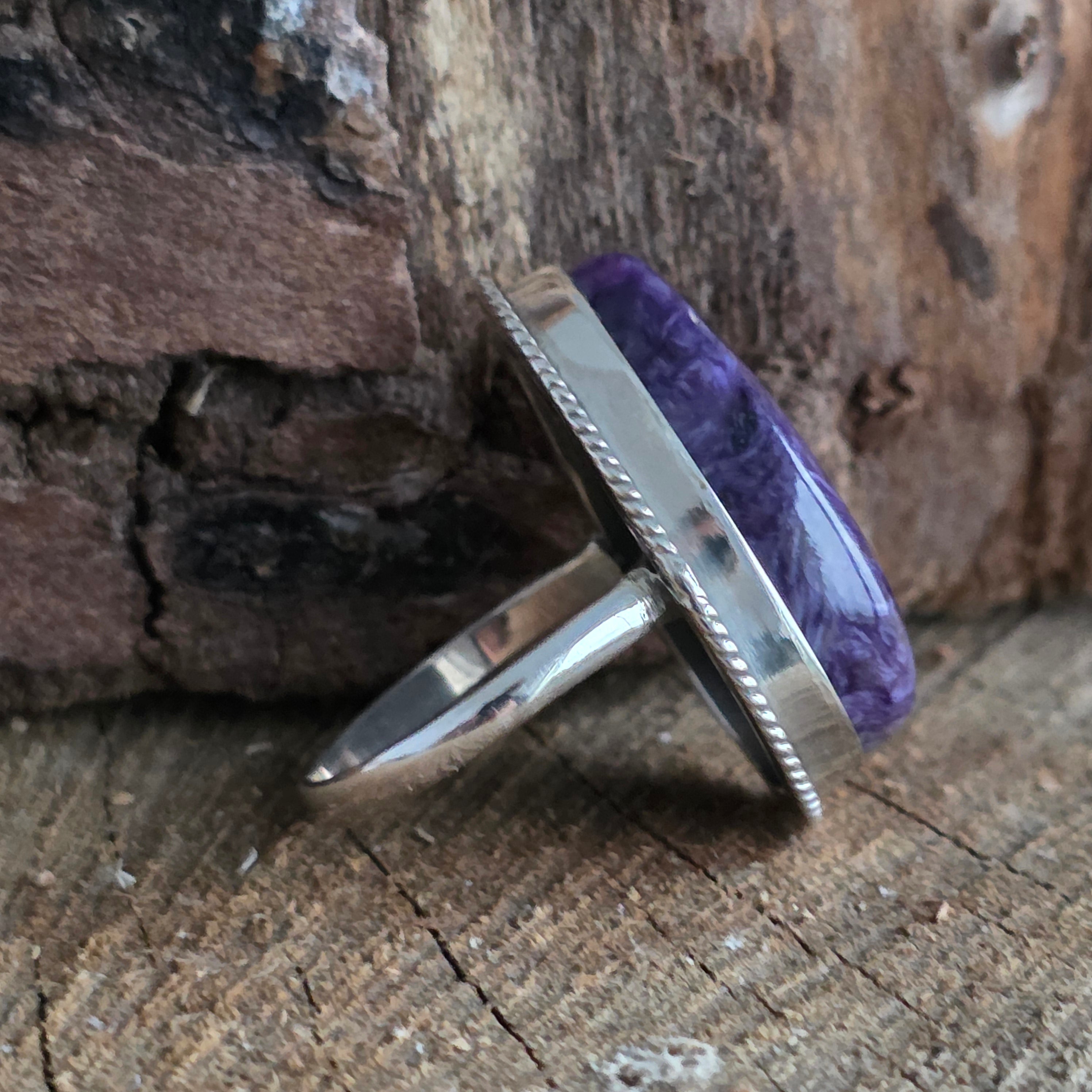 Masszív gyűrű, kézzel készített 925 ezüst, melyben természetes kő található Charoit, élénk lila árnyalatokkal és kozmikus festményre emlékeztető selymes tükröződésekkel. Stílusos dekoratív keret sodrott drót munka mélységet és kifinomultságot ad, egyensúlyban tartva a modern eleganciát a hagyományos kivitelezéssel.