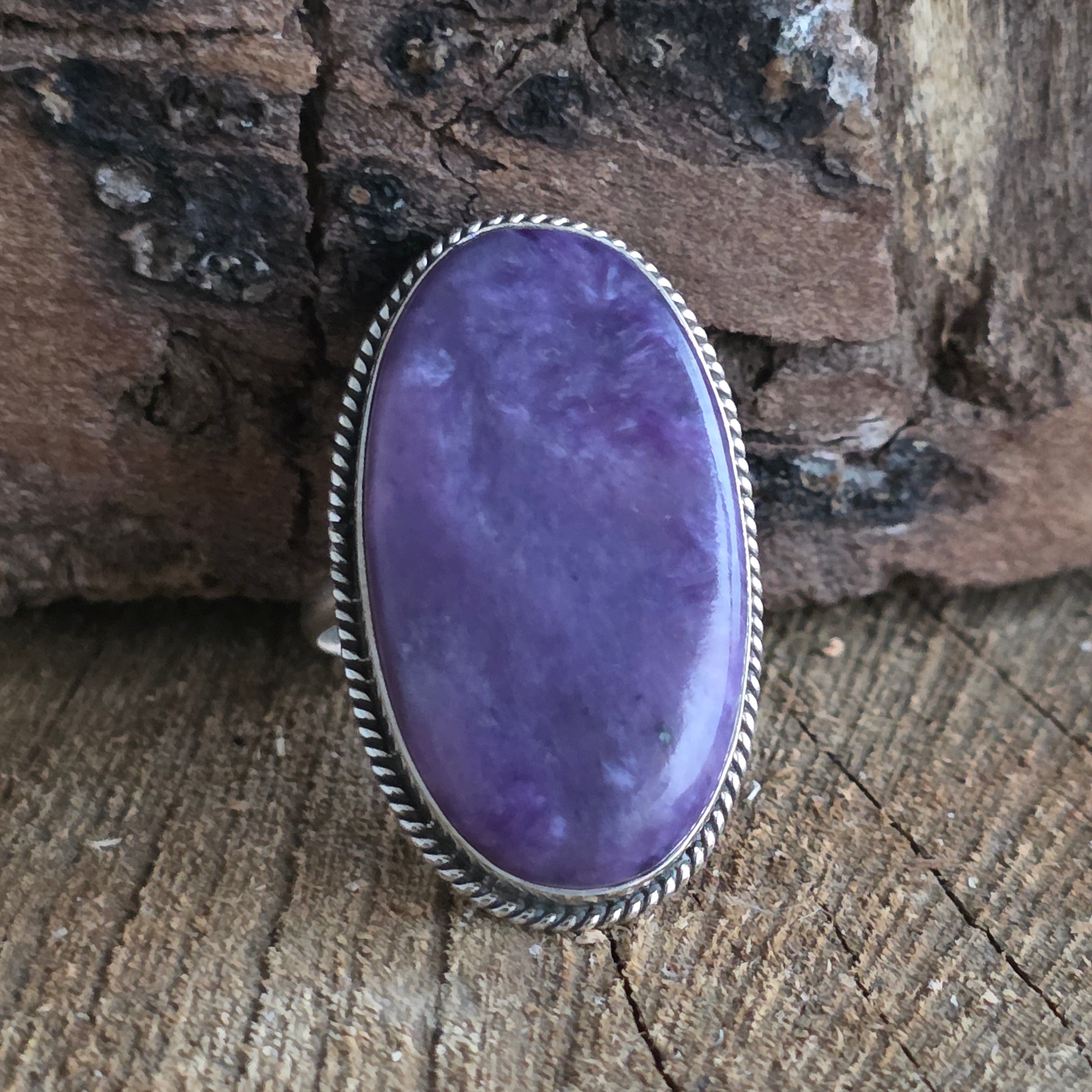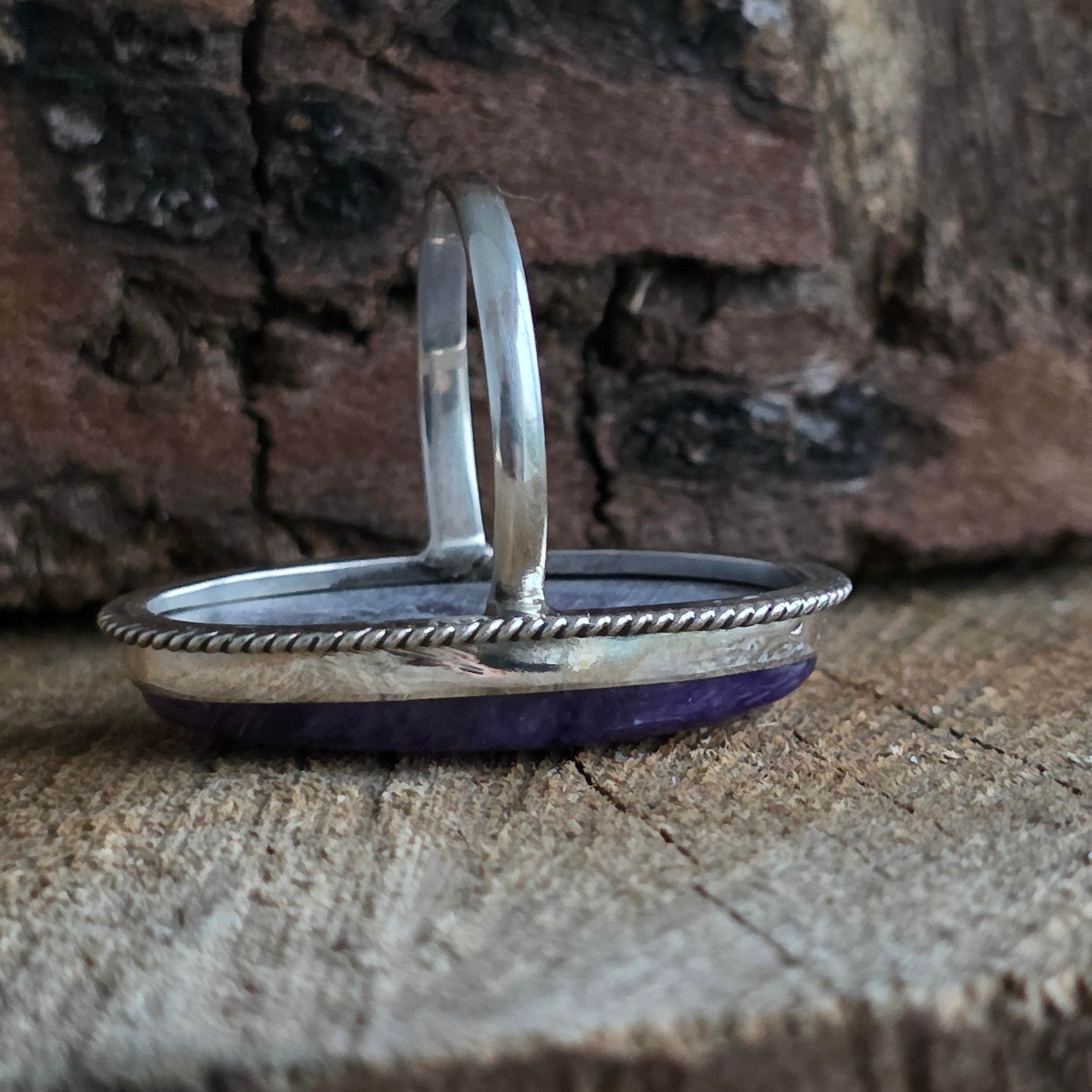 Masszív gyűrű, kézzel készített 925 ezüst, melyben természetes kő található Charoit, élénk lila árnyalatokkal és kozmikus festményre emlékeztető selymes tükröződésekkel. Stílusos dekoratív keret sodrott drót munka mélységet és kifinomultságot ad, egyensúlyban tartva a modern eleganciát a hagyományos kivitelezéssel.
