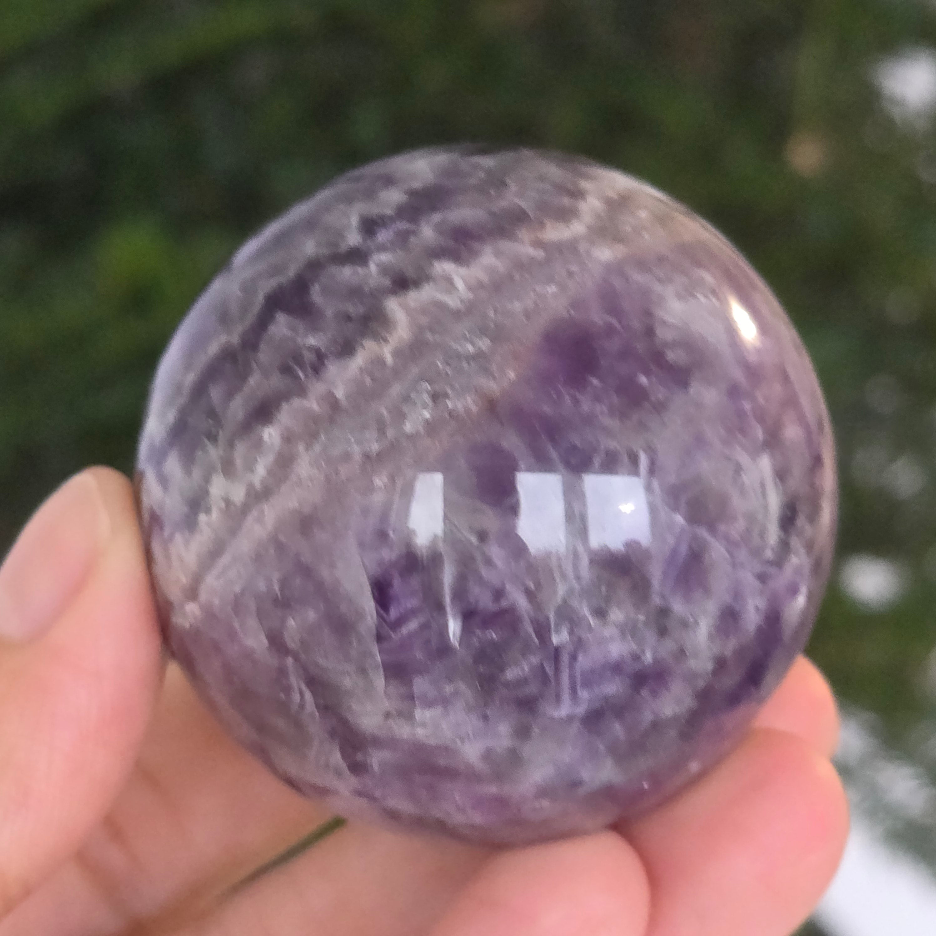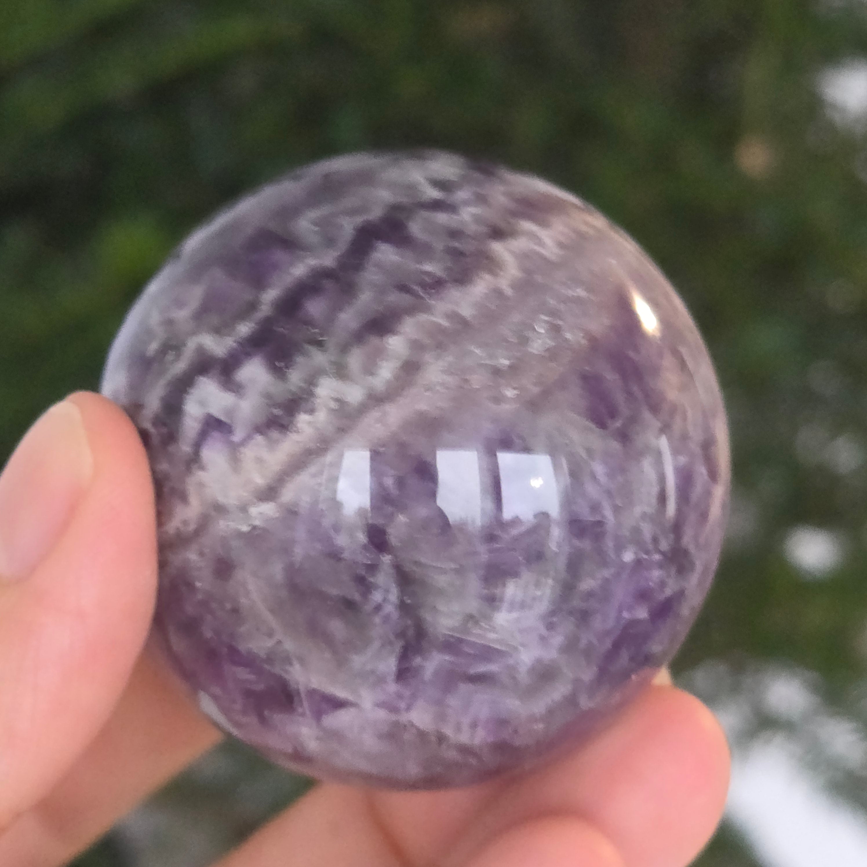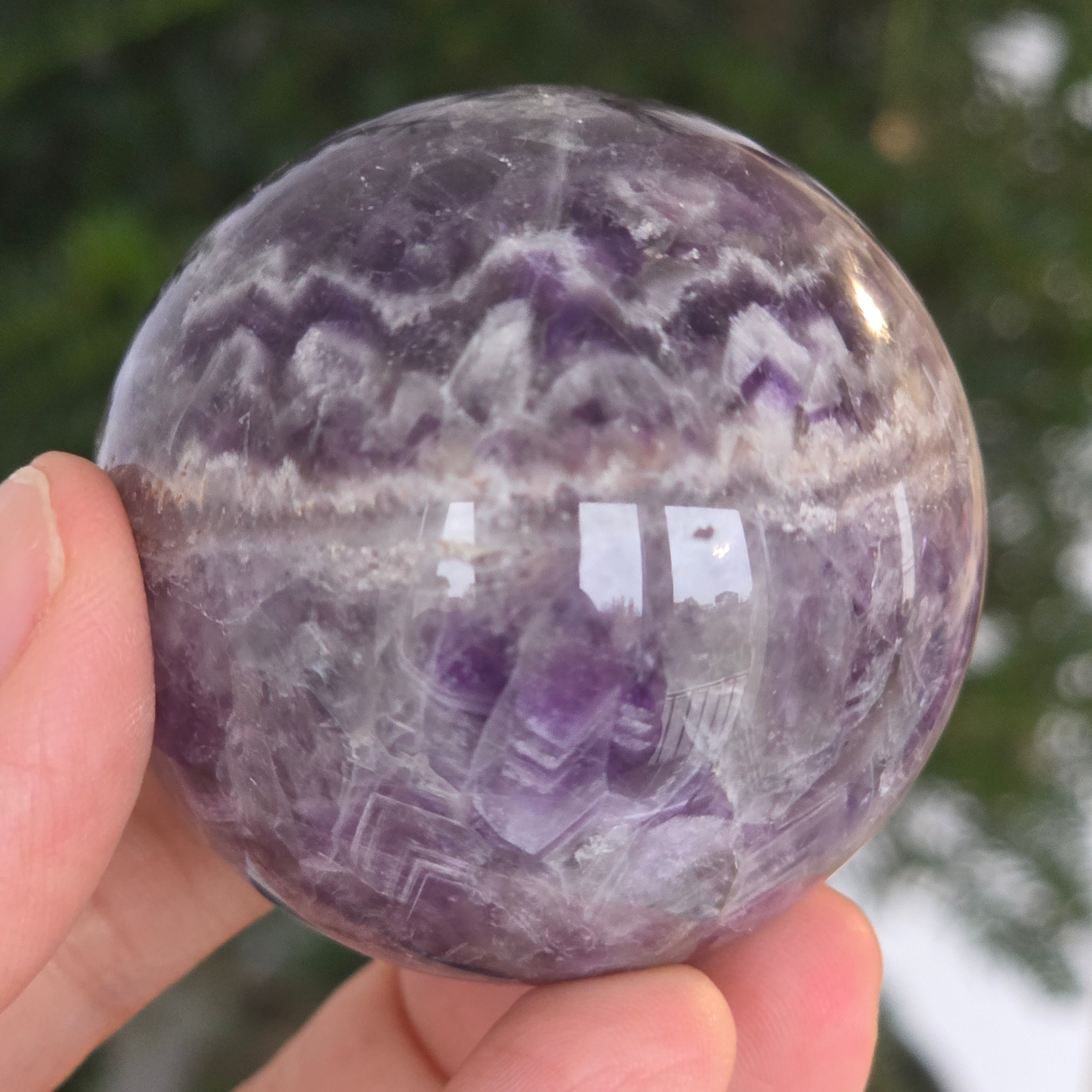 Egy gömb, amely mintha egy lila éjszaka fényét koncentrálná belsejében. Ez az egyedi darab természetes chevron ametisztbőllenyűgöző lila, fehér és levendula rétegeket tár fel, V alakú mintában – ennek a ritka ametiszt változatnak a jellegzetes jele. A tökéletesen csiszolt, tapintásra bársonyos felület hipnotikus finomsággal tükrözi a fényt, békét és kifinomultságot hozva minden térbe.