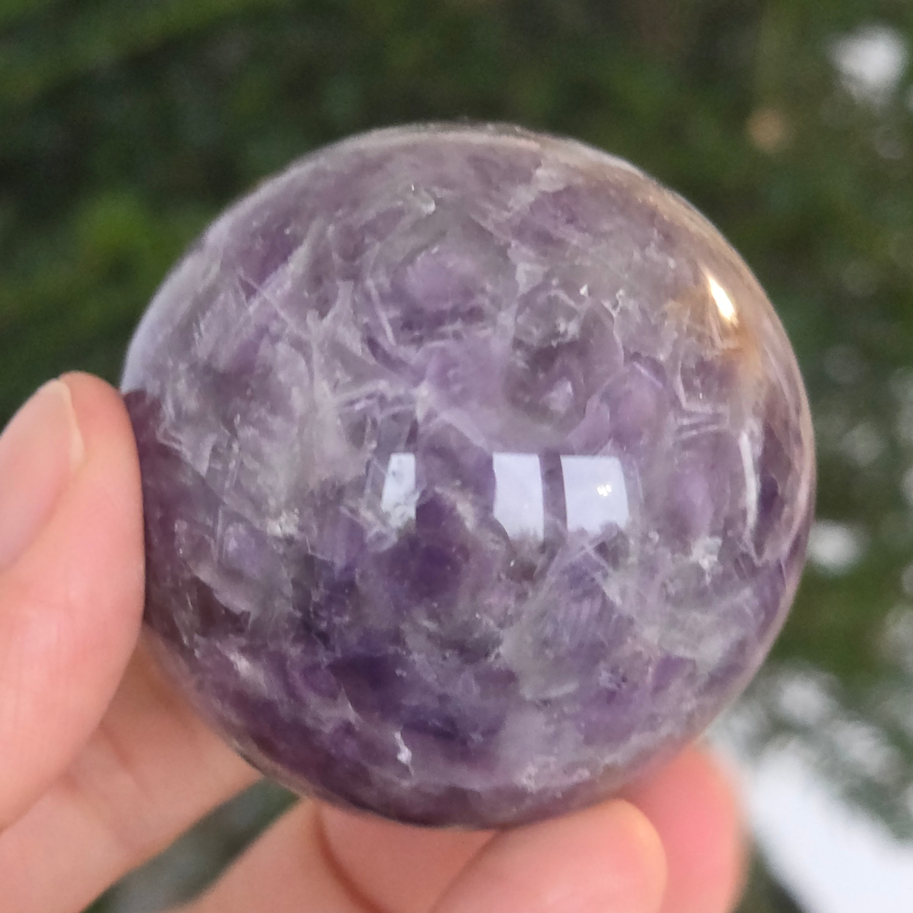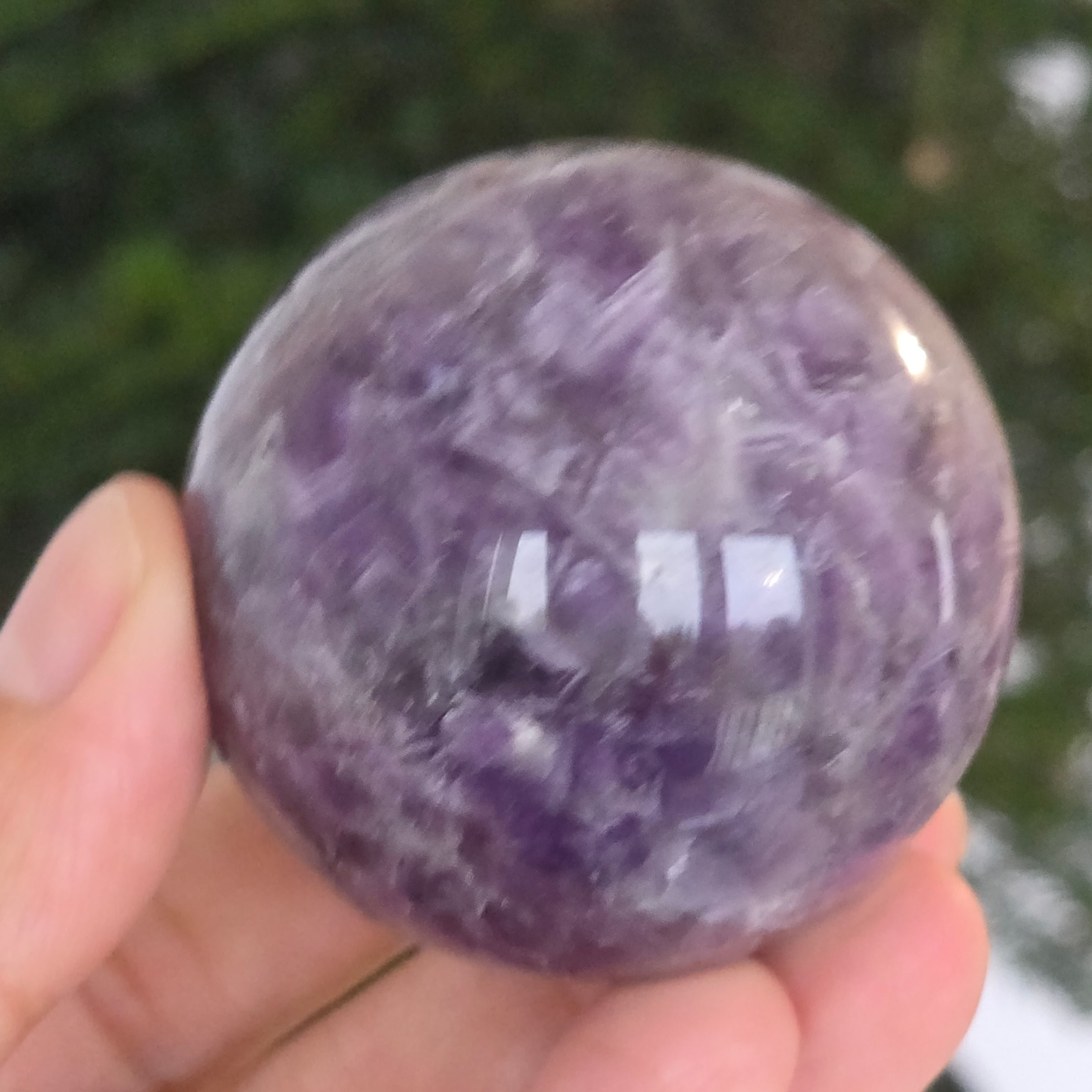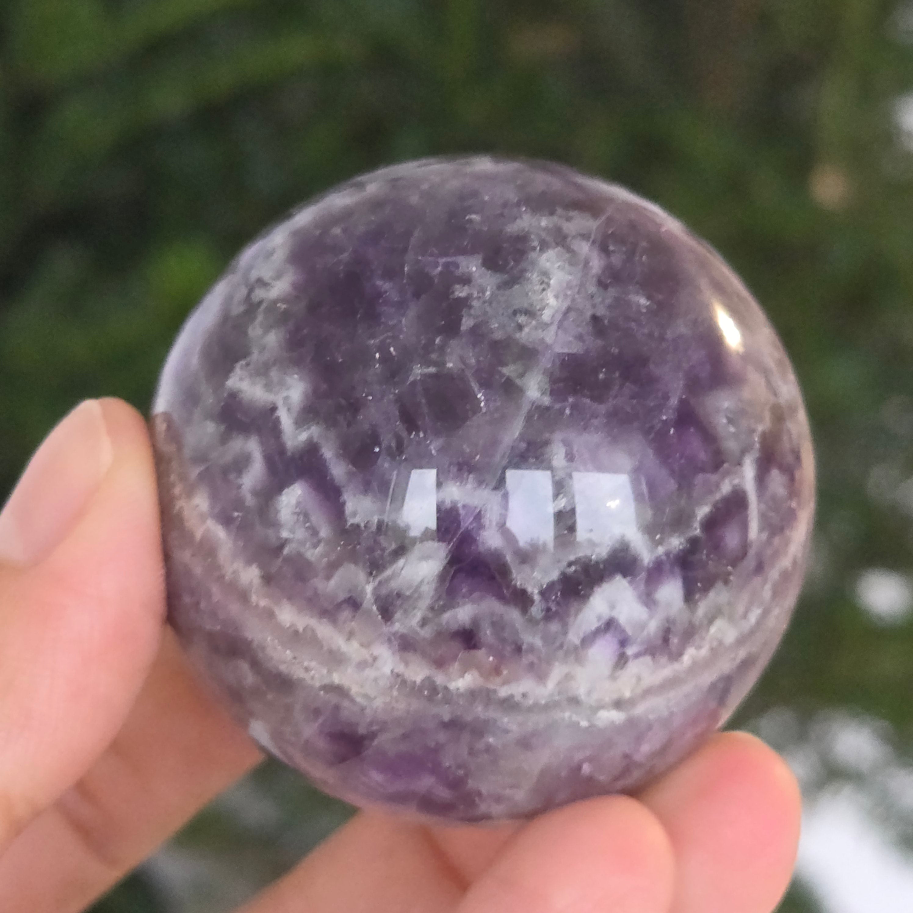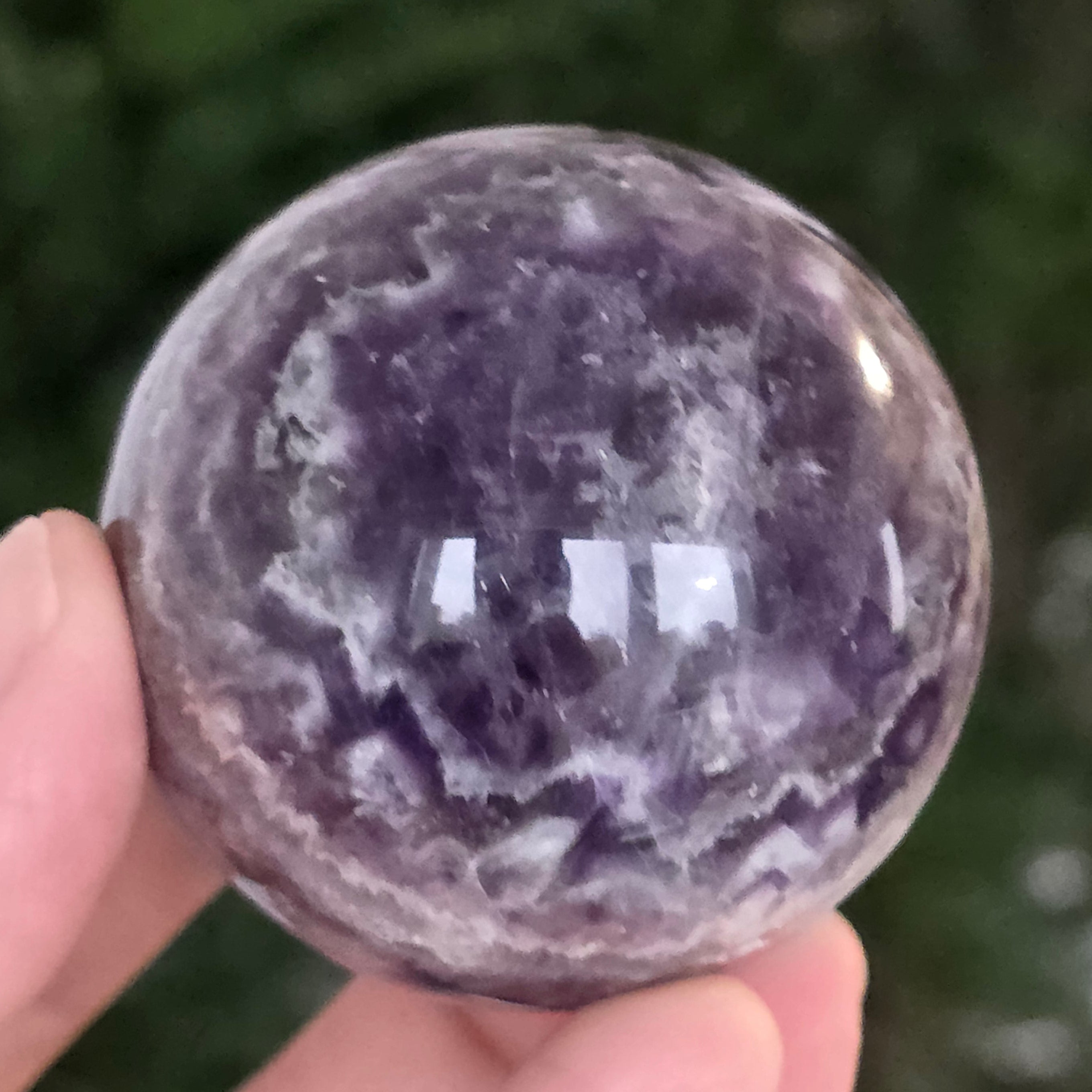 Egy gömb, amely mintha egy lila éjszaka fényét koncentrálná belsejében. Ez az egyedi darab természetes chevron ametisztbőllenyűgöző lila, fehér és levendula rétegeket tár fel, V alakú mintában – ennek a ritka ametiszt változatnak a jellegzetes jele. A tökéletesen csiszolt, tapintásra bársonyos felület hipnotikus finomsággal tükrözi a fényt, békét és kifinomultságot hozva minden térbe.