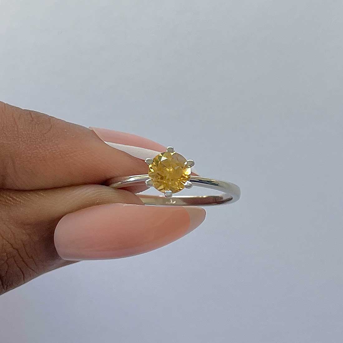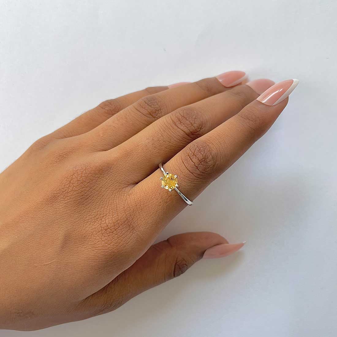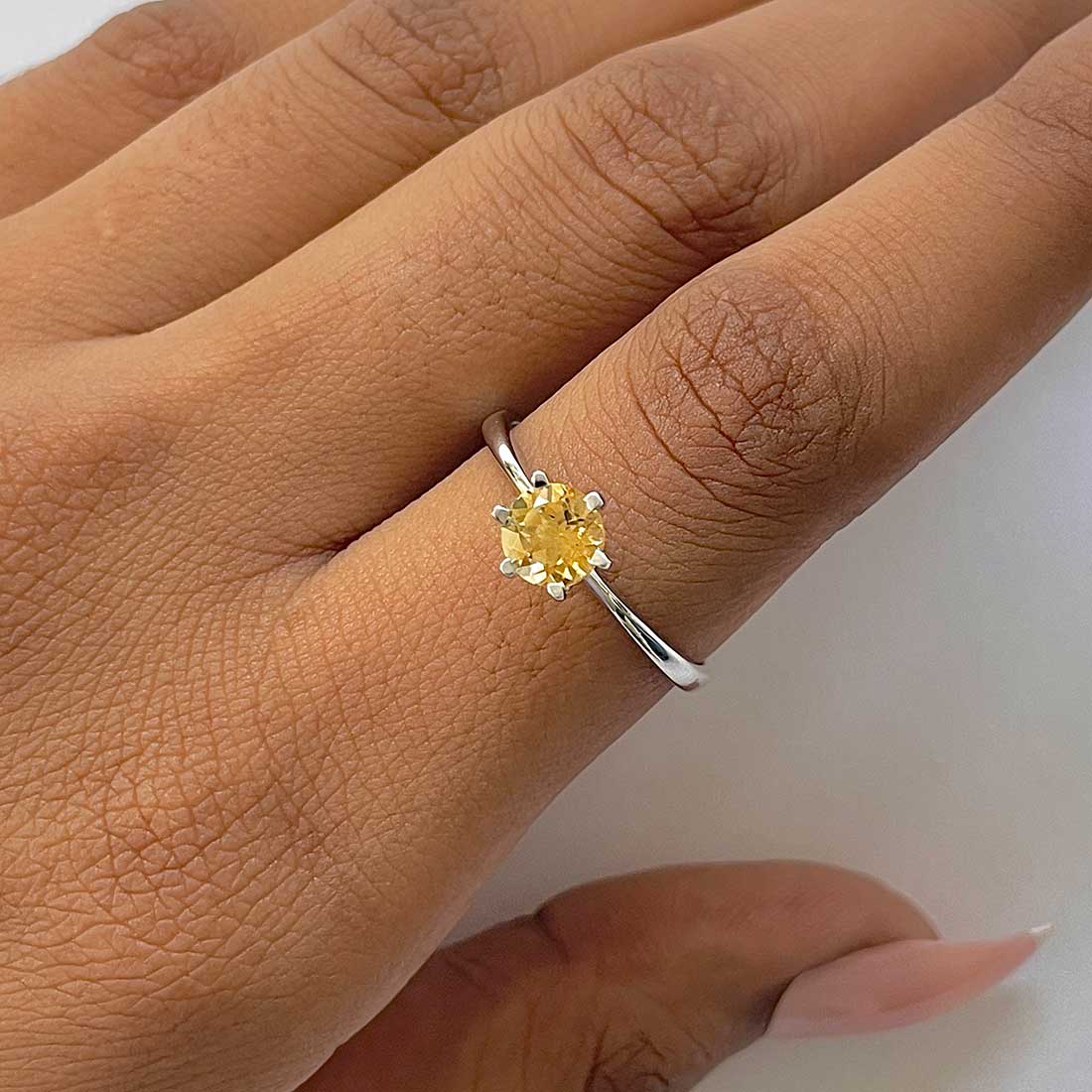 Ez a 925 ezüstből készült, természetes citrinnel díszített gyűrű napsugaras energiát és optimizmust sugároz. Klasszikus kialakítása, a kerek kő 6 prongban történő elegáns rögzítése kiemeli a citrin meleg sárga-arany árnyalatát, amely a öröm, vitalitás és jólét színe.