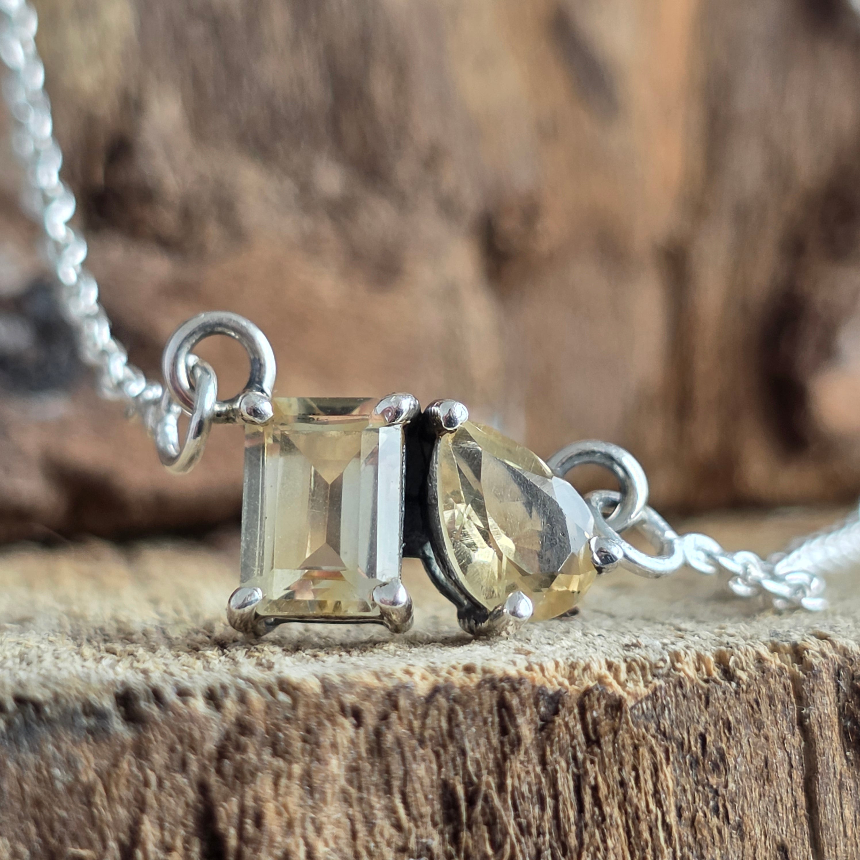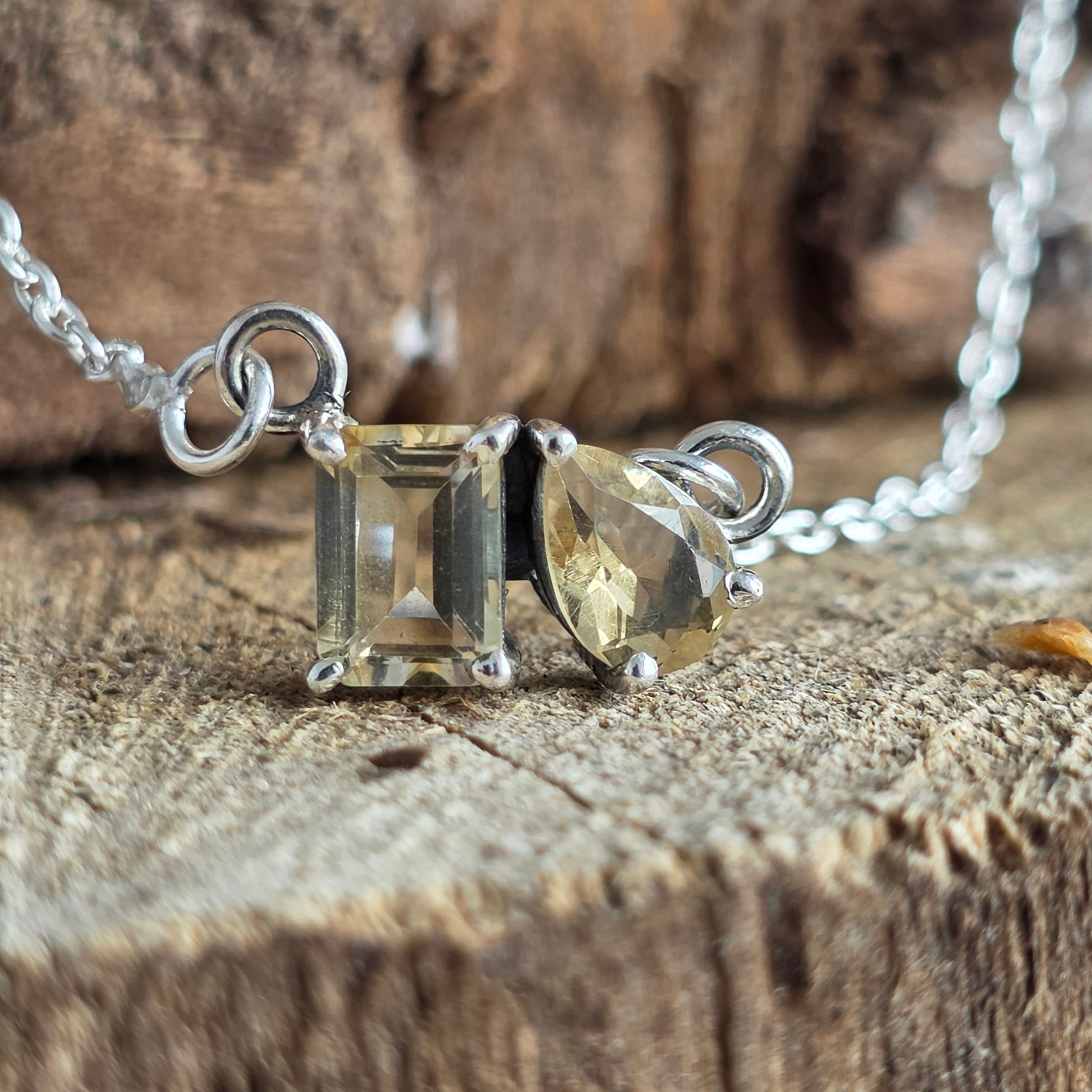 Finom nyaklánc, amelyből készült 925 ezüst, két kővel díszítve természetes citrin, az egyik téglalap, a másik körte alakú, amelyek együttesen fényes és kiegyensúlyozott kompozíciót alkotnak.