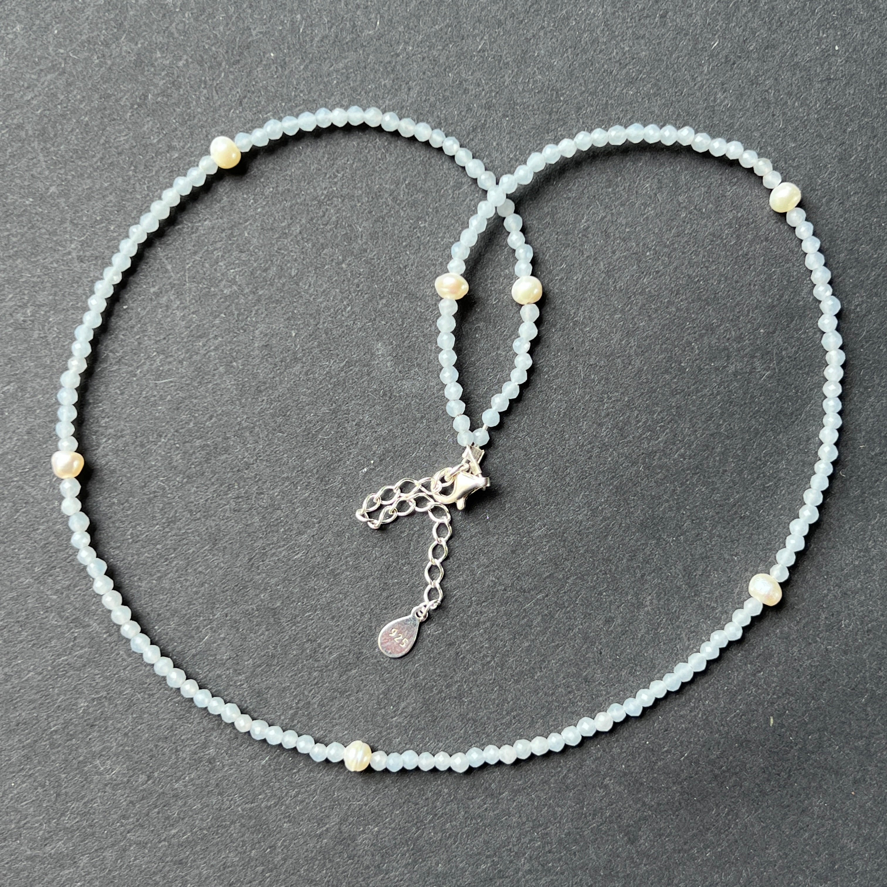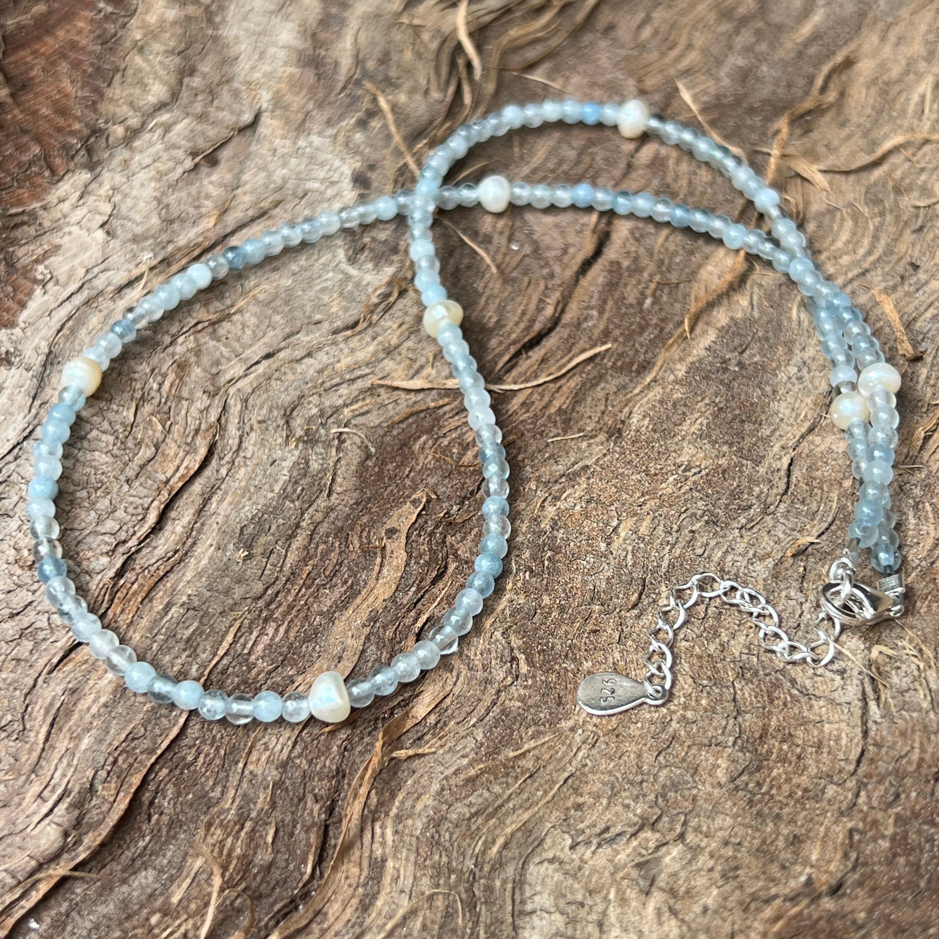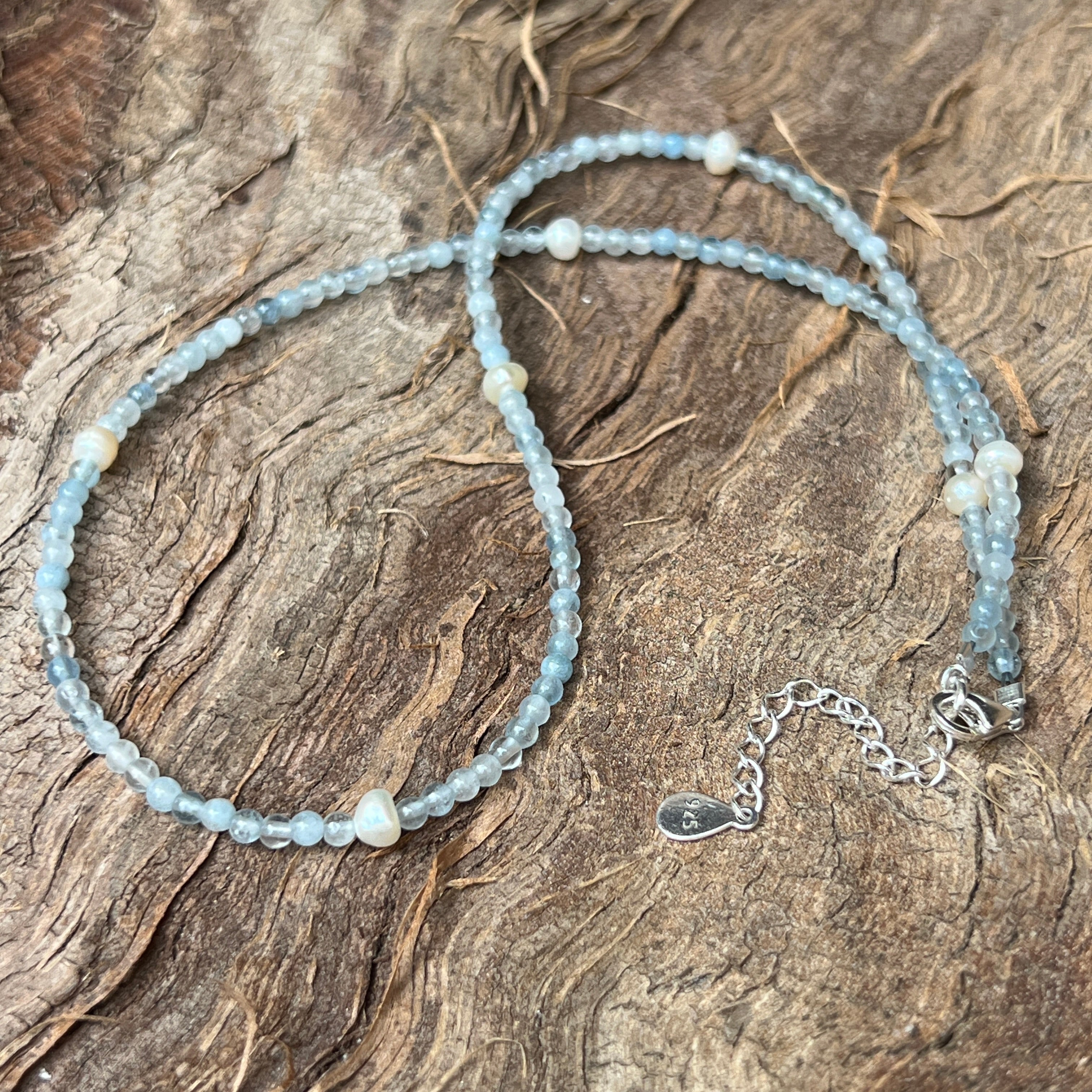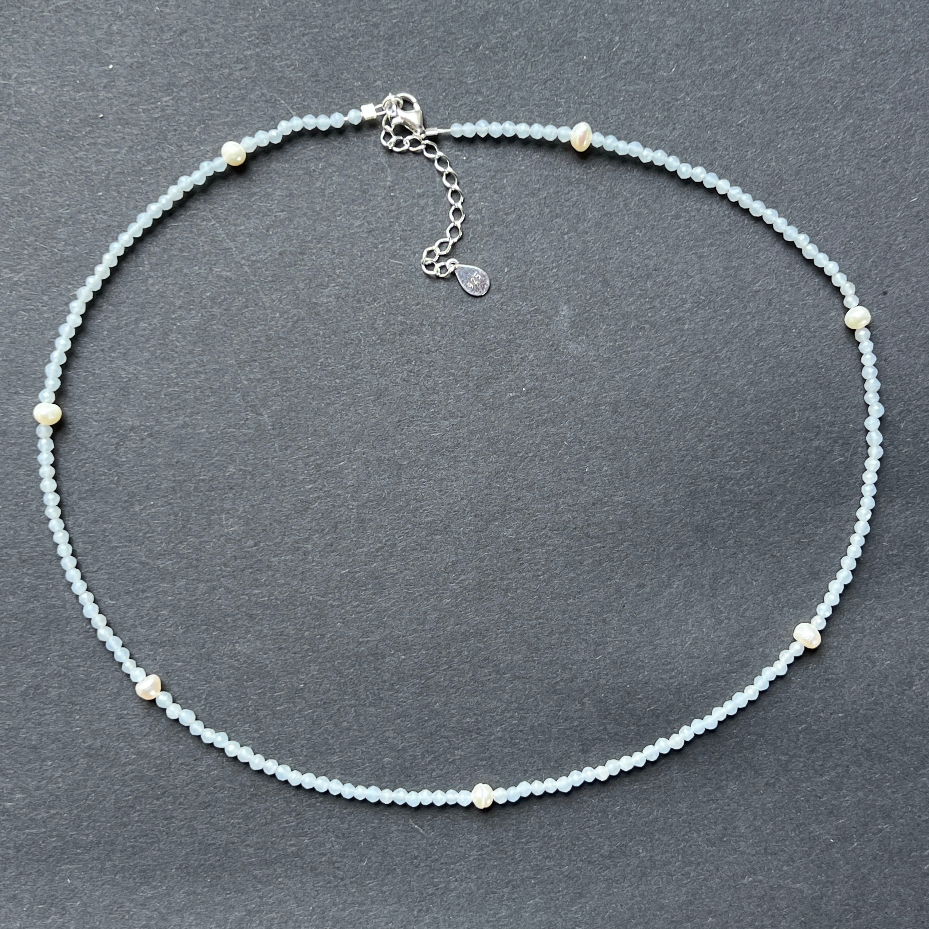 Egy nyaklánc, mint a tenger szele, amely a bőrödhöz ér a csendes reggeleken – friss, légies, lágy rezgésű és tiszta folyékonyságú. A 2 mm-es, apró, csiszolt akvamarin gyöngyök halvány fényben ragyognak, mint egy ég és a tenger hófehér kékjéből leszálló szellő.