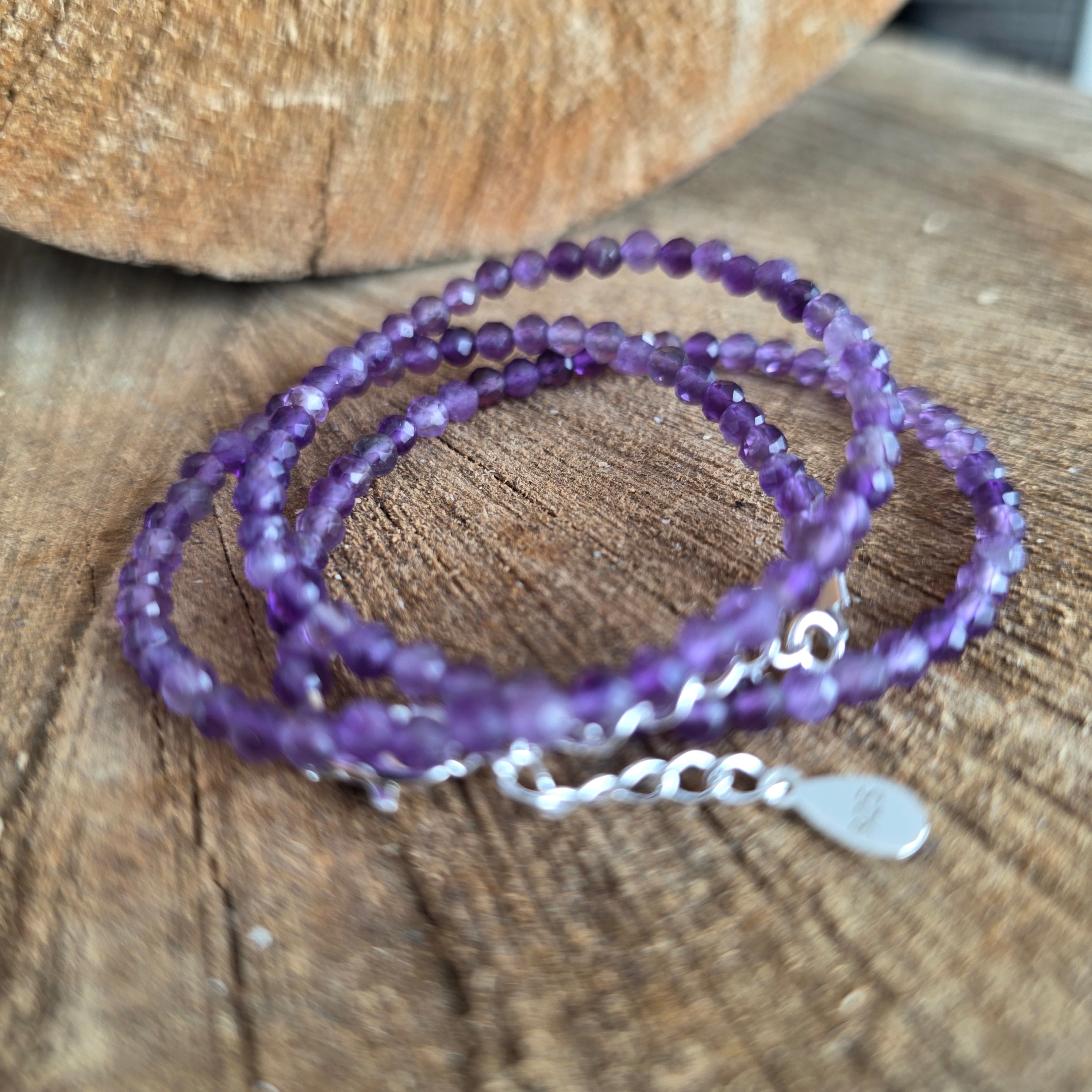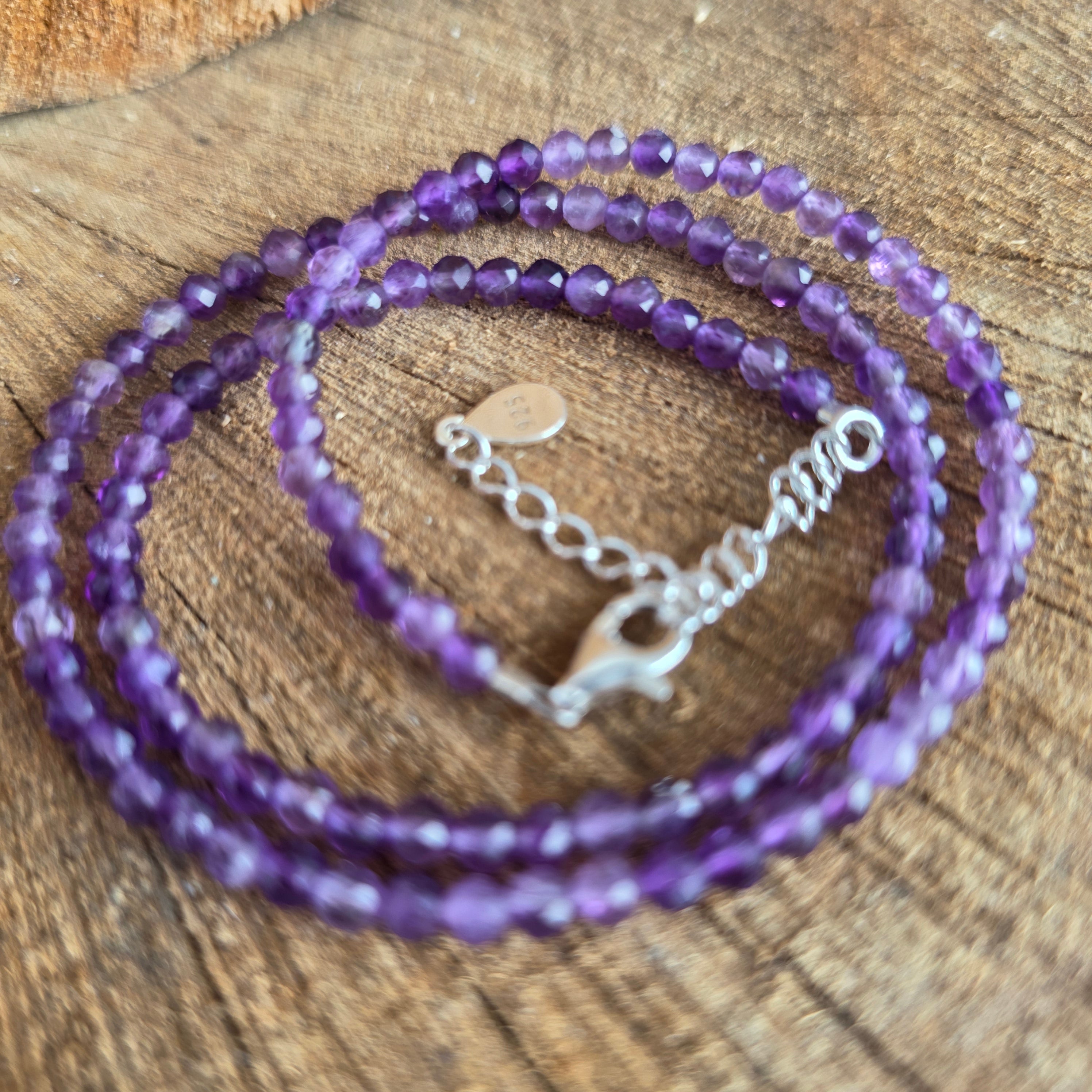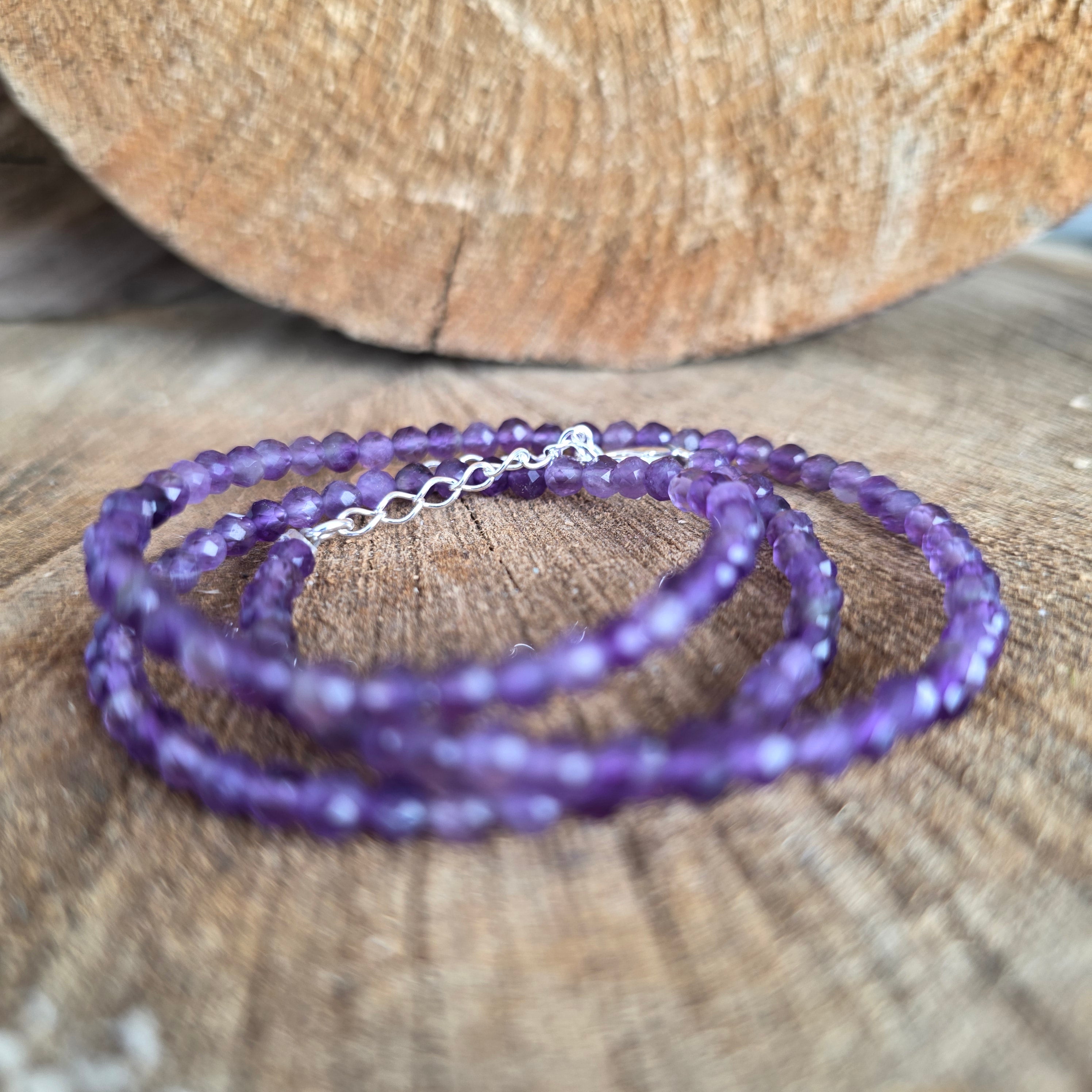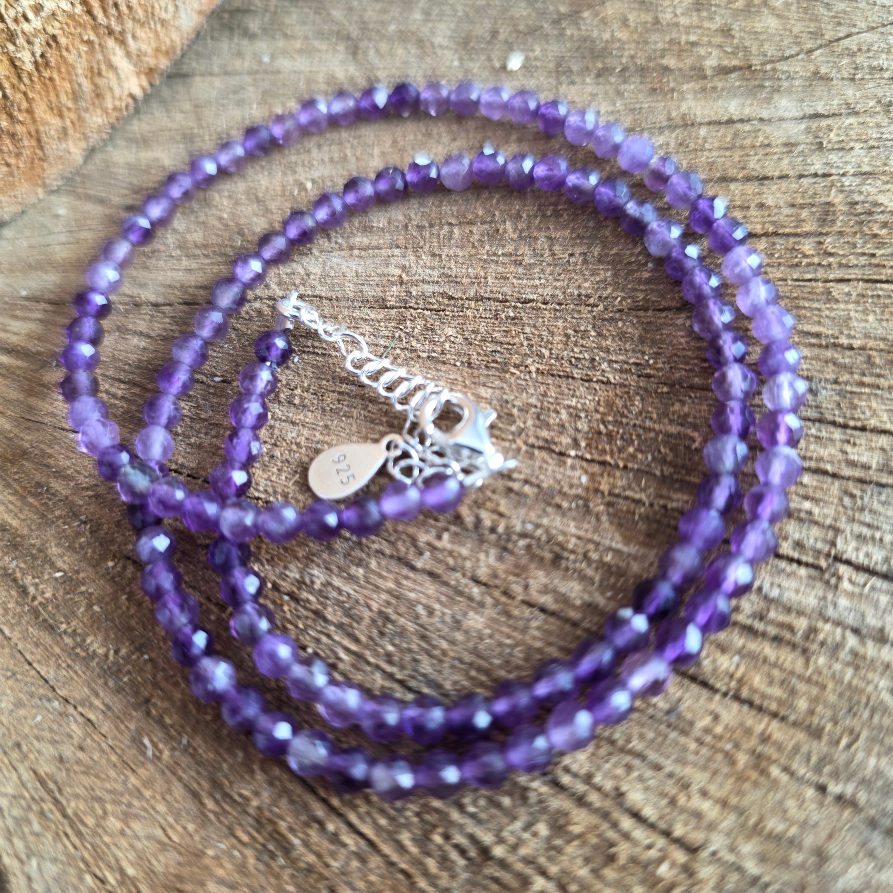 Un colier ce aduce cu sine delicatețea și noblețea subtilă a visului, ca o șoaptă de violet păstrată pe piele. Mărgelele de ametist natural de 6 mm, atent fațetate, strălucesc discret, reflectând lumina într-un ritm lin și grațios.