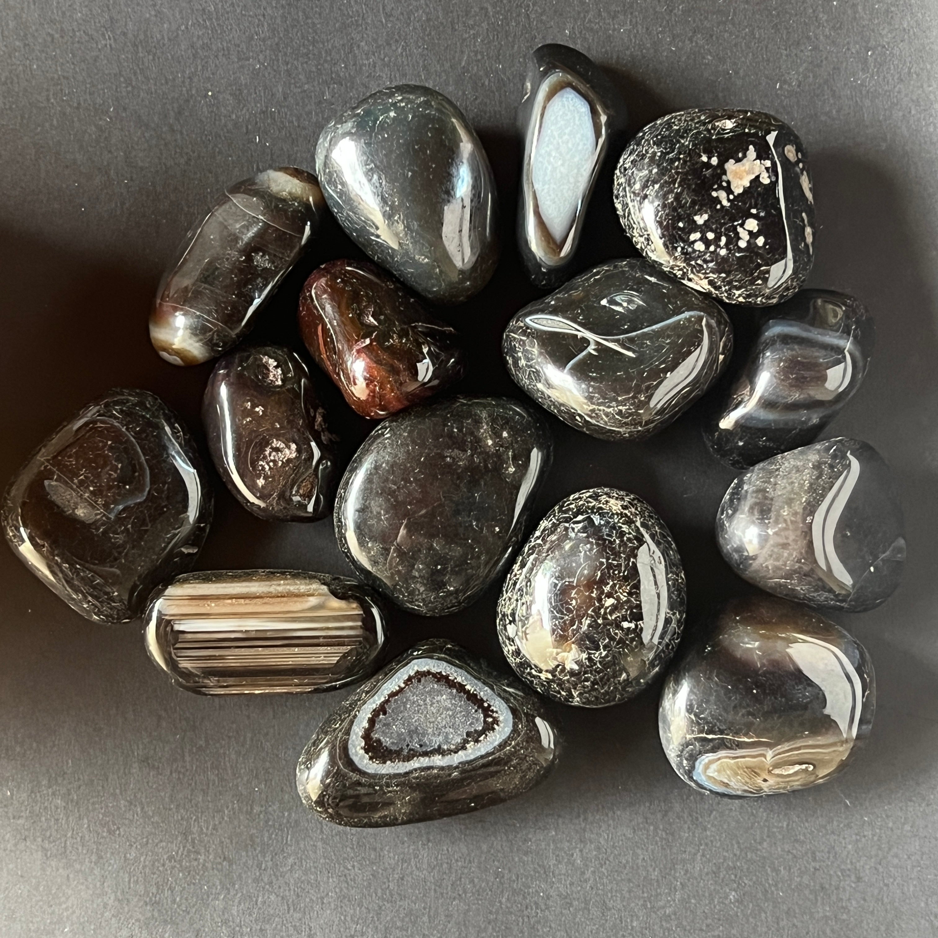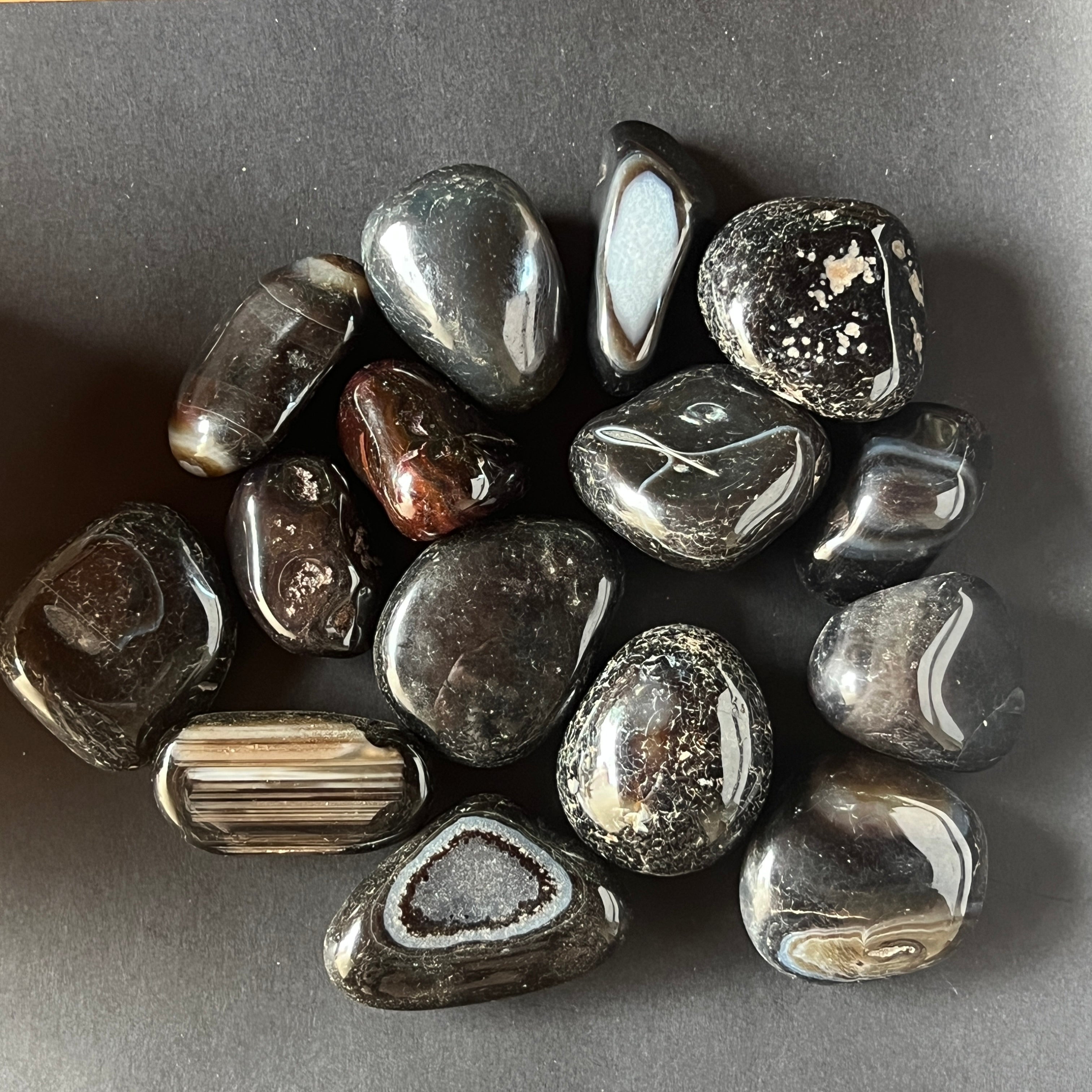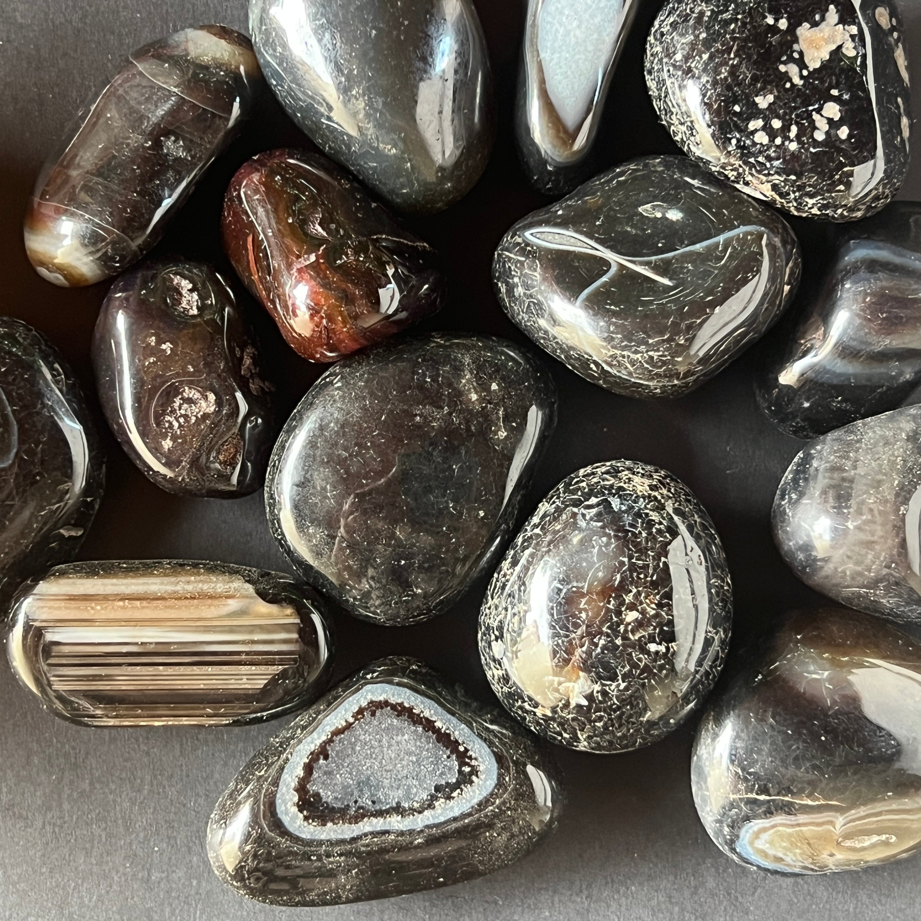 Csíkos fekete achát görgetett kő; Kérjük, válassza ki a kívánt méretet.
