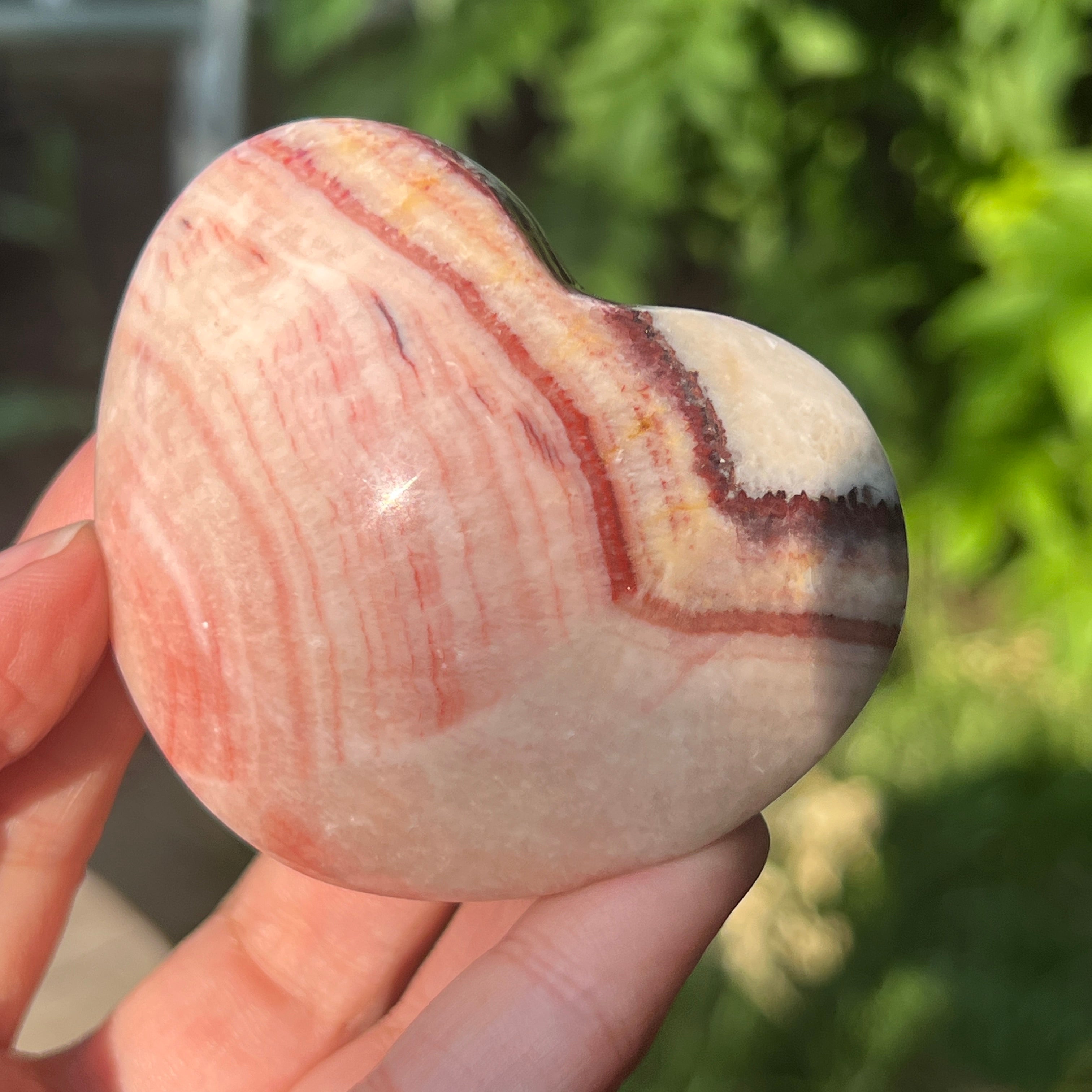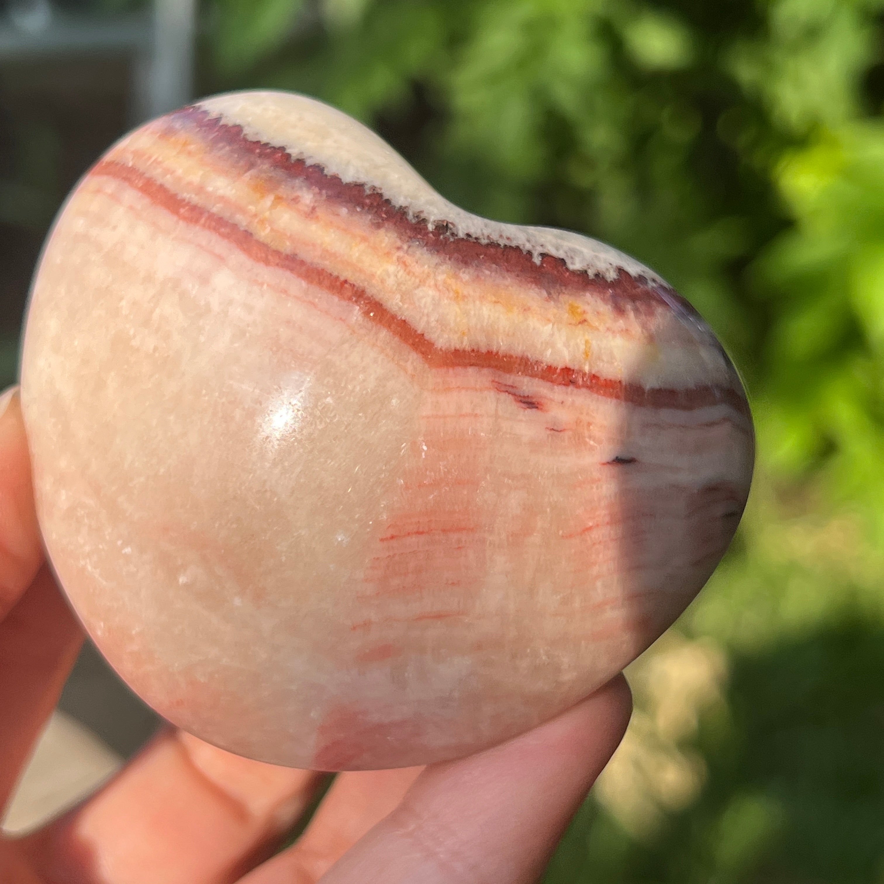 A kalcit egy lenyűgöző ásvány, amely lassú kalcium-karbonát kristályosodási folyamatok során keletkezik, gyakran található barlangokban, geódákban vagy üledékes képződményekben. Rózsaszín változatában a kalcit finom, mélyen gyógyító rezgést kap. Természetes csíkjai a különböző ásványok egymásra rakódása révén jönnek létre, egyedi mintákat alkotva, hasonlóan ahhoz, ahogy az érzelmek nyomot hagynak az ember szívében.