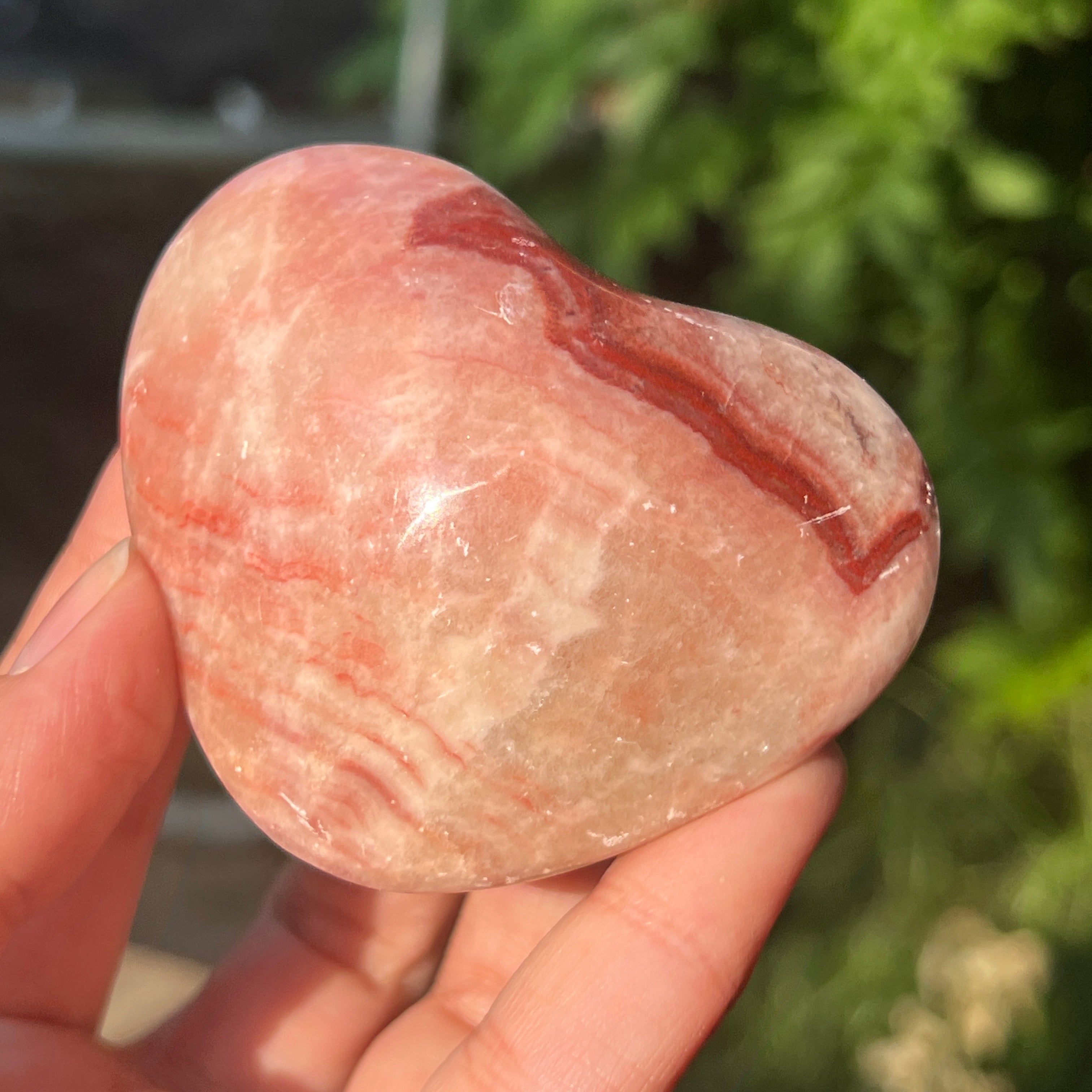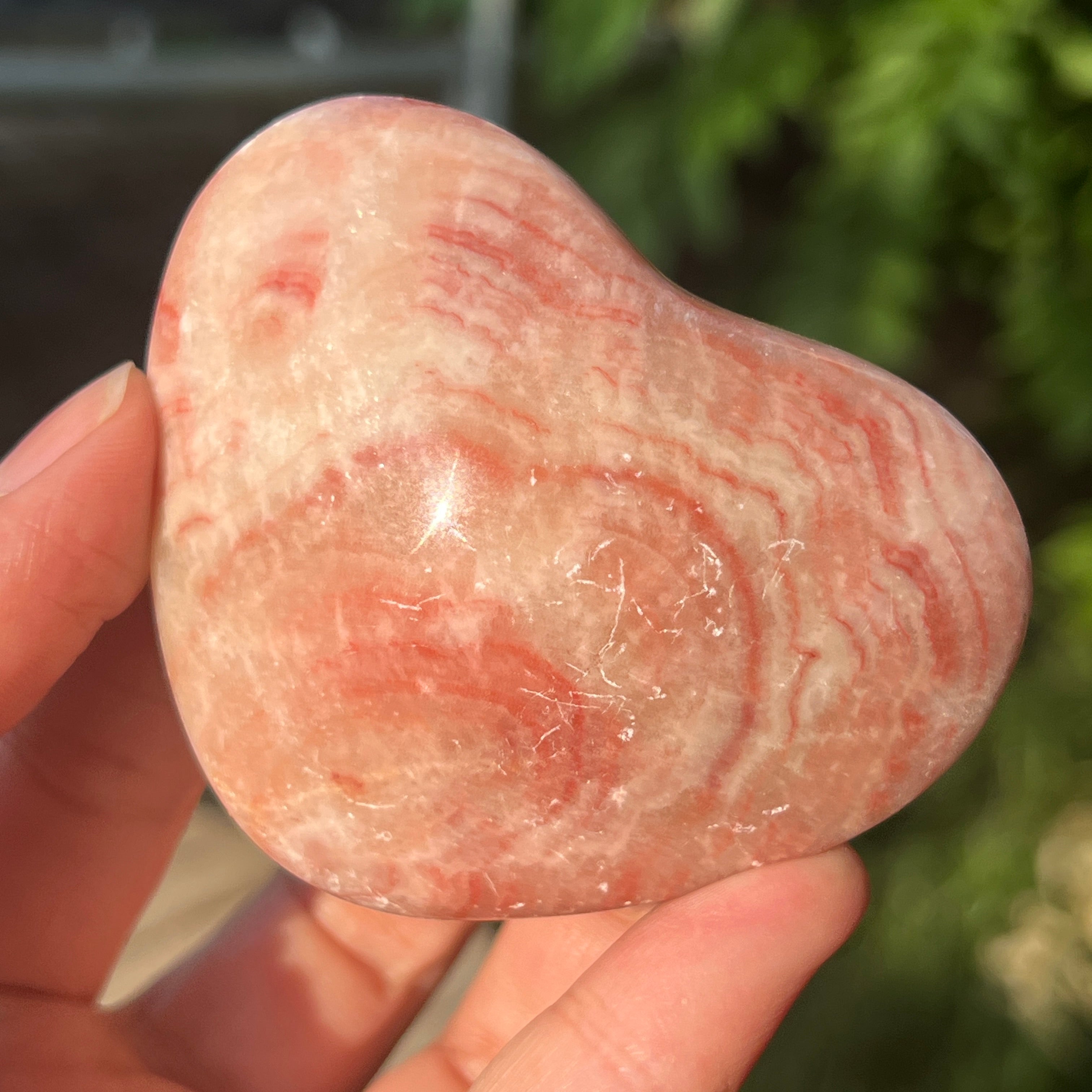 A kalcit egy lenyűgöző ásvány, amely lassú kalcium-karbonát kristályosodási folyamatok során keletkezik, gyakran található barlangokban, geódákban vagy üledékes képződményekben. Rózsaszín változatában a kalcit finom, mélyen gyógyító rezgést kap. Természetes csíkjai a különböző ásványok egymásra rakódása révén jönnek létre, egyedi mintákat alkotva, hasonlóan ahhoz, ahogy az érzelmek nyomot hagynak az ember szívében.
