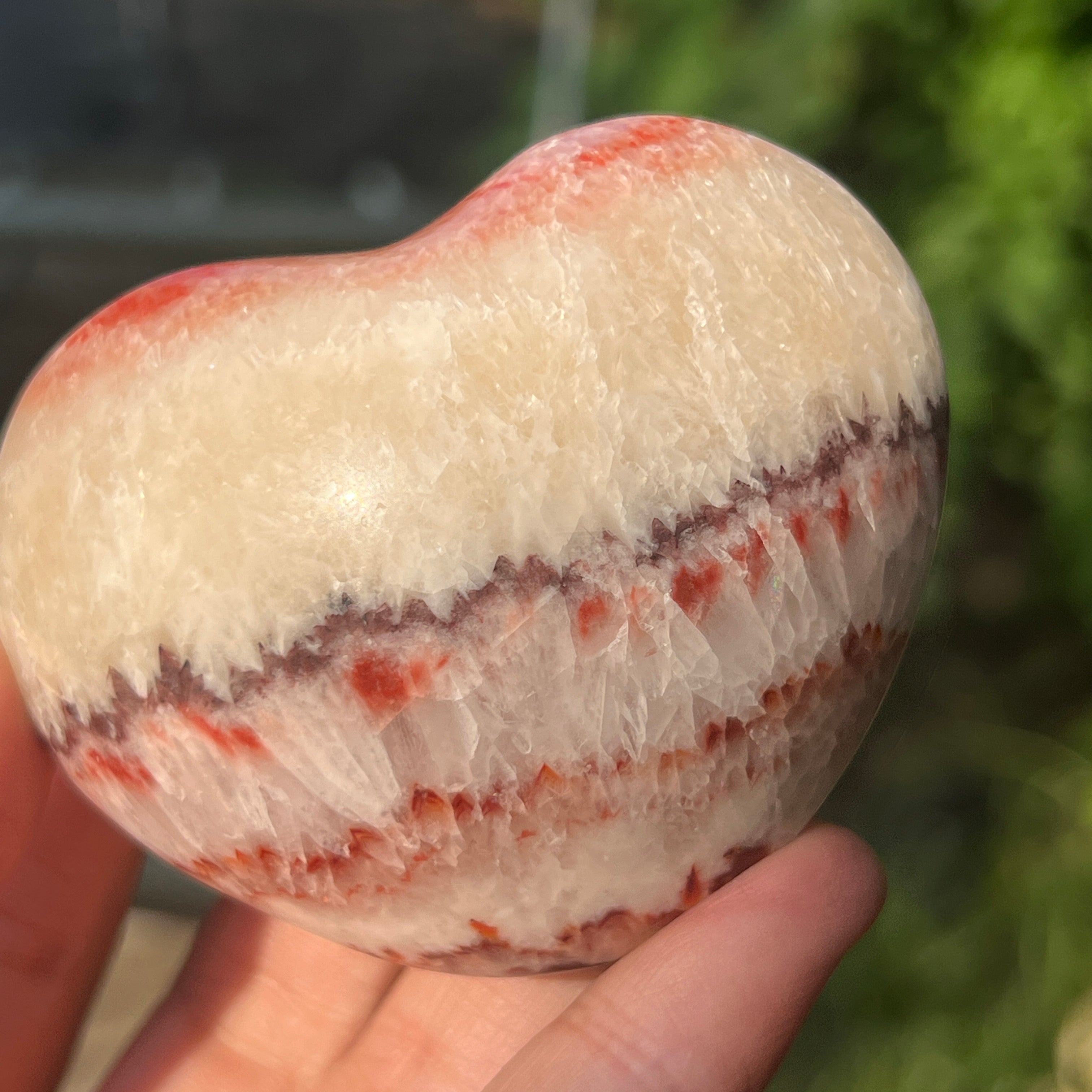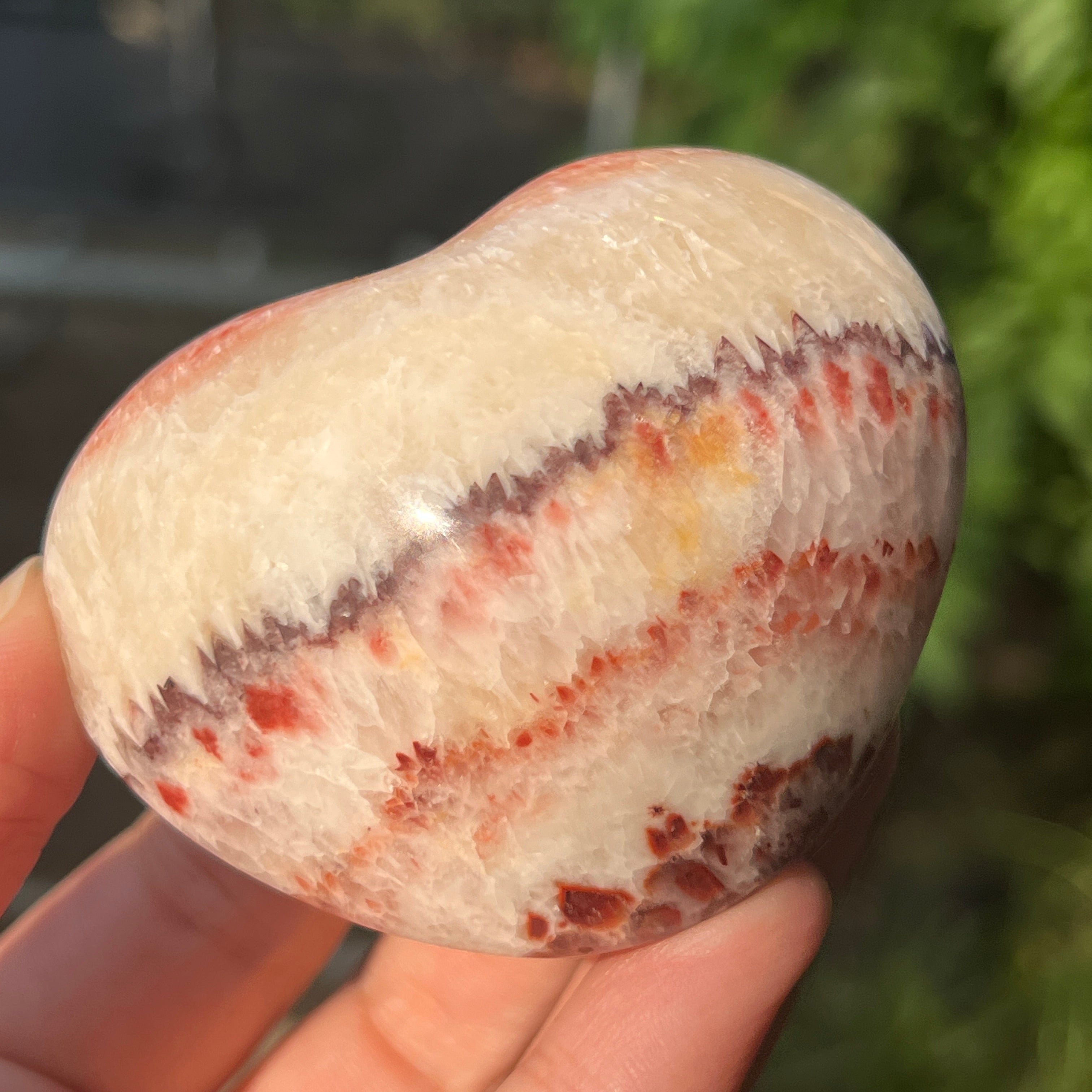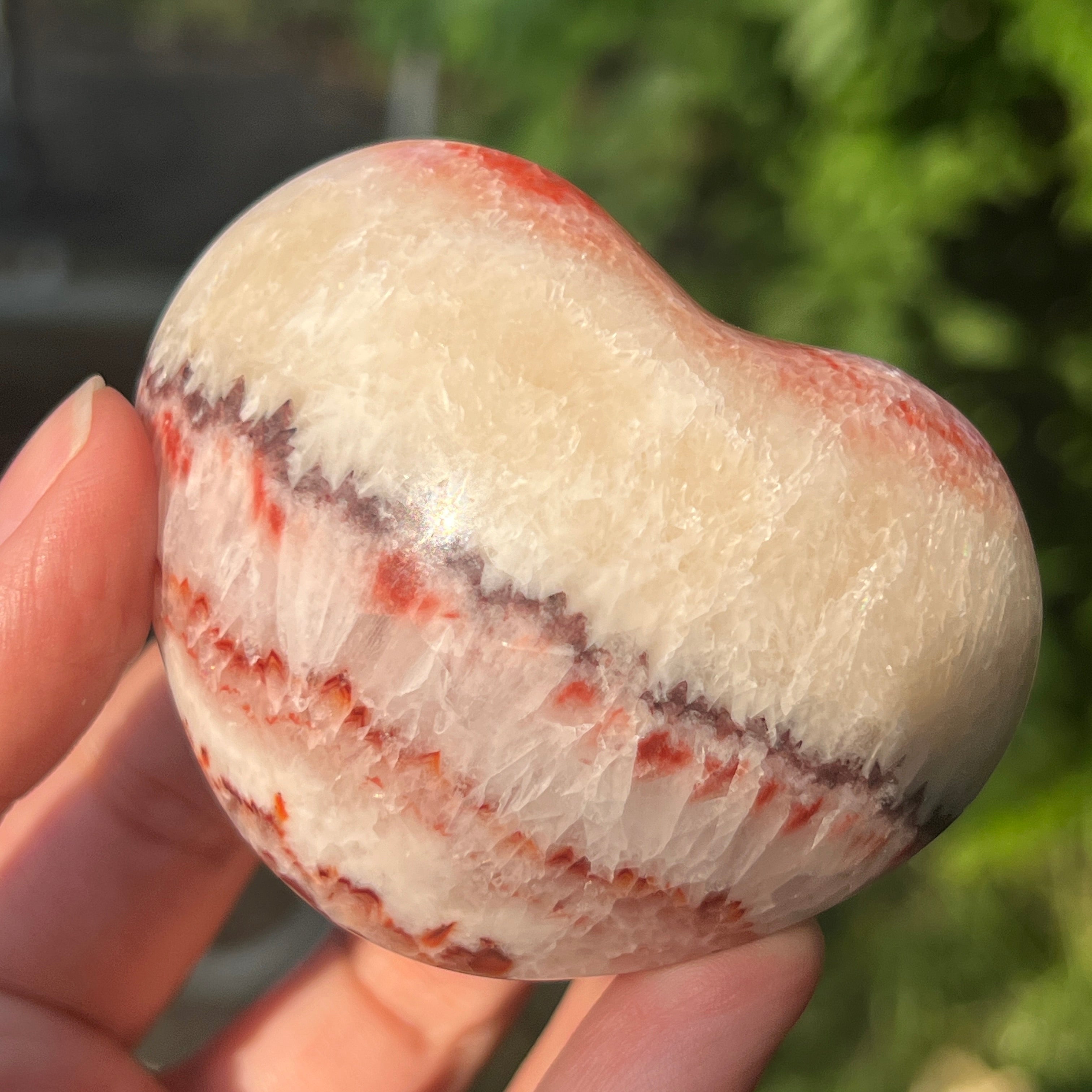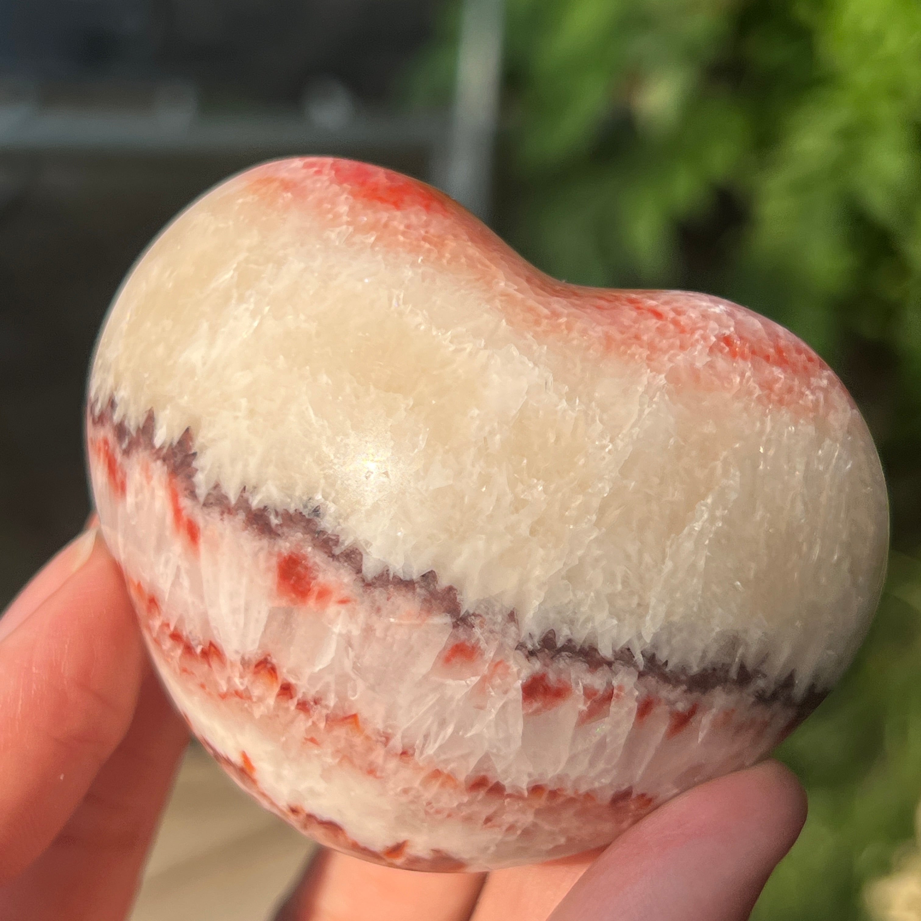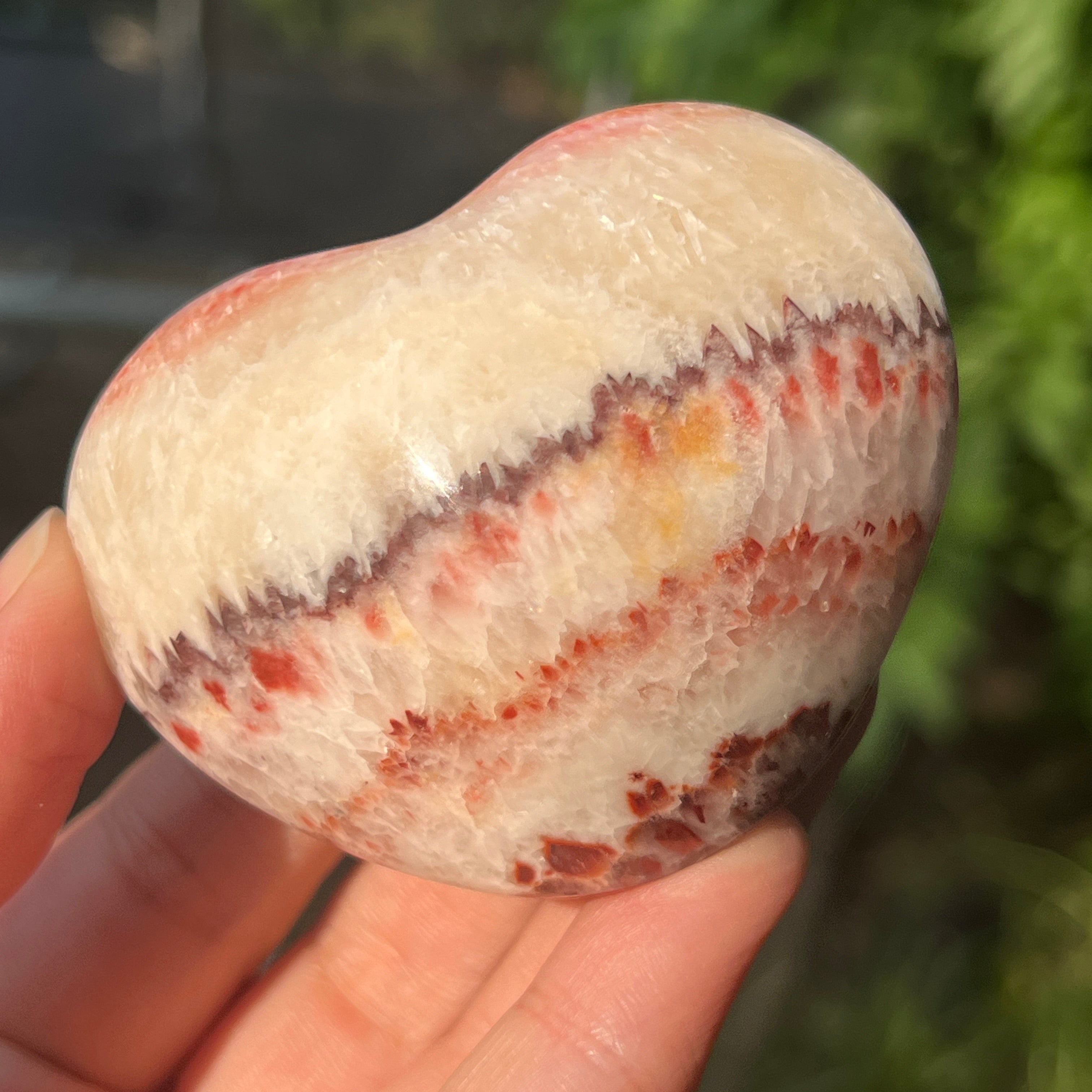 Ez a kézzel csiszolt csíkos rózsaszín kalcit szív meleg és megnyugtató hangulatot hoz bármely térbe. Az enyhe rózsaszín árnyalatok, a fehér vagy krémes csíkokkal kombinálva, finomságot, belső egyensúlyt és lelki védelmet idéznek.