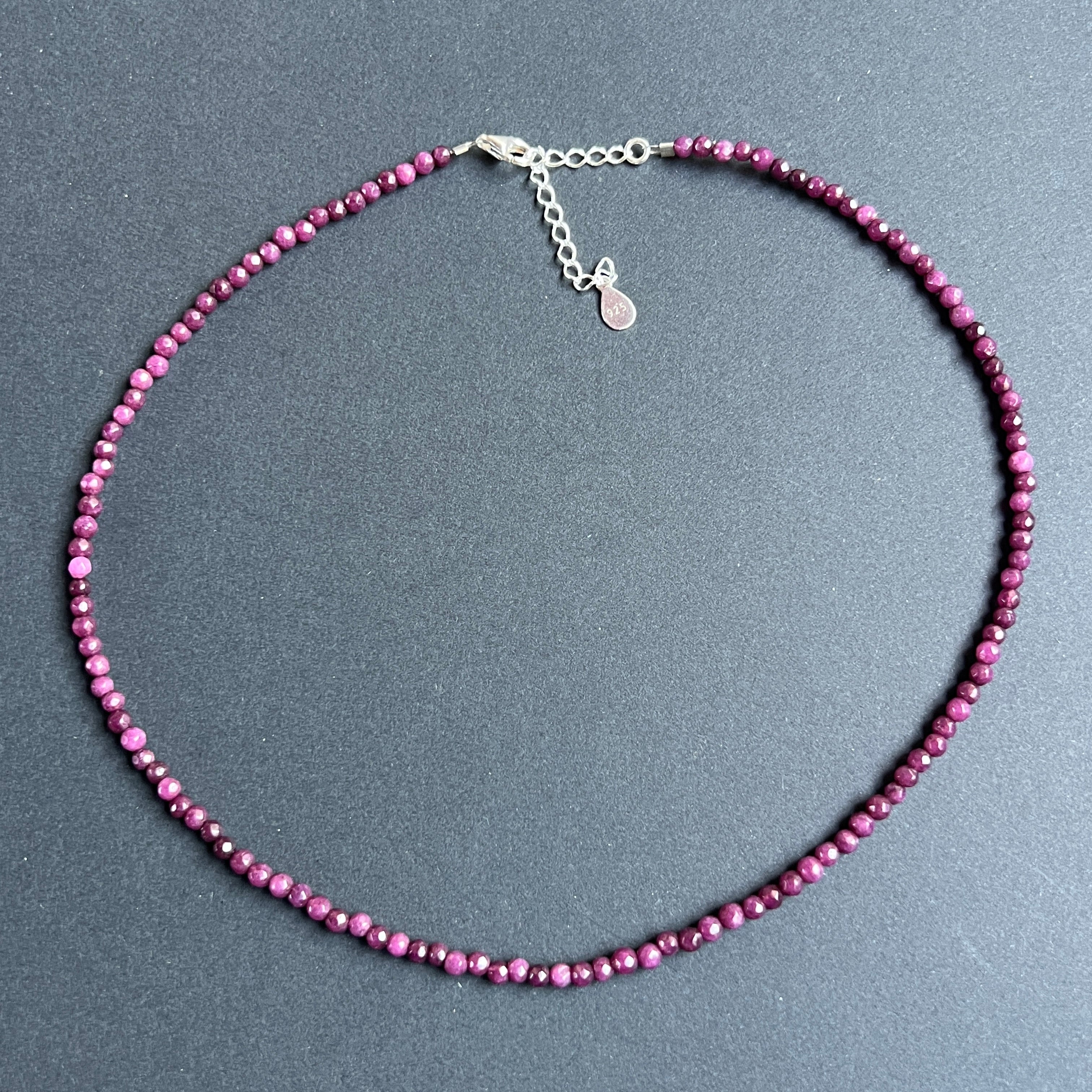 A huzal teljes egészében csiszolt gömbökből áll 3 mm-es bordó achát, sötét gyöngyök finom tükröződésekkel a tompa rubin, az érett cseresznye és a leülepedett vörösbor árnyalatai között. A finom oldalak diszkréten megfogják a fényt, mint egy alig sejthető sóhaj, a mély és telt szín pedig olyan gravitációval bír, amely csendre és jelenlétre hív.