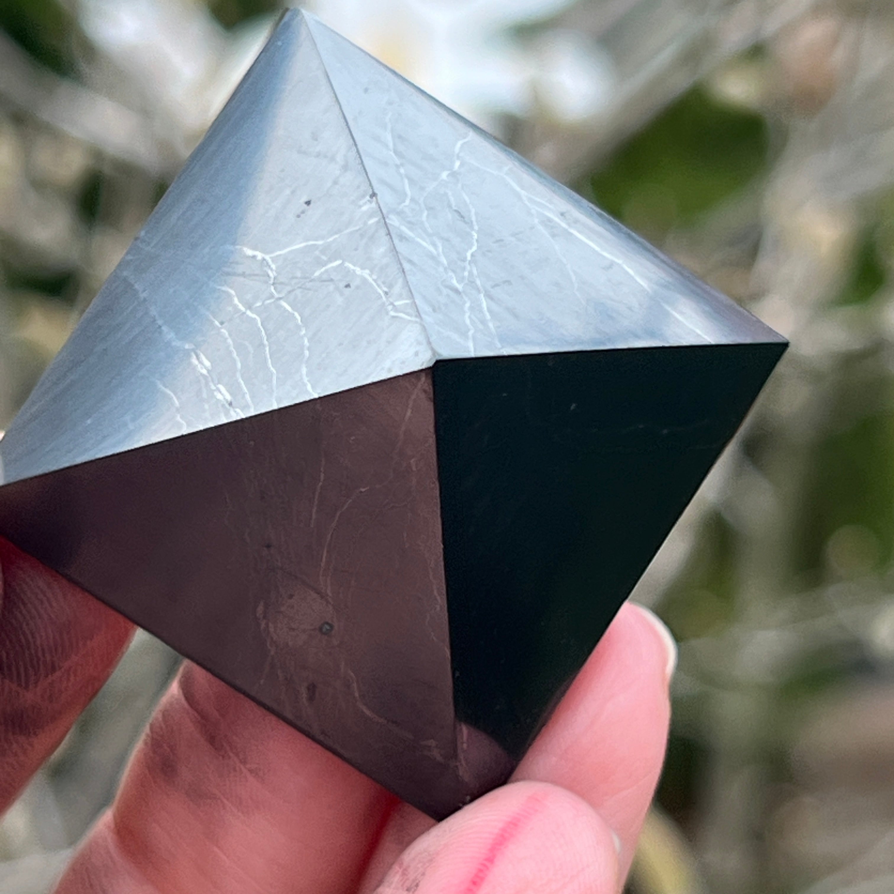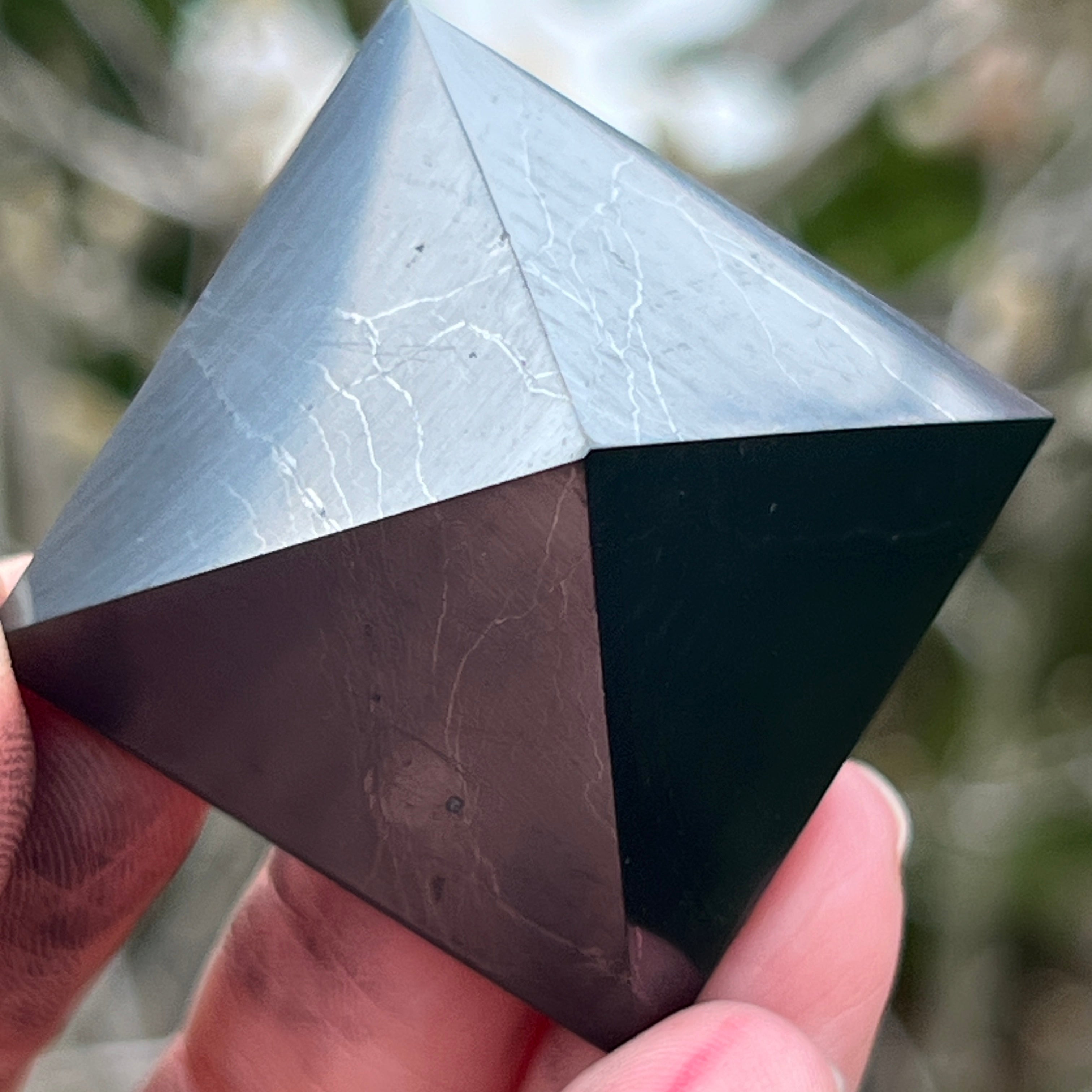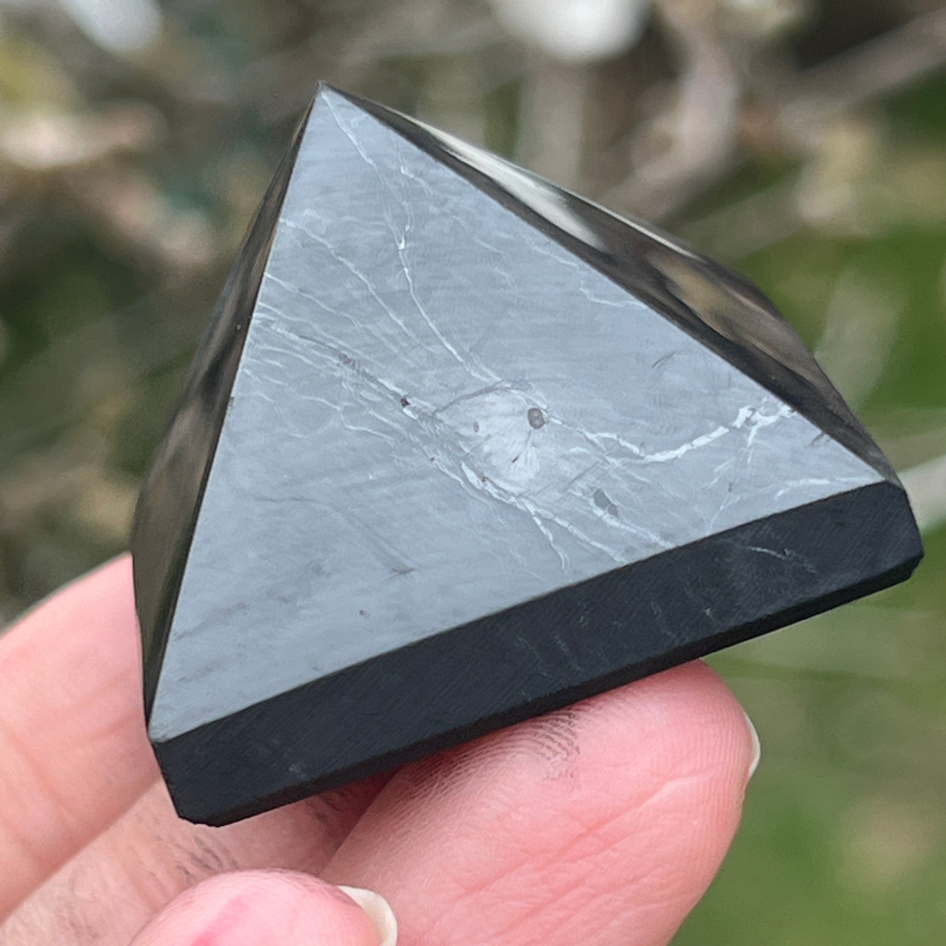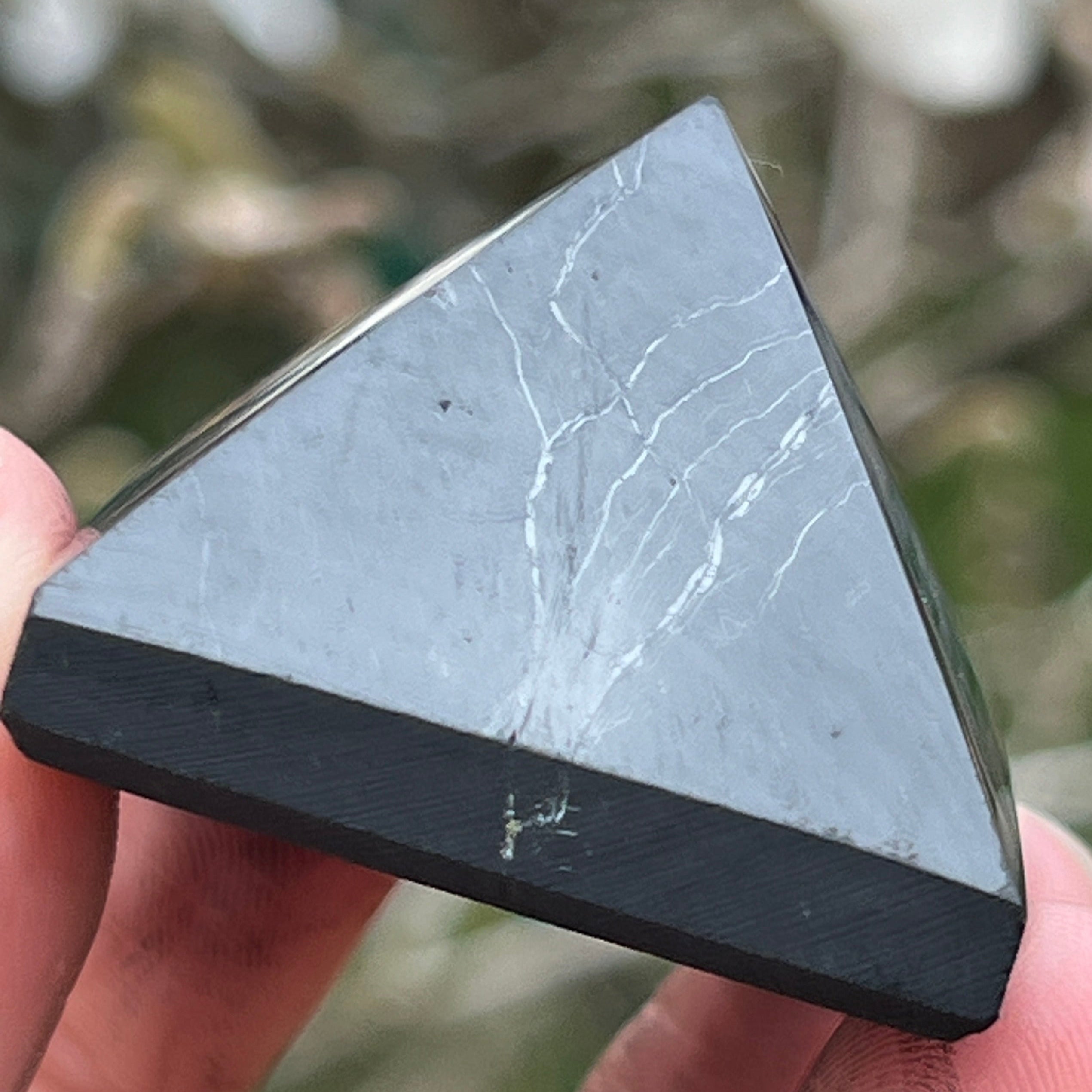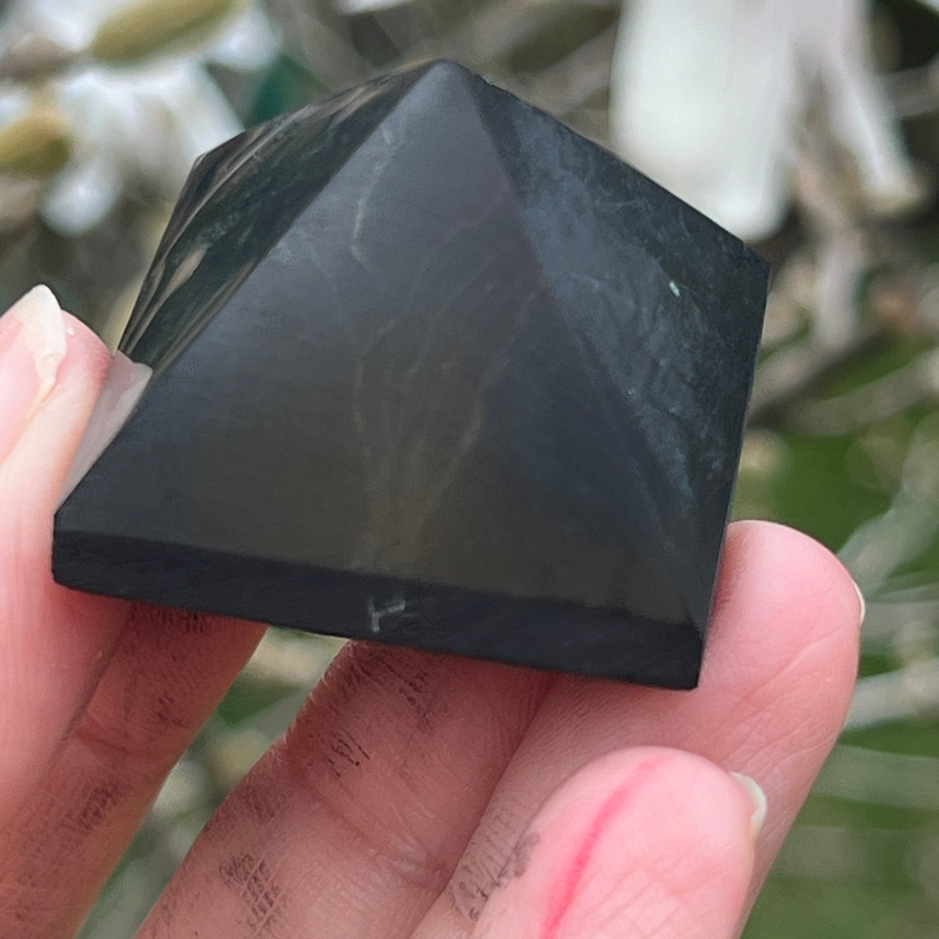 Ez a természetes shungit piramis, mérete 3,3–3,5 cm, egyszerre dekoratív és energetikai célt szolgáló tárgy. Geometriai formája, a stabilitás és a föld és az ég közötti kapcsolat szimbóluma, felerősíti a kristály tulajdonságait.