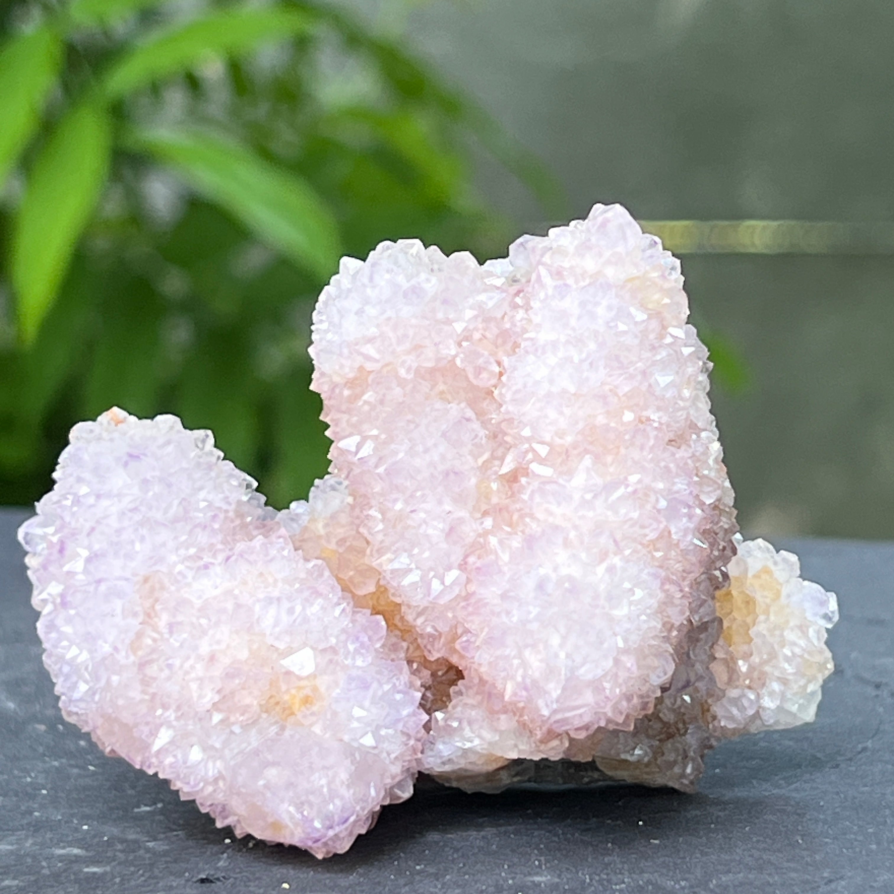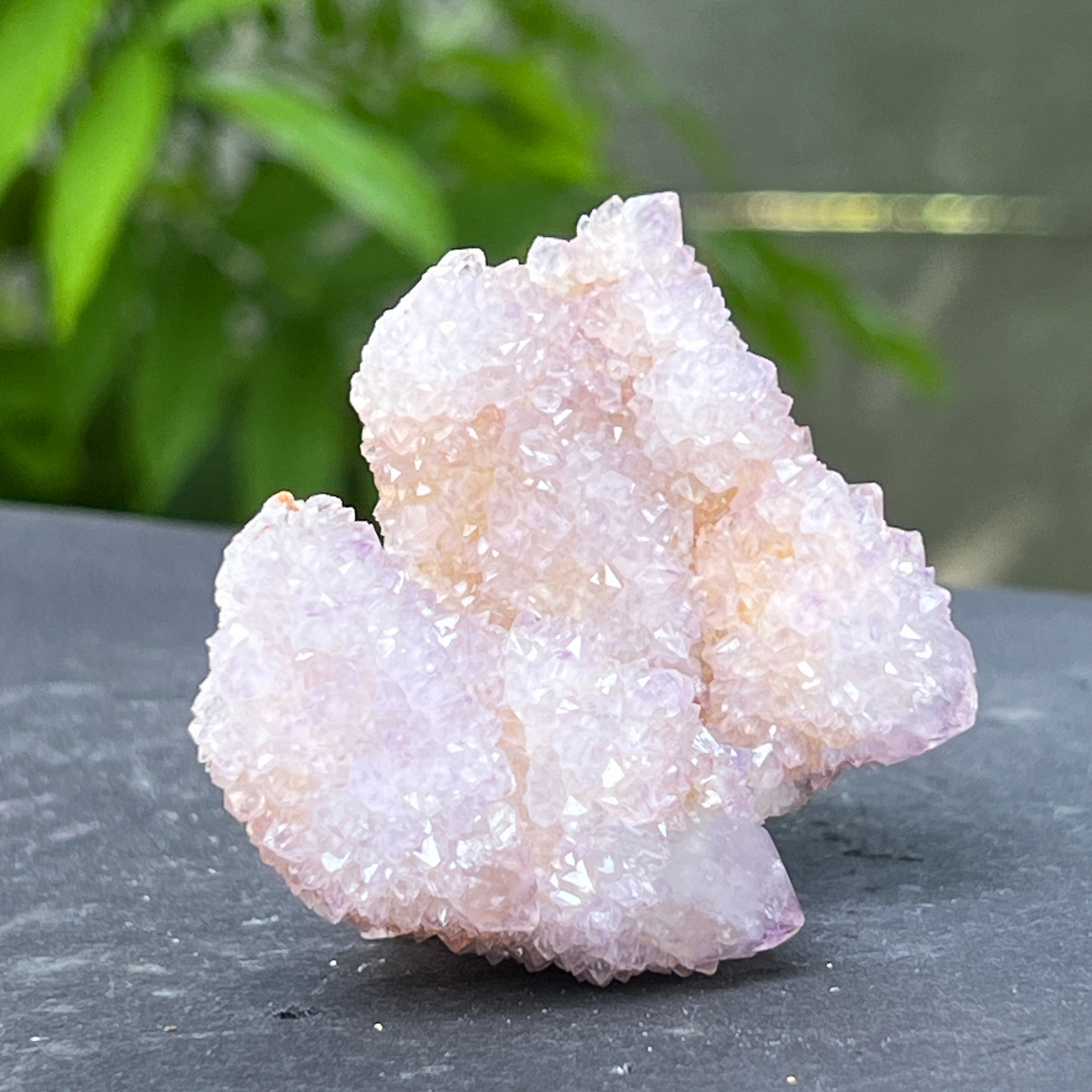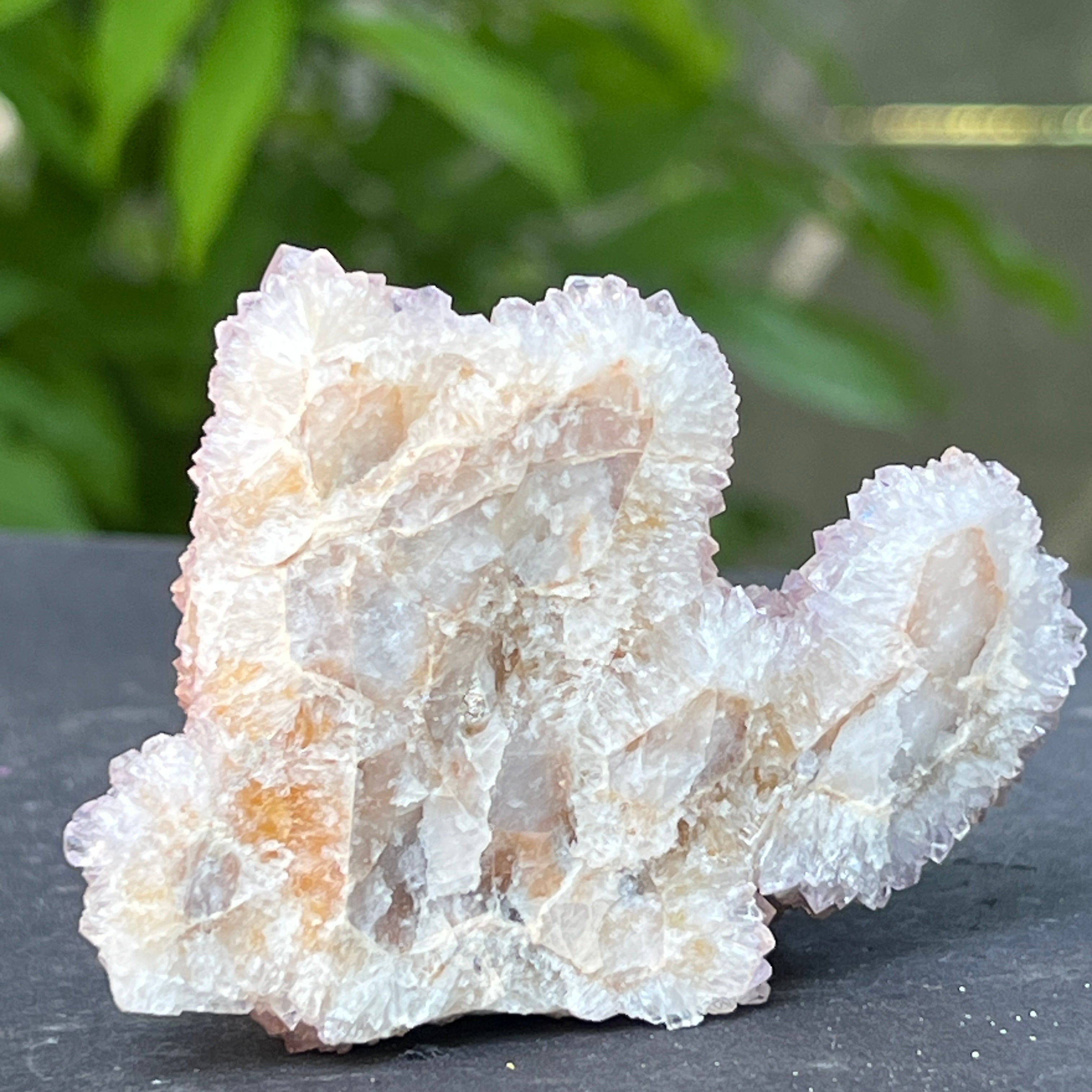 Az afrikai föld mélyén, ott, ahol a hegyek csendje elrejti a kimondatlan történeteket, megszületik egy rendkívüli szépségű kristály: a Spirit Quartz ametiszt, más néven „Kaktusz Quartz”. Ez a minerológiai csoda mintha misztikus aurába burkolózna – egyetlen masszív alap, ezernyi finom csúccsal borítva, mint egy kristályközösség a fény táncában.