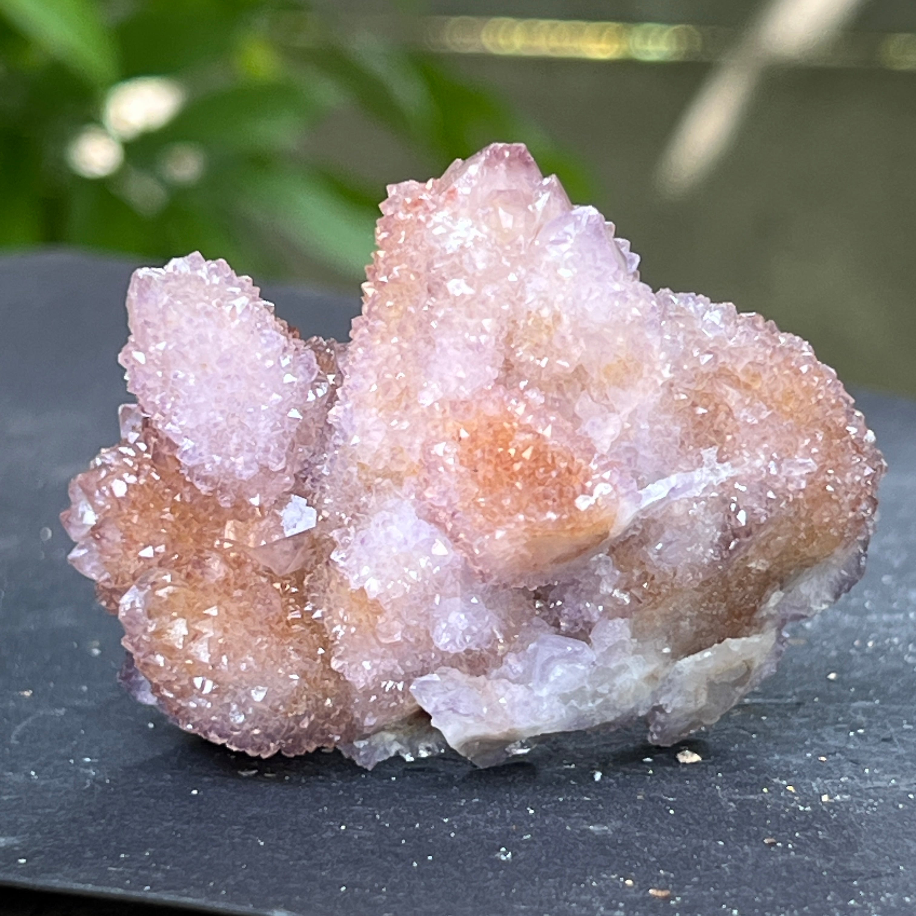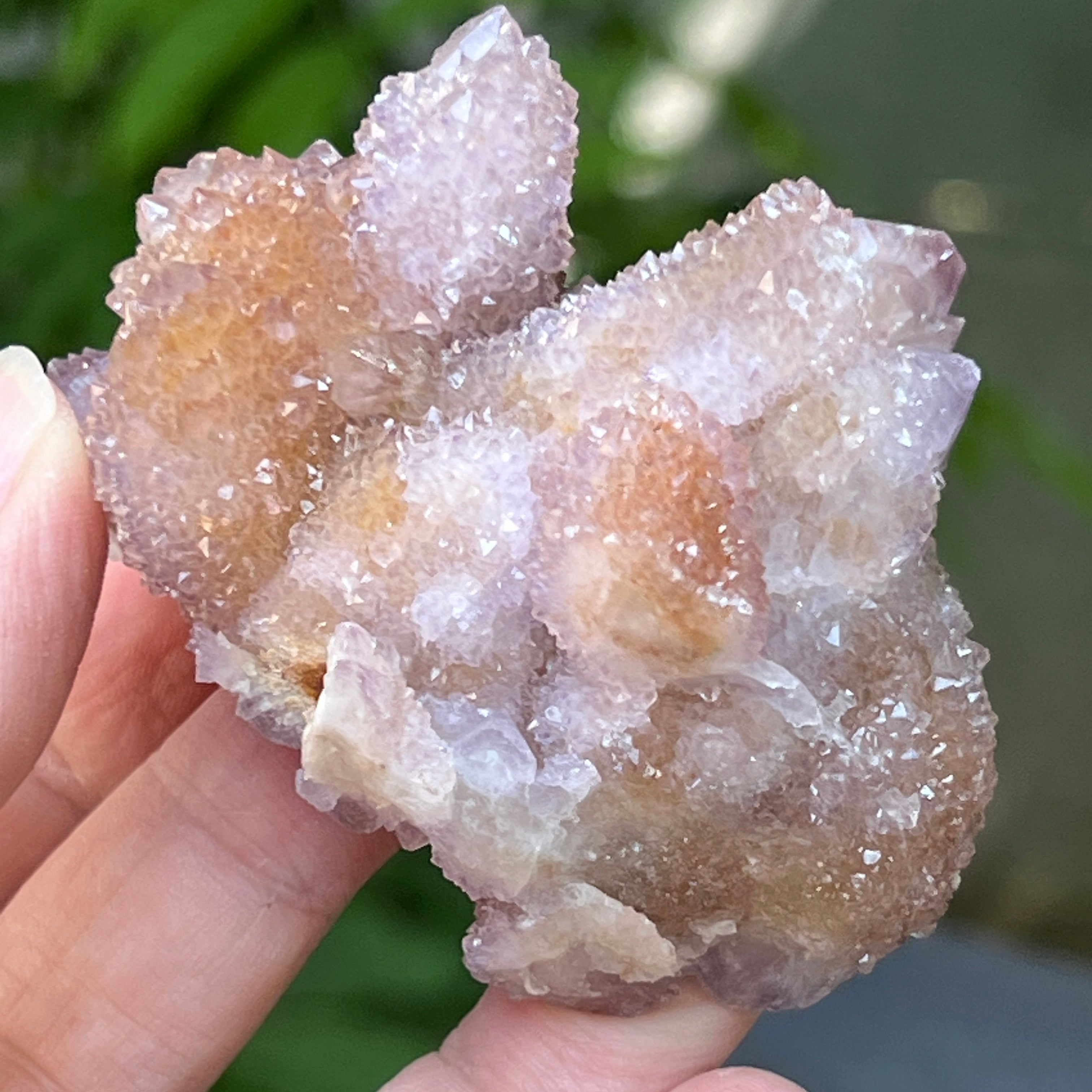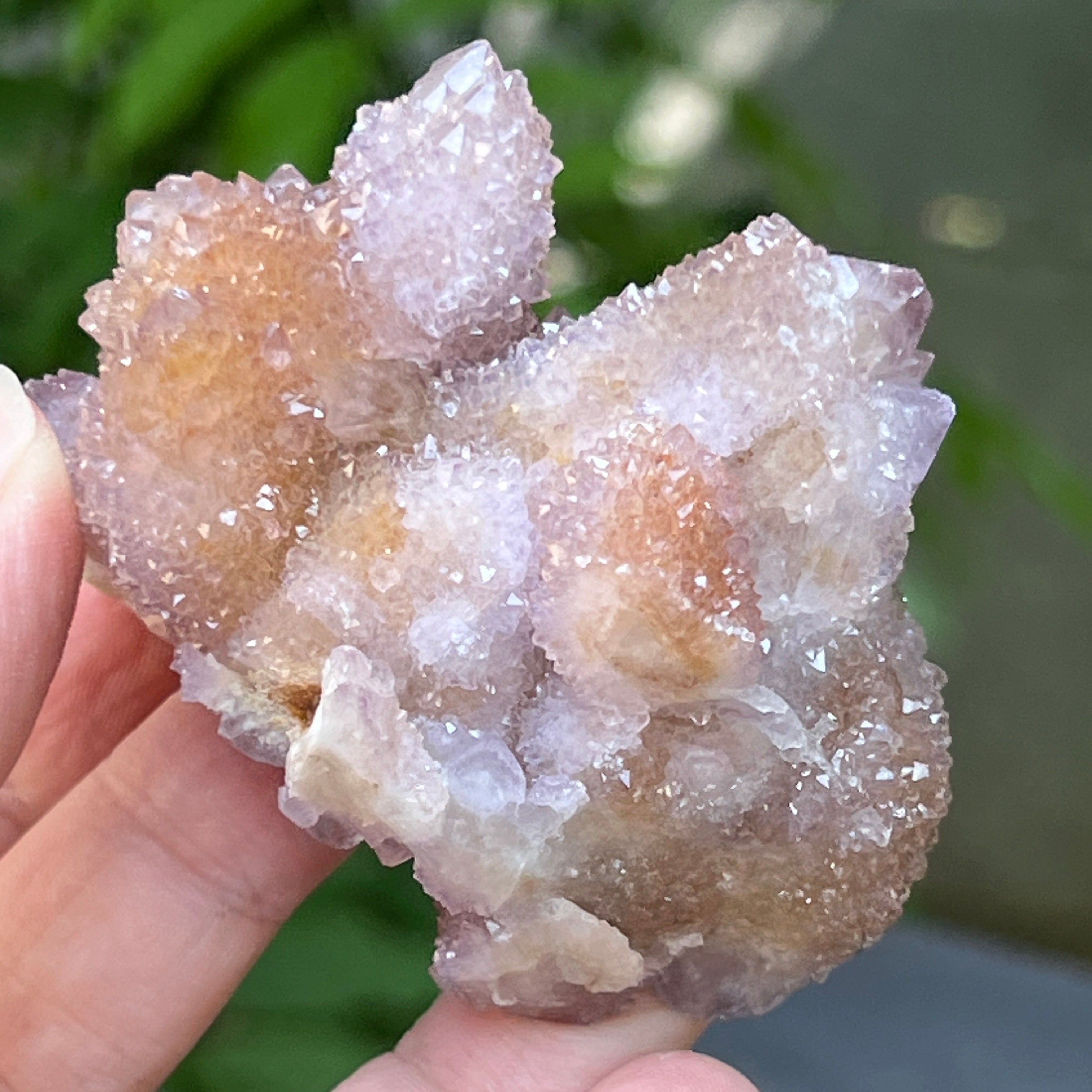 Az afrikai föld mélyén, ott, ahol a hegyek csendje elrejti a kimondatlan történeteket, megszületik egy rendkívüli szépségű kristály: a Spirit Quartz ametiszt, más néven „Kaktusz Quartz”. Ez a minerológiai csoda mintha misztikus aurába burkolózna – egyetlen masszív alap, ezernyi finom csúccsal borítva, mint egy kristályközösség a fény táncában.