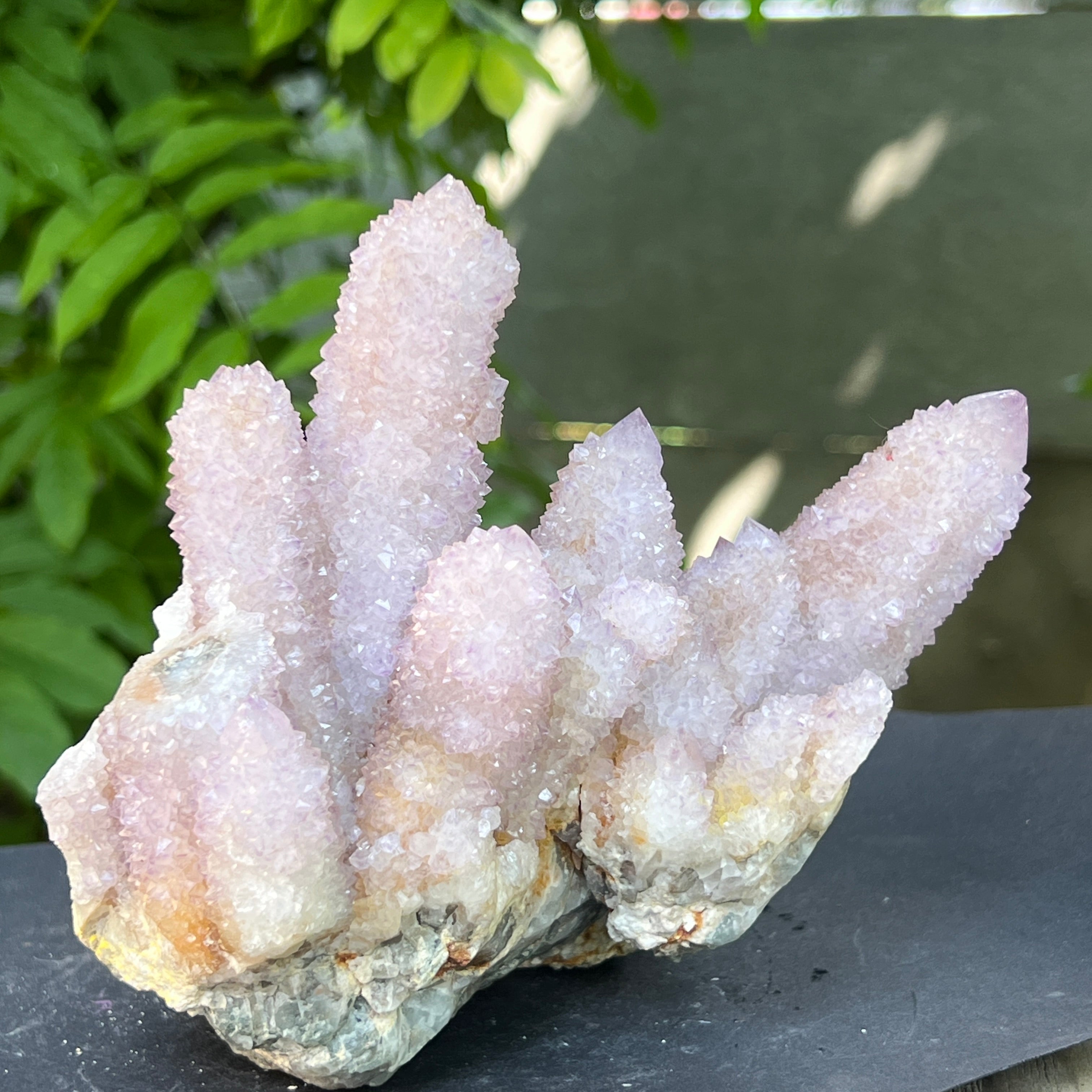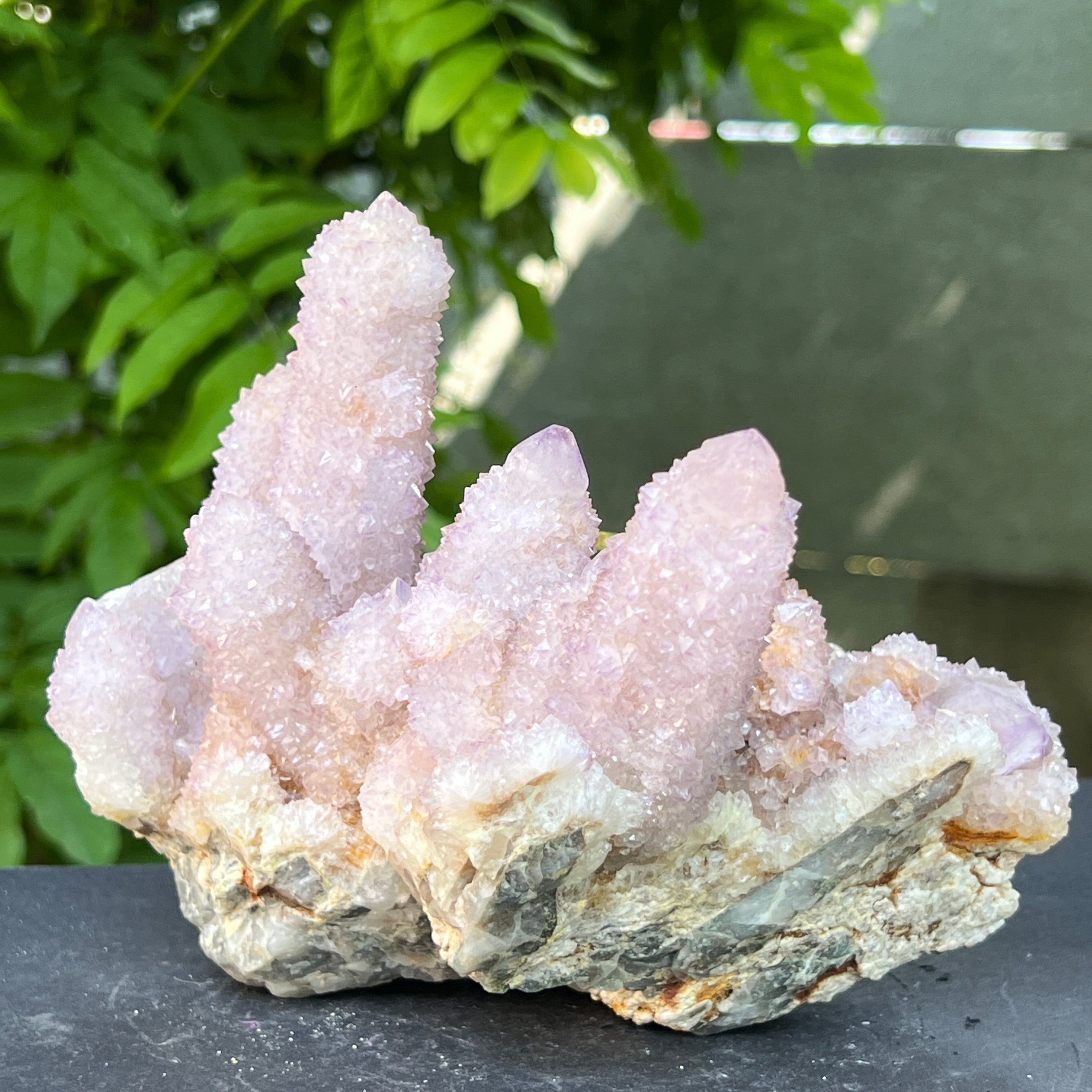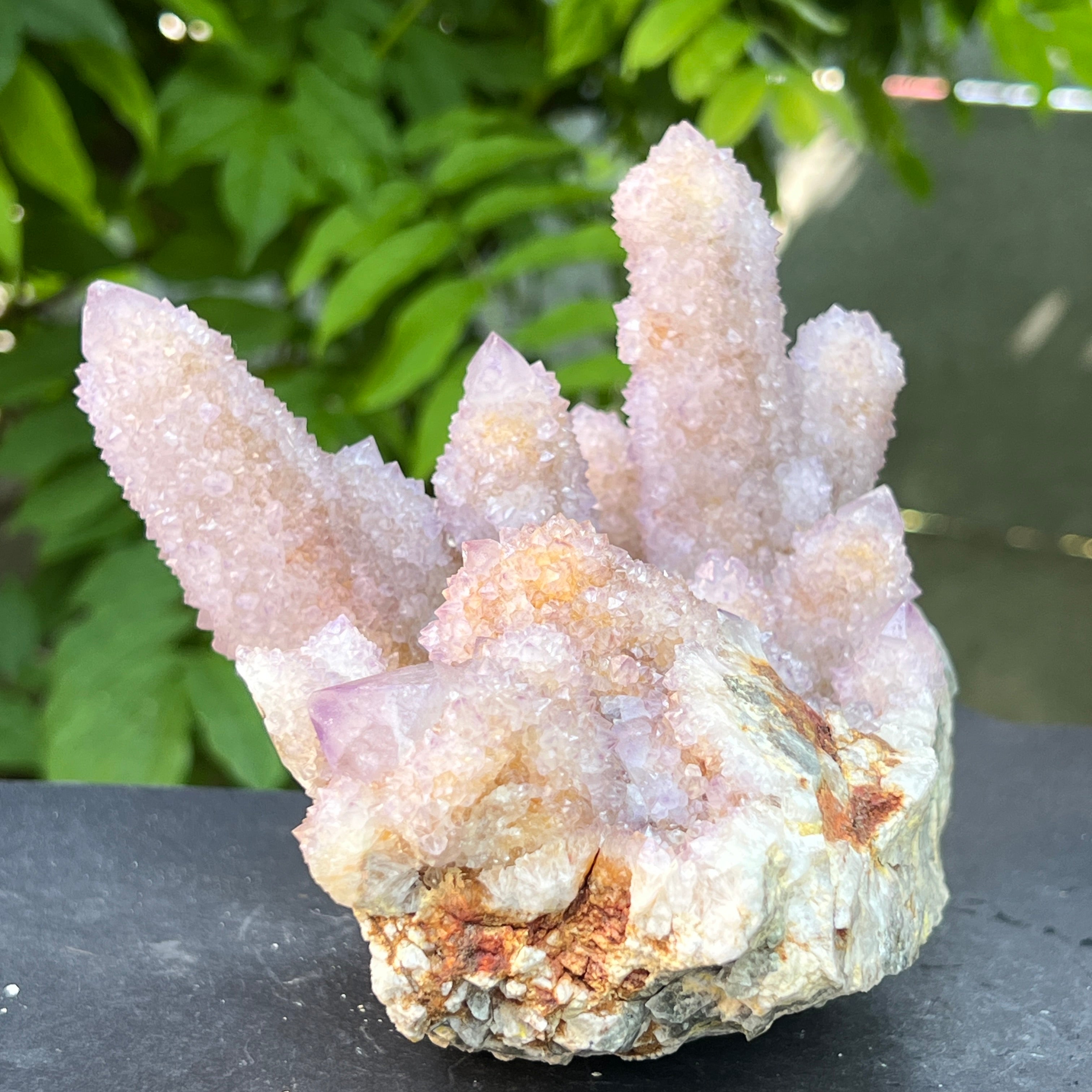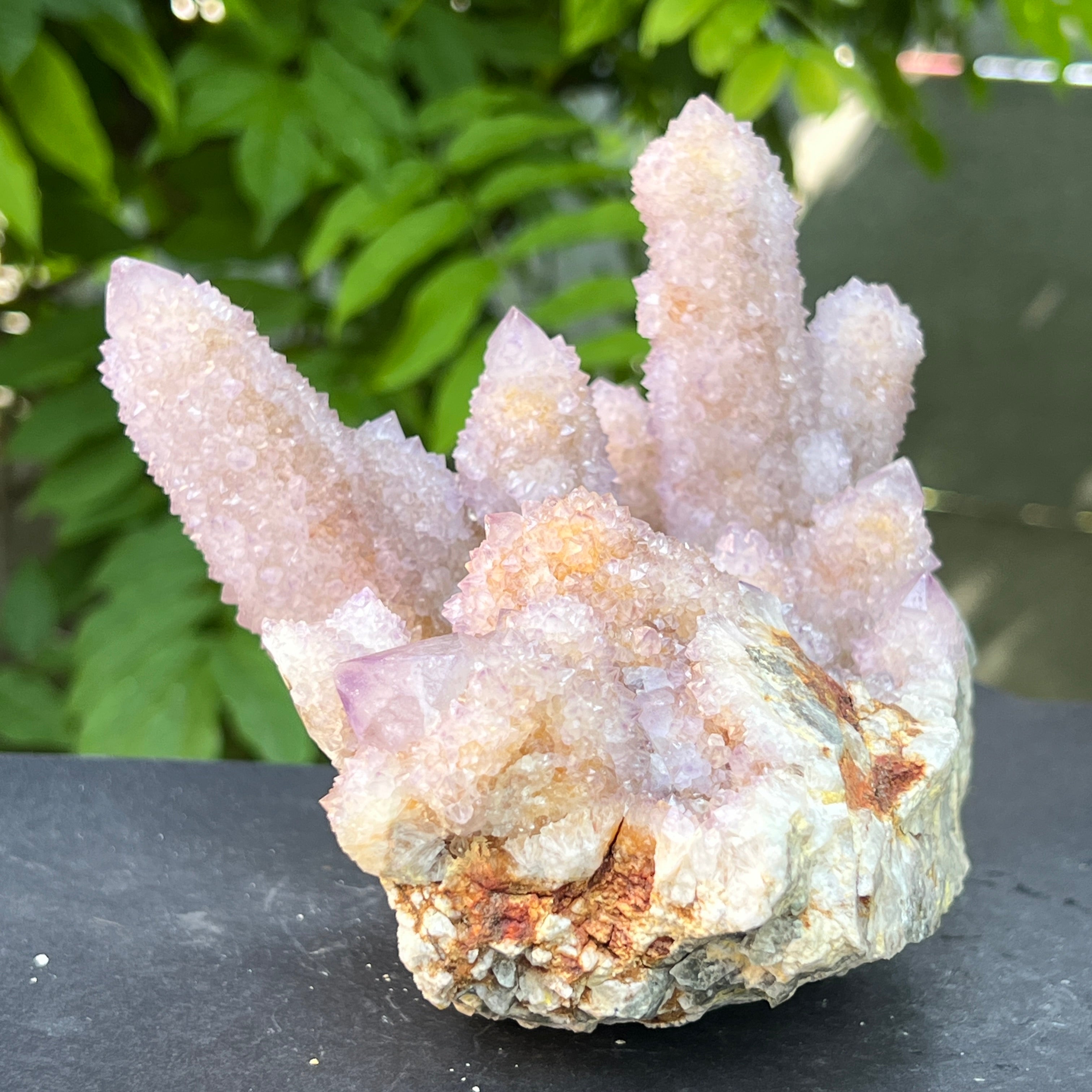 Az afrikai föld mélyén, ott, ahol a hegyek csendje elrejti a kimondatlan történeteket, megszületik egy rendkívüli szépségű kristály: a Spirit Quartz ametiszt, más néven „Kaktusz Quartz”. Ez a minerológiai csoda mintha misztikus aurába burkolózna – egyetlen masszív alap, ezernyi finom csúcs borítja, mint egy kristályközösség, amely a fény táncában egyesül.