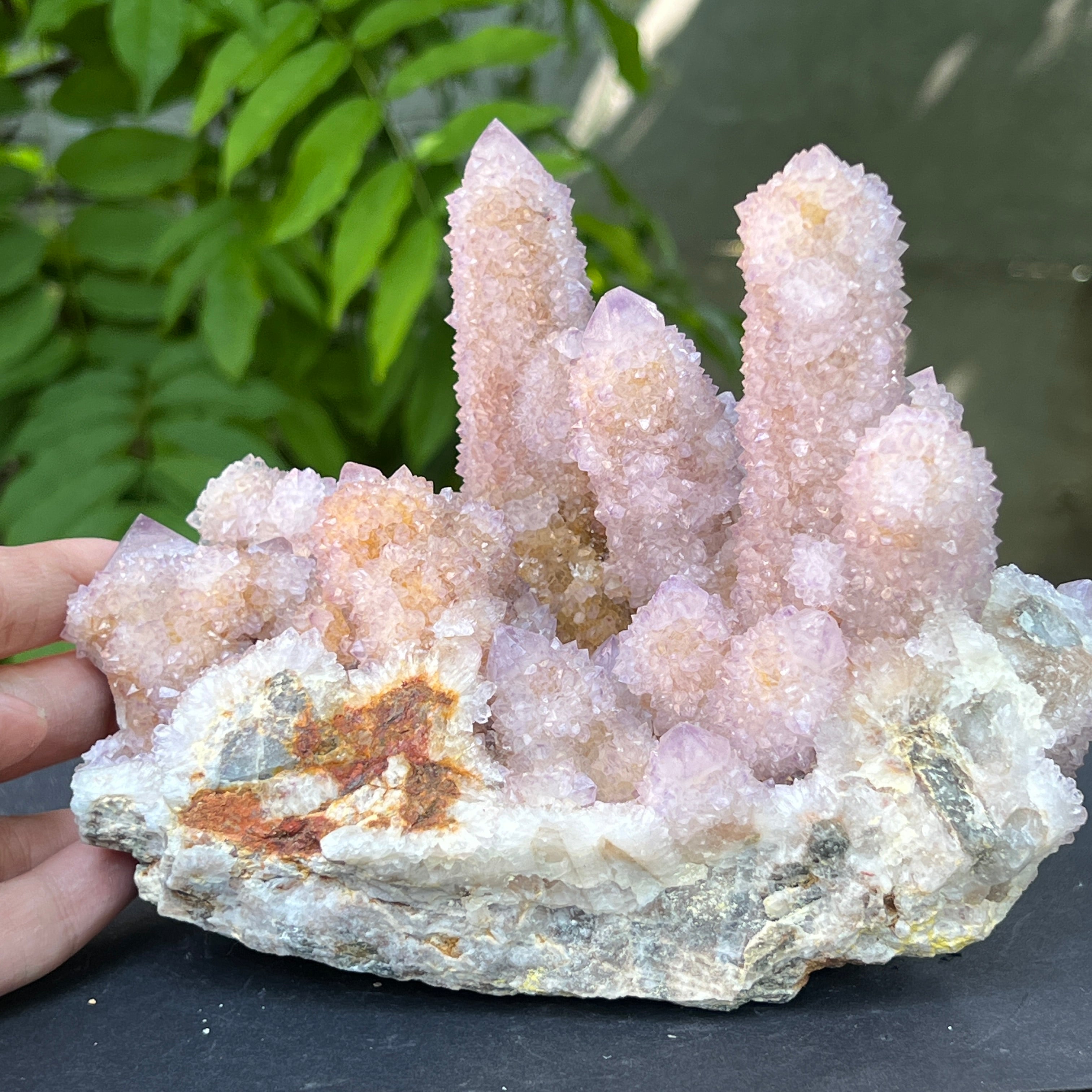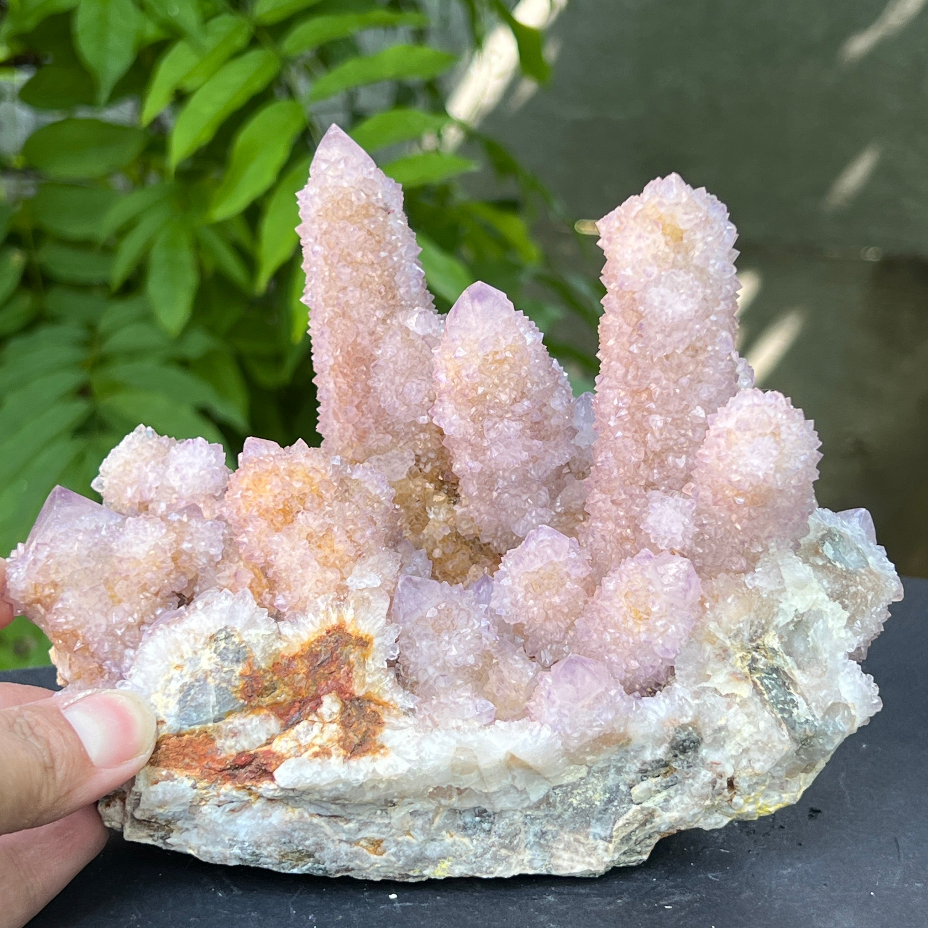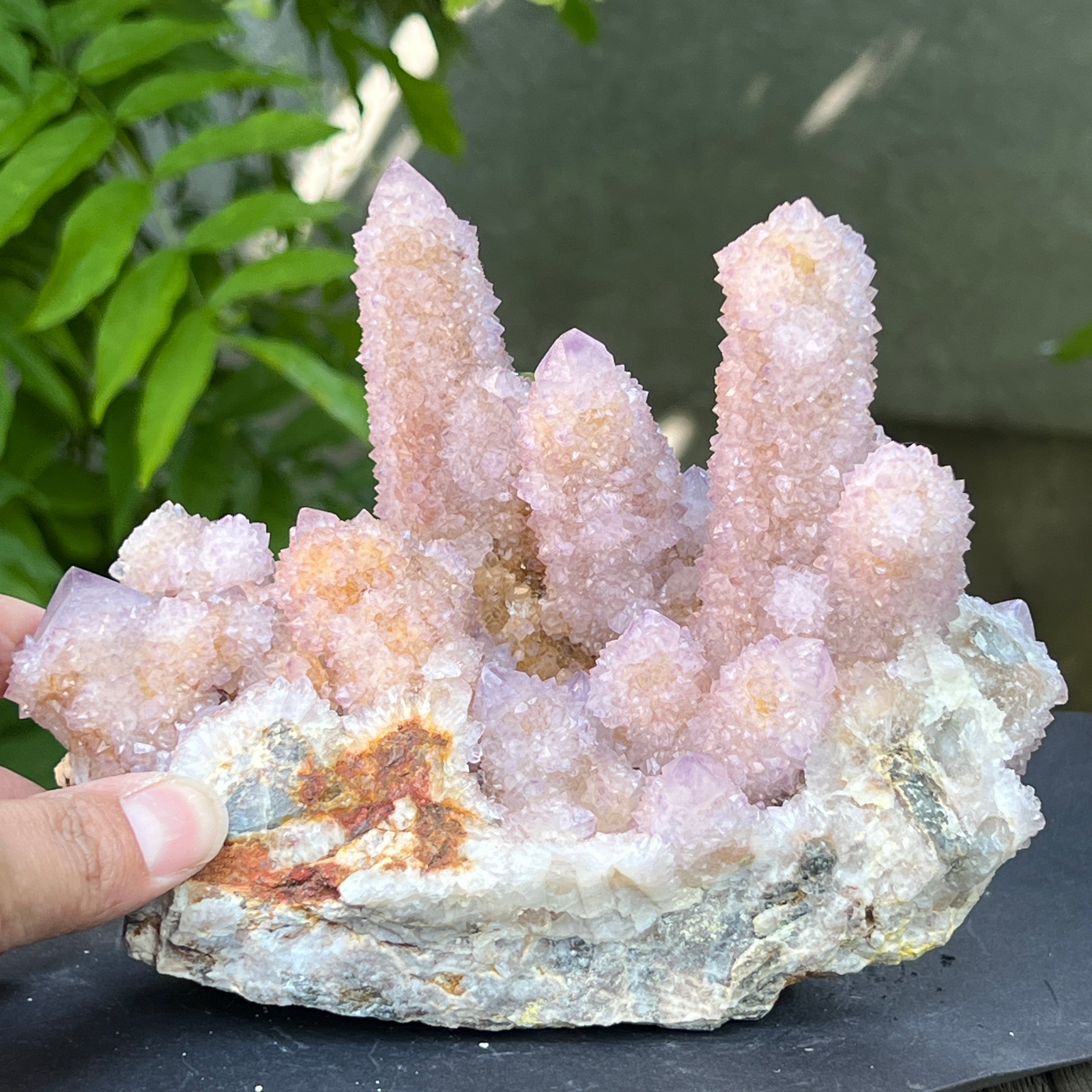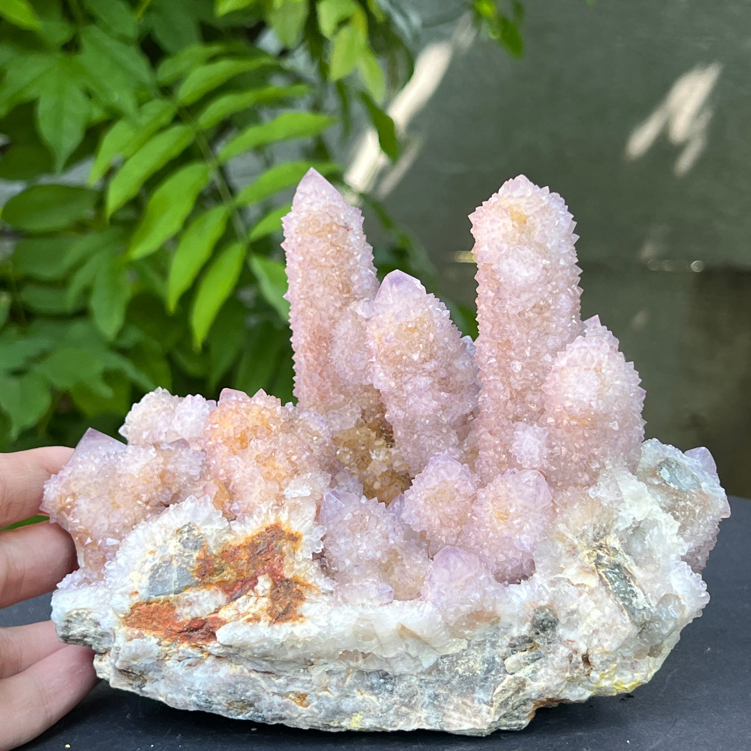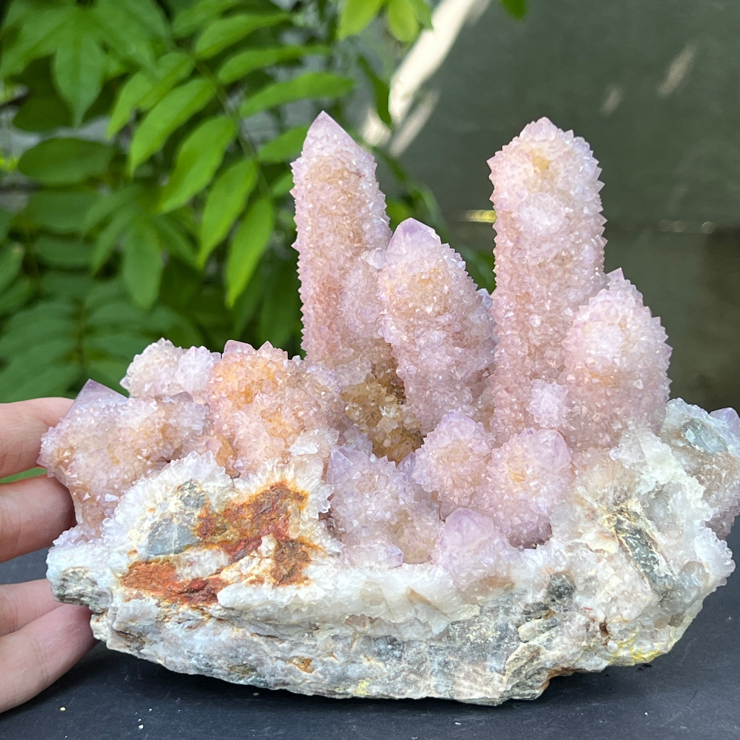 Az afrikai föld mélyén, ott, ahol a hegyek csendje elrejti a kimondatlan történeteket, megszületik egy rendkívüli szépségű kristály: a Spirit Quartz ametiszt, más néven „Kaktusz Quartz”. Ez a minerológiai csoda mintha misztikus aurába burkolózna – egyetlen masszív alap, ezernyi finom csúcs borítja, mint egy kristályközösség, amely a fény táncában egyesül.