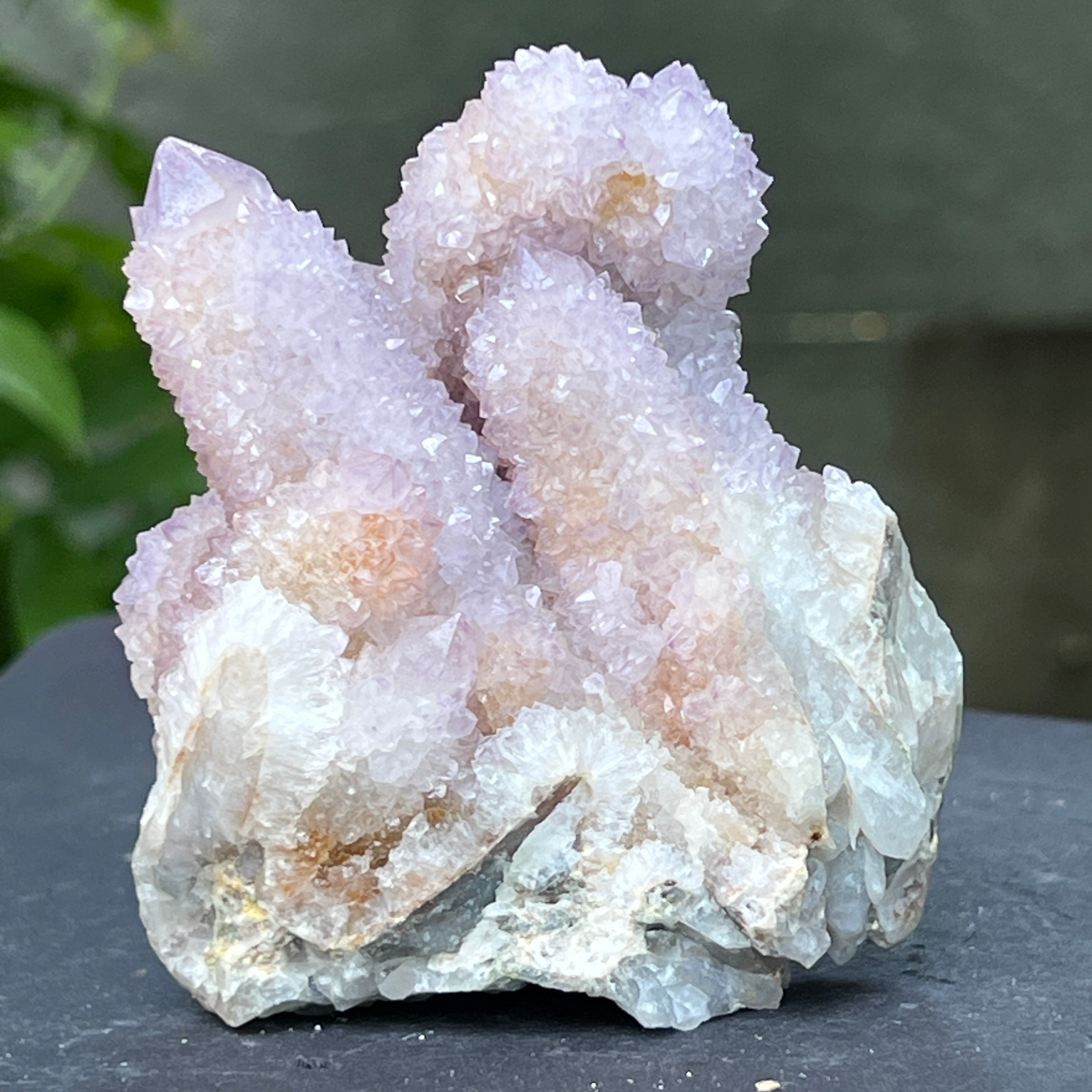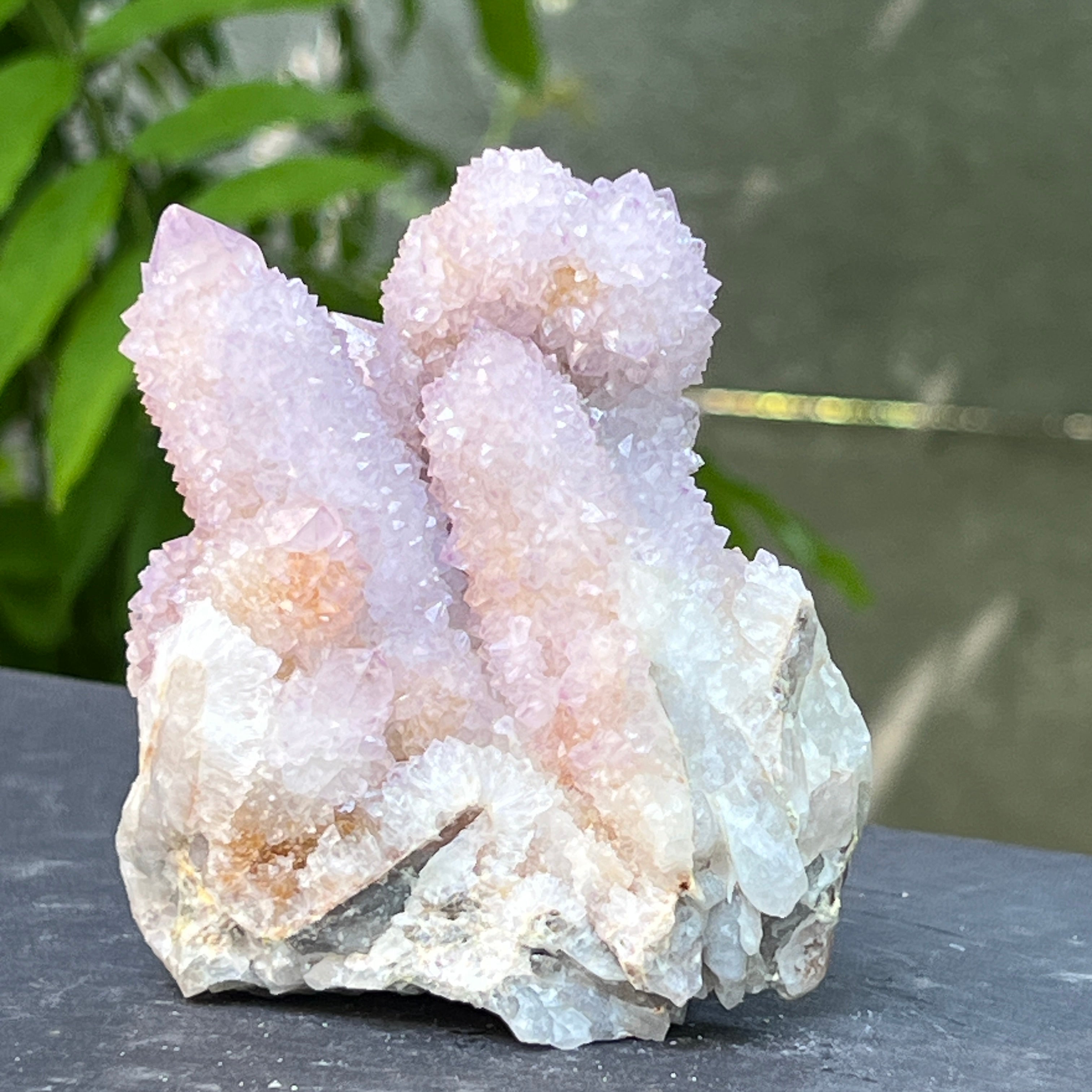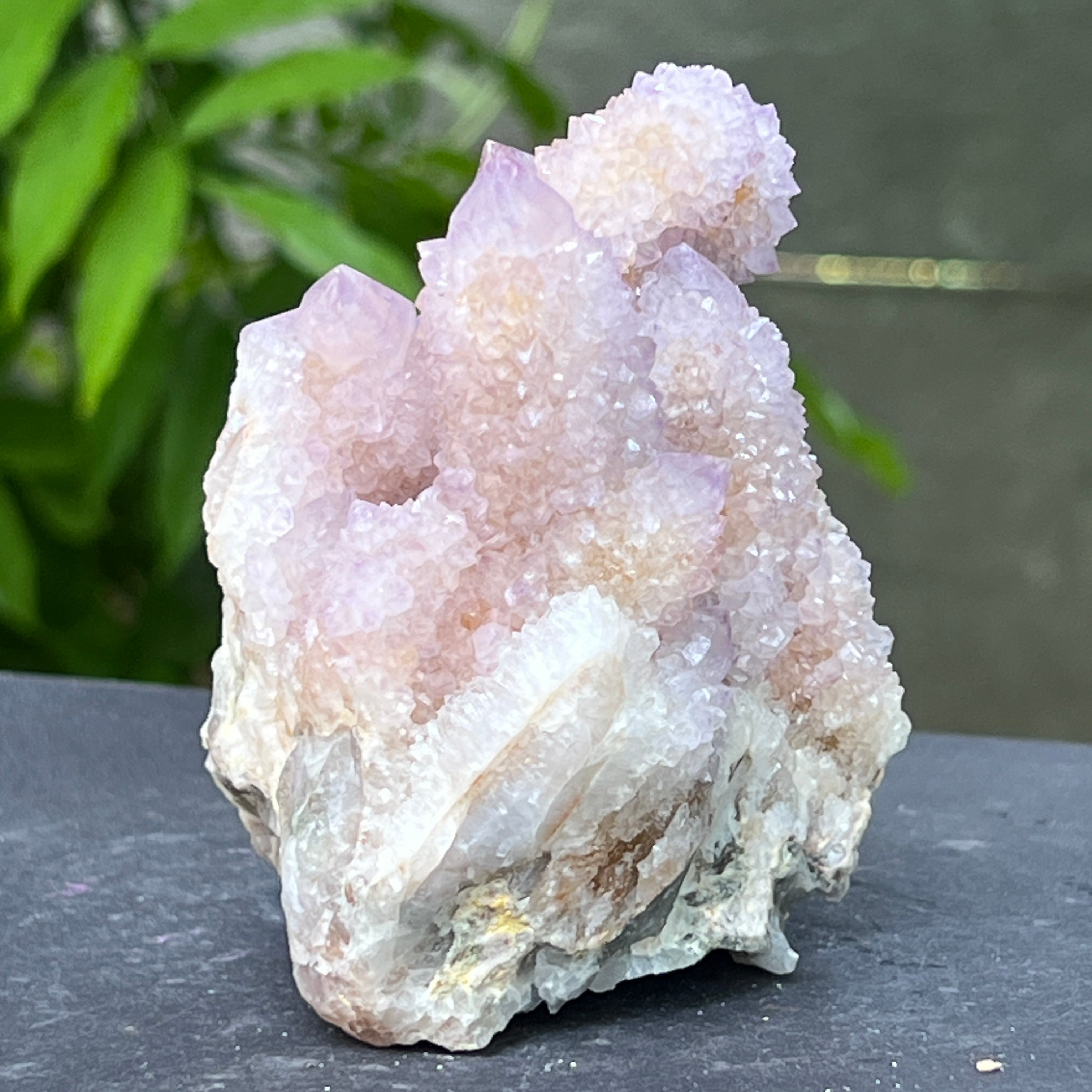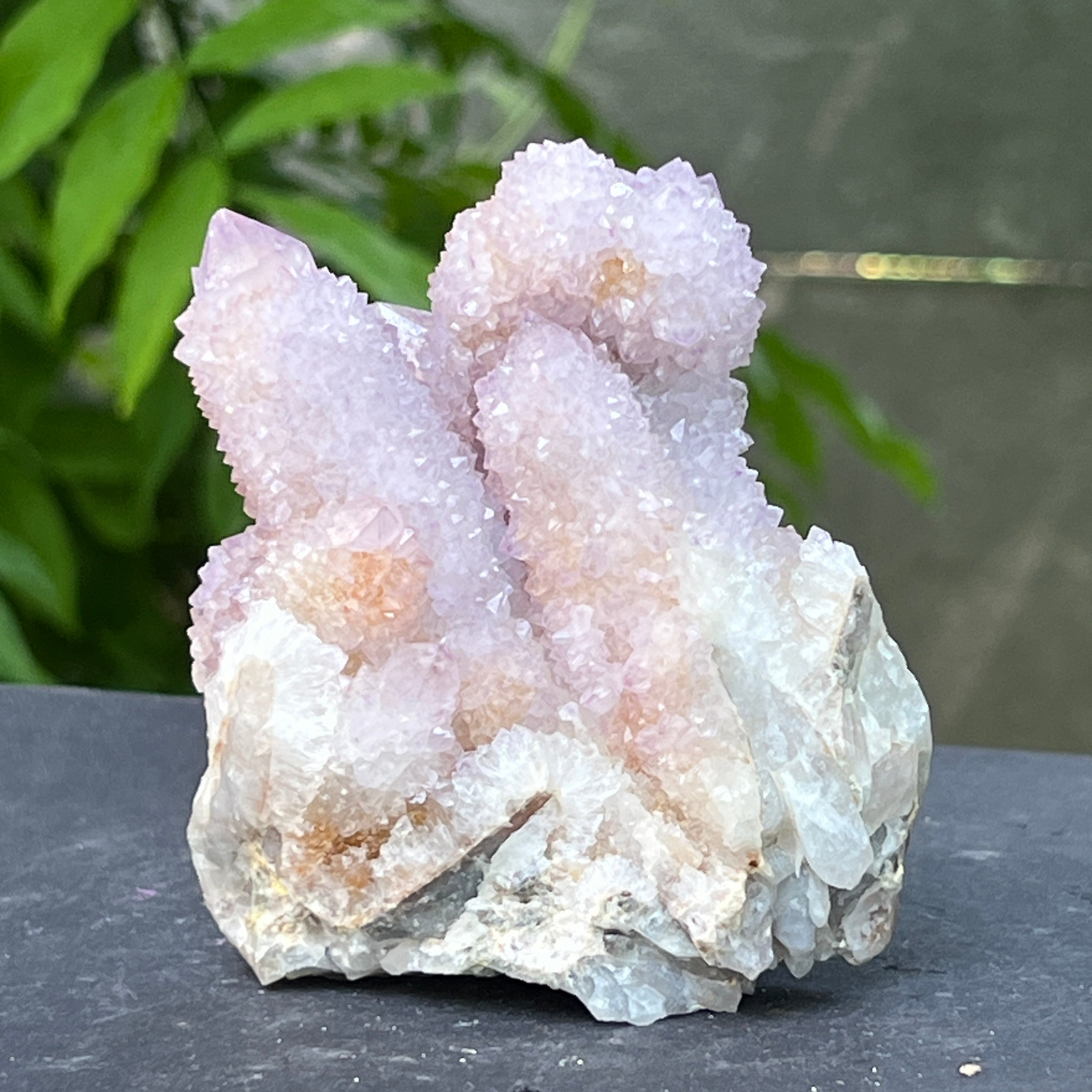 Afrika földje mélyén, ott, ahol a hegyek csendje elrejti a kimondatlan történeteket, megszületik egy rendkívüli szépségű kristály: a Spirit Quartz ametiszt, más néven „Kaktusz Quartz”. Ez a mineralógiai csoda mintha misztikus aurába burkolózna – egyetlen szilárd alap, amelyet ezrek finom csúcsai borítanak, mint egy világosság-táncban egyesült kristályközösség.