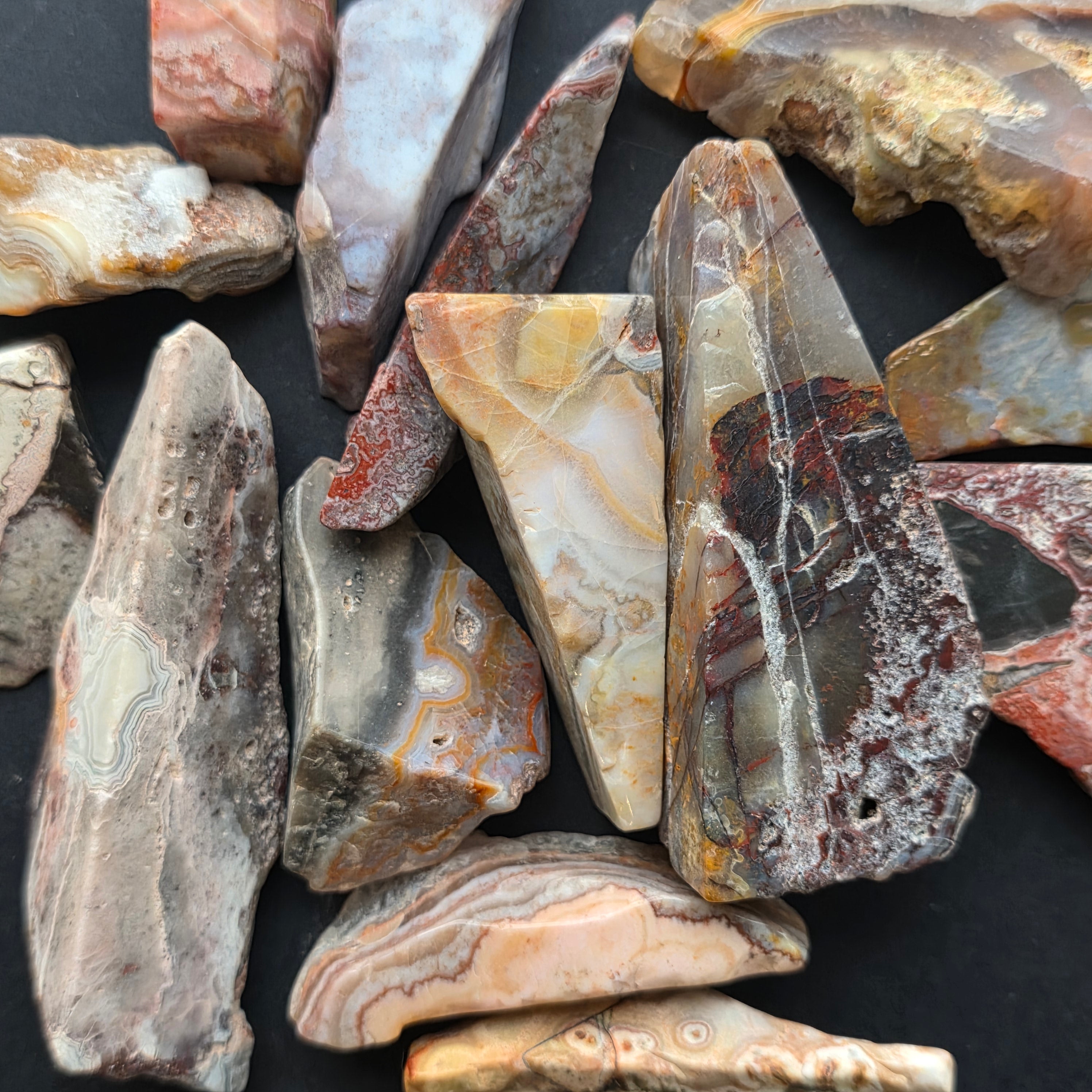 A mexikói Crazy Achát az egyik legélettelibb és leglátványosabb achátfajta, híres hullámos vonalairól és őrült színjátékaikról, amelyek úgy tűnik, mintha szabad kézzel, szabályok nélkül lennének rajzolva. Ebben a természetes szeletben, kicsi, de rendkívül kifejező, a kő teljes története feltárul: földszínű rétegek, meleg karamell árnyalatok, élénkvörös, narancs, szürke és krém színek keverednek spirális mintákban, amelyek mintha életre kelnének.