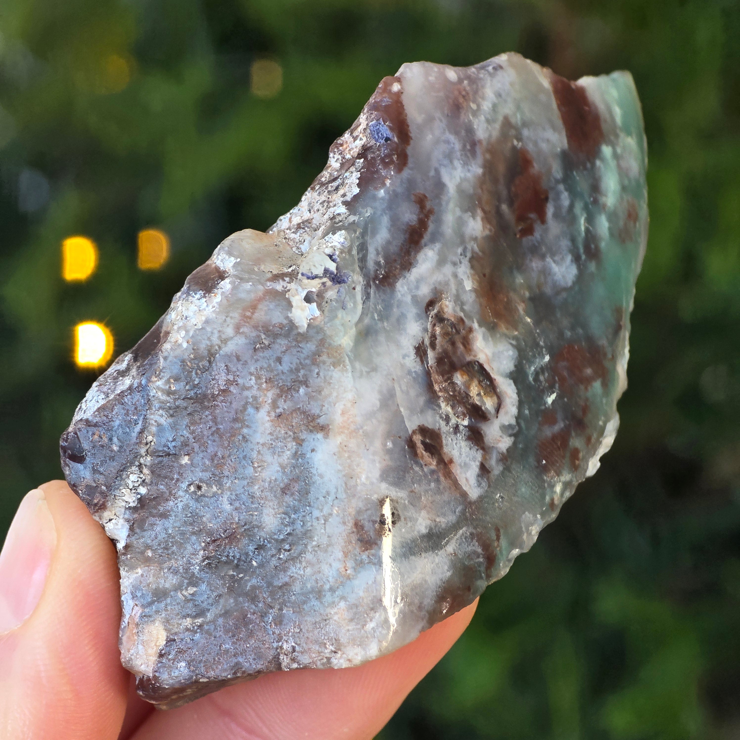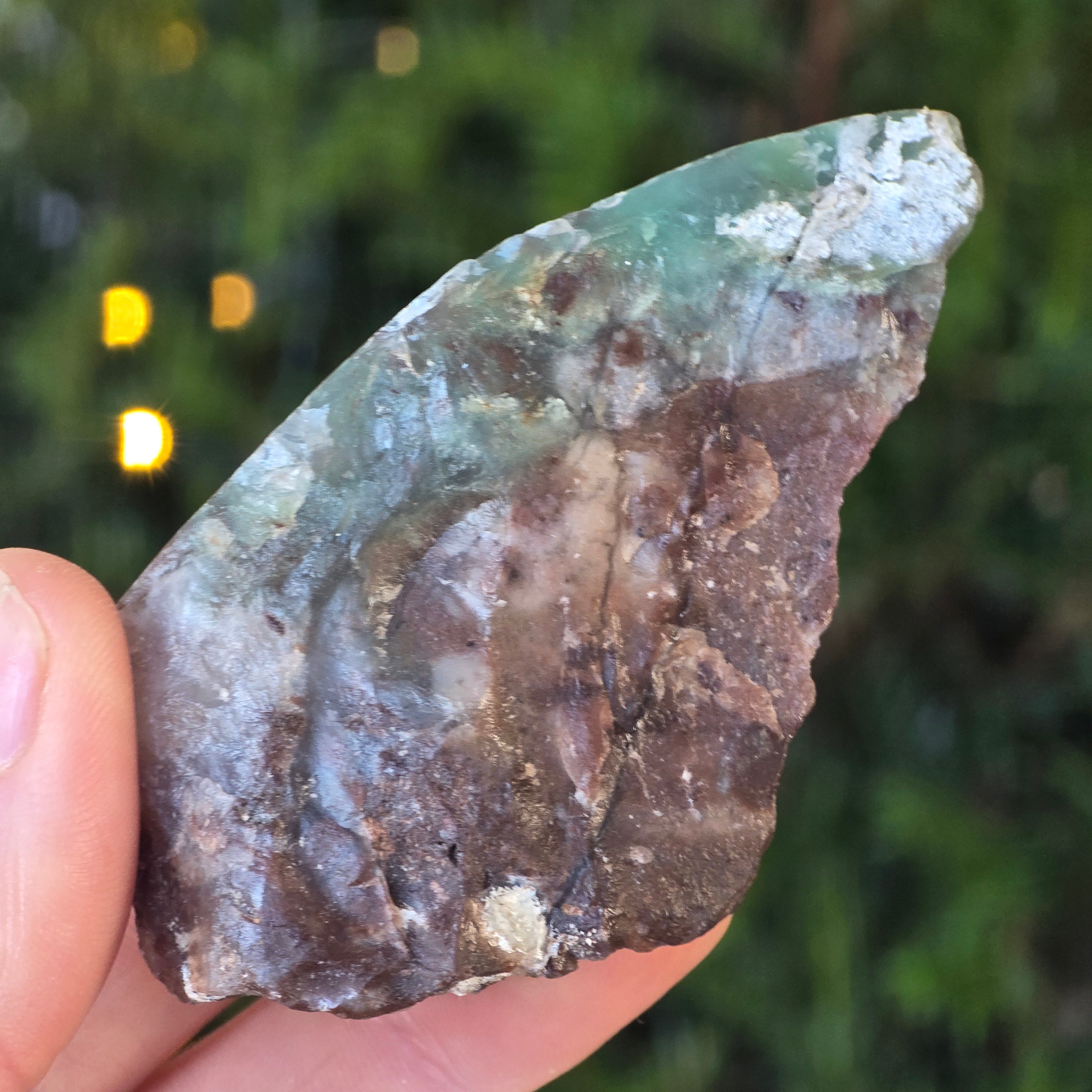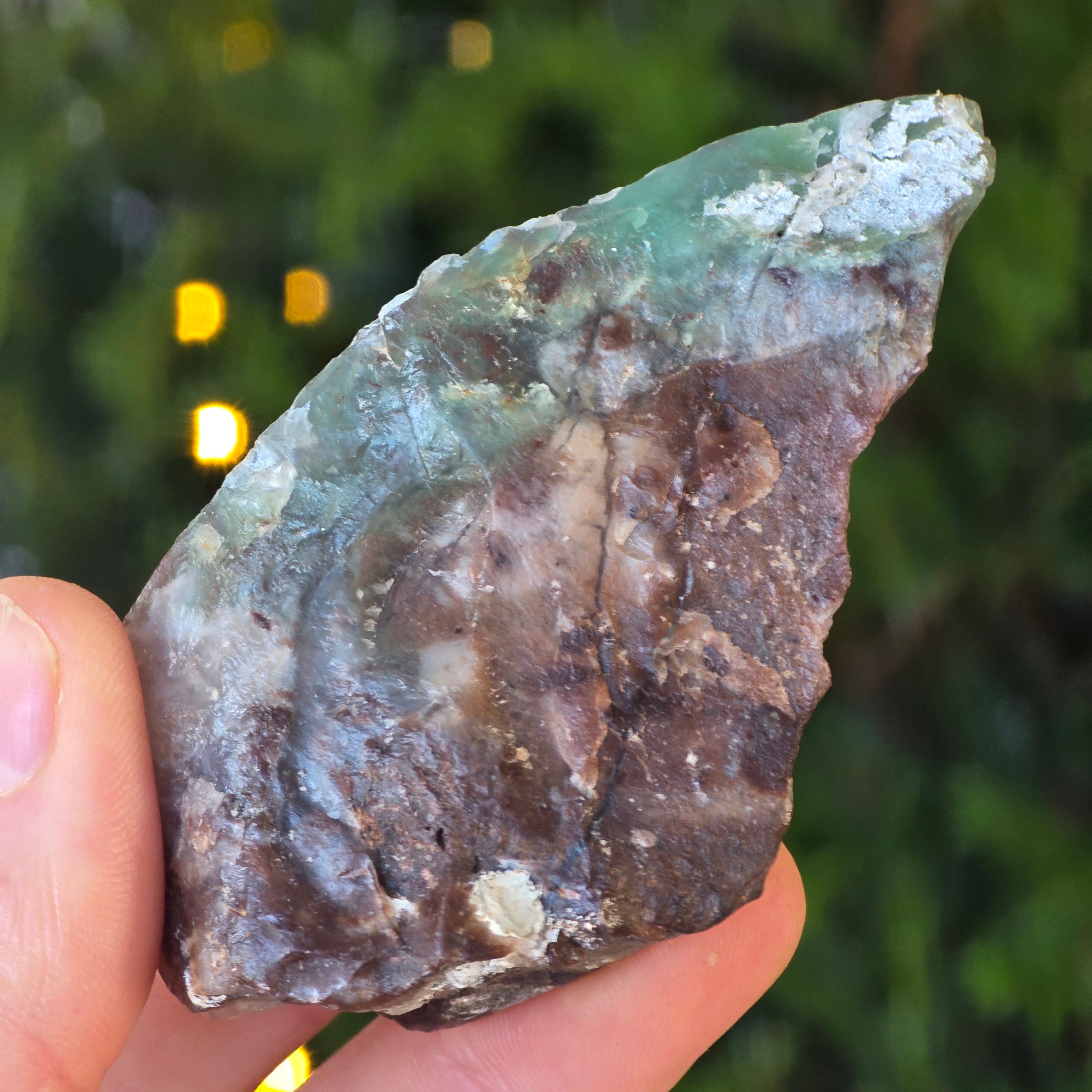 Ez a forma a krómot tartalmazó kalcedon természetes, változatlan állapota – egy nehezen található ásvány, amely kizárólag Zimbabwe-ből származik, és élénk színéért értékelik, amely nem nikkelből (mint a krizopráz esetében), hanem a kristályszerkezet mélyén pulzáló krómból származik. Ebben a különleges változatban a kék és zöld beékelődések lenyűgöző színjátékot hoznak létre, finom átmenetekkel az áttetsző és az átlátszatlan, a sűrű és a levegős között.