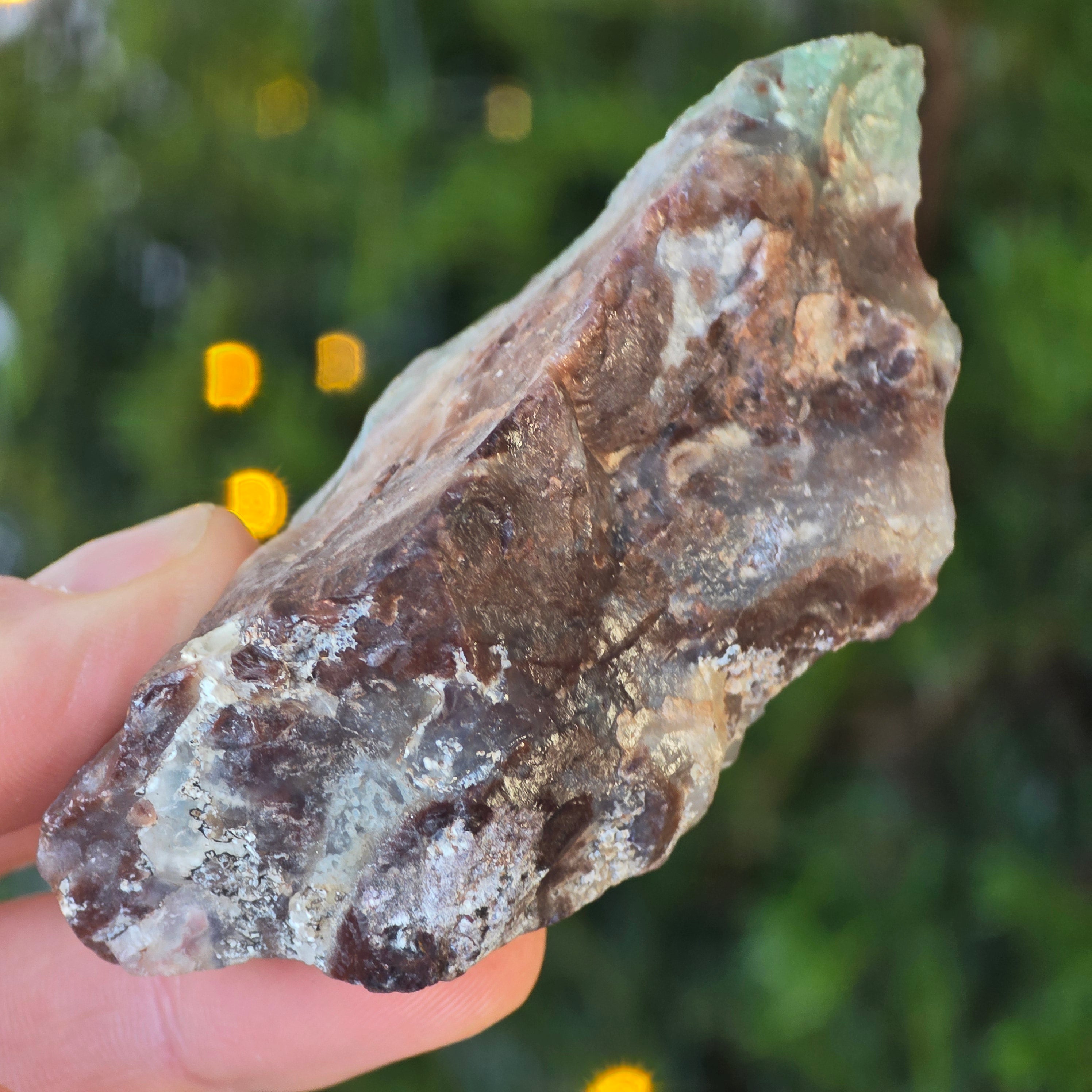 A textúrája élő – tejfehér kalcedon erekkel, diszkrét kvarc repedésekkel és a mátrix rozsda foltjaival – mind a lassú kialakulás tanúi egy összetett, feszültségekkel teli geológiai környezetben.