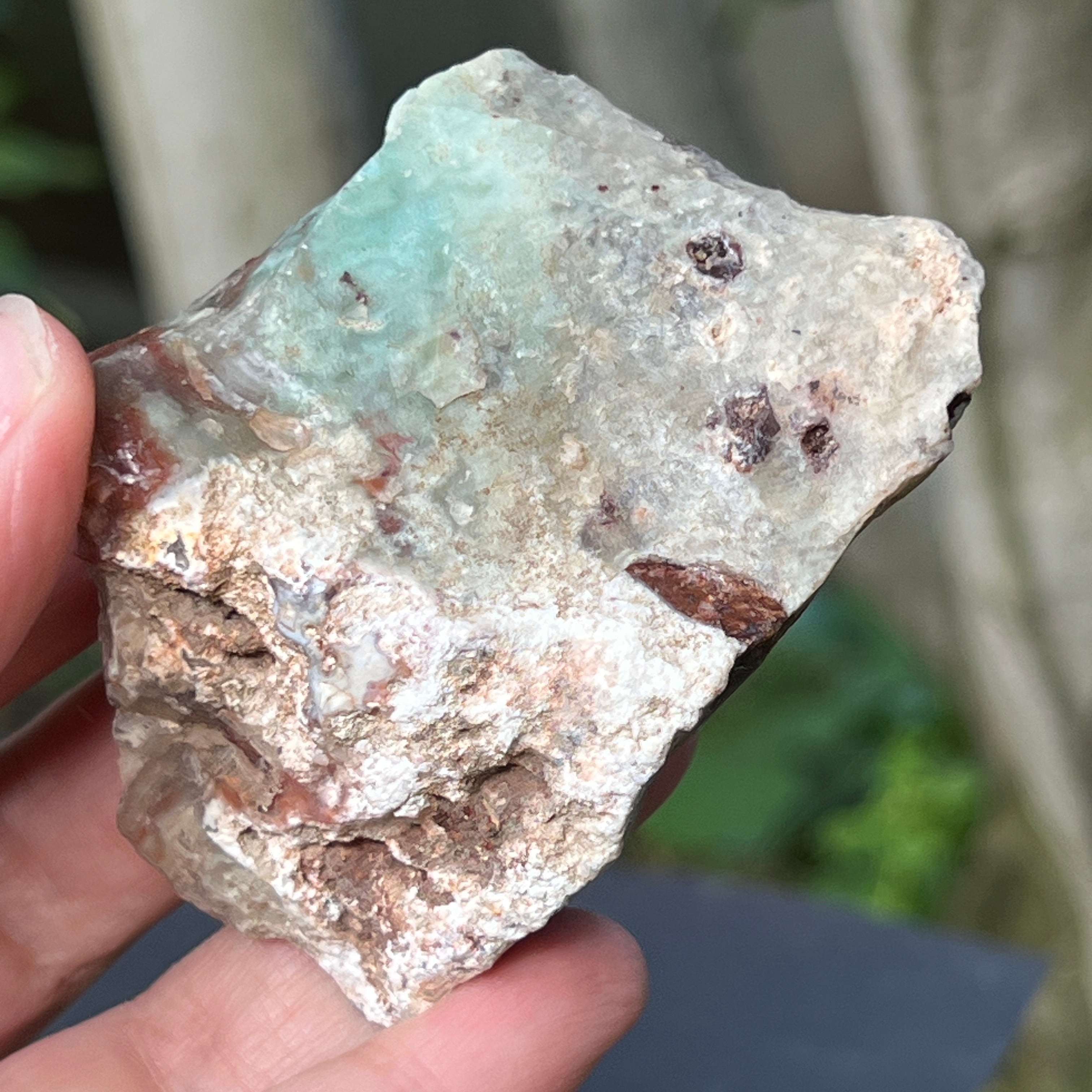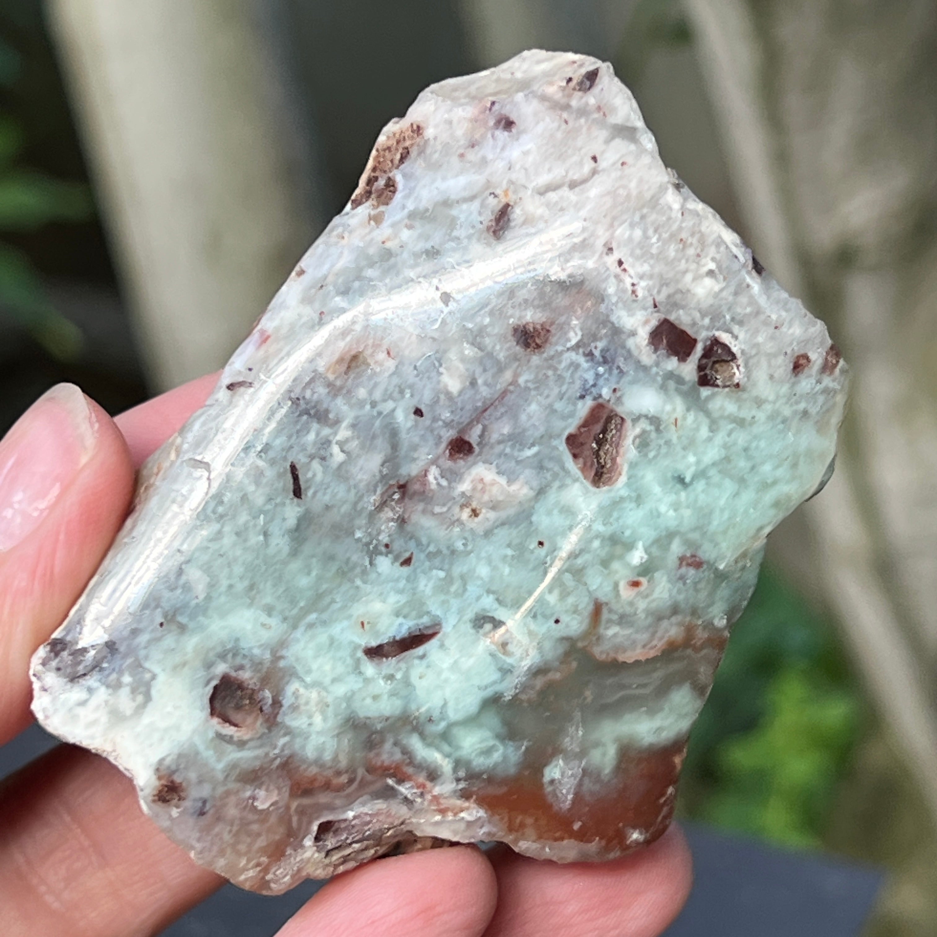 A textúrája élő – tejfehér kalcedonívék, diszkrét kvarctörések és rozsdás foltok a mátrixban – mind a lassú képződés tanúi, egy bonyolult és feszültségekkel teli geológiai környezetben.