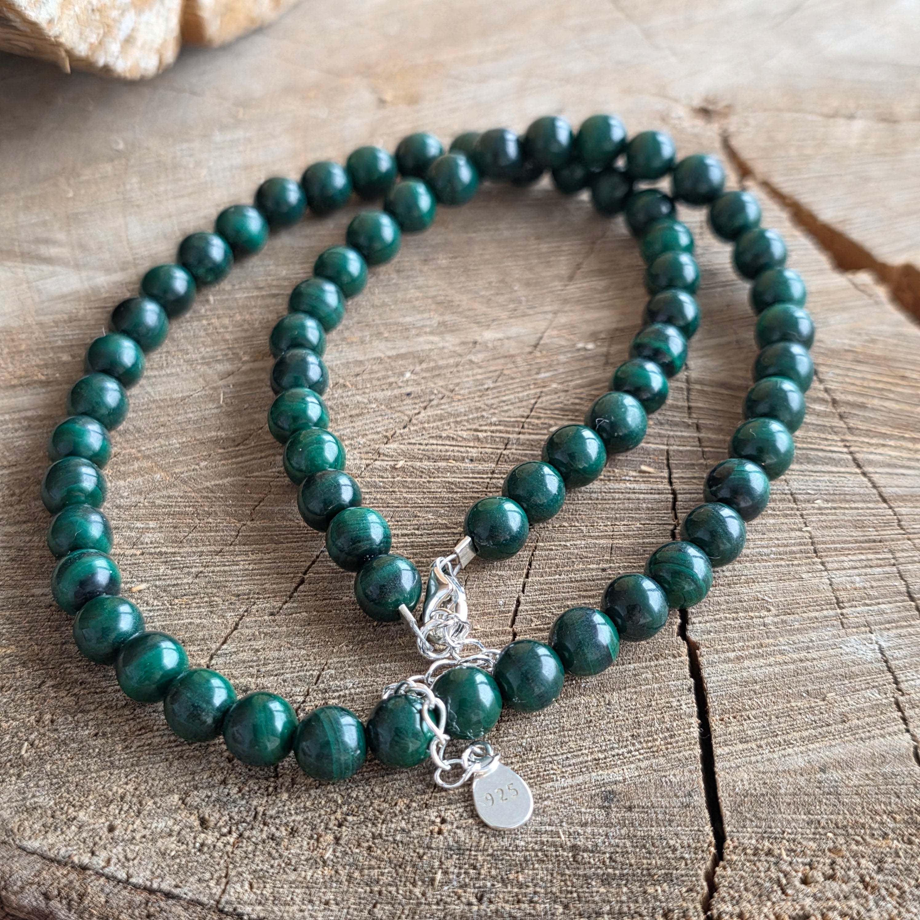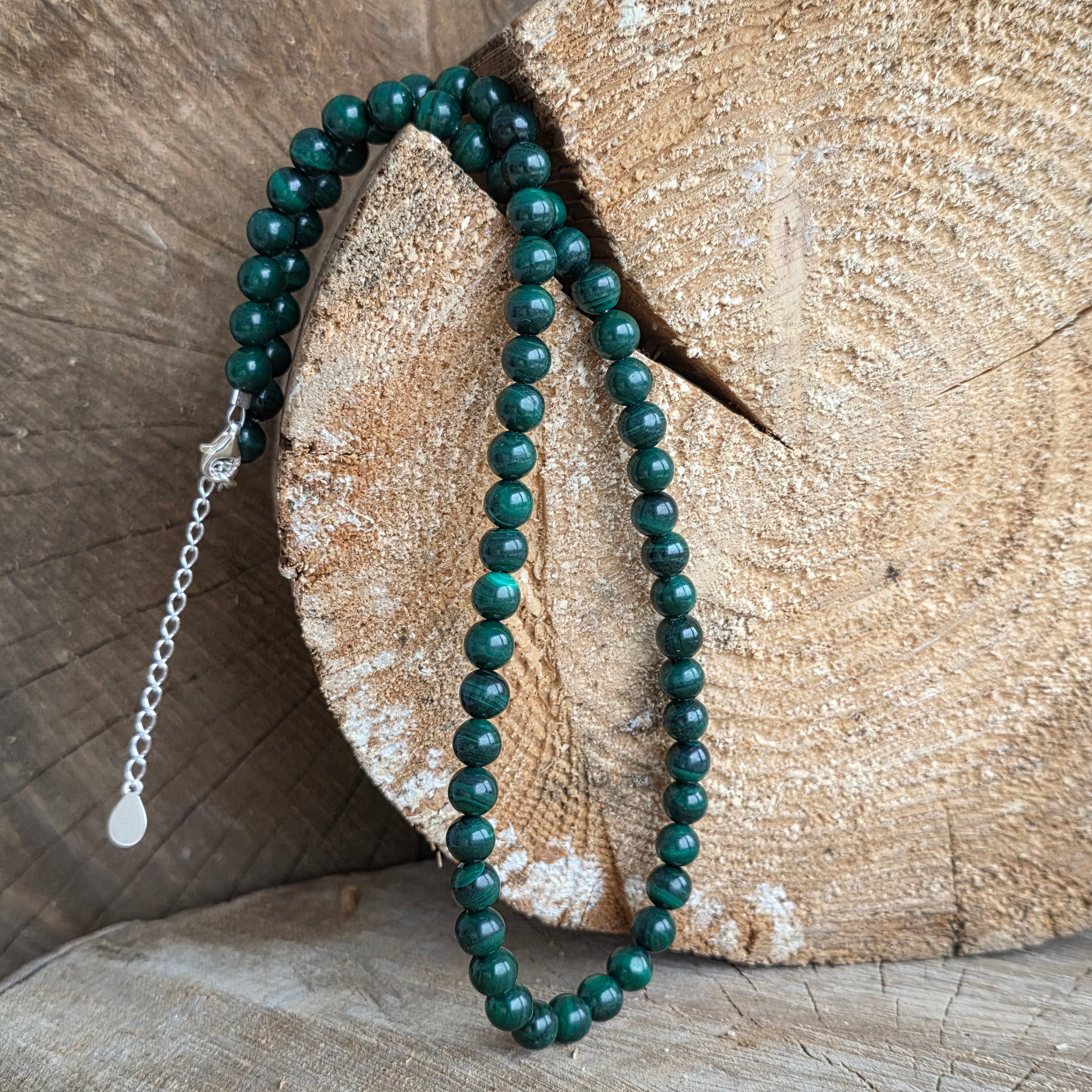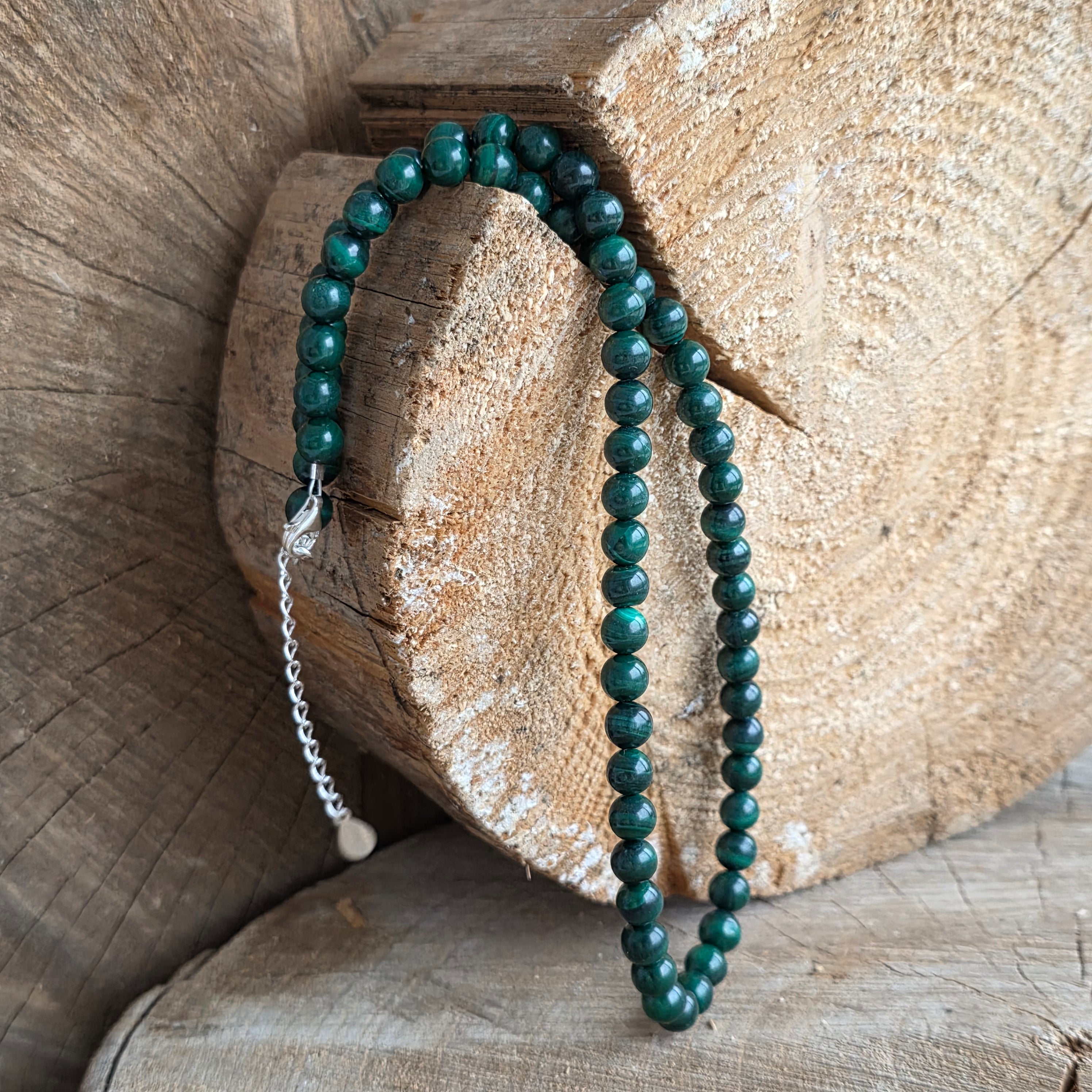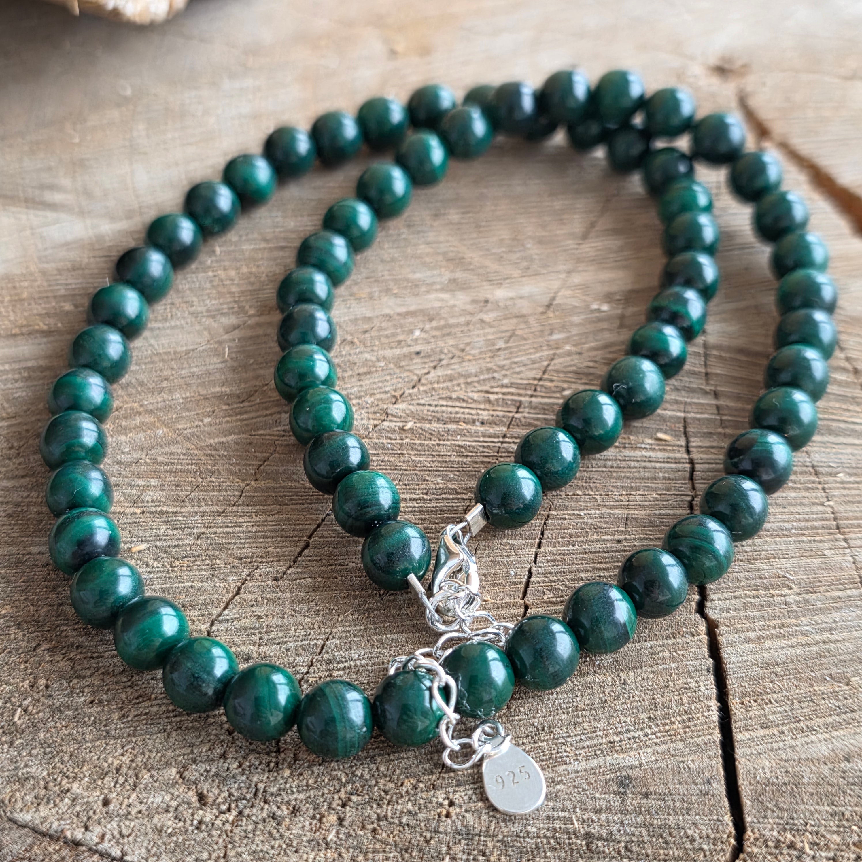 Egy nyaklánc, amely magában hordozza a föld mély dalát, az erő és a megújulás visszhangját. A malachit mélyzöld árnyalataival és folyó csíkjaival élő kő – ennek kifejeződése átalakulás, védelem és belső újjászületés. Minden 6 mm-es gyöngy önmagában egy világ, egy tánc a smaragd fény és az erdő árnyéka között.