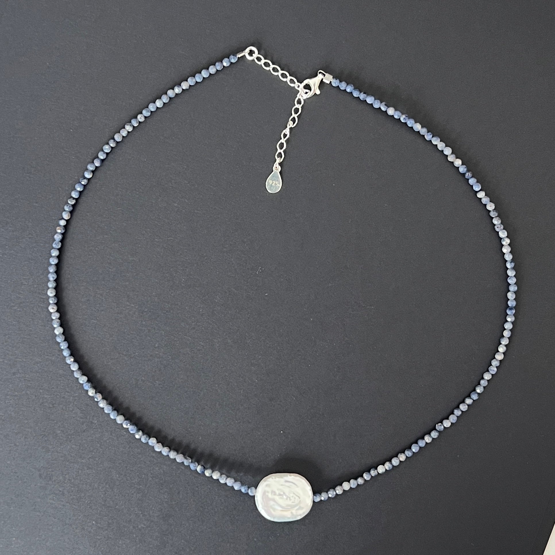Csendes eleganciájú nyaklánc, ebből készült csiszolt természetes zafír a kék mély árnyalataival, amelyek a tiszta éjszakák rejtélyét idézik. A kompozíció közepén az o kerek, lapos természetes gyöngy, gyöngyházfényű, harmóniát és vizuális egyensúlyt hoz – akár egy telihold, amely a sötét égen ragyog.