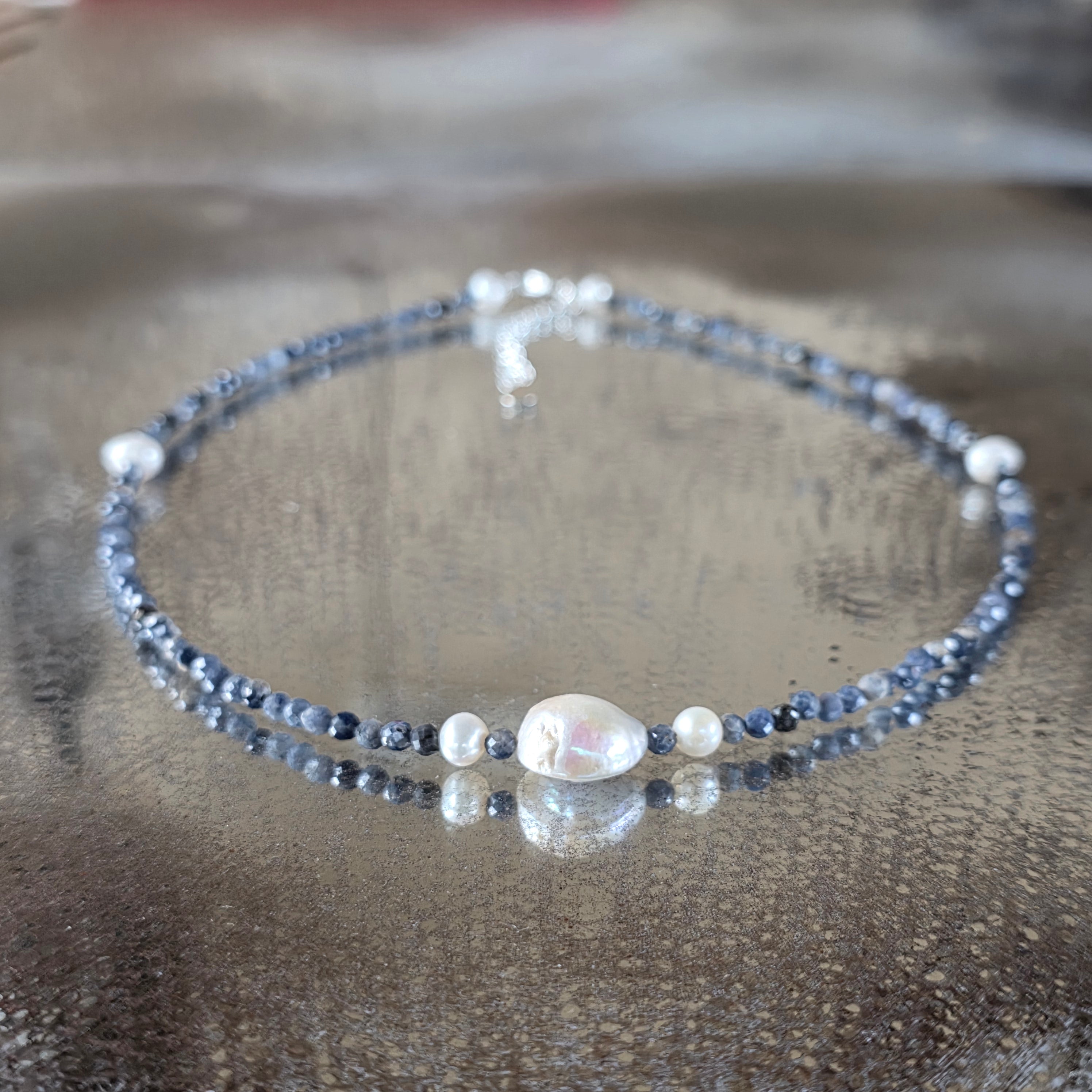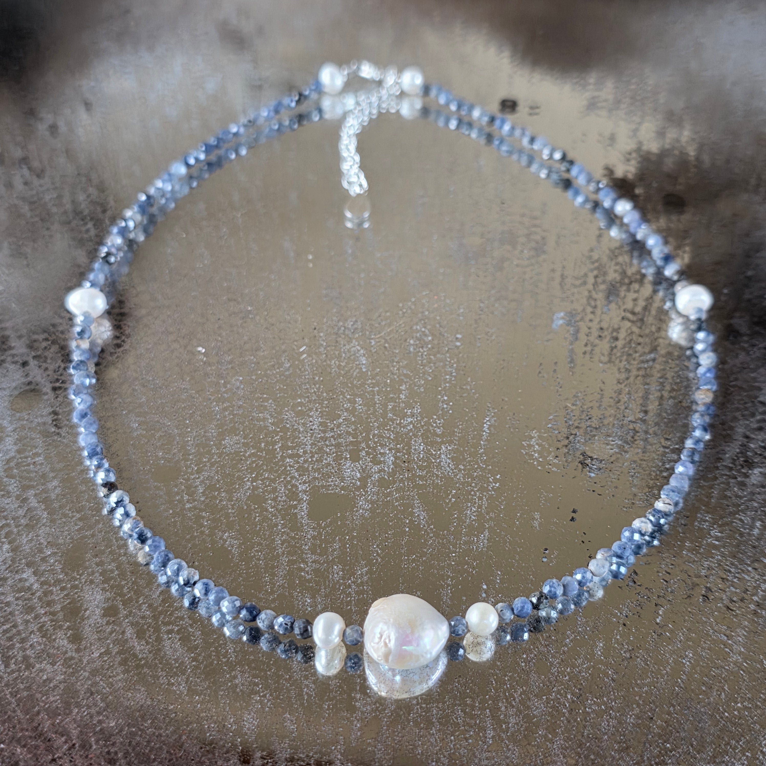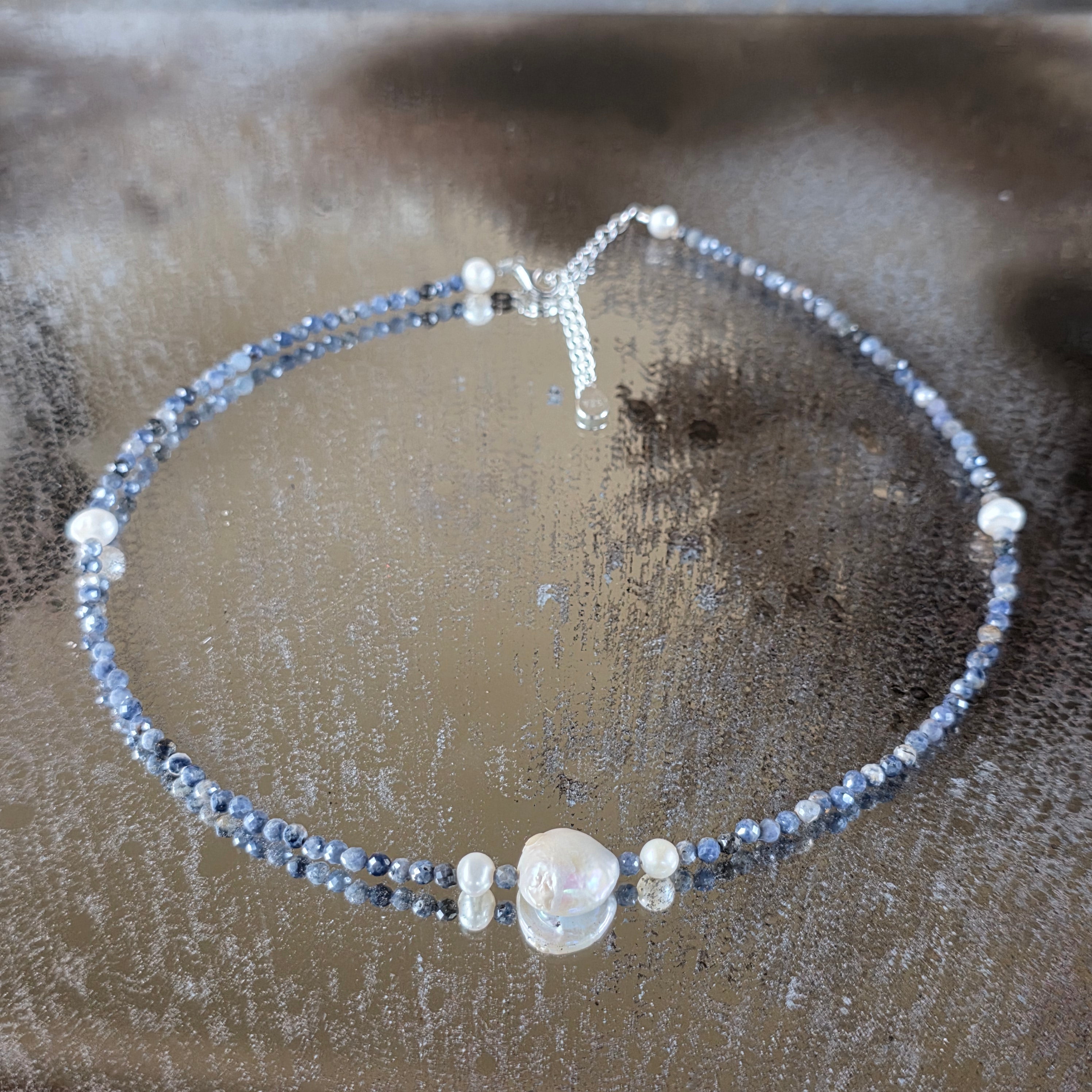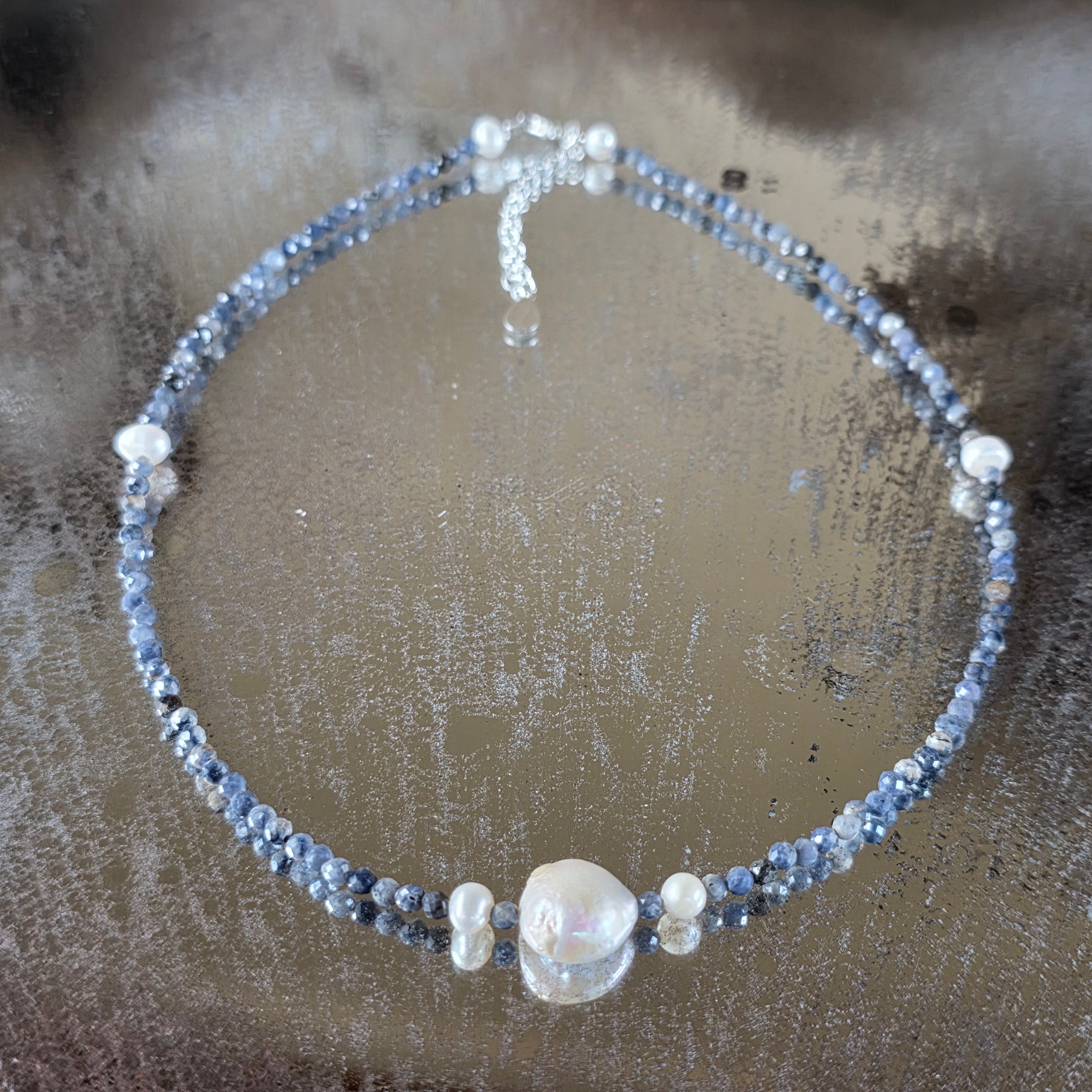Csendes eleganciájú nyaklánc, ebből készült 3 mm-es csiszolt természetes zafír, melynek mélykék árnyalatai a tiszta éjszakák és a belső béke titkát rejtik magukban. A kompozíció közepén az o lapos, kerek gyöngy, gyöngyházfényű, vizuálisan rögzíti az egész darabot – mint egy nyugodt hold a gondolatok csillagos egén.