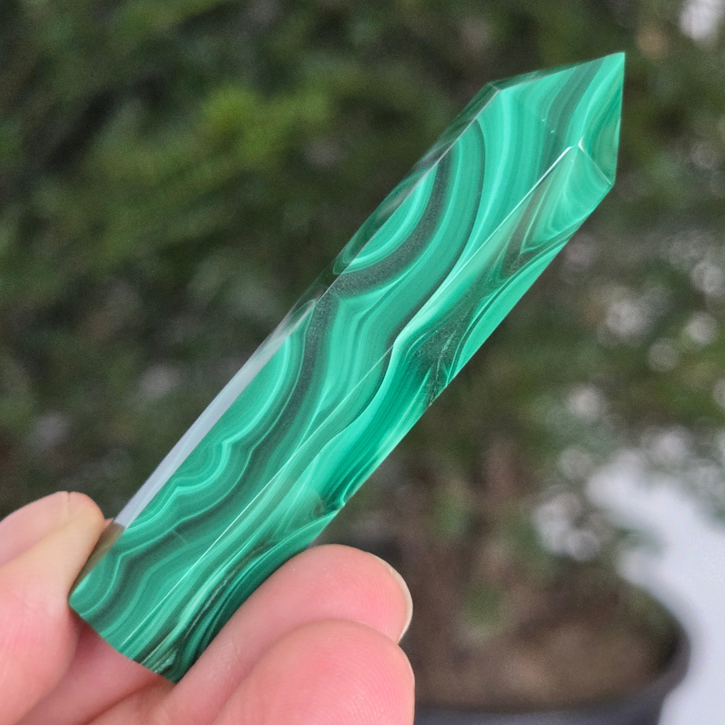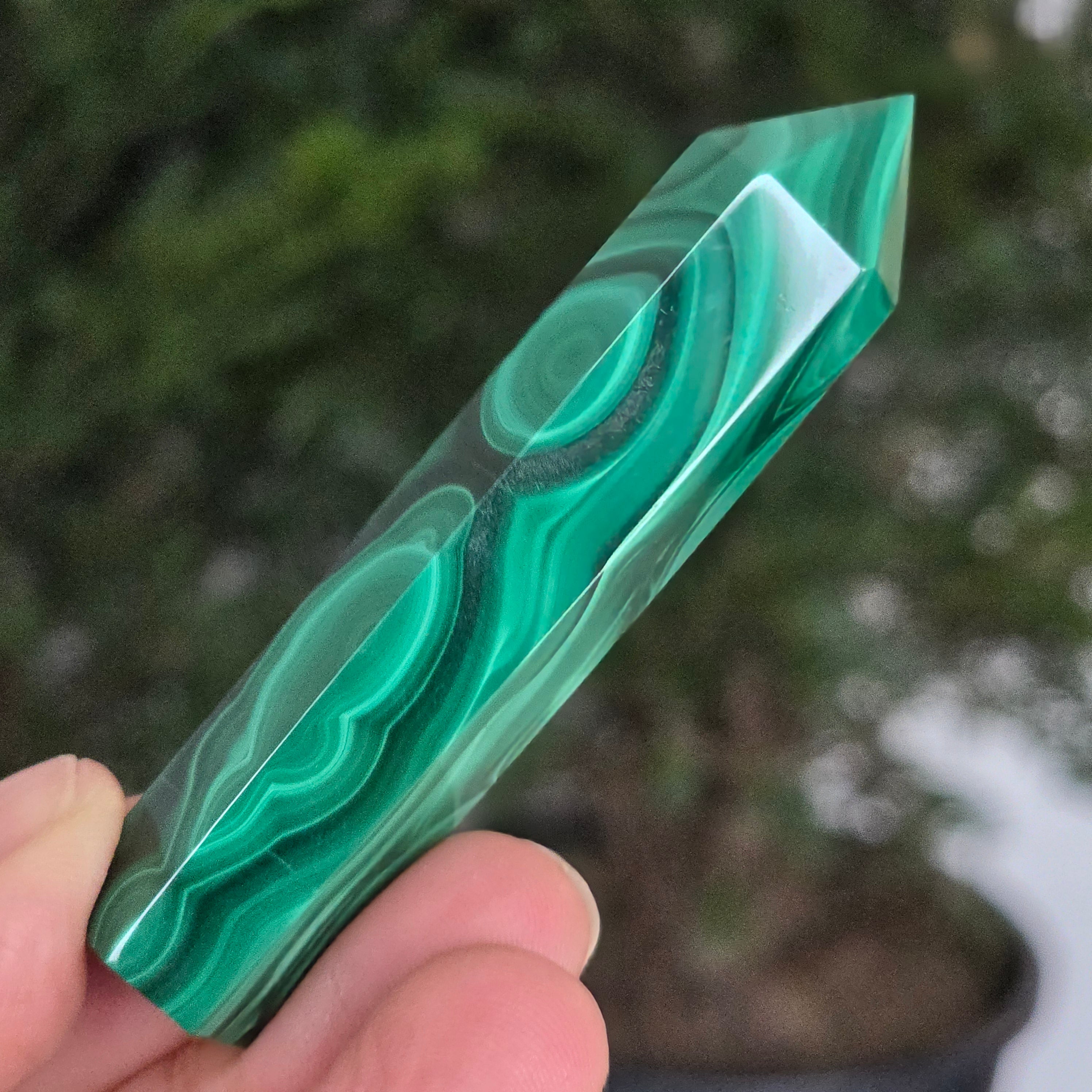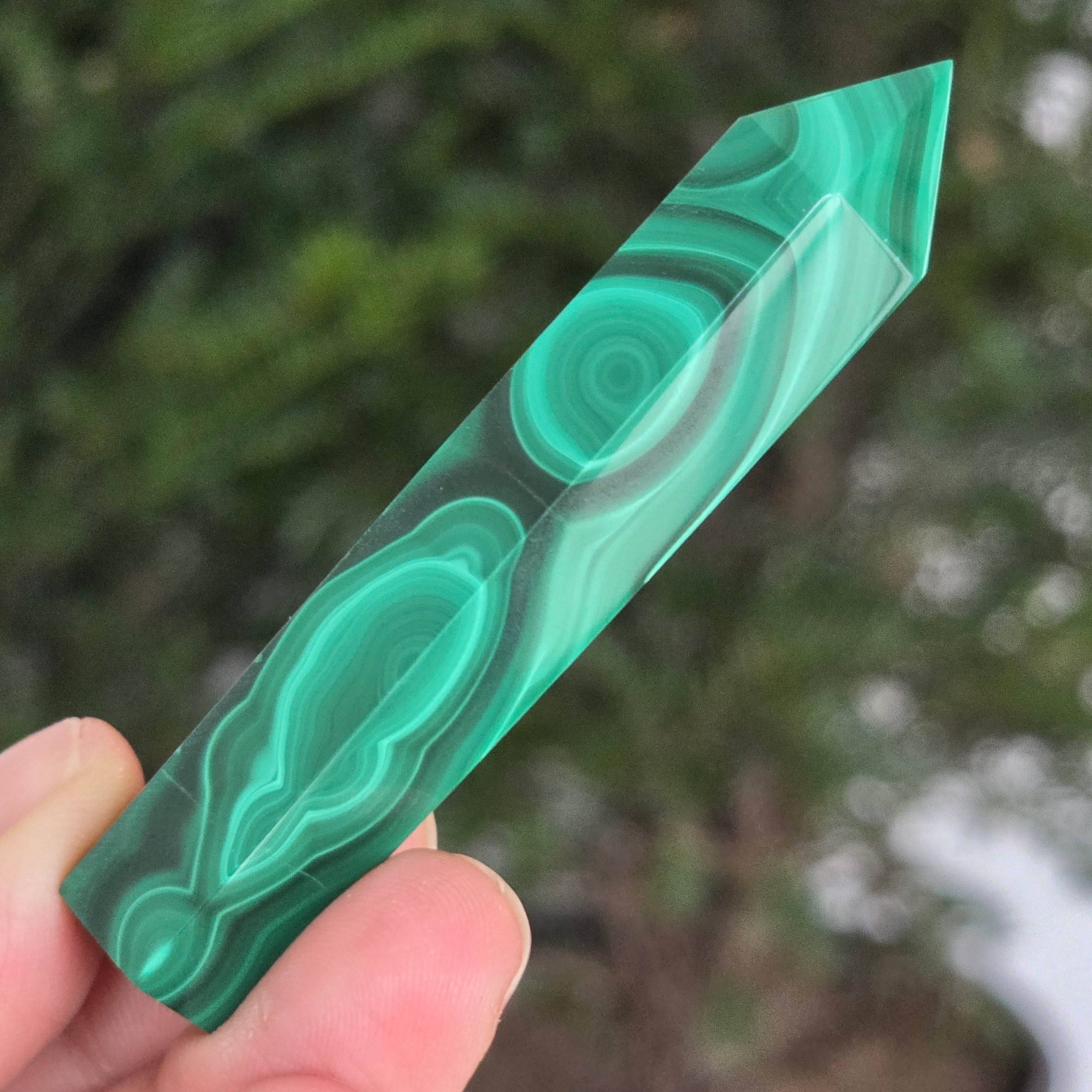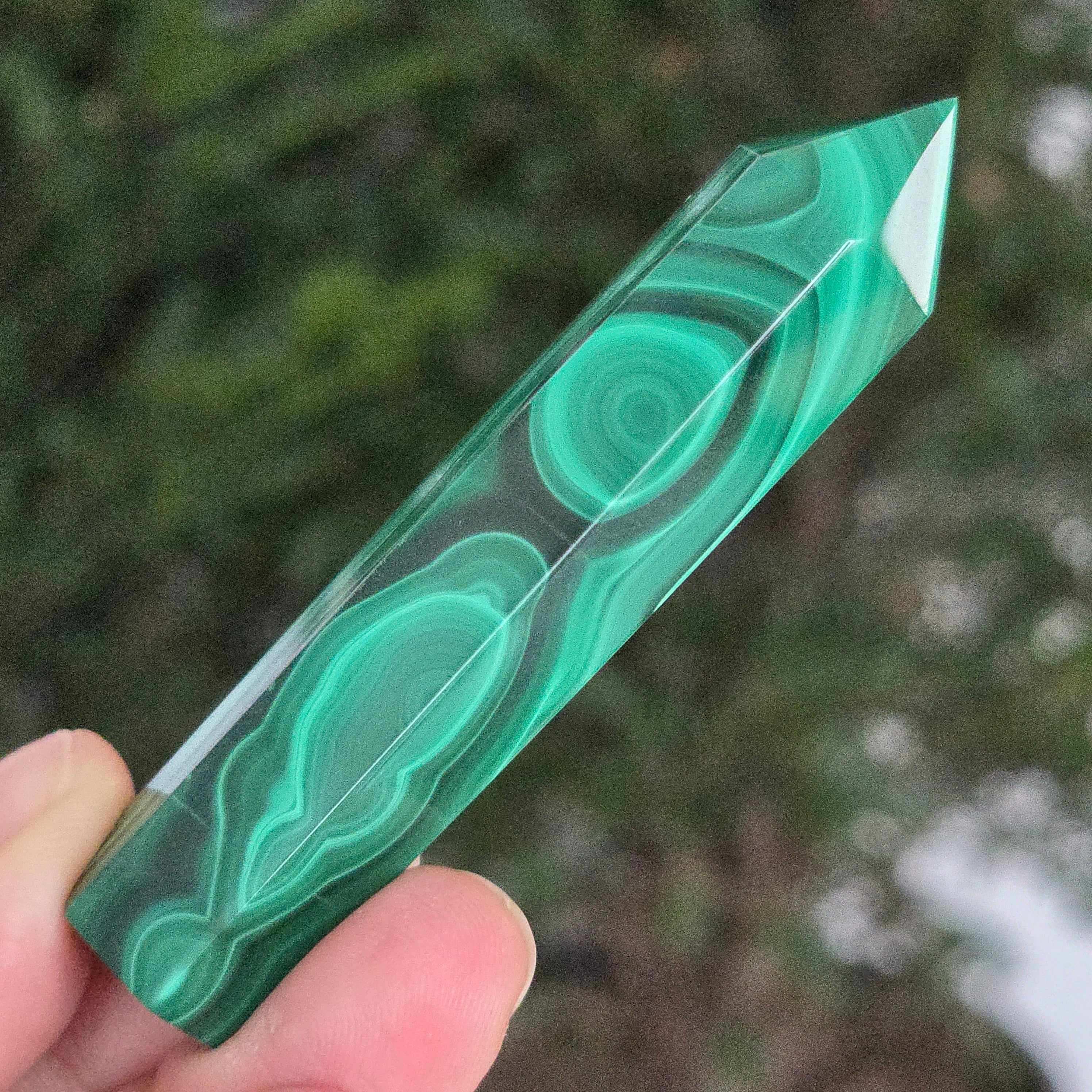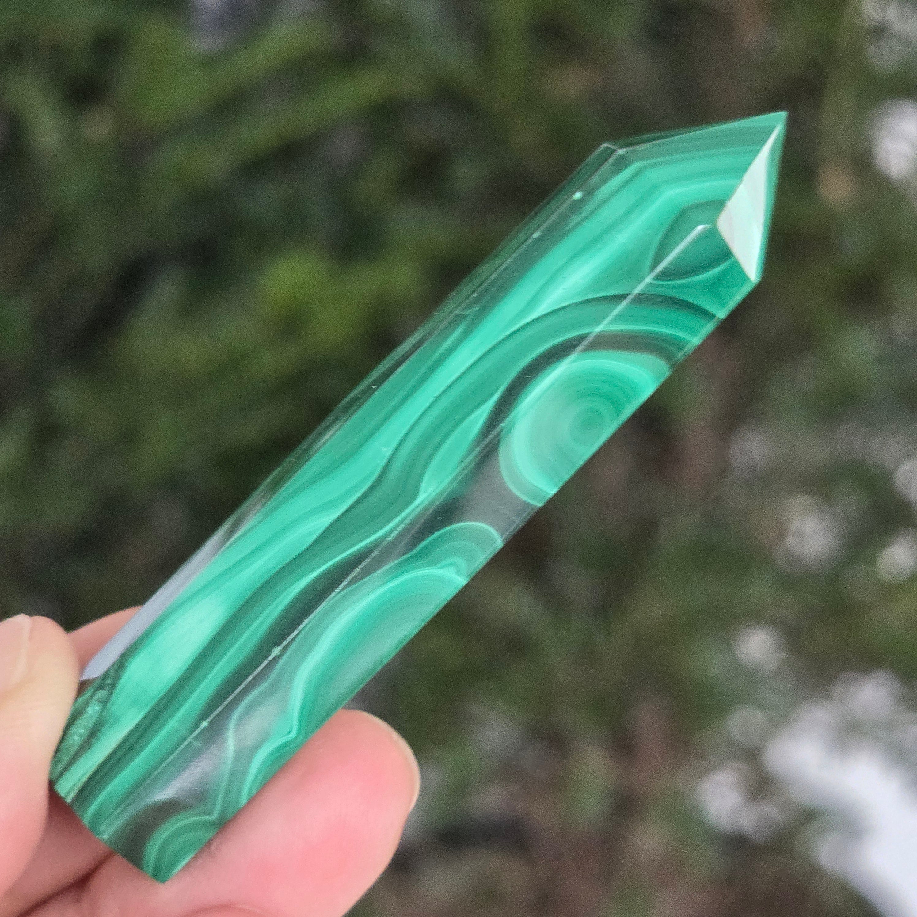 Egy obeliszk, amely úgy tűnik, életre kelt a bolygó zöld mélységeiből. Ez az egyedi darab természetes malachitbóllenyűgöző smaragdzöld, sötétzöld és selymes jáde árnyalatait tárja fel, amelyek egyedülálló koncentrikus mintákban rendeződnek, mint a belső energiák térképei. Kézzel polírozva, bársonyos fényűre, az obeliszk mély ásványi eleganciát sugároz.