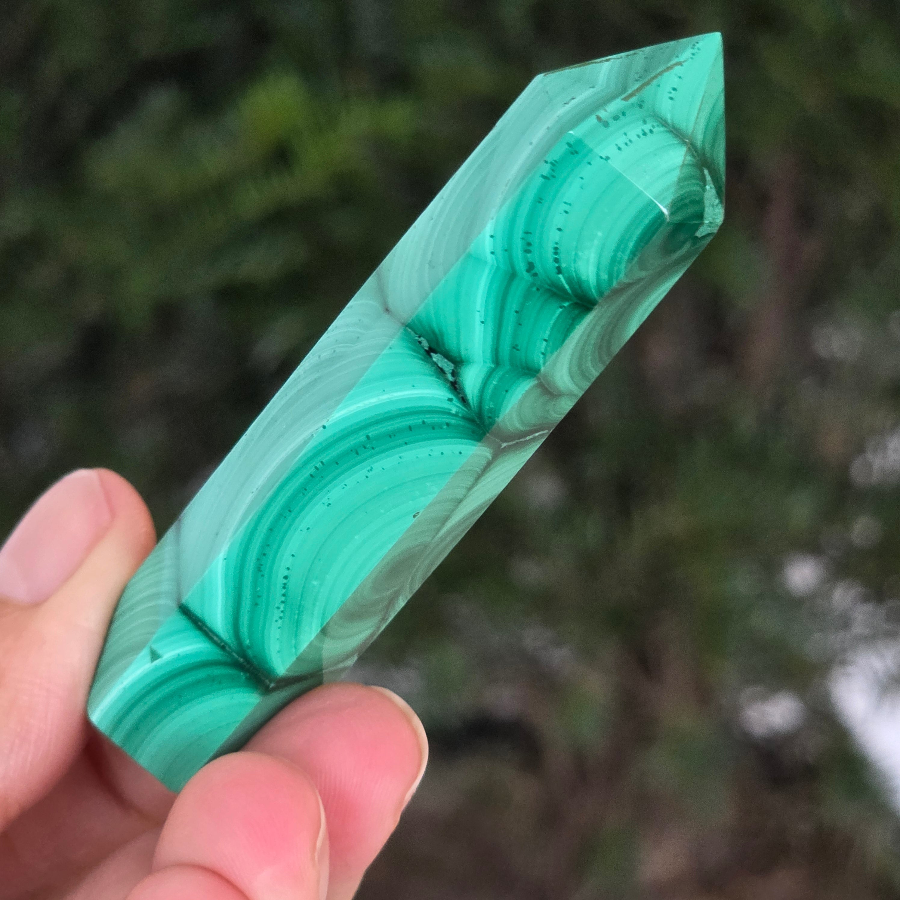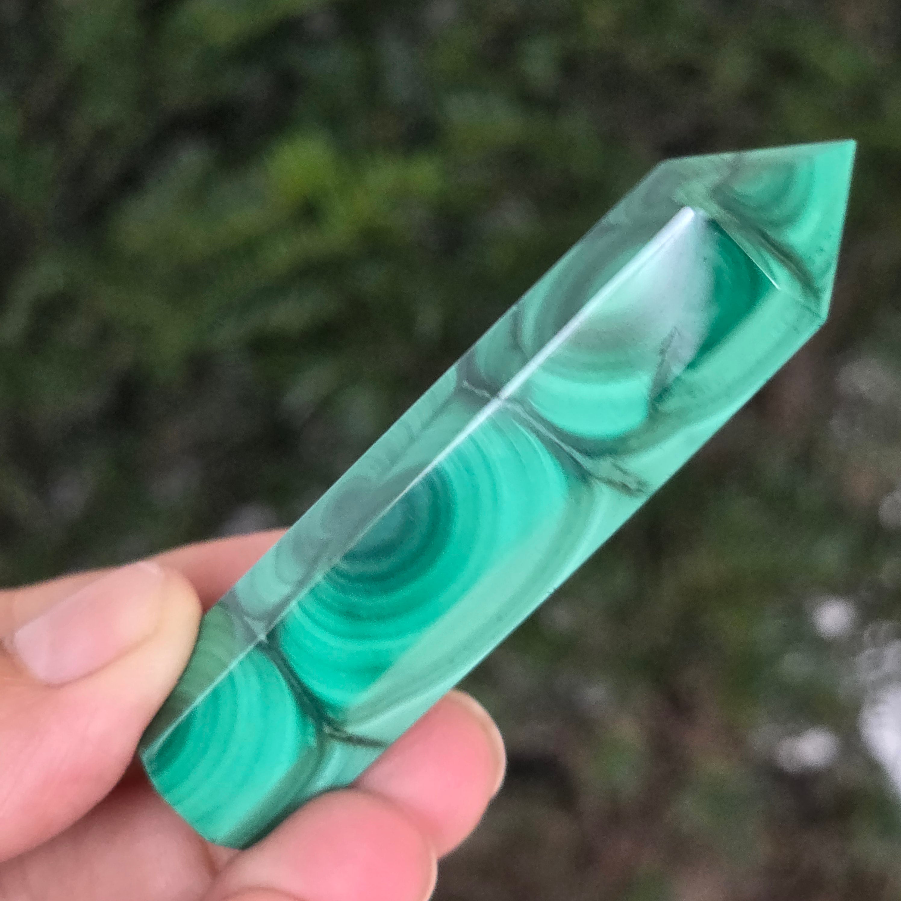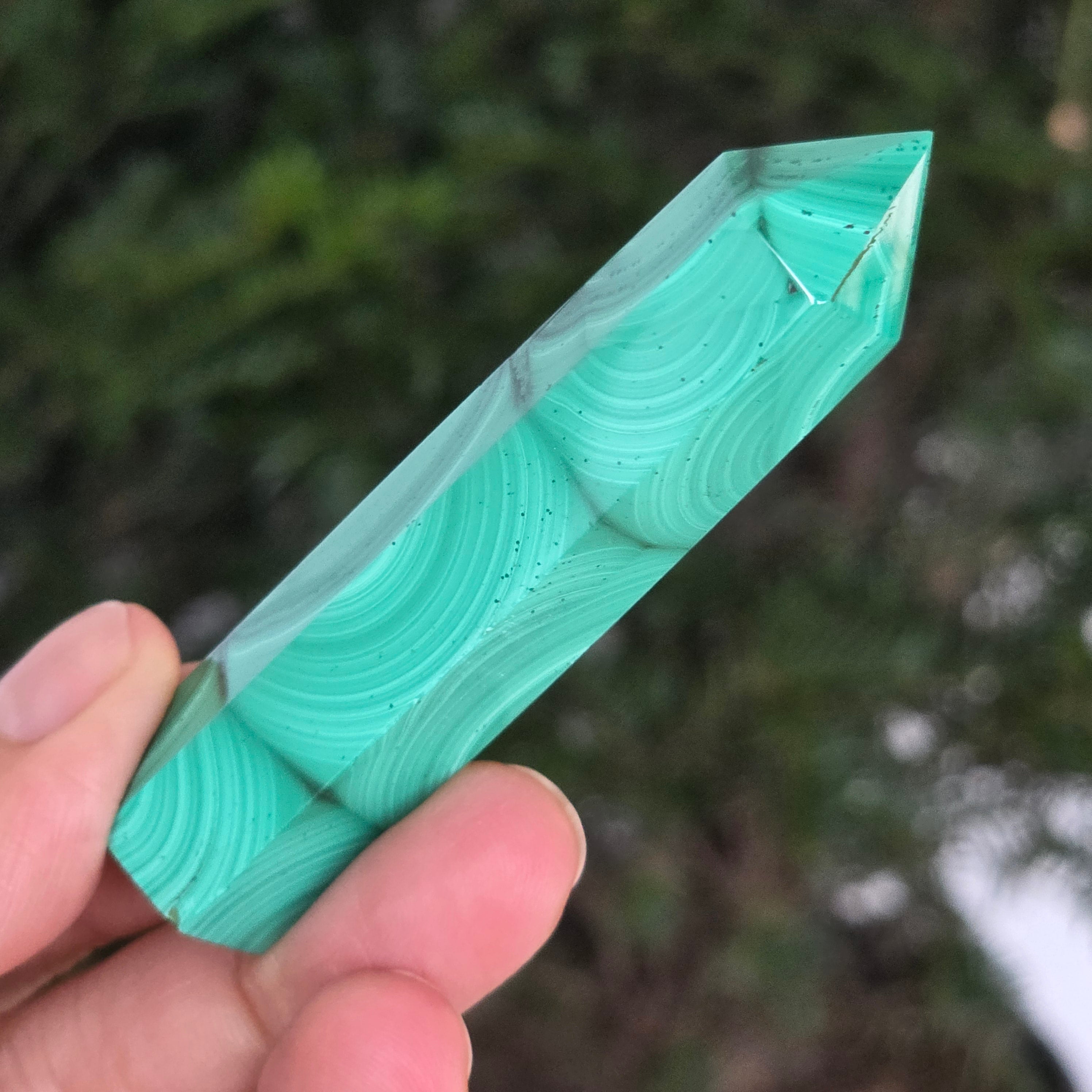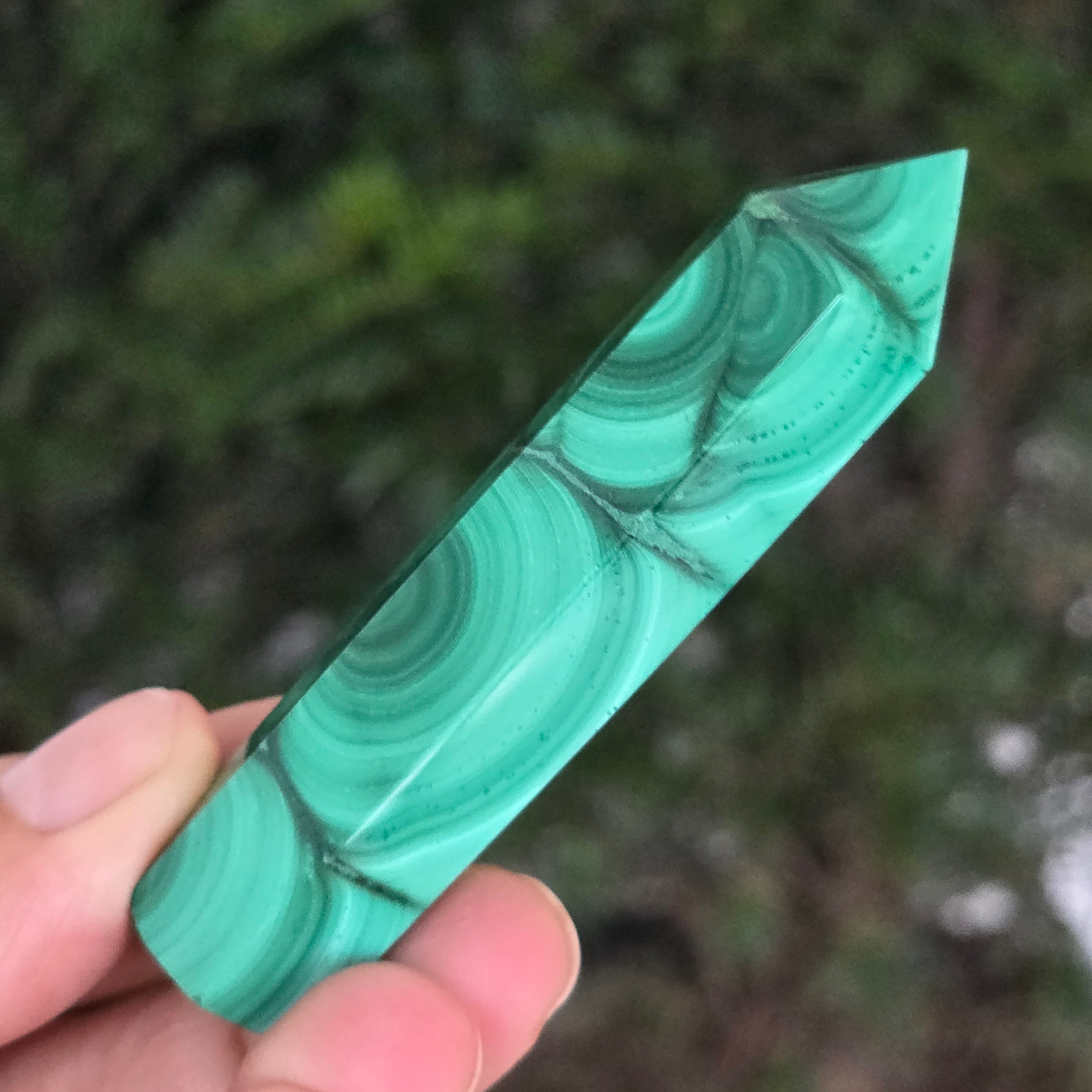 Egy obeliszk, amely úgy tűnik, mintha a bolygó zöld mélységeiből éledt volna. Ez az egzkluzív, természetes malachit darablenyűgöző smaragdzöld, sötétzöld és selymes jáde árnyalatokat tár fel, egyedi koncentrikus mintázatban elrendezve, mintha a belső energiák térképei lennének. Kézzel csiszolva finom fényig, az obeliszk mély ásványi eleganciát sugároz.