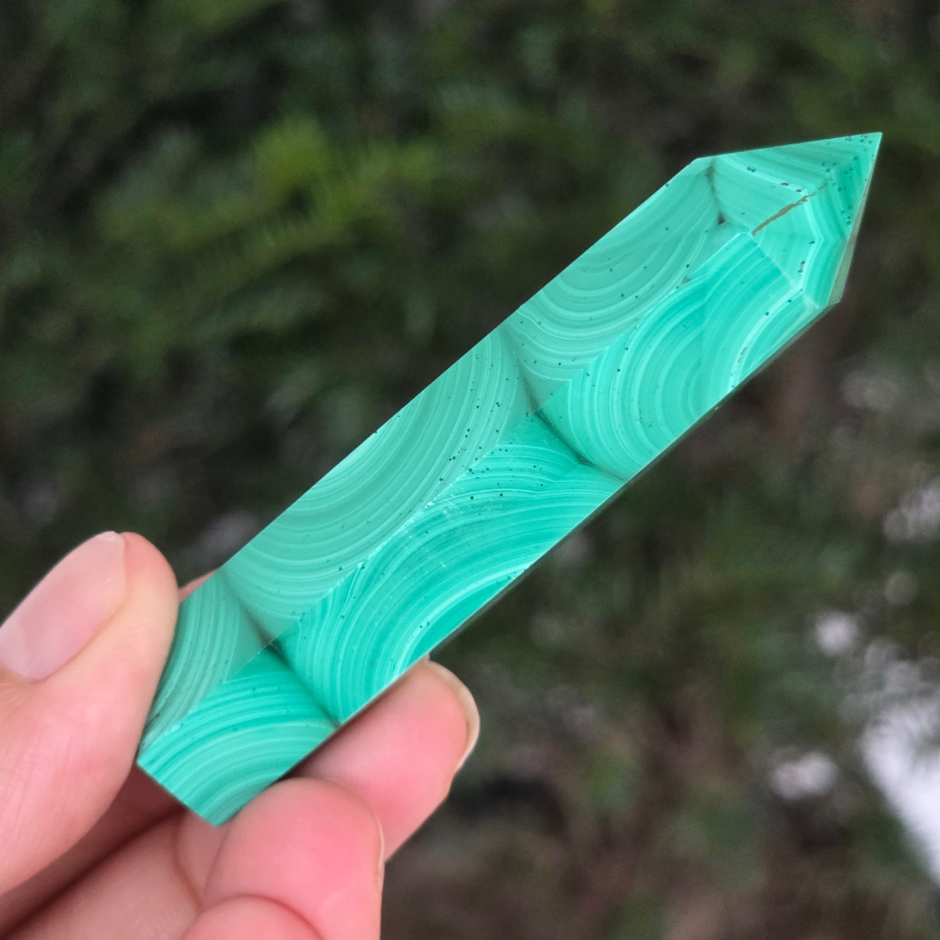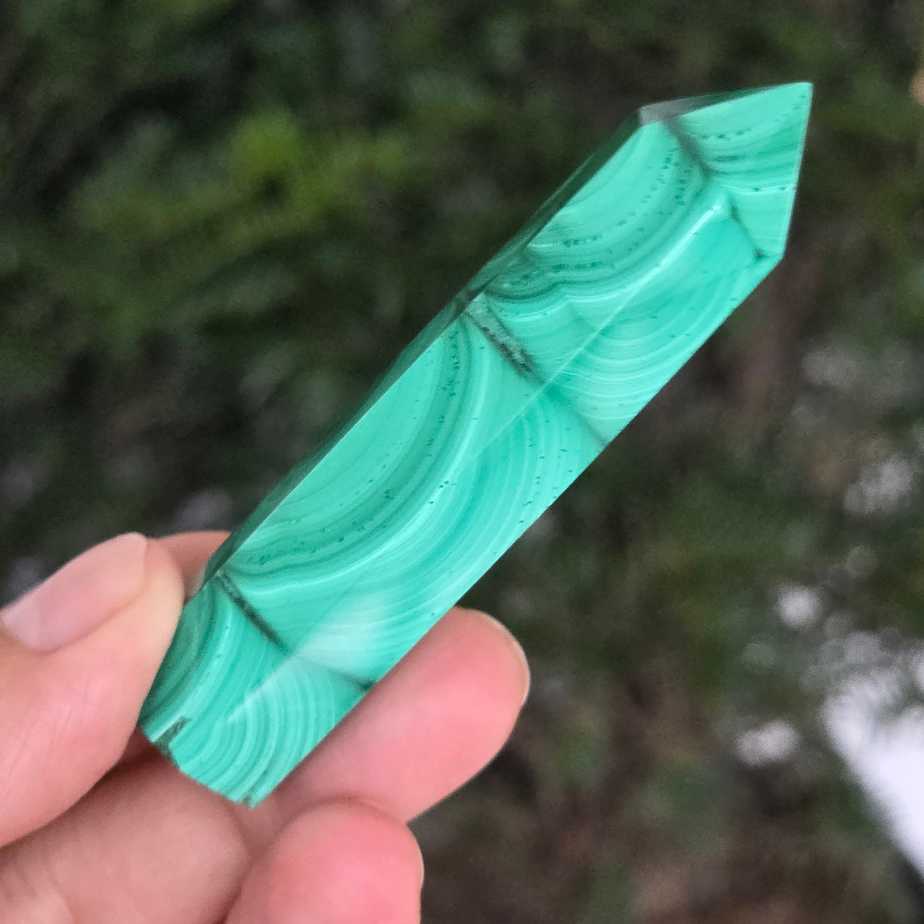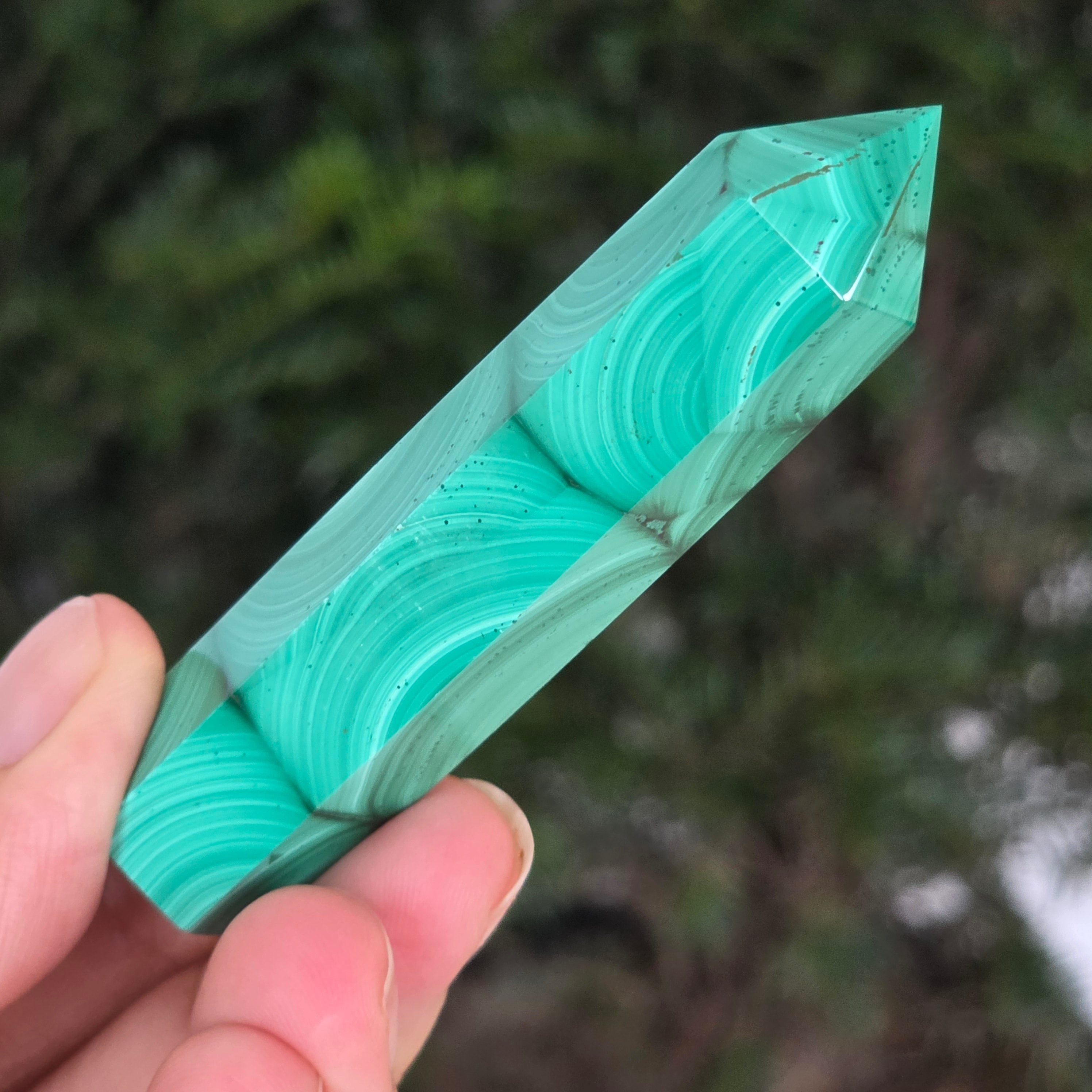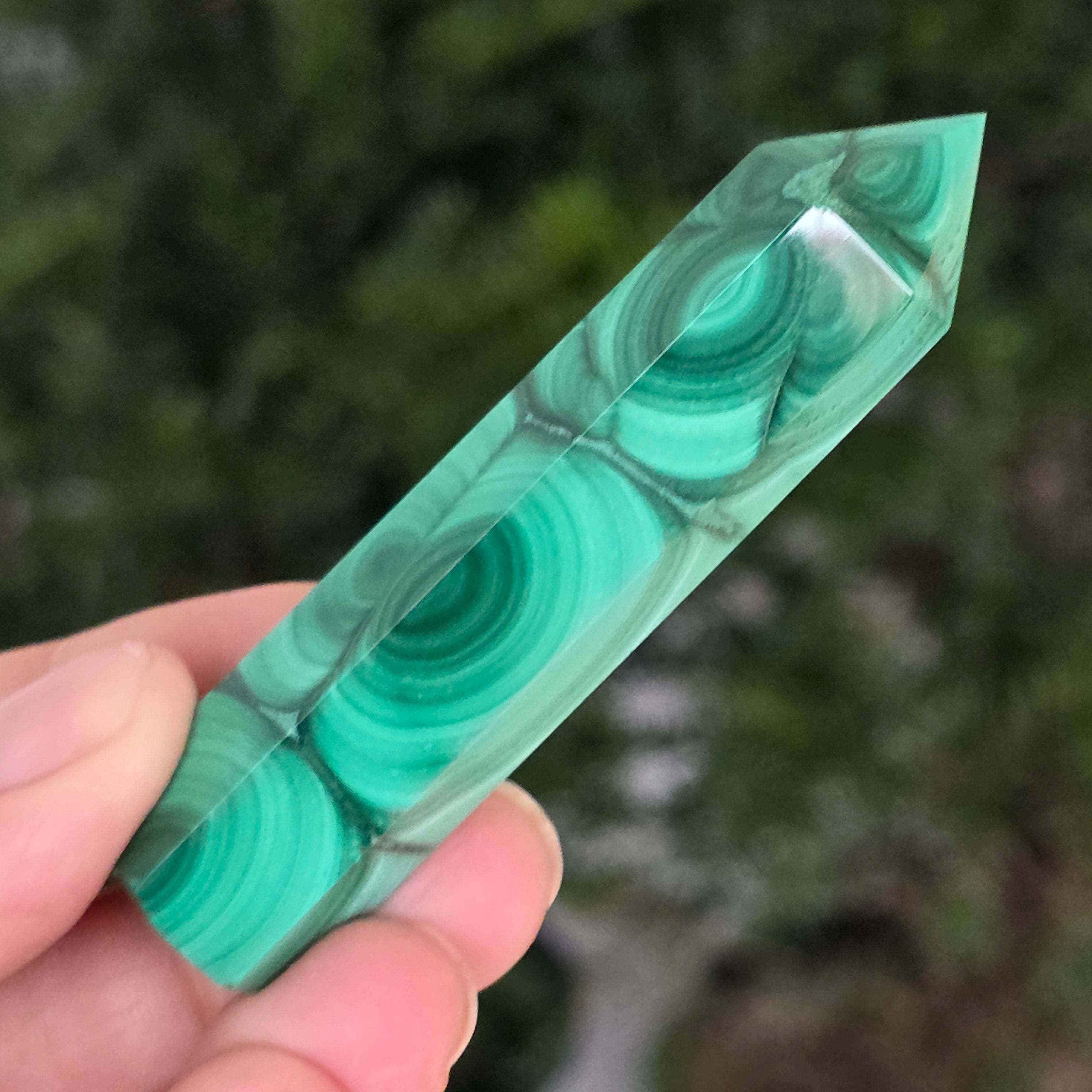 Egy obeliszk, amely úgy tűnik, mintha a bolygó zöld mélységeiből éledt volna. Ez az egzkluzív, természetes malachit darablenyűgöző smaragdzöld, sötétzöld és selymes jáde árnyalatokat tár fel, egyedi koncentrikus mintázatban elrendezve, mintha a belső energiák térképei lennének. Kézzel csiszolva finom fényig, az obeliszk mély ásványi eleganciát sugároz.
