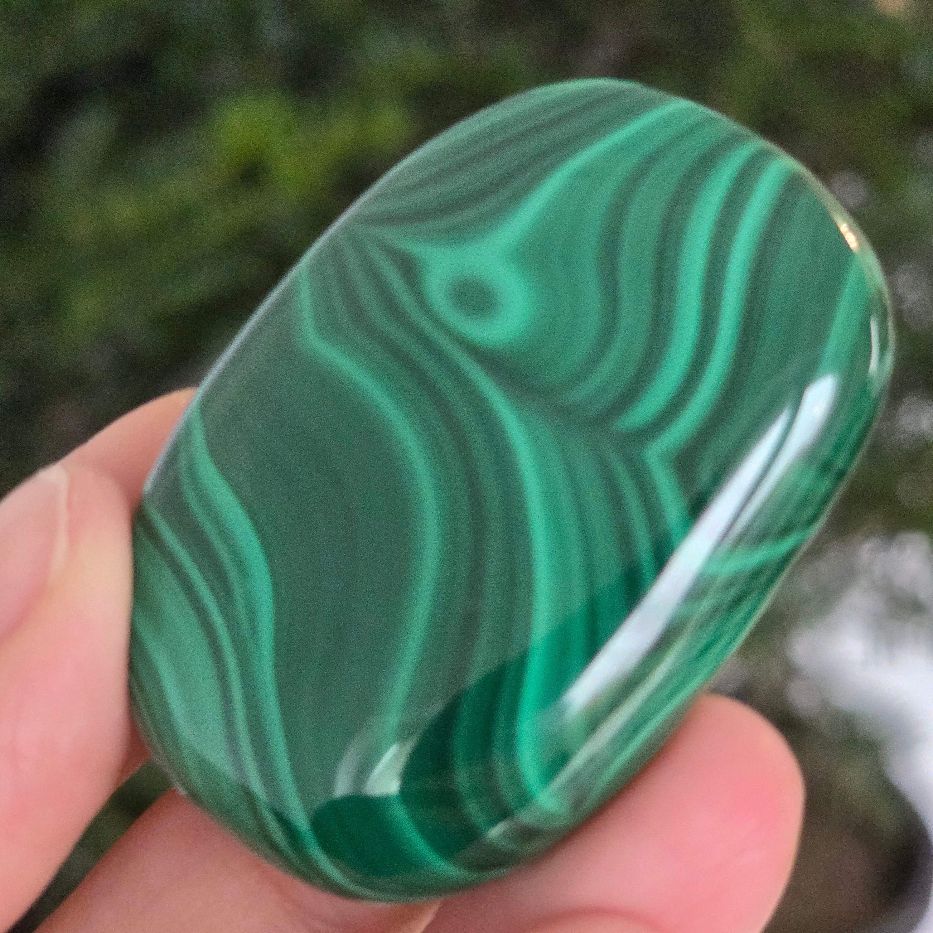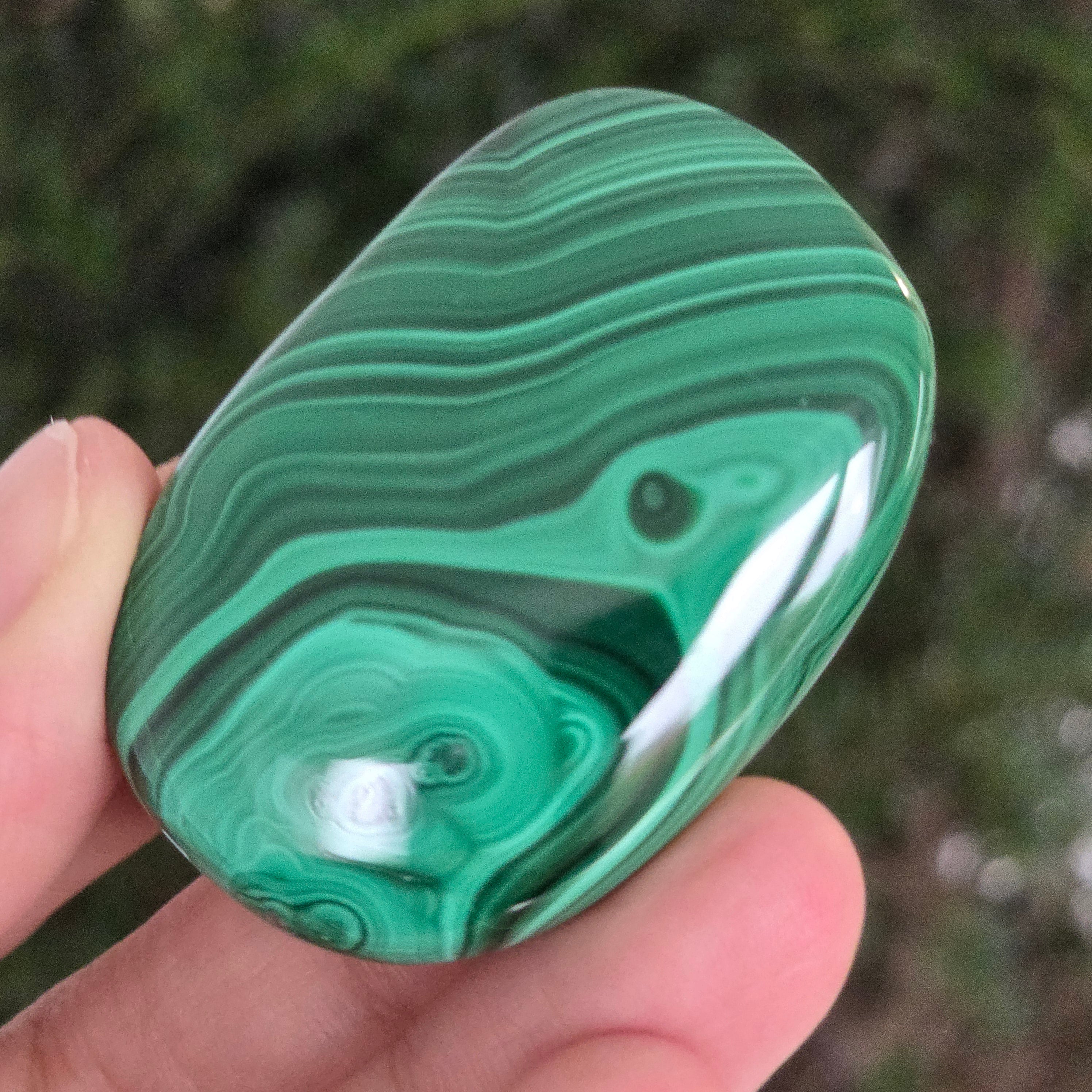 Egy pálmakő, amely mintha az élő Föld energiájával lélegzik. Ez egyedülálló természetes malachit darab, mélyzöld és smaragd hipnotikus hullámait tárja fel, amelyeket koncentrikus gyűrűk és sávok kereszteznek, amelyeket úgy tűnik, maga a természet faragott. A sima, tökéletesen csiszolt textúra a kő kényelmesen ül a tenyérben, meleg és védelmező hangulatot kölcsönözve.