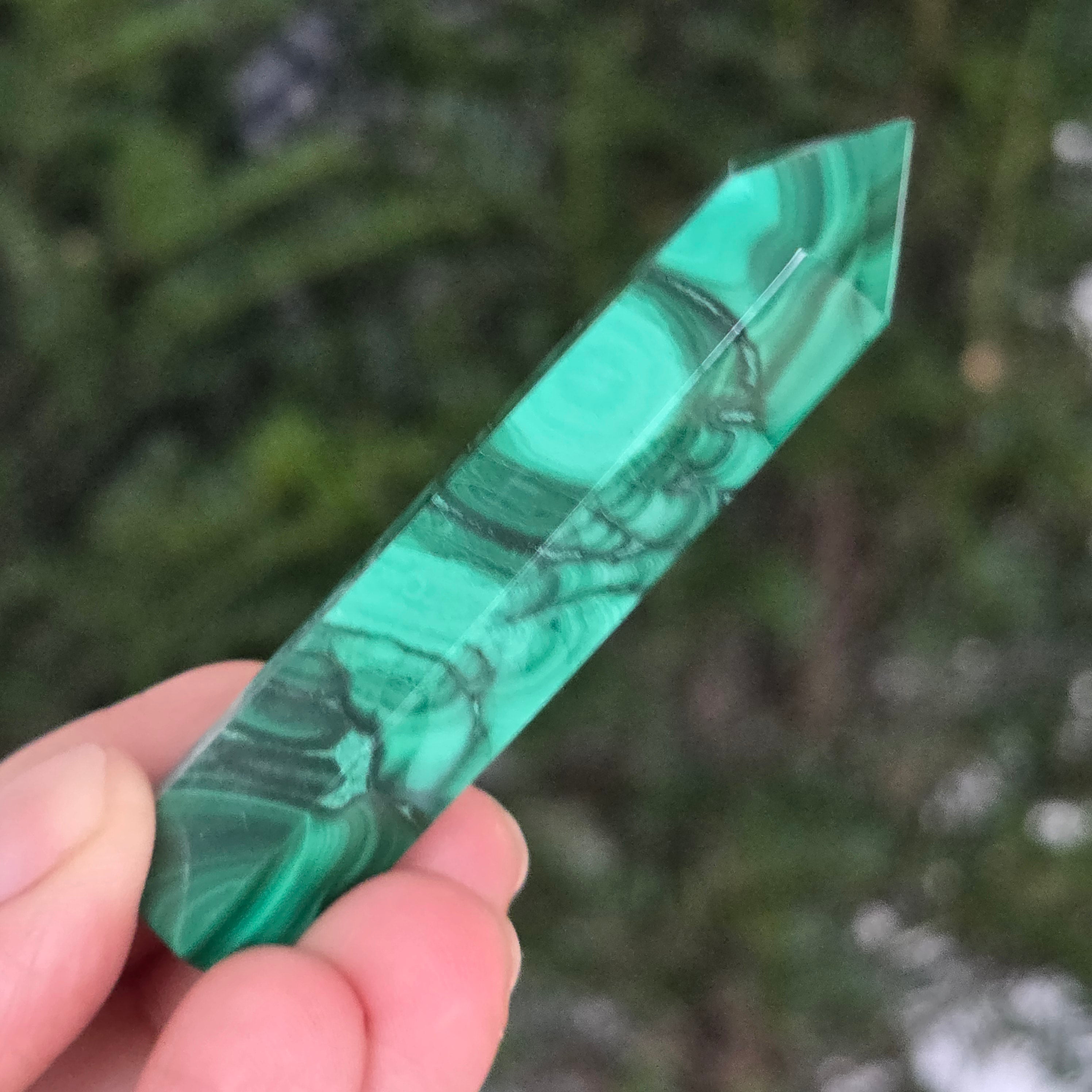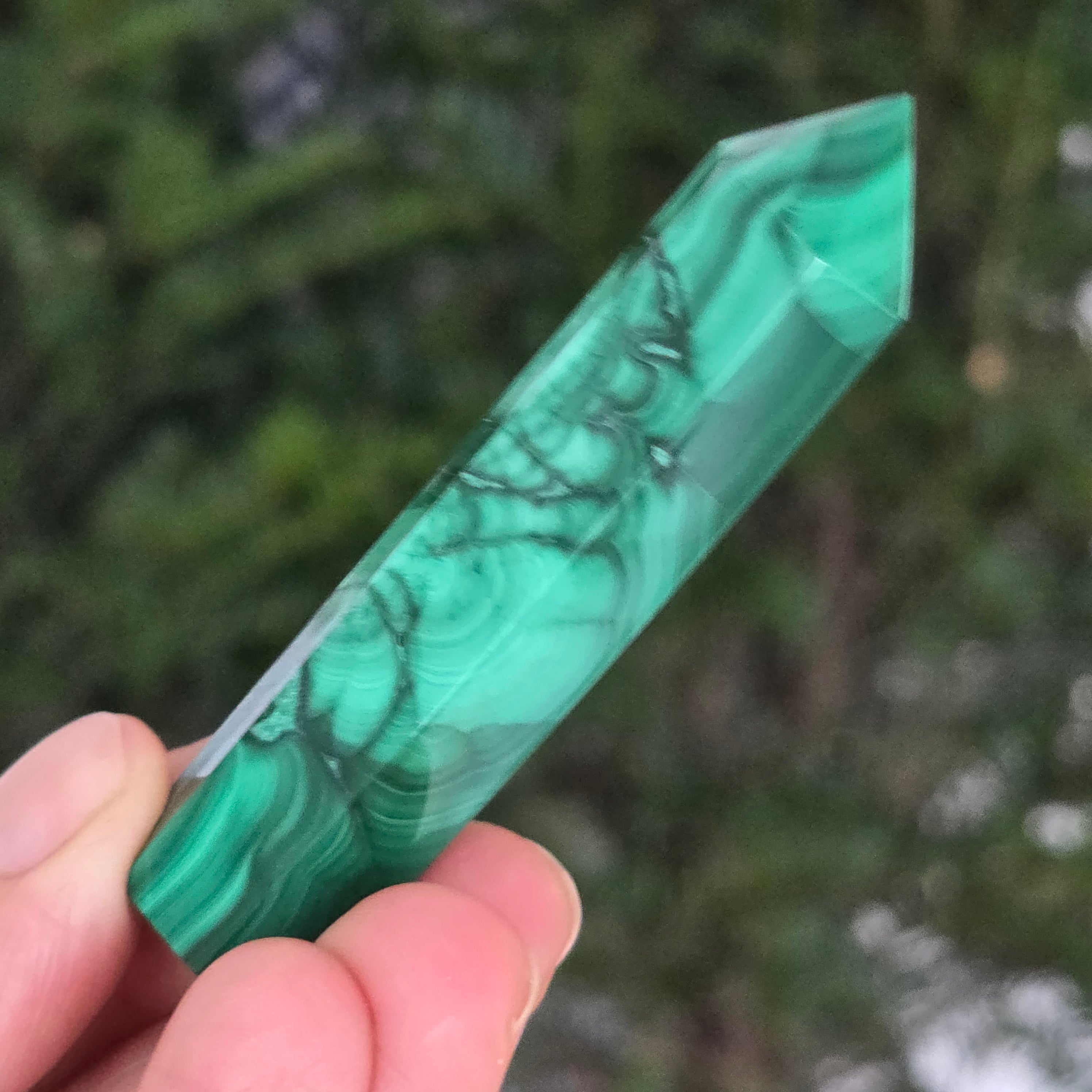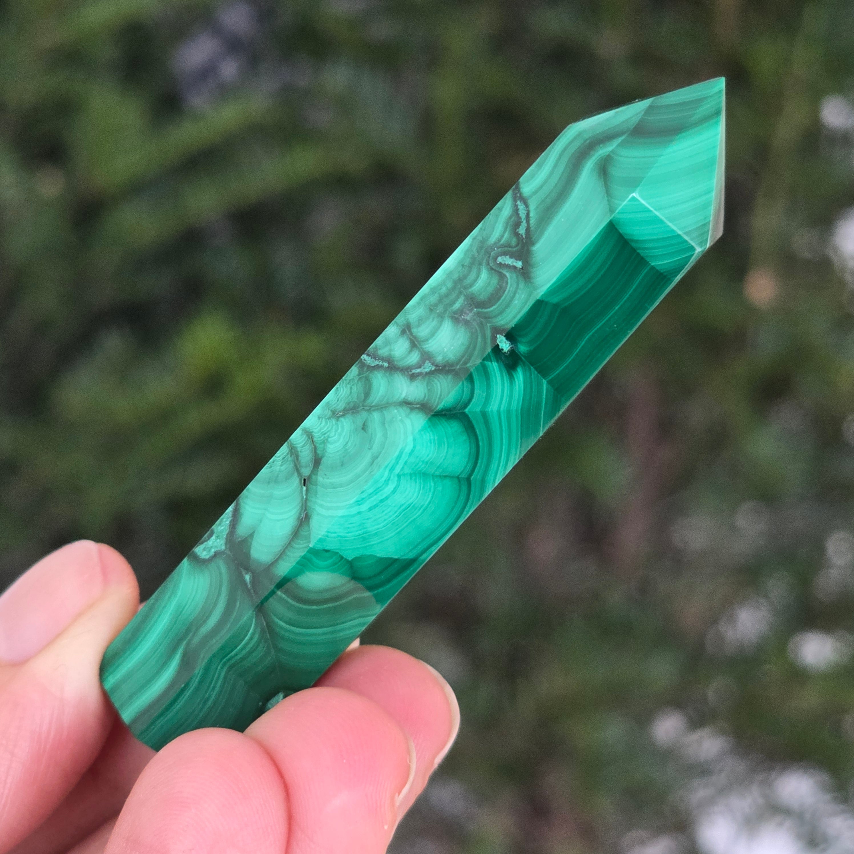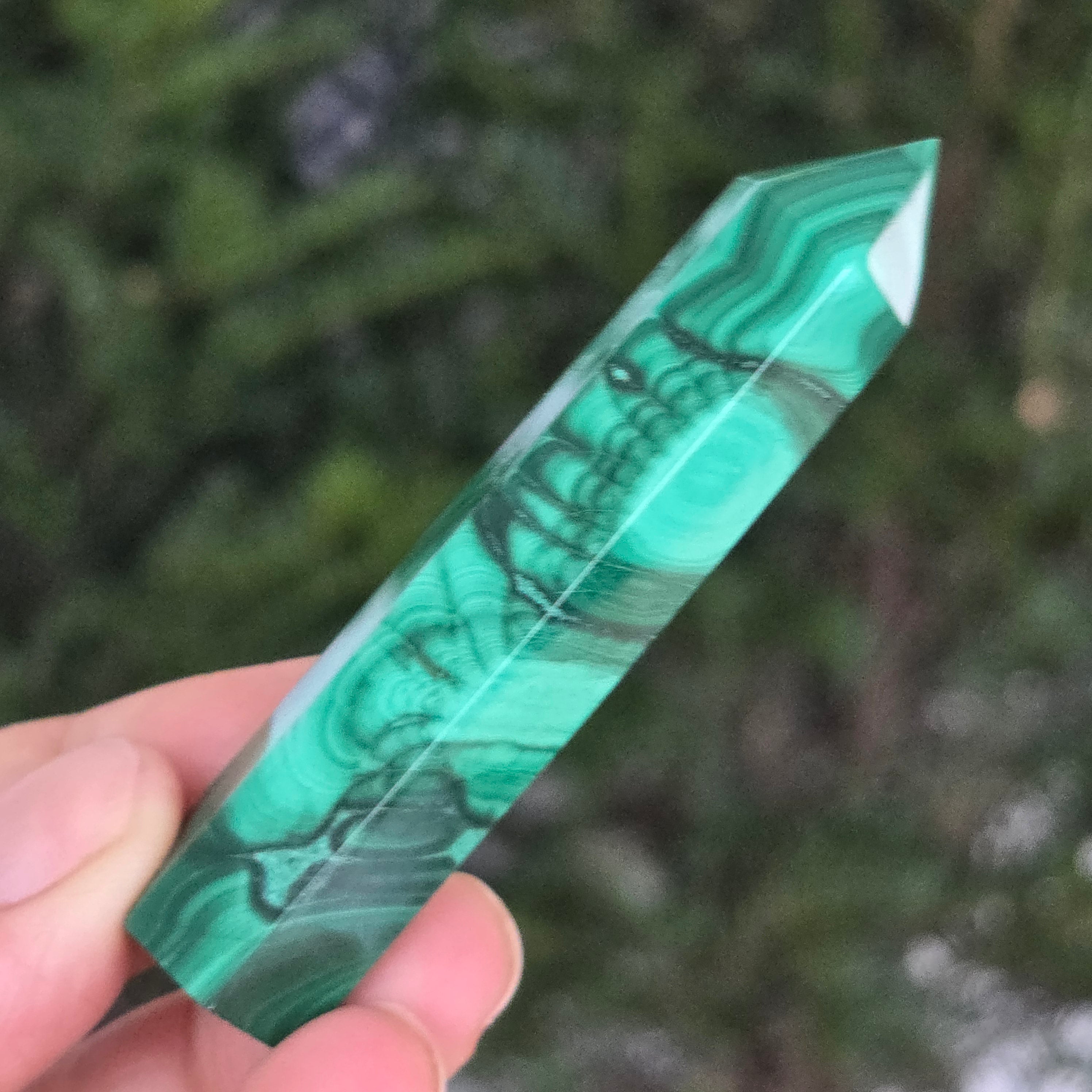 Egy obeliszk, amely mintha életre kelt volna bolygónk zöld mélységeiből. Ez az egyedülálló darab természetes malachitbóllenyűgöző smaragdzöld, sötétzöld és selymes jáde árnyalatokat tár fel, melyek egyedi koncentrikus mintákban rendeződnek, mintha belső energiák térképei lennének. Kézzel polírozva bársonyos fényűre, az obeliszk mély ásványi eleganciát sugároz.