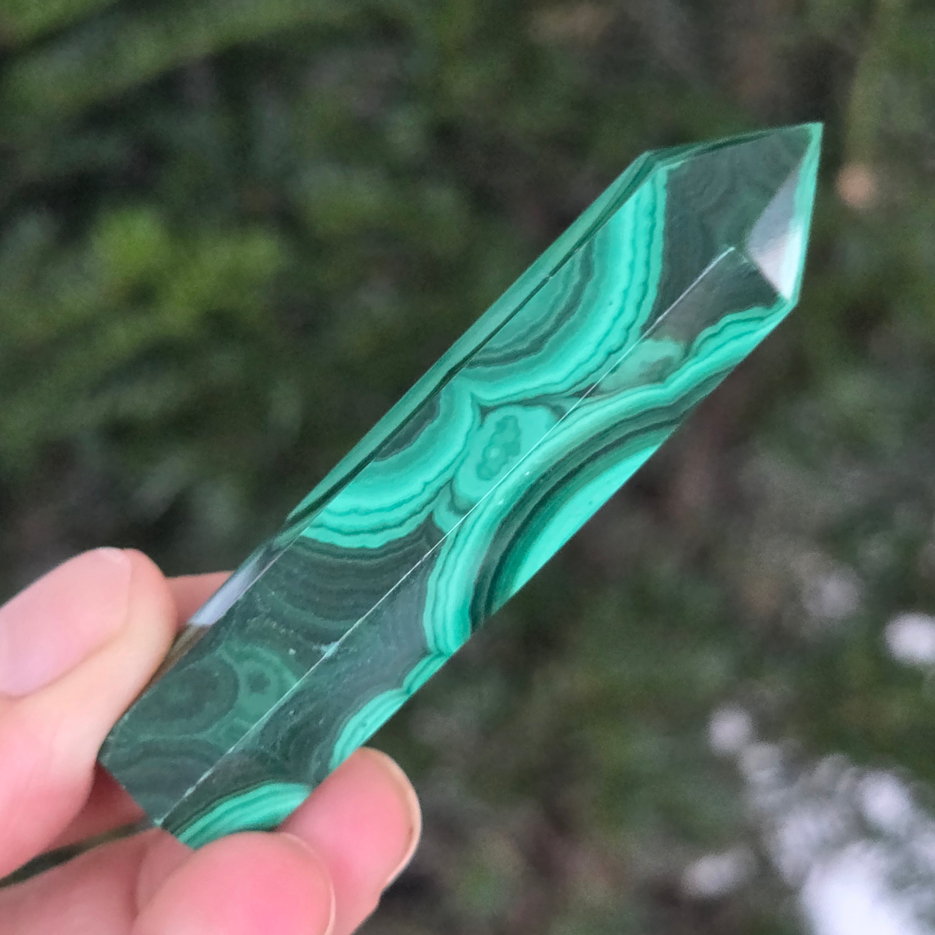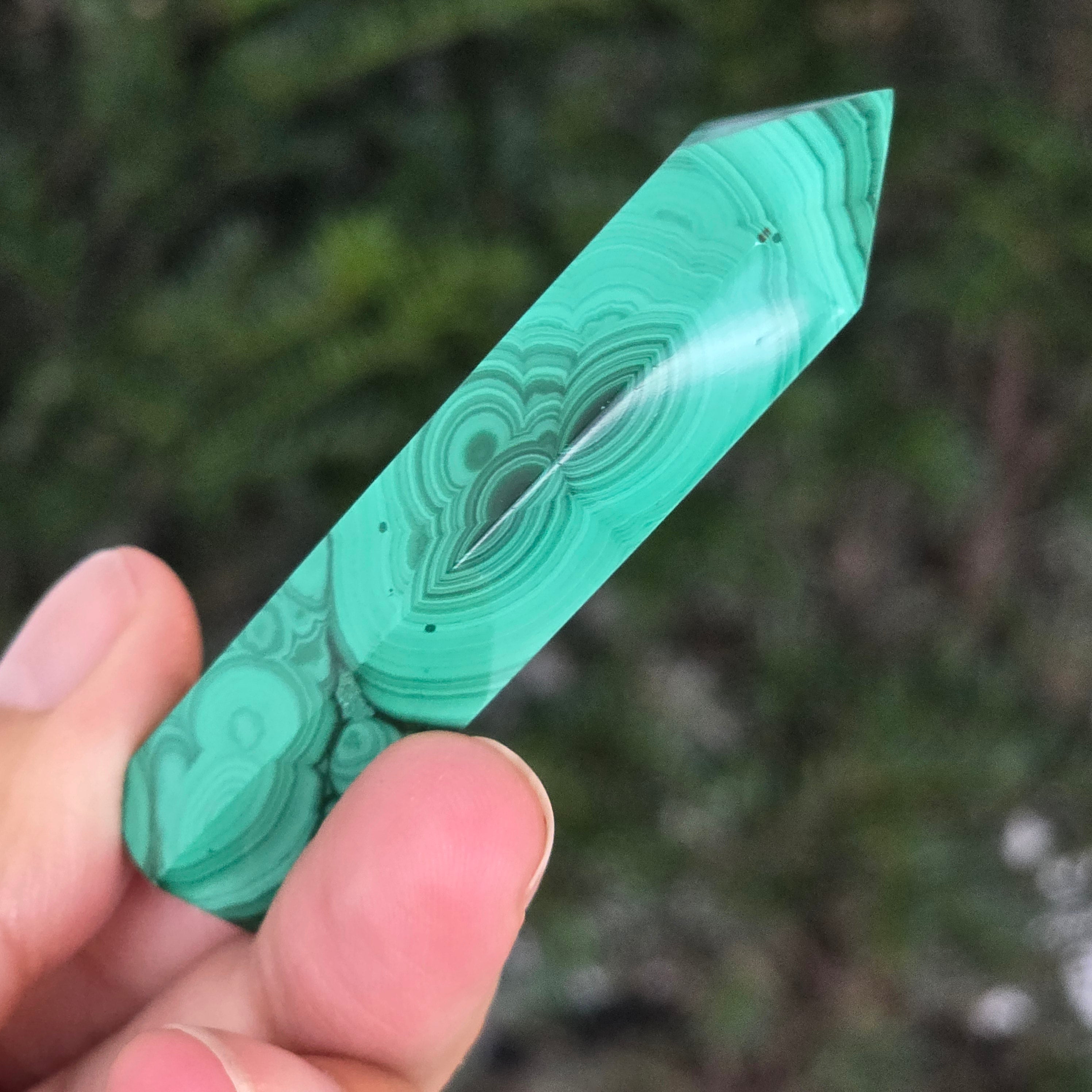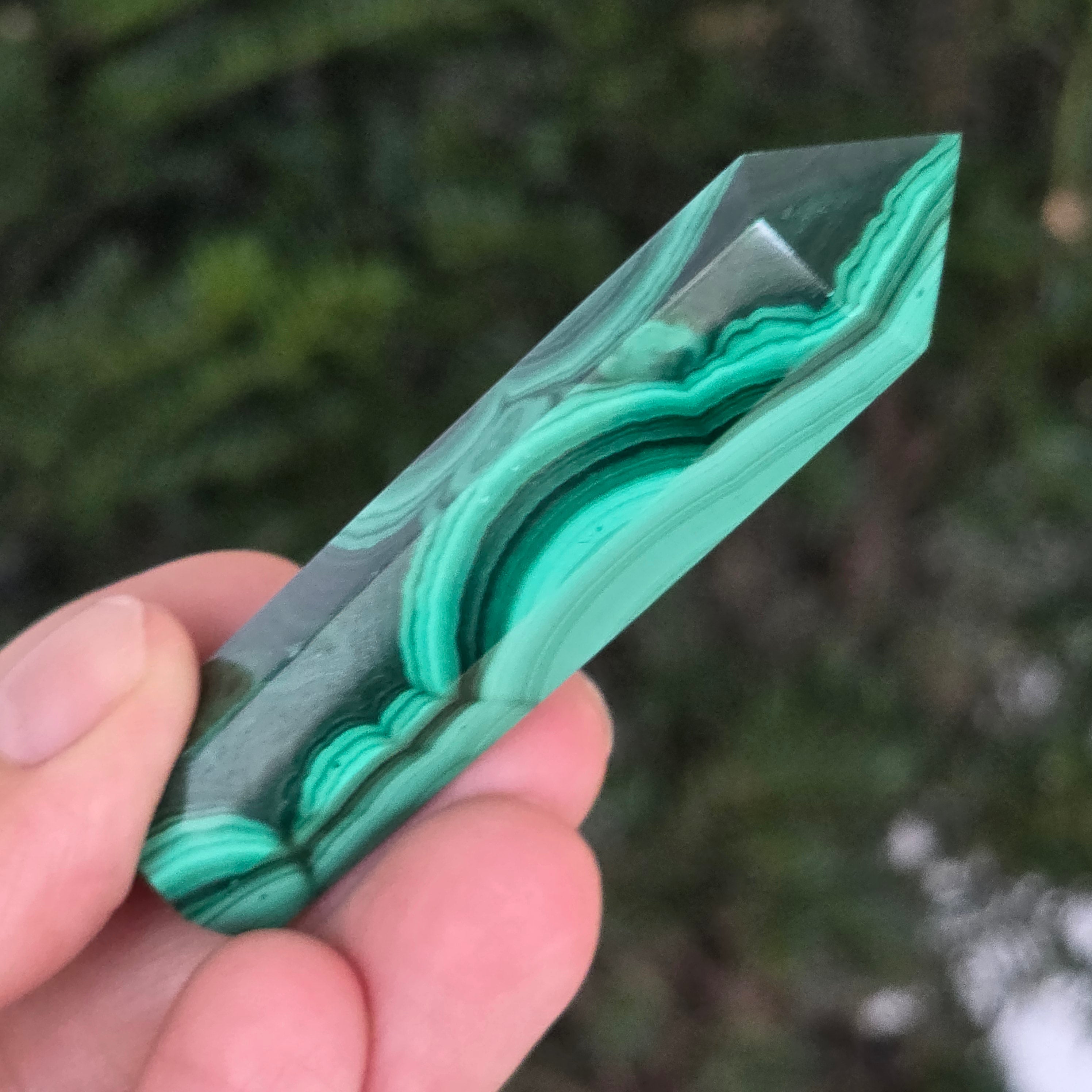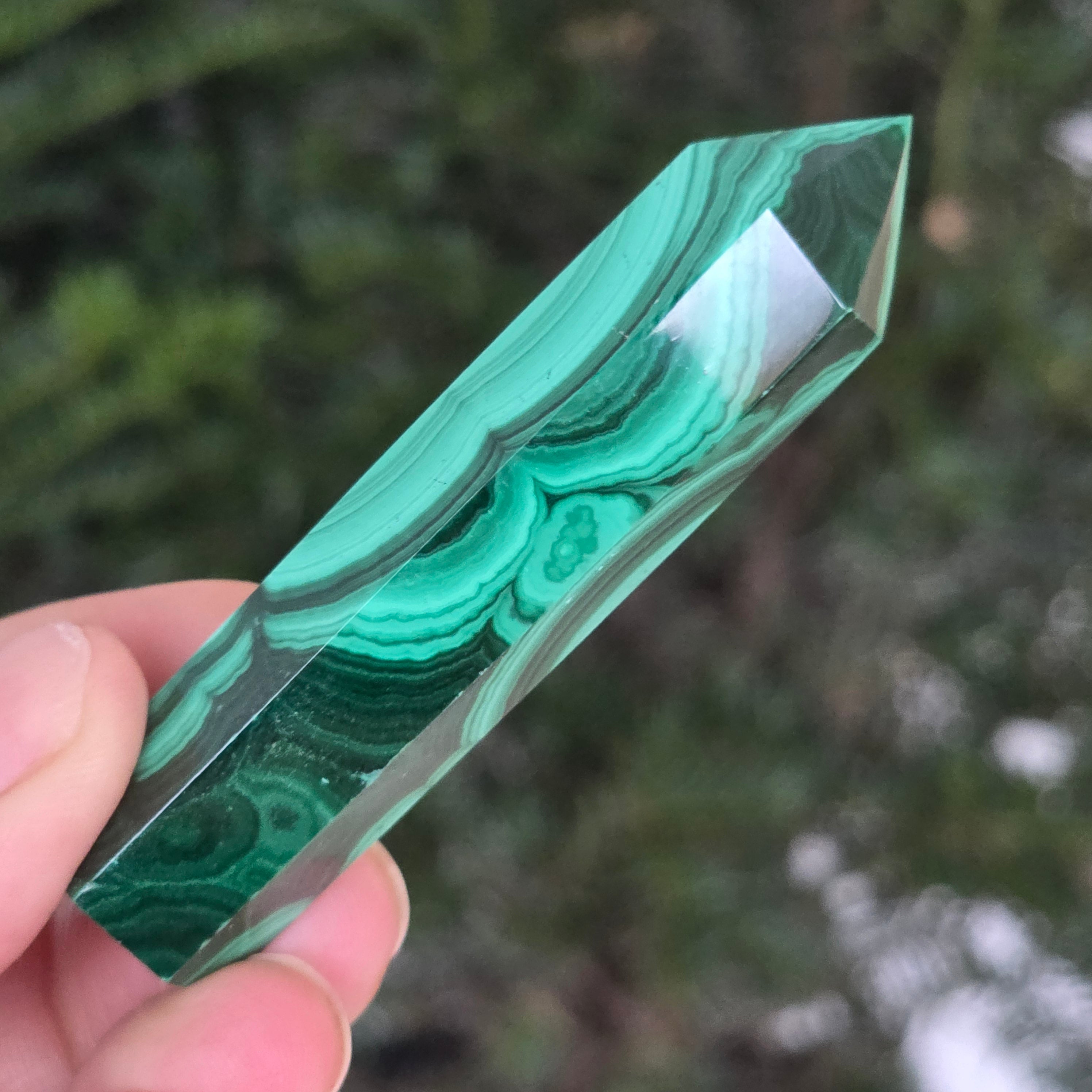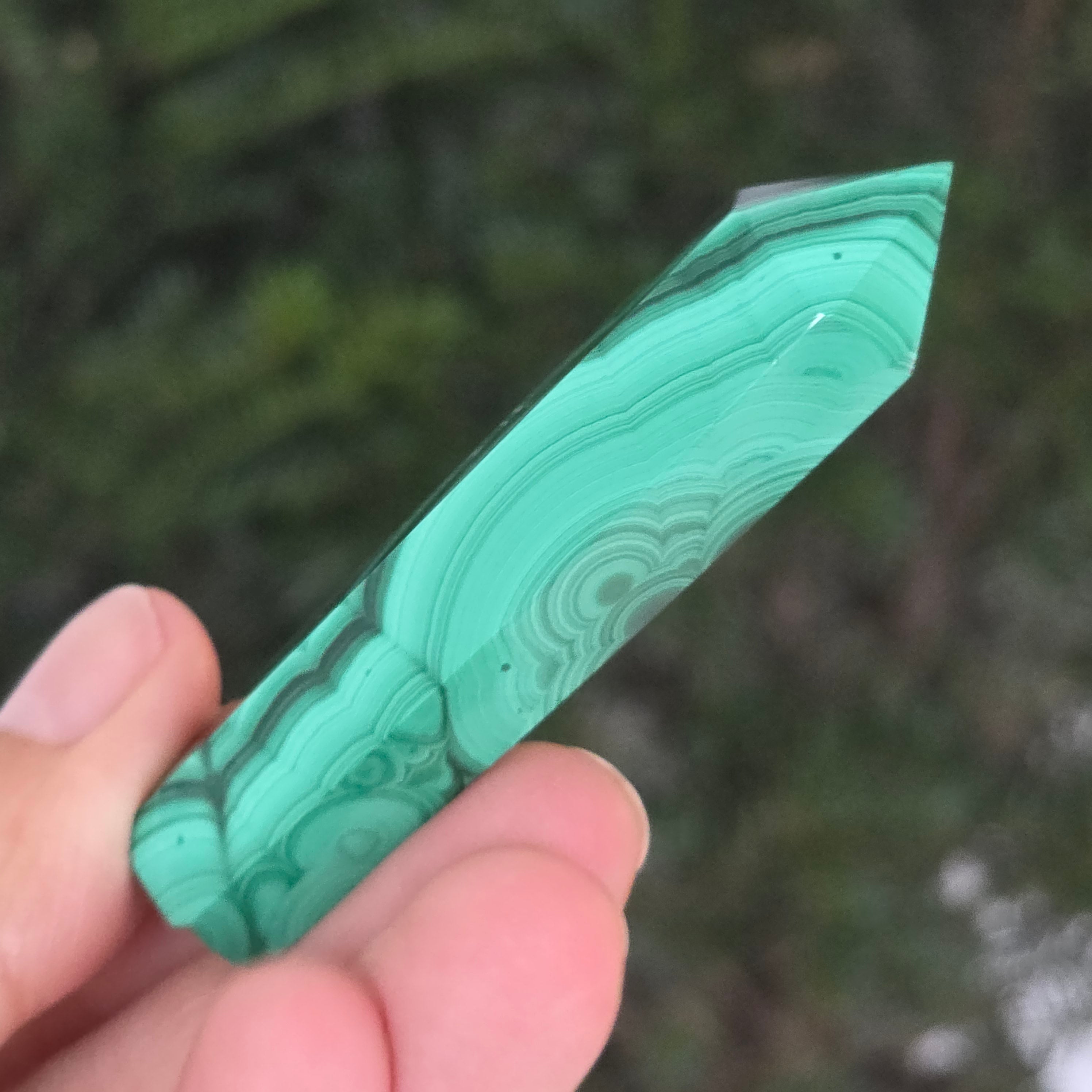 Olyan obeliszk, amely mintha életre kelt volna a bolygó zöld mélységeiből. Ez az egyedülálló darab természetes malachitbólelbűvölő smaragd zöld, sötétzöld és selymes jáde árnyalatokat tár fel, amelyek egyedi koncentrikus mintákba rendeződnek, mint a belső energiák térképei. Kézzel polírozva, bársonyos fényűre, az obeliszk mély ásványi eleganciát sugároz.