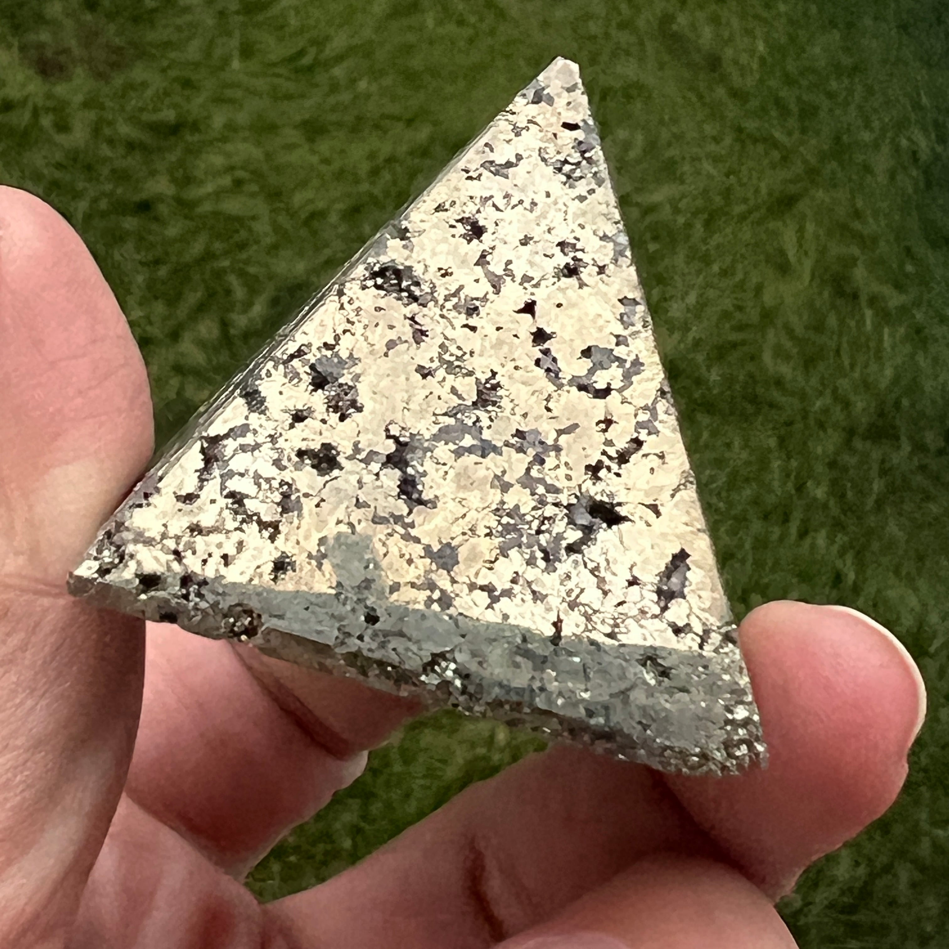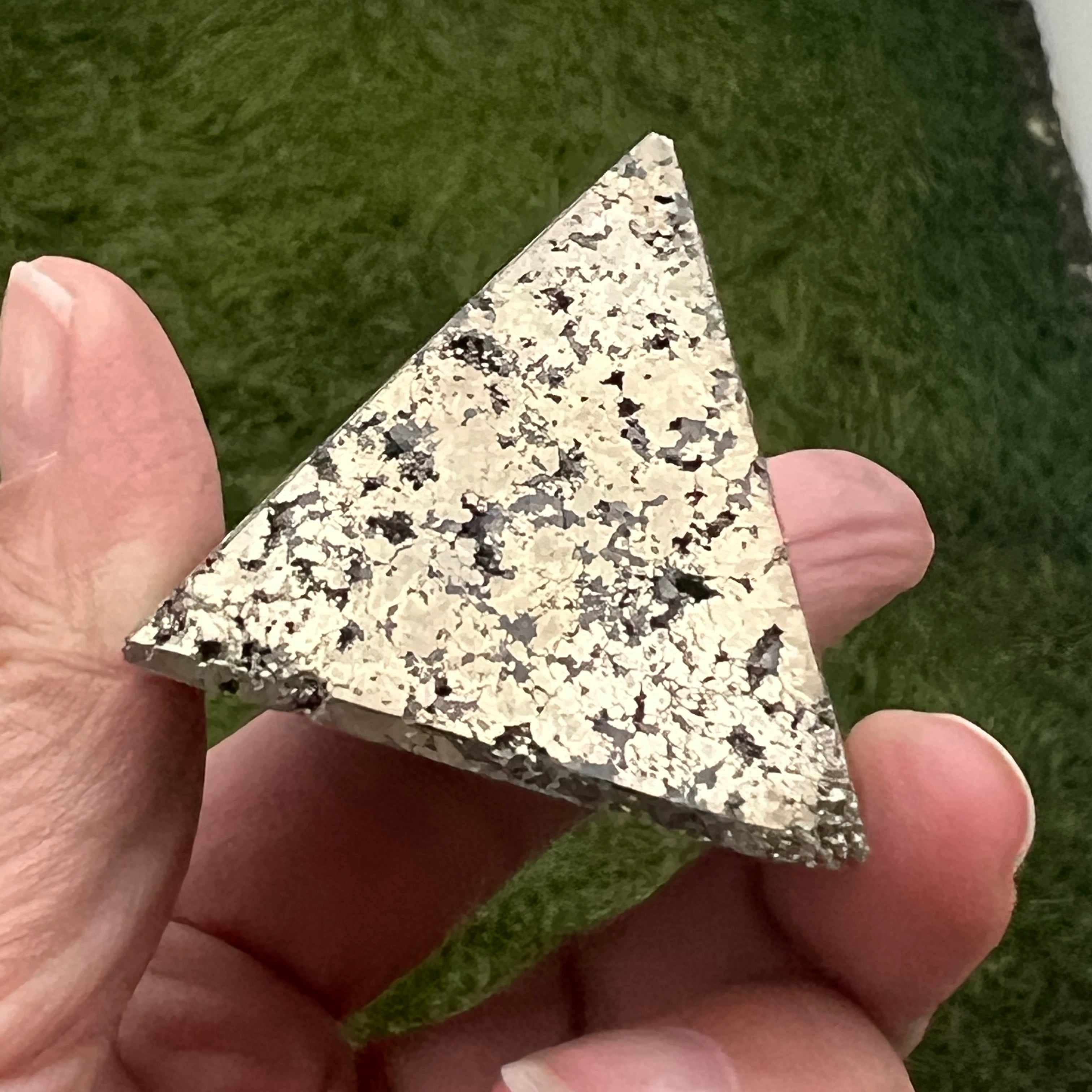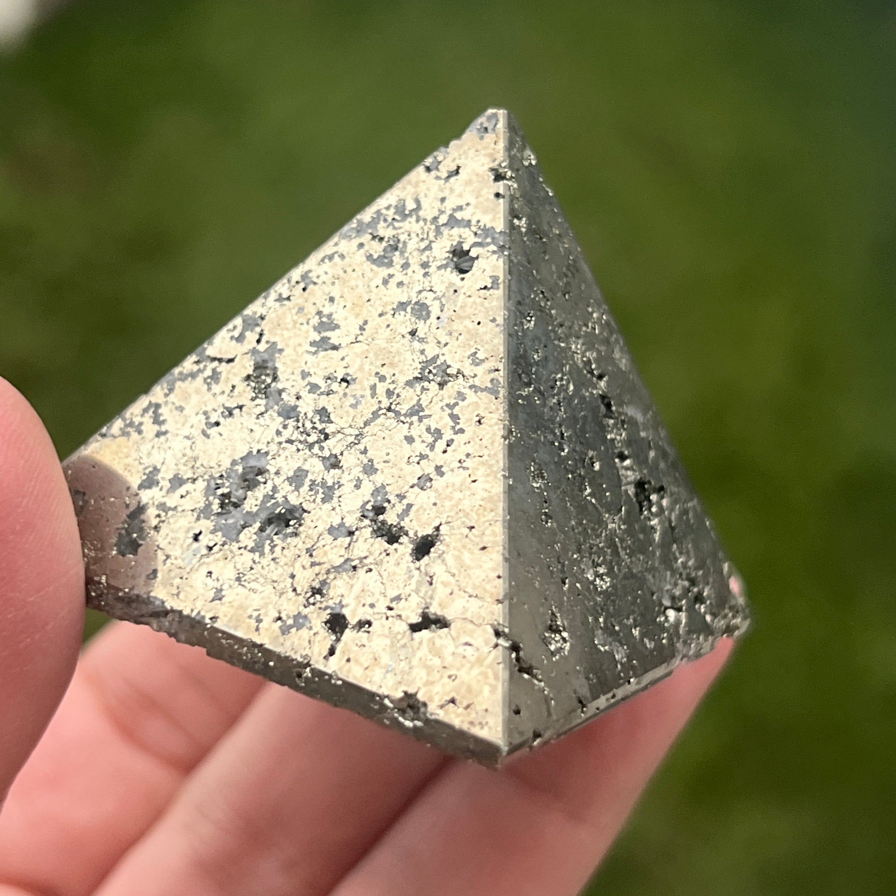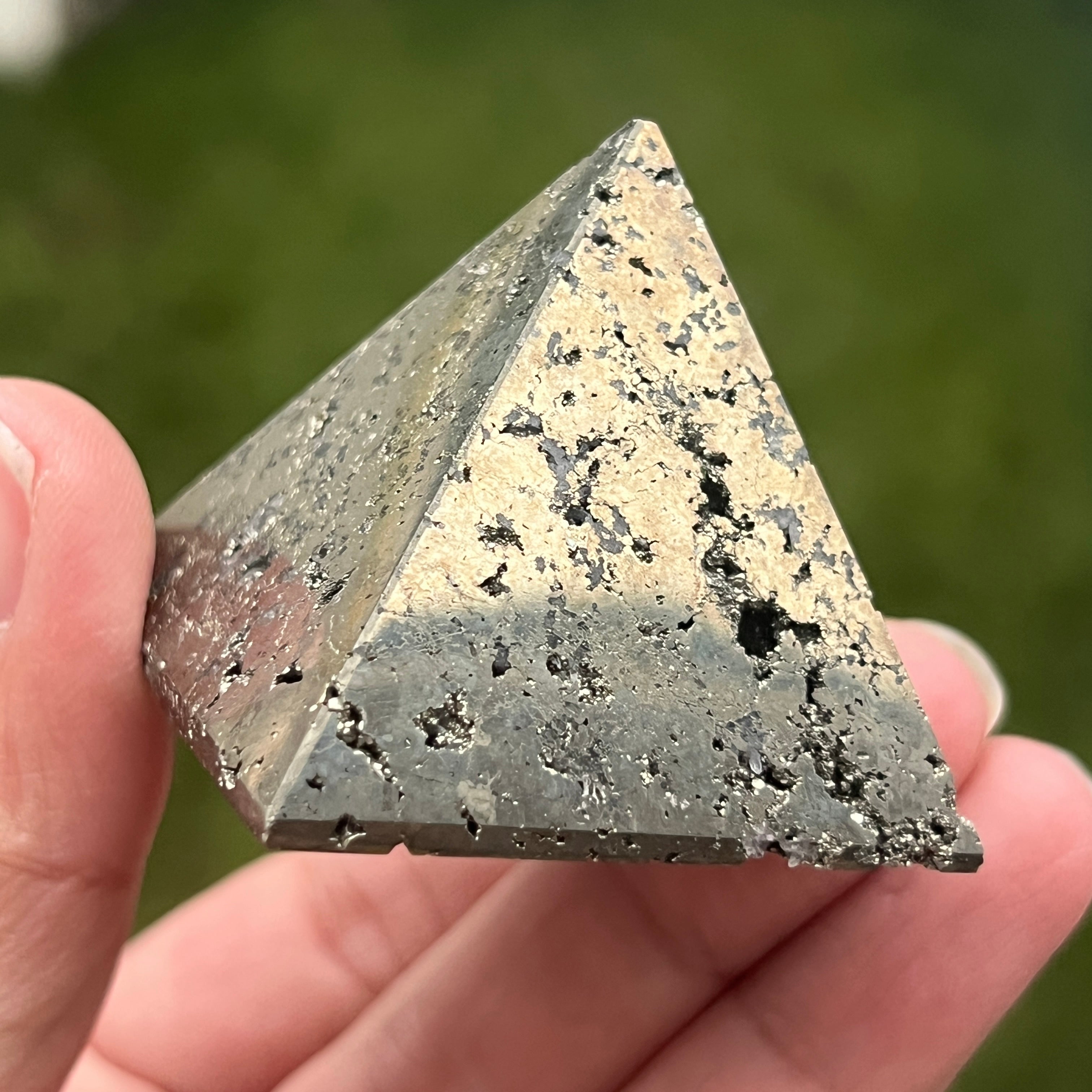 A perui piritból készült piramis erőt, bőséget és szellemi tisztaságot sugároz. Minden arany visszaverődés az éberség fényére és a belső erőre emlékeztet, amely a szándékokat valósággá formálja. Lenyűgöző darab, alkalmas gyűjtők számára, valamint élénk energiájú dekorációs tárgyként.