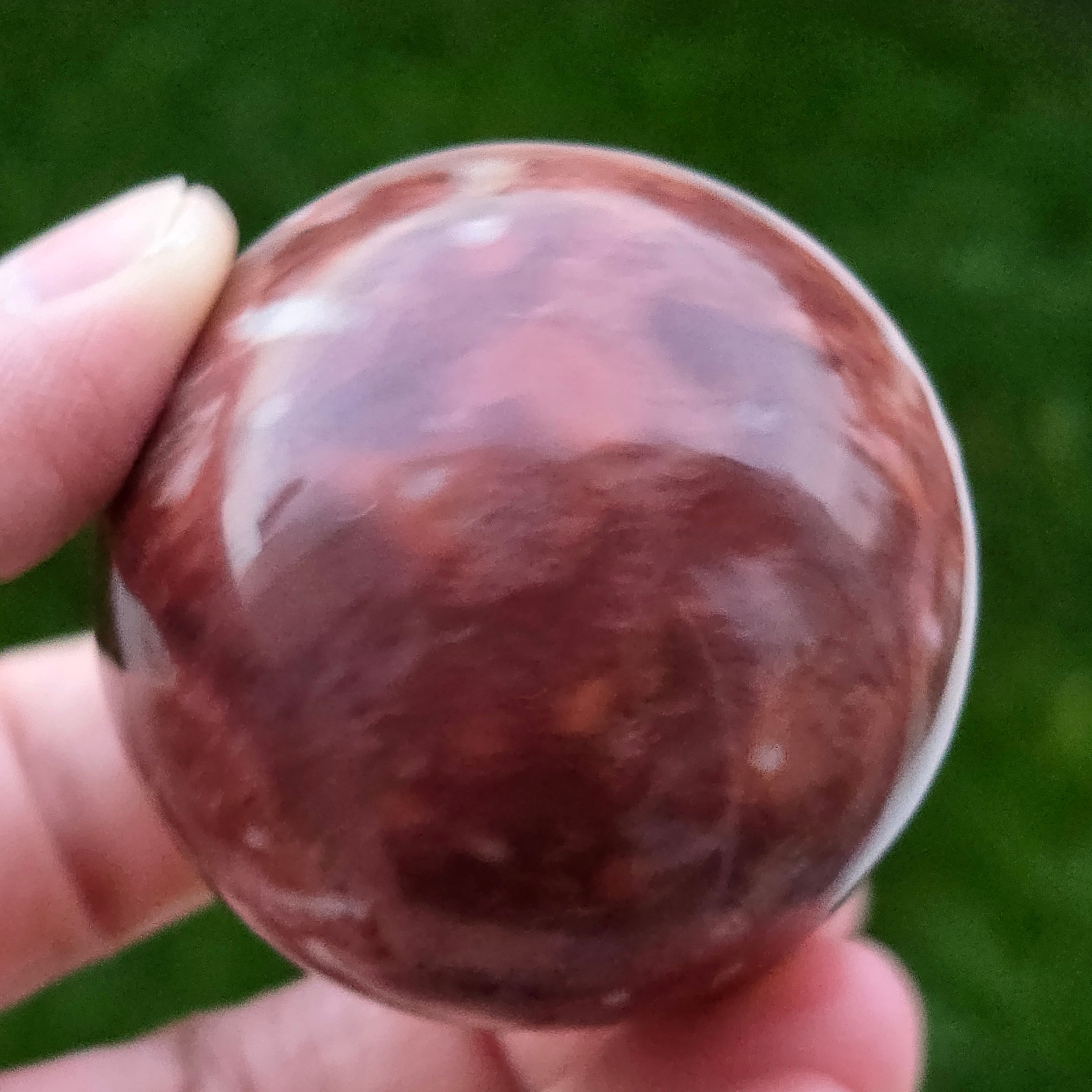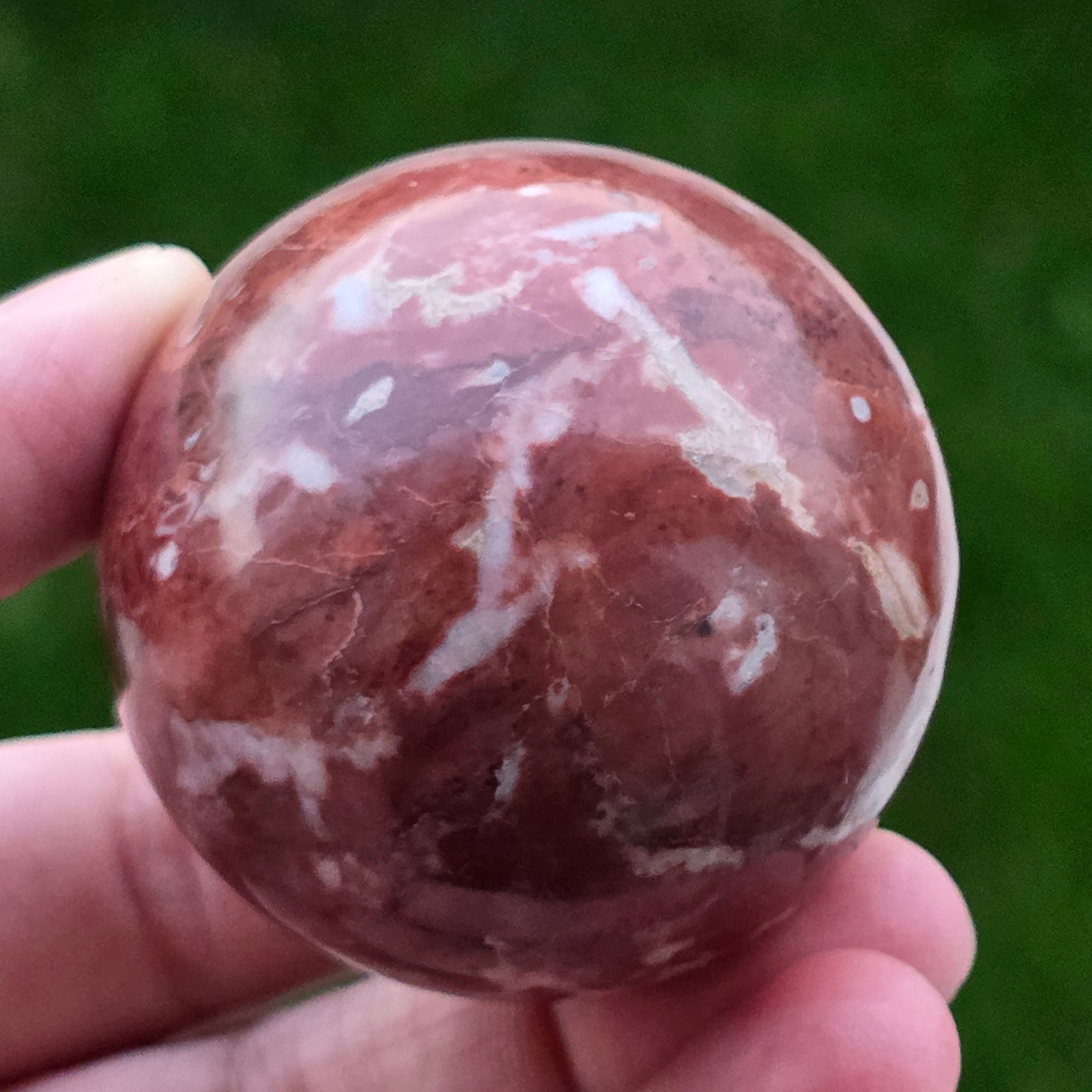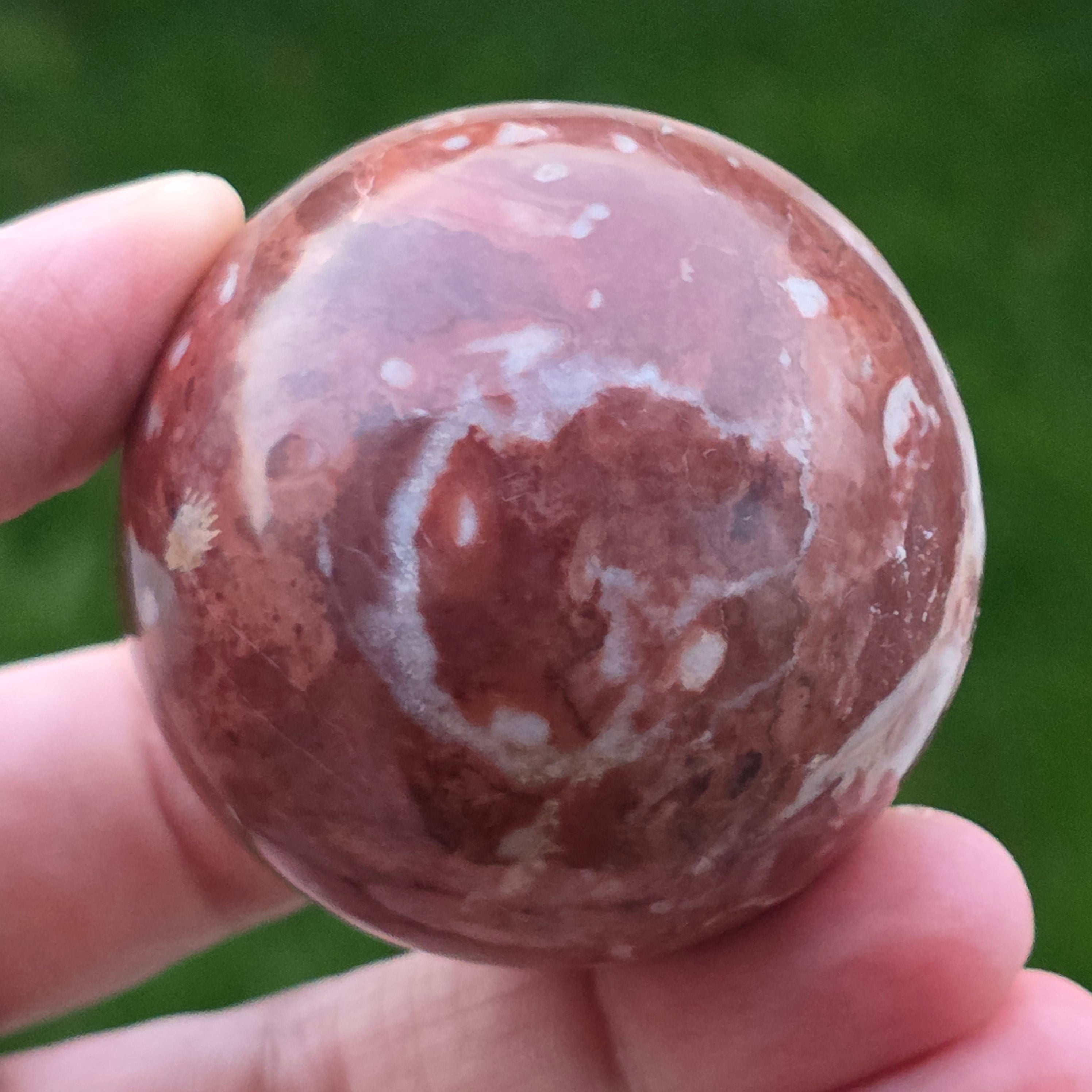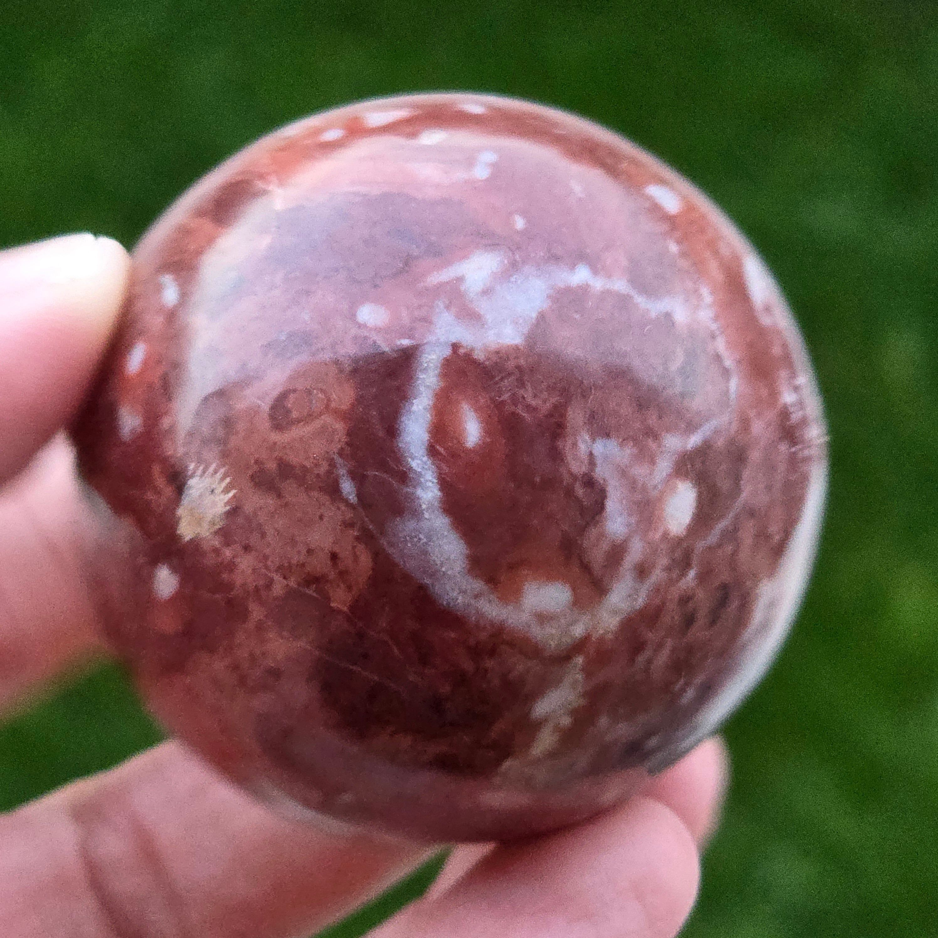 Az Eperjáspis gömb egy élénk és kifejező darab, amelyet gondosan faragtak, hogy kiemelje a meleg eperpiros árnyalatokat, az organikus textúrákat és a jász speciális ásványi mintázatát. Minden darab teljesen egyedi, a természetes mintázatok folyékony formákban fonódnak össze, utalva a kőrétegek rétegződésére és nyers szépségére.