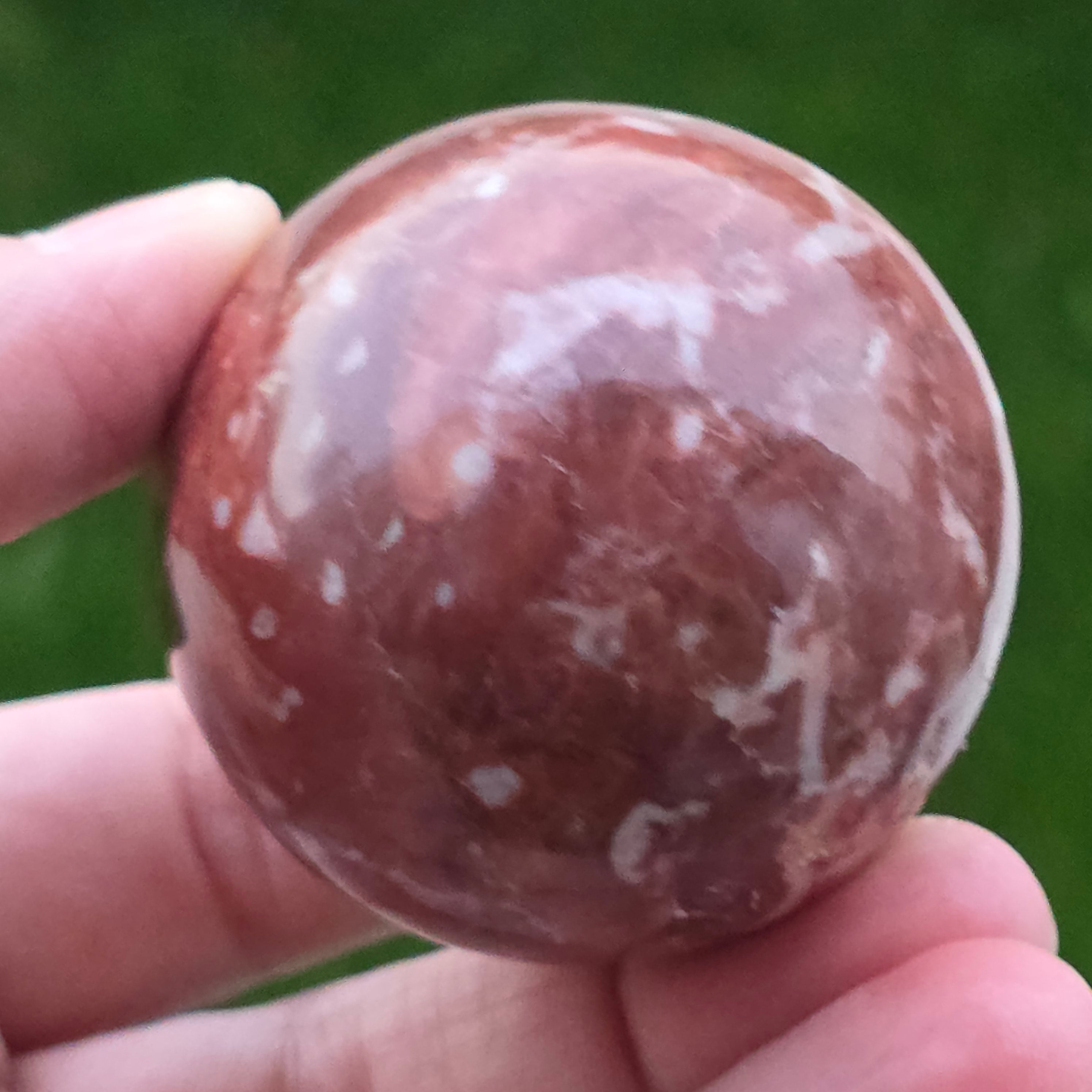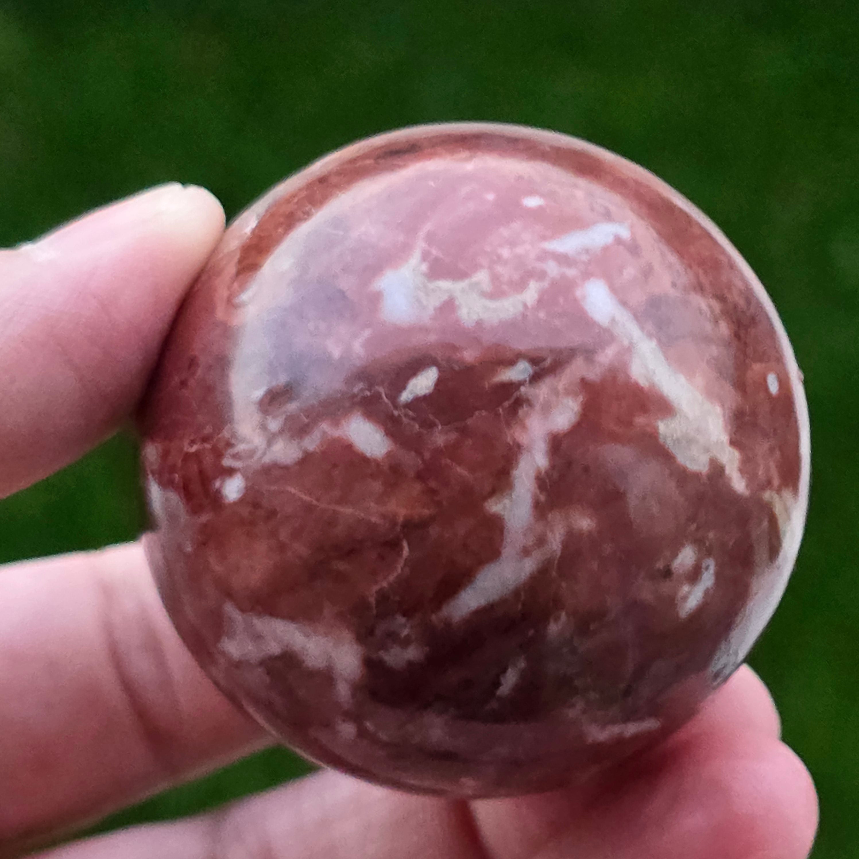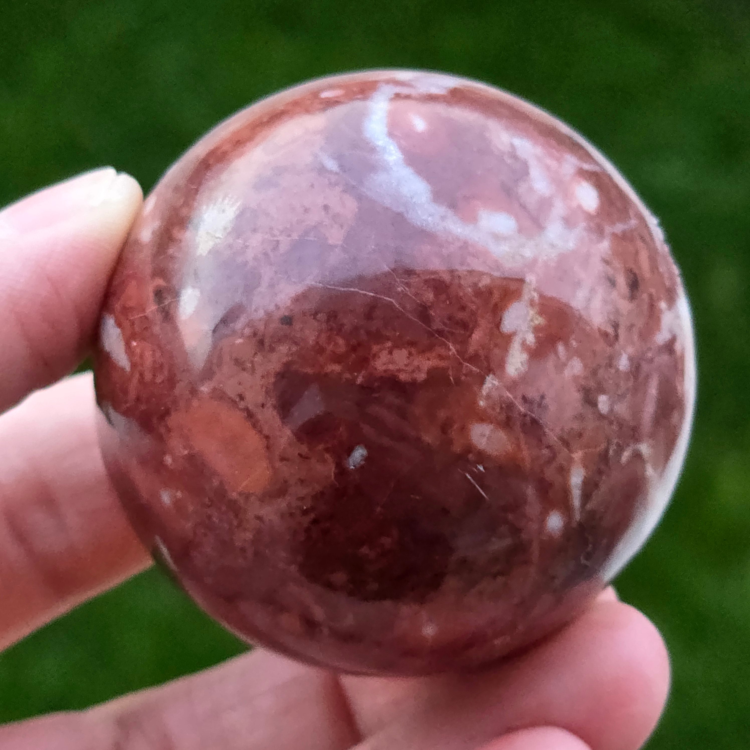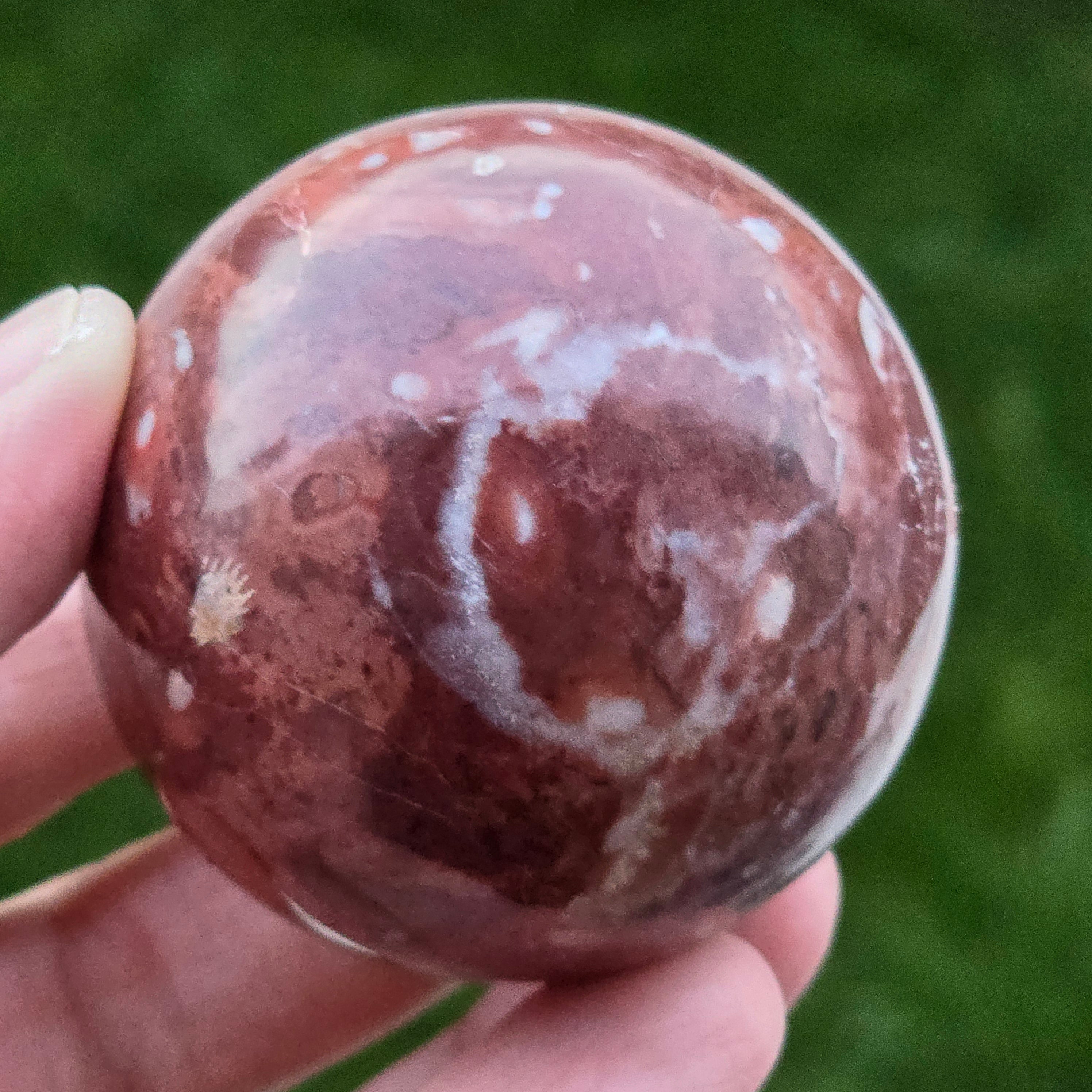 Az Eperjáspis gömb egy élénk és kifejező darab, amelyet gondosan faragtak, hogy kiemelje a meleg eperpiros árnyalatokat, az organikus textúrákat és a jász speciális ásványi mintázatát. Minden darab teljesen egyedi, a természetes mintázatok folyékony formákban fonódnak össze, utalva a kőrétegek rétegződésére és nyers szépségére.