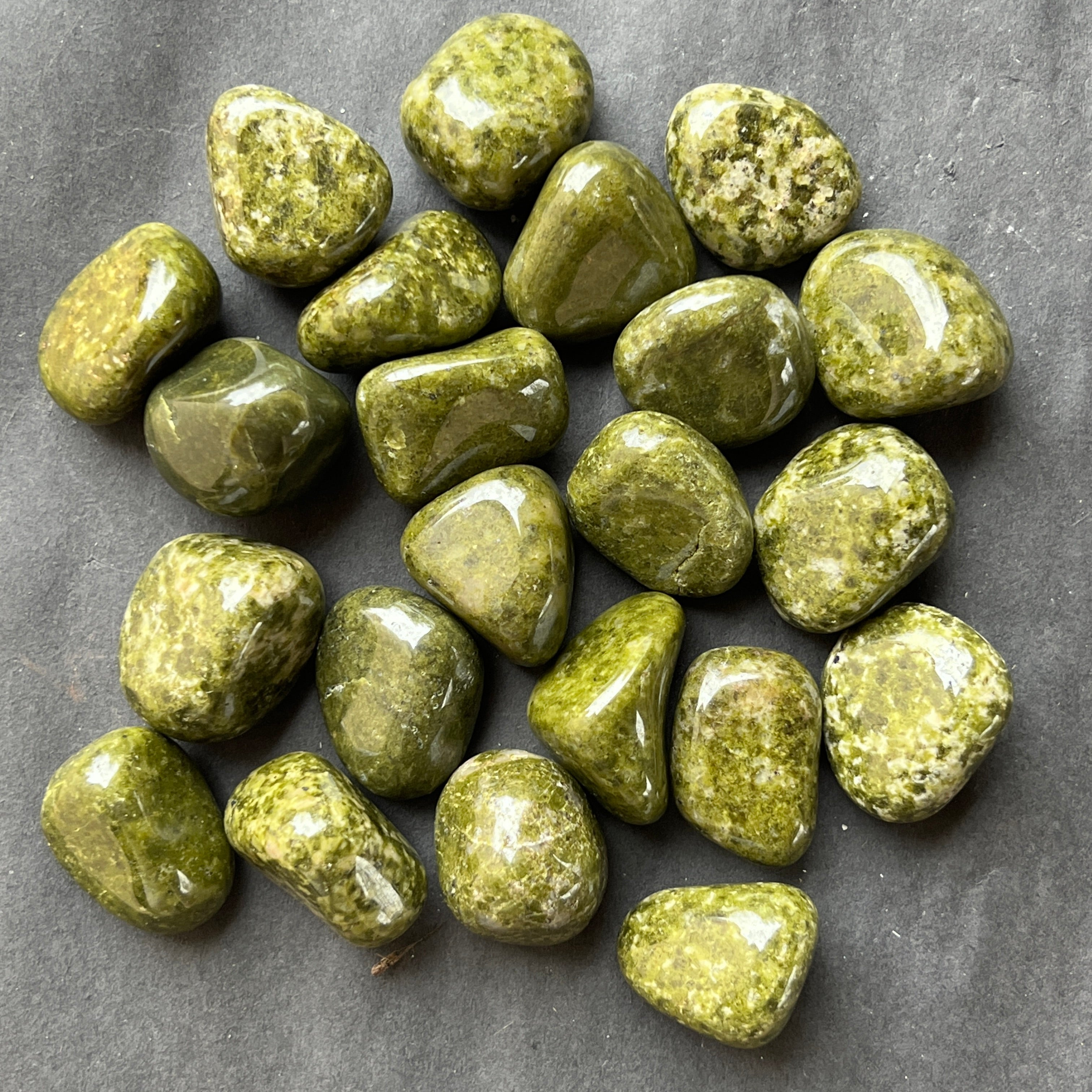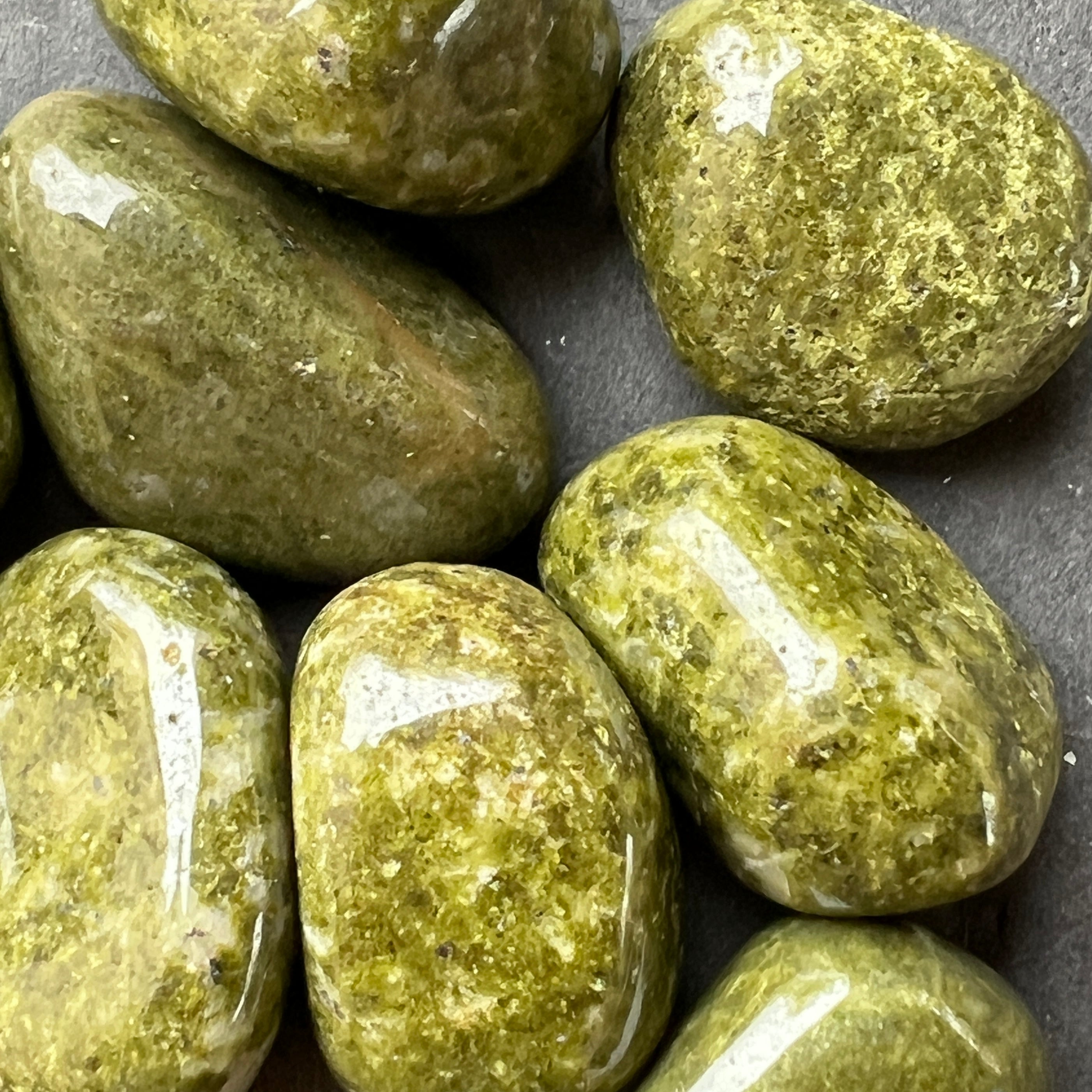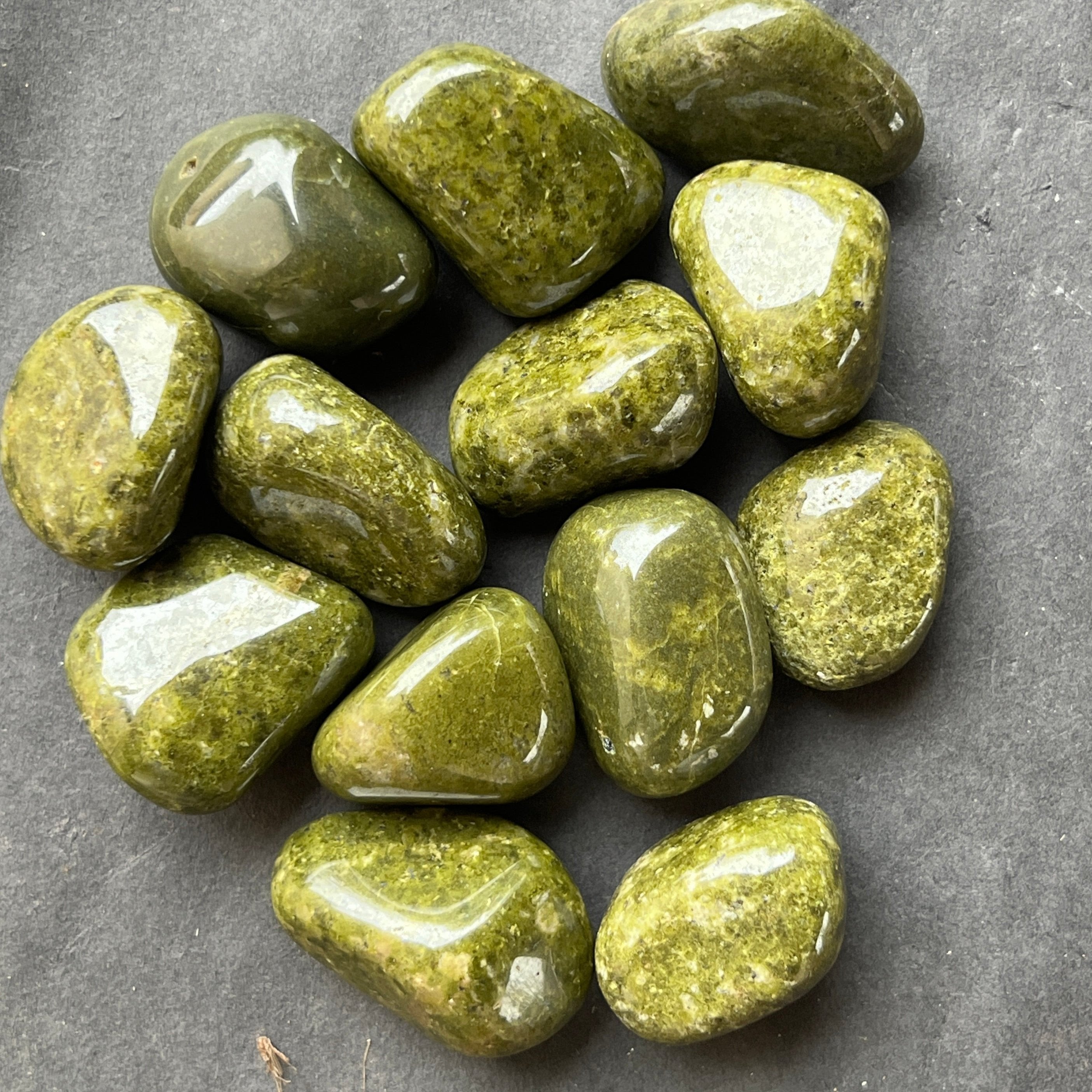 Epidot csiszolt kő, mérete 2–3,5 cm között. Kérjük, válassza ki a kívánt méretet.