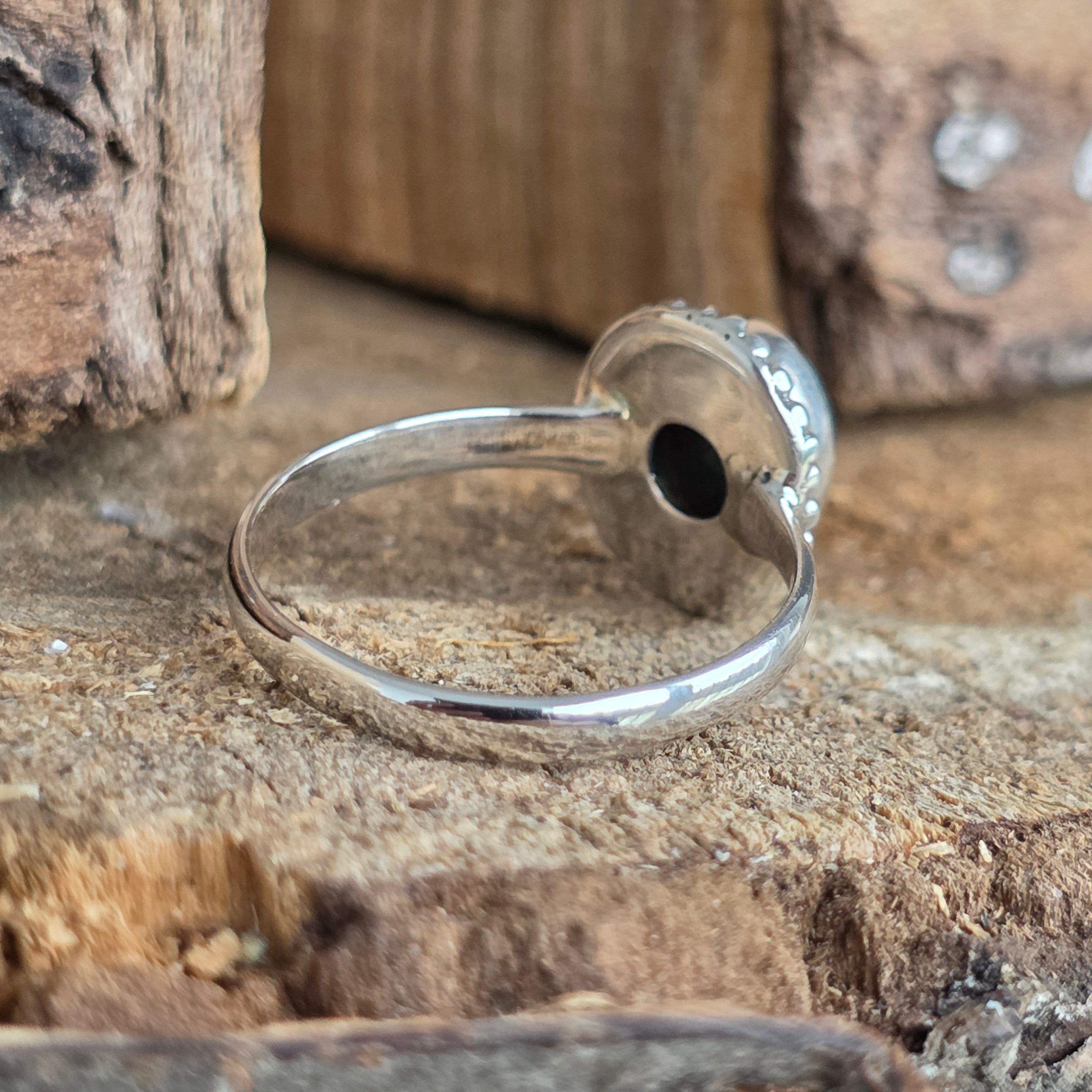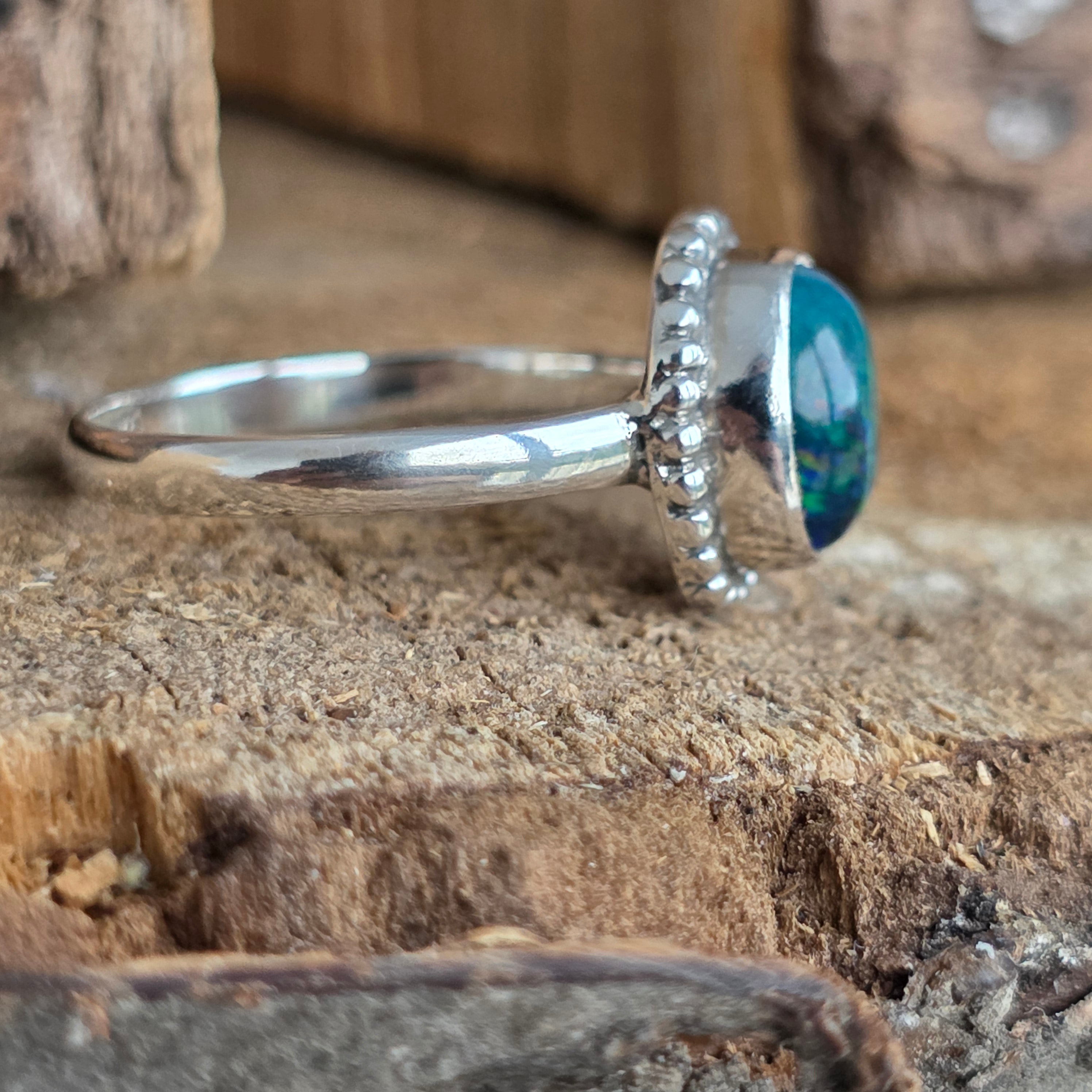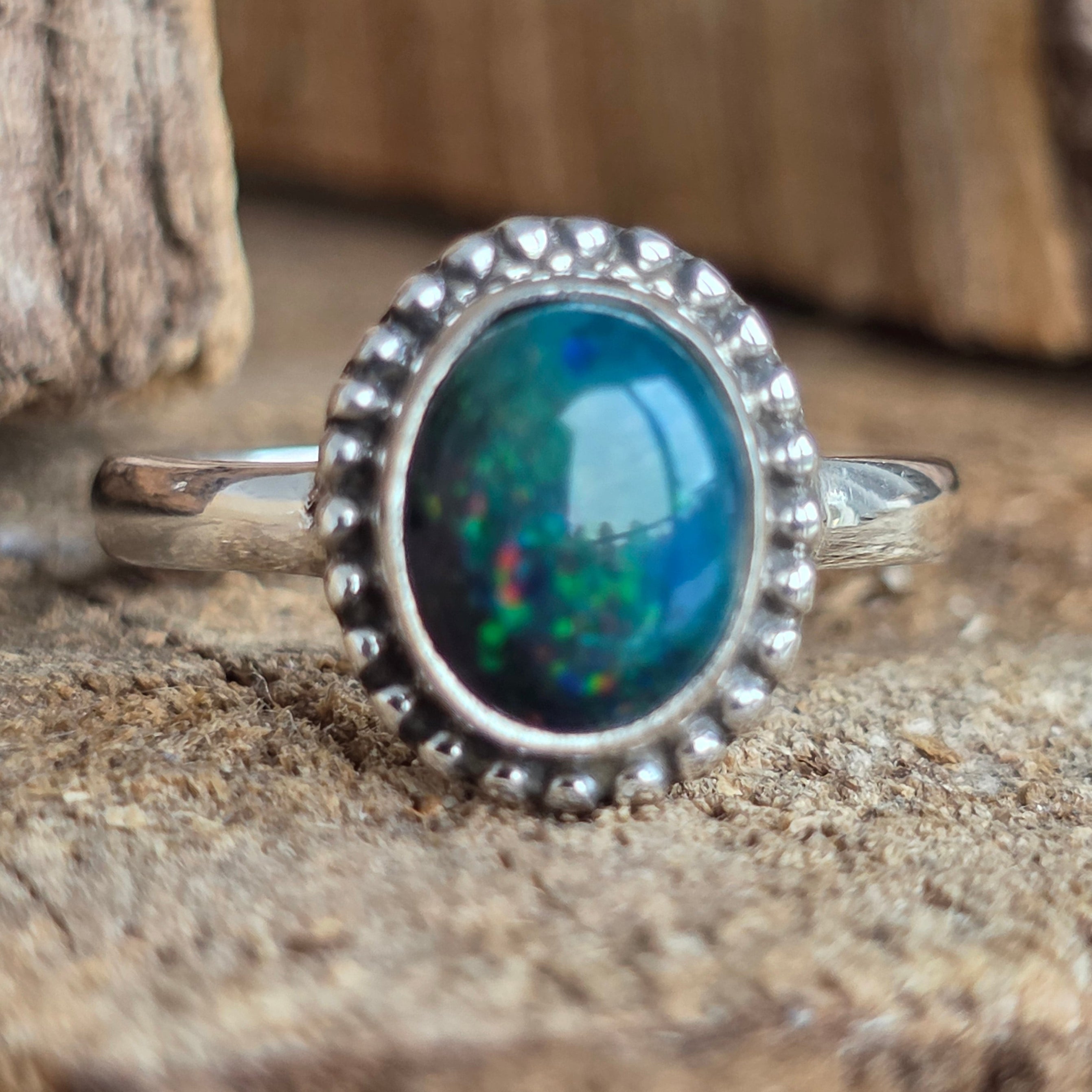 Egy elegáns és kifinomult gyűrű, amely 925 ezüstbőlkészült, természetes etióp opálkövezéssel, amely a zöld, piros és kék árnyalataiban játszó, vibráló fényjátékáról ismert. A minimalista egyszerű drót foglalat lehetővé teszi, hogy a kő legyen a középpontban, minden szögből magához vonzva a fényt.