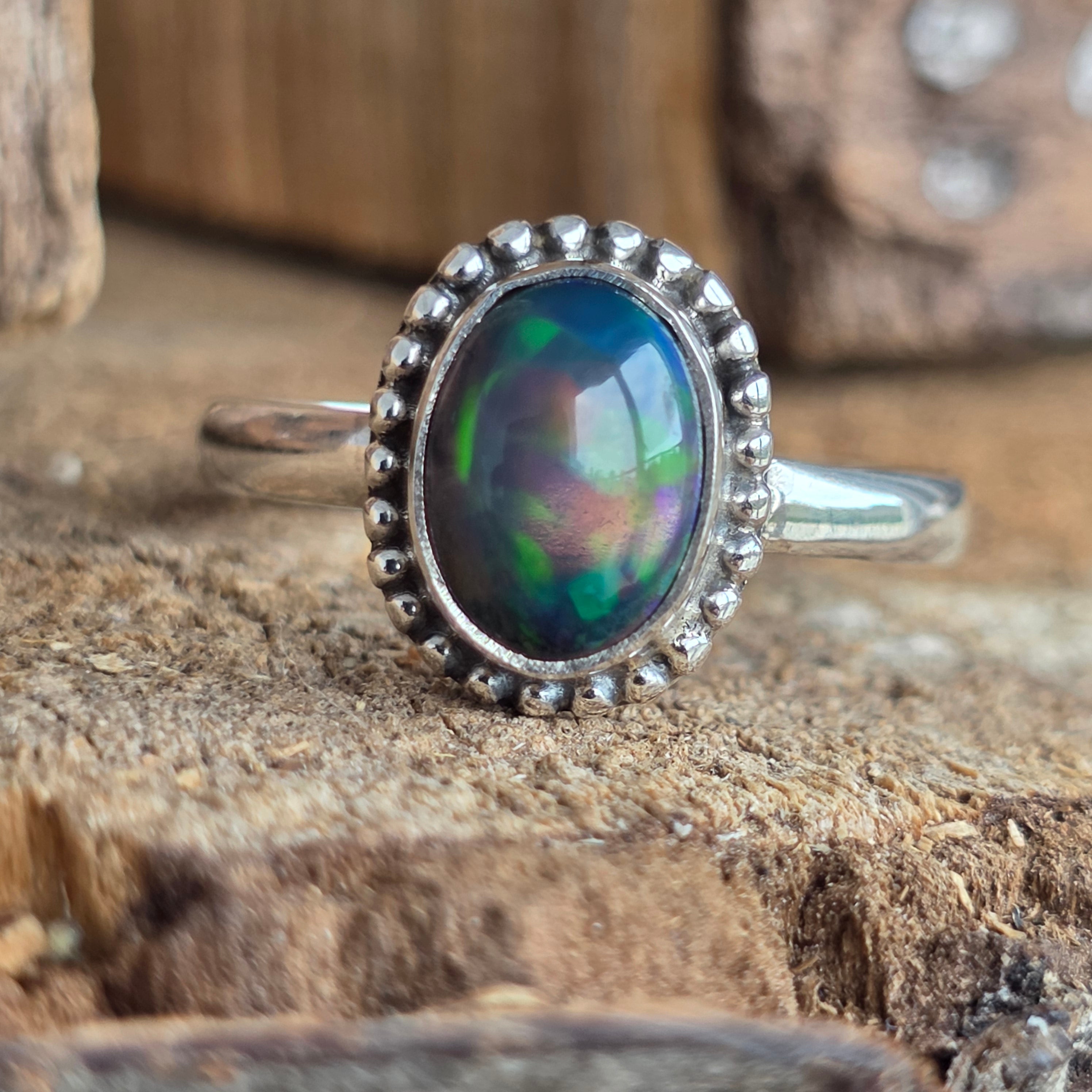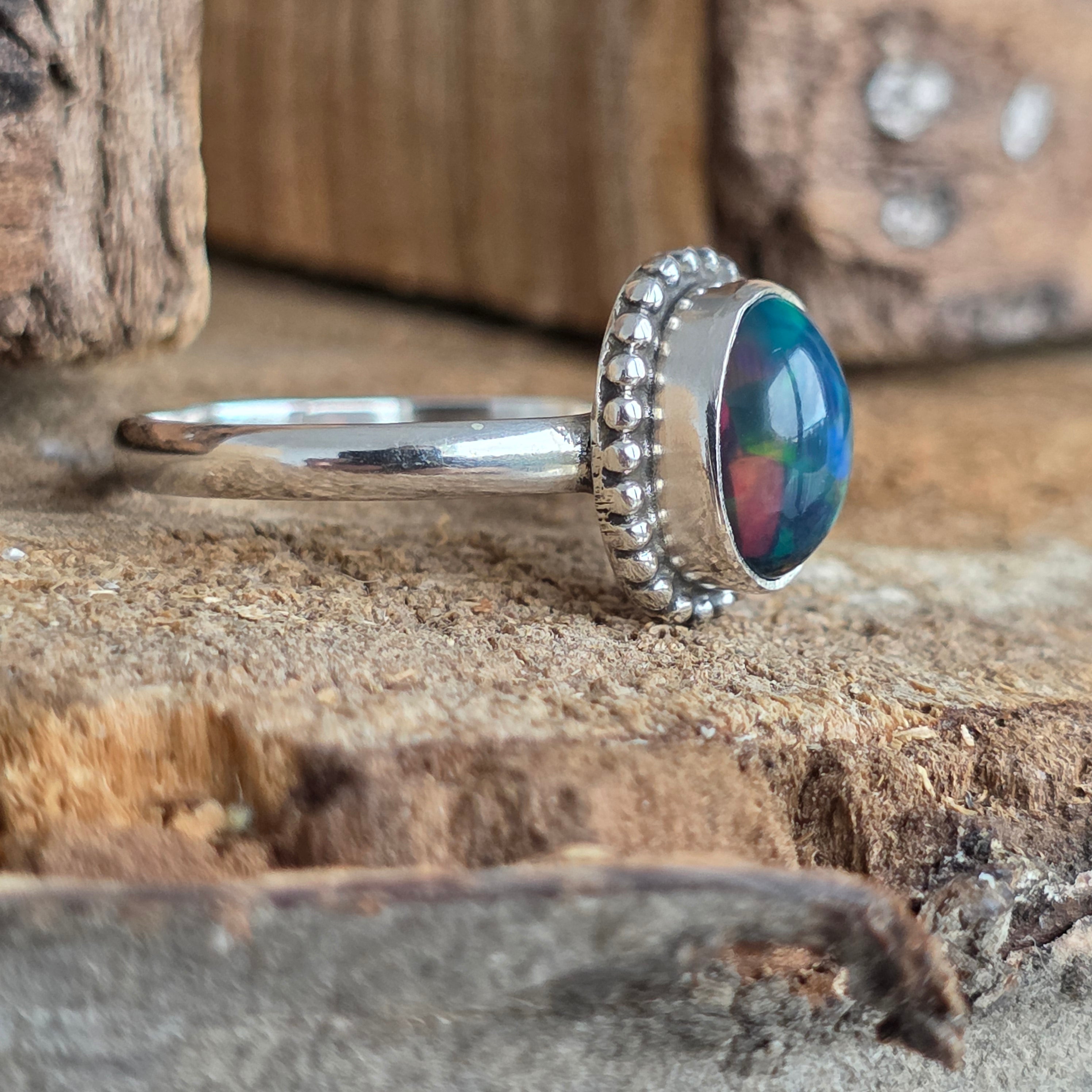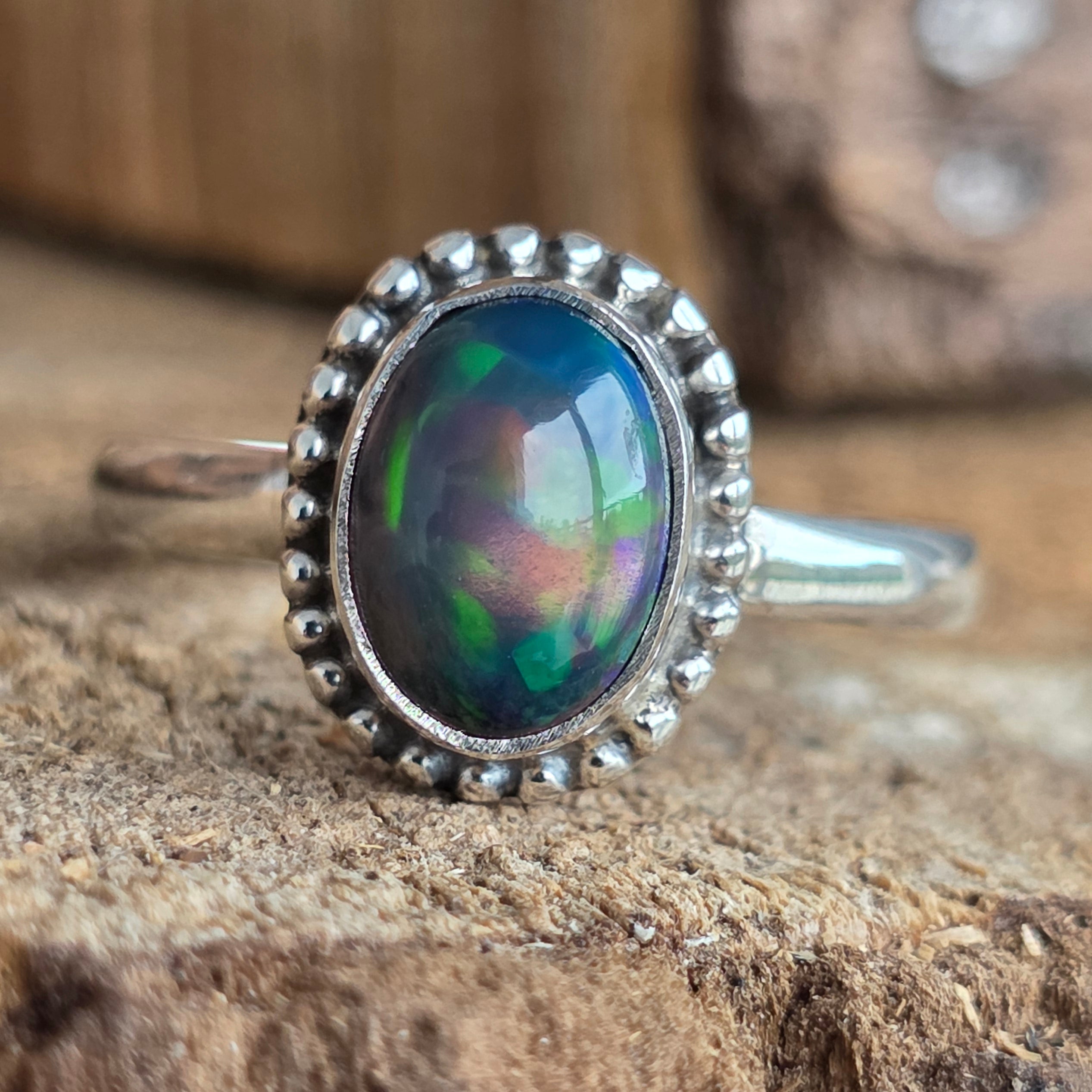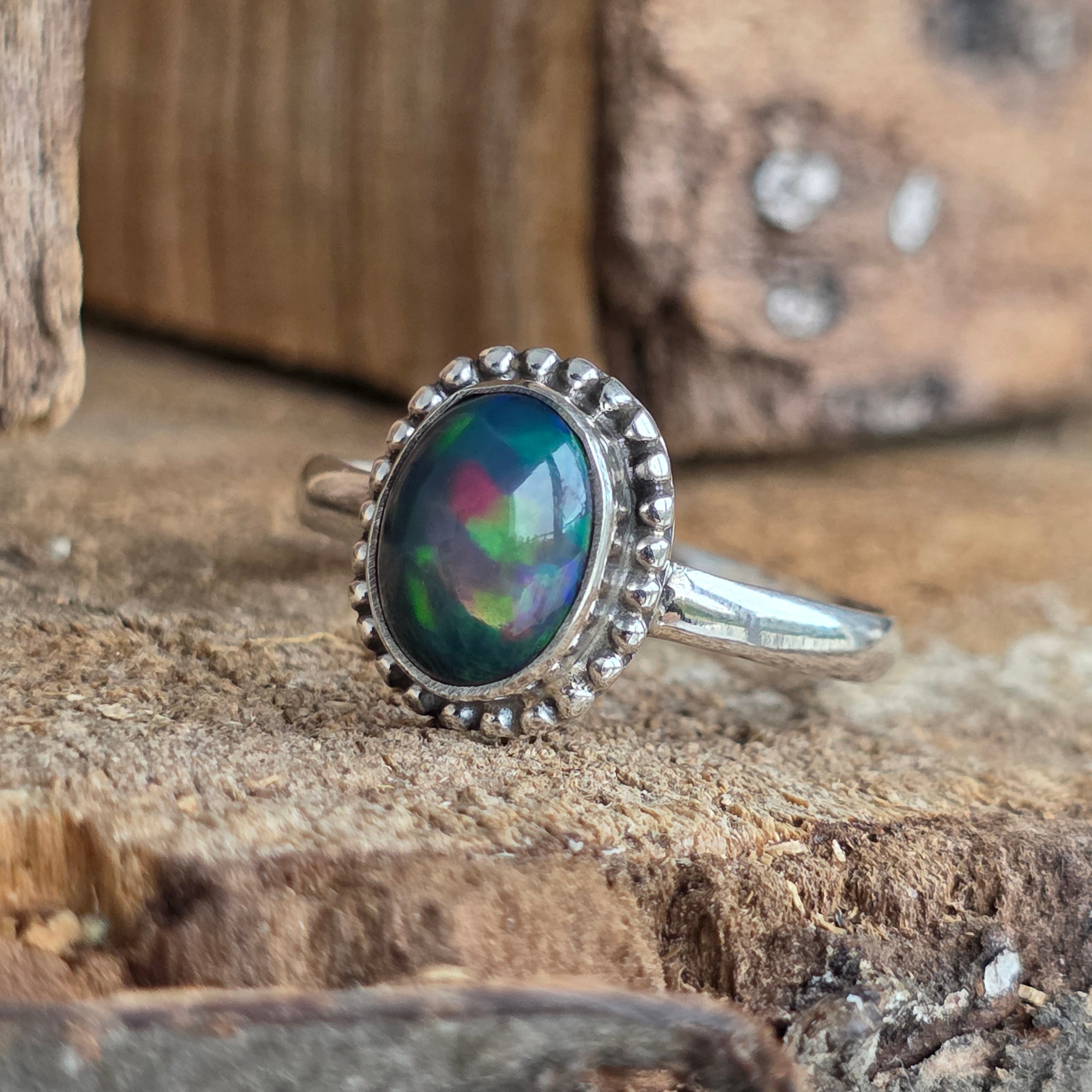 Elegáns és kifinomult gyűrű, készült 925 ezüst, természetes kővel Etióp opál, amely zöld, piros és kék árnyalatú irizáló tükröződéseiről ismert. A minimalista dizájn sima vezeték beállítás lehetővé teszi, hogy a kő a figyelem középpontjában legyen, bármilyen szögből megragadja a fényt.
