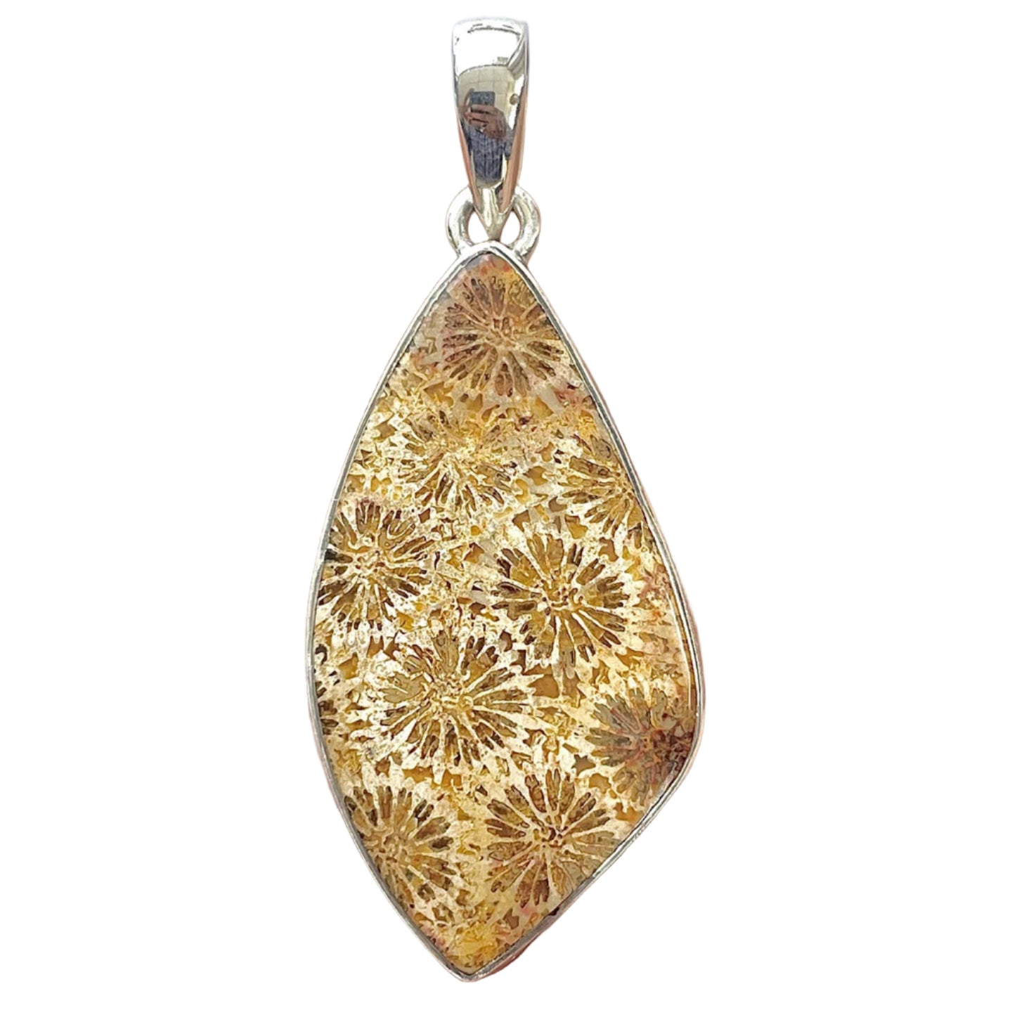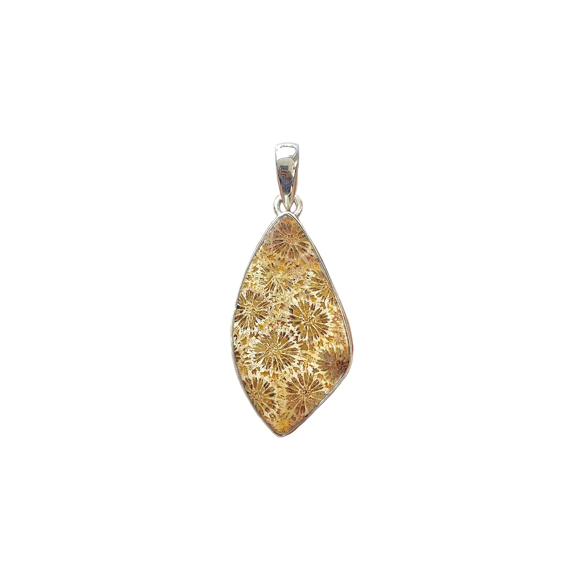 Ez az egyedi fosszilis korall medál egy ablak a múltba, amely megőrzi a tengerkolóniák finom nyomait, amelyek az idő során kővé alakultak. A természetes virágminták, melyek több millió évvel ezelőtt alakultak ki, organikus szépséget teremtenek, mintha maga a természet faragta volna.