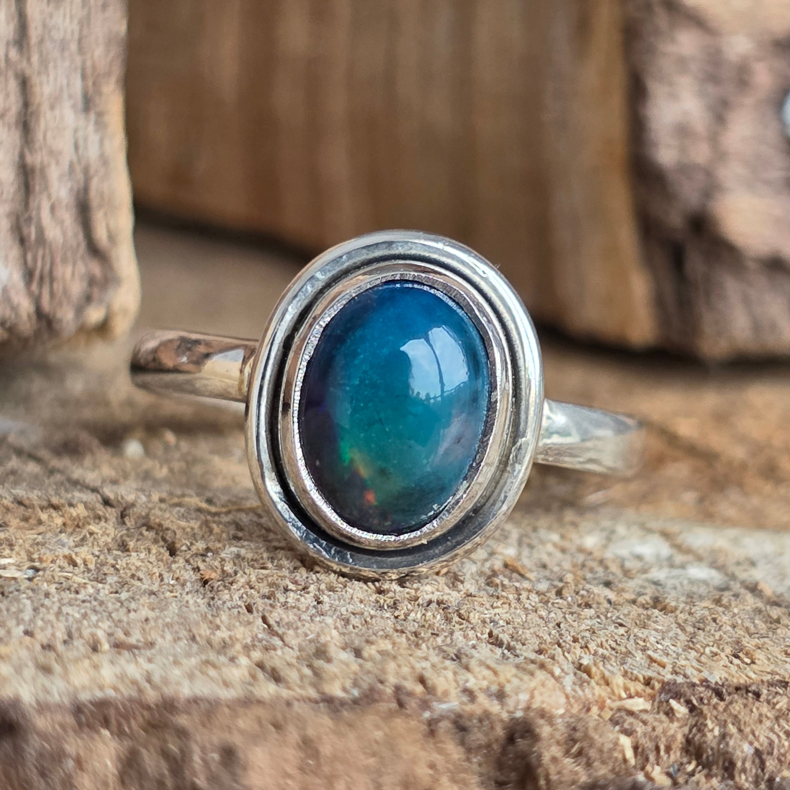 Elegáns és kifinomult gyűrű, készült 925 ezüst, természetes kővel Etióp opál, amely zöld, piros és kék árnyalatú irizáló tükröződéseiről ismert. A minimalista dizájn sima vezeték beállítás lehetővé teszi, hogy a kő a figyelem középpontjában legyen, bármilyen szögből megragadja a fényt.