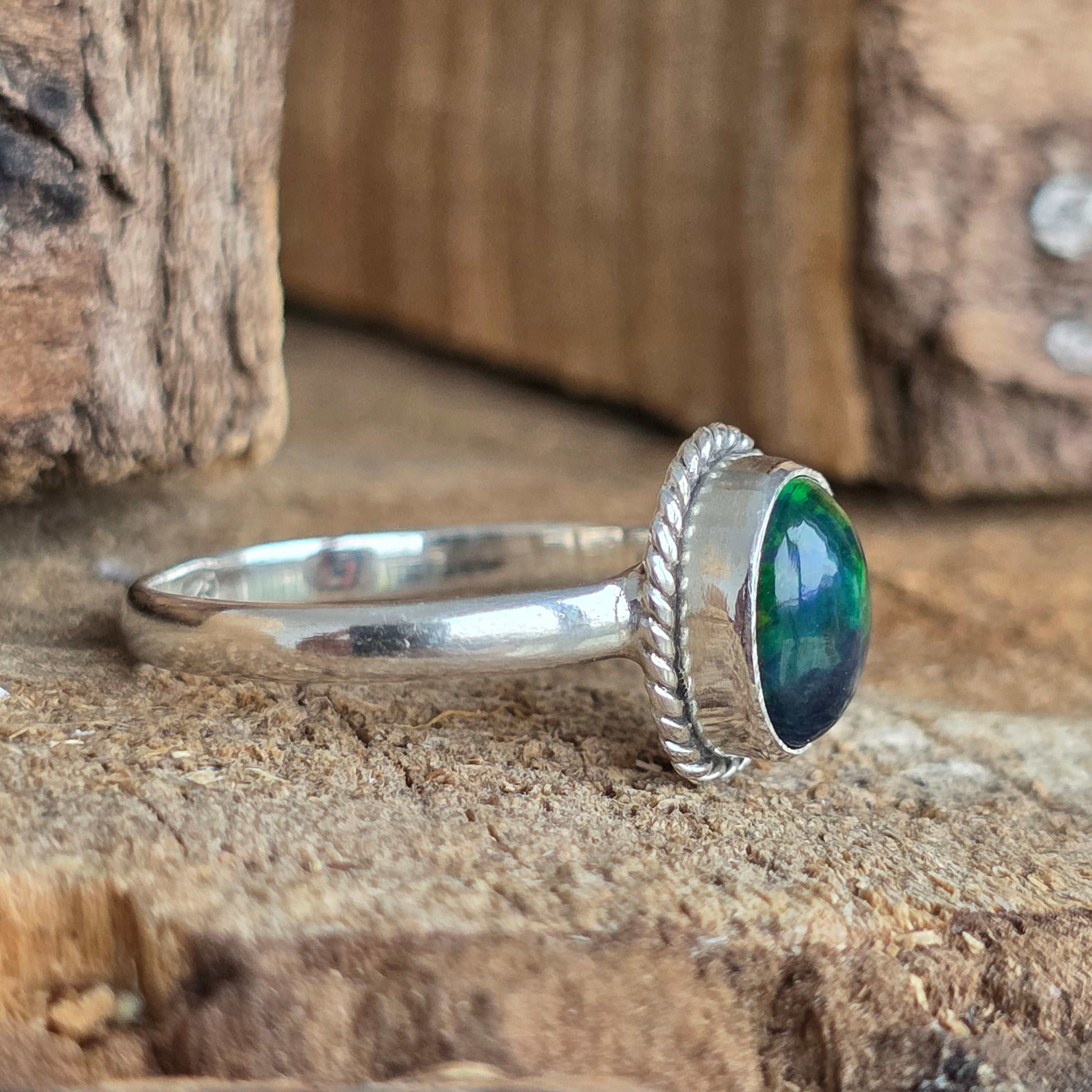 Elegáns és kifinomult gyűrű, készült 925 ezüst, természetes kővel Etióp opál, amely zöld, piros és kék árnyalatú irizáló tükröződéseiről ismert. A minimalista dizájn sima vezeték beállítás lehetővé teszi, hogy a kő a figyelem középpontjában legyen, bármilyen szögből megragadja a fényt.