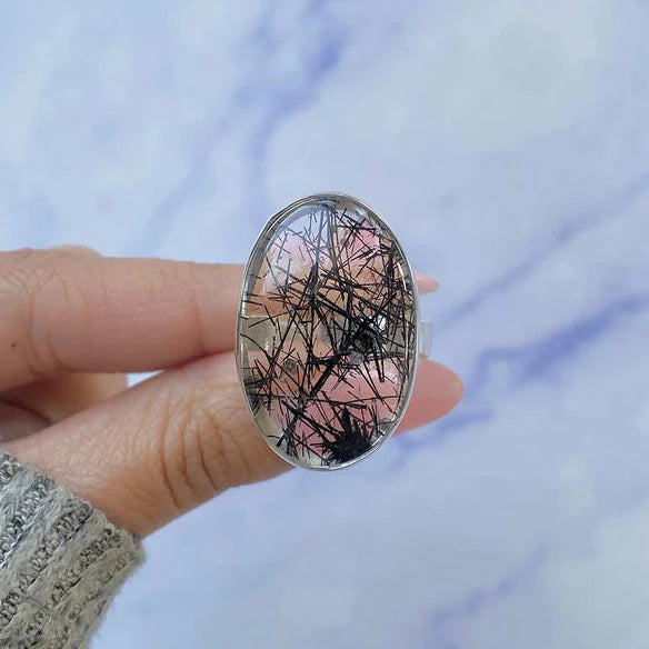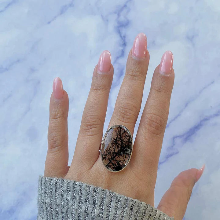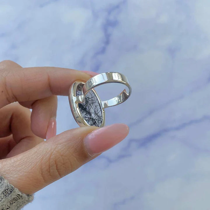 Válassza ezt a természetes fekete tűlős kvarc ezüst gyűrűt, egy erős karakterű és lenyűgöző megjelenésű darabot, amelyet a finom, sötét inklúziók emelnek ki, és amelyek egyedi vonaljátékot hoznak létre a kő belsejében. Minden példány különböző, így ez az ékszer autentikus és különleges választássá válik.
